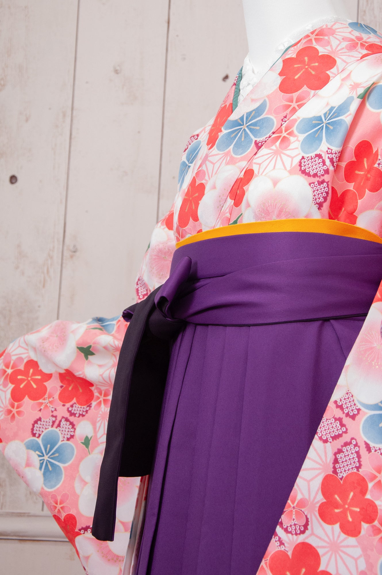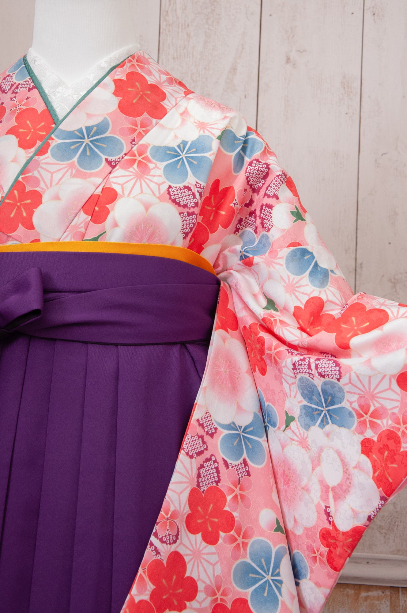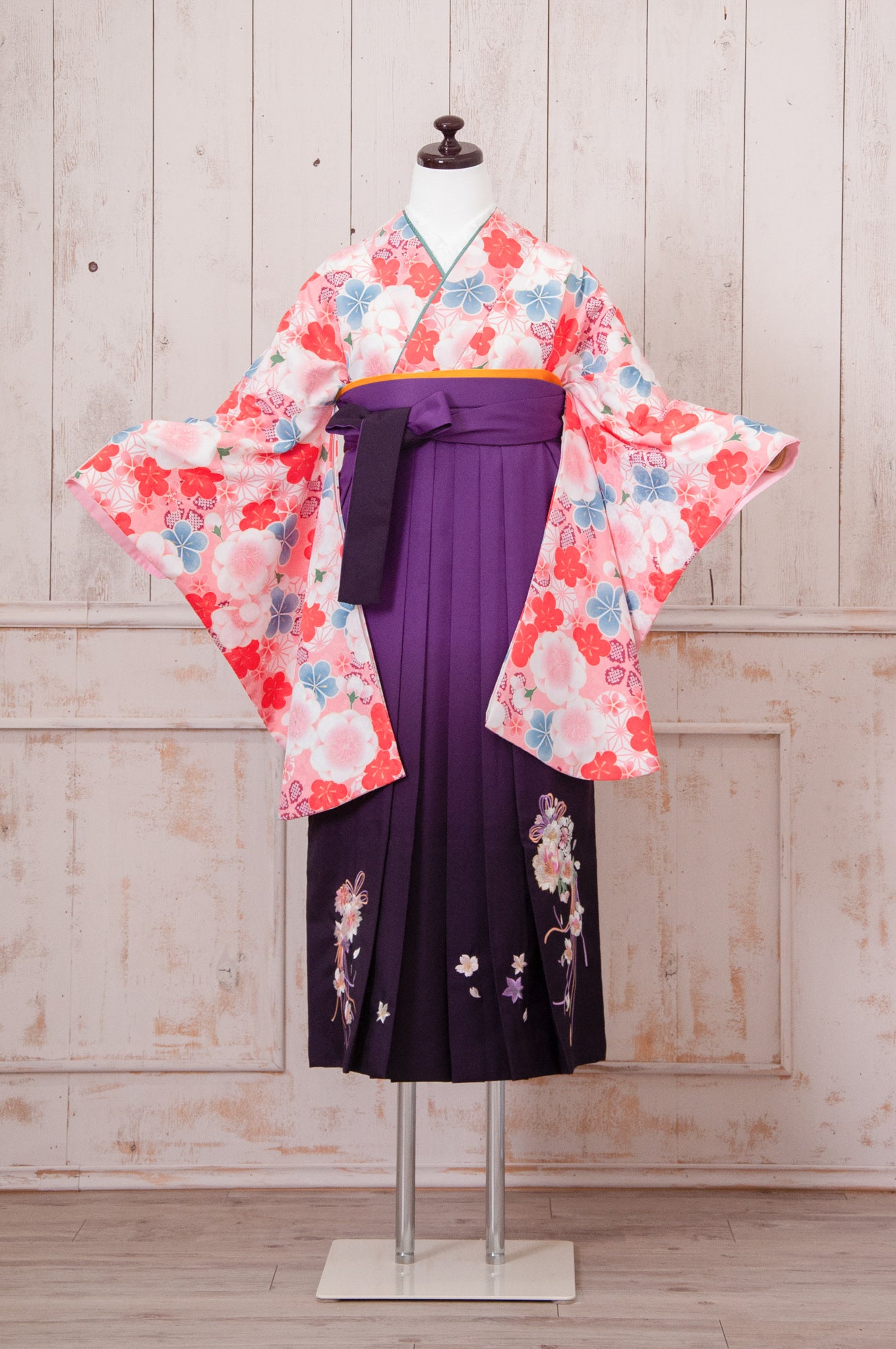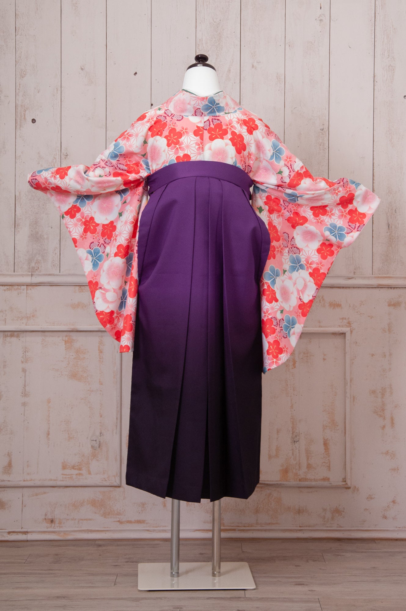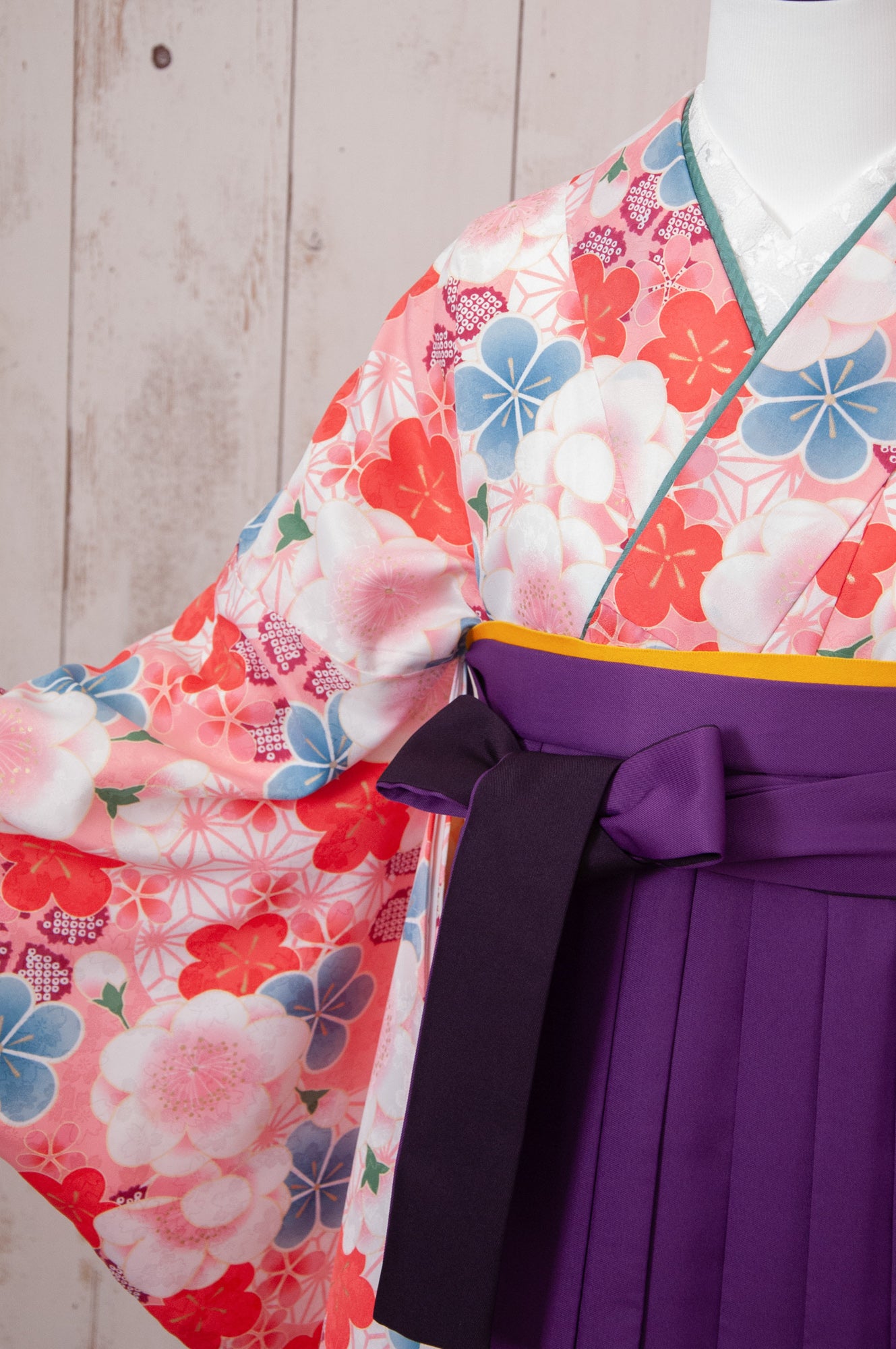 白地に明るい赤・水色の花々が舞う、春爛漫なコーディネート。紫の袴が全体を引き締め、愛らしさと上品さを演出。