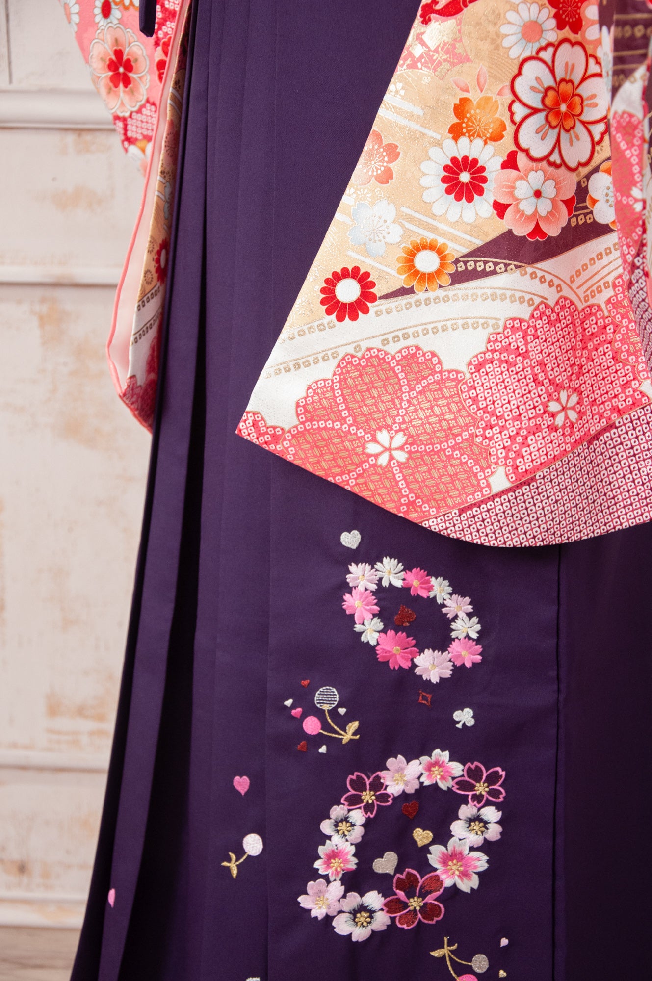 桜モチーフを散りばめたピンクの愛らしい着物に、ハート柄入りの紫袴でガーリーに仕上げました。