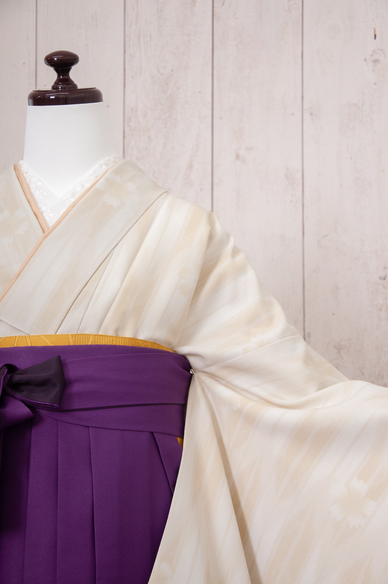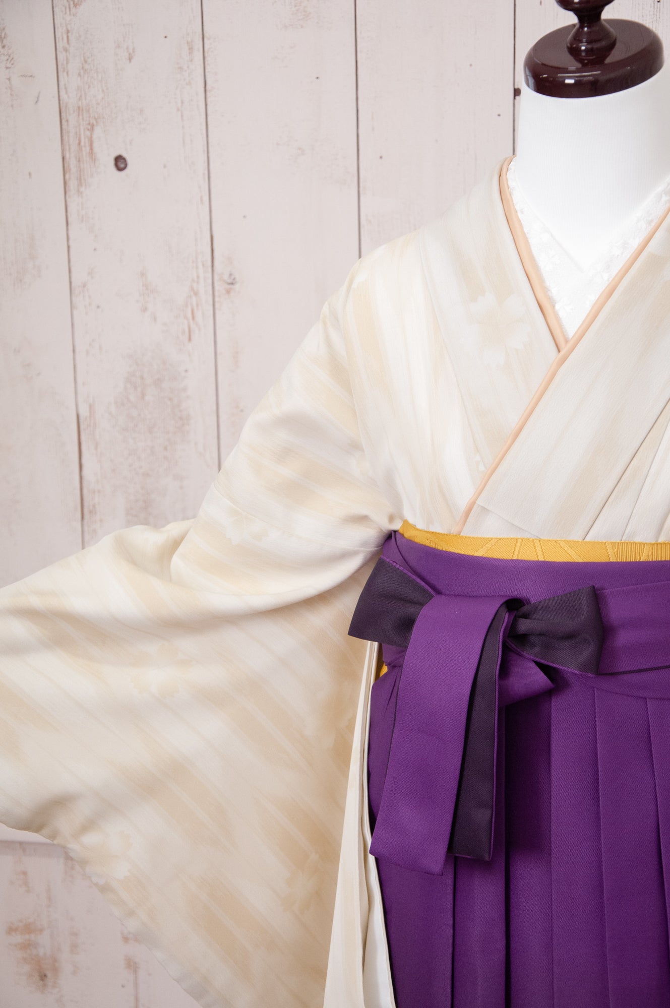 アイボリーの着物にさりげない縞柄が上品。グラデーション袴で大人の落ち着きを表現。