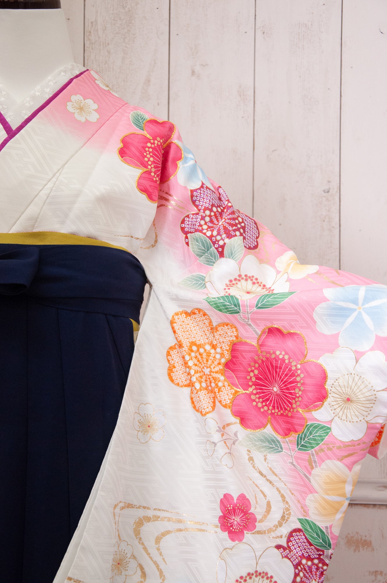 白とピンクのグラデーションに色とりどりの花模様が映える一着。紺の袴で可憐さと落ち着きを両立。