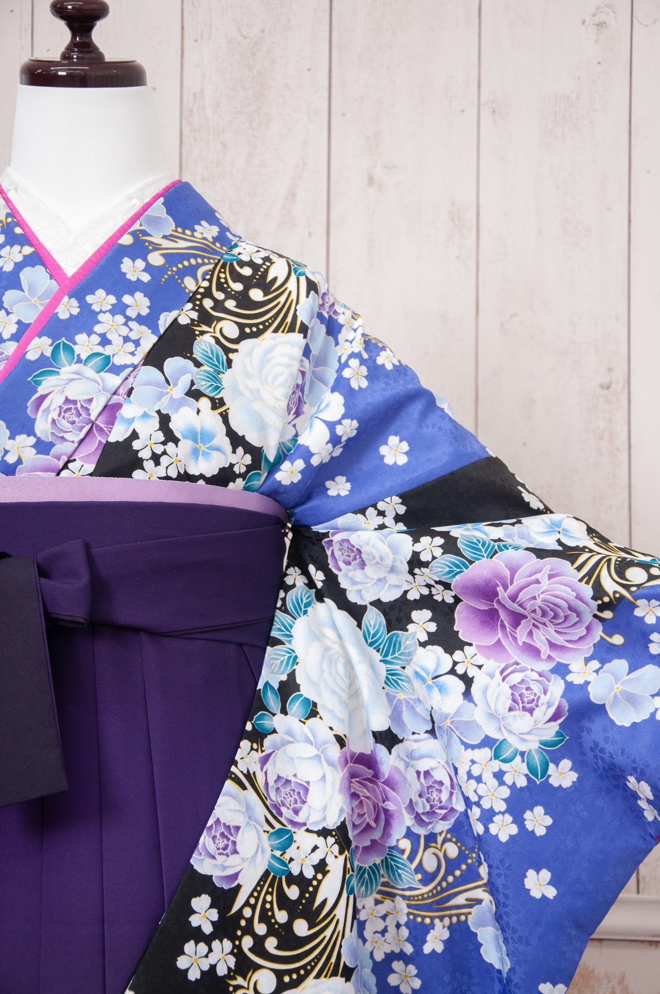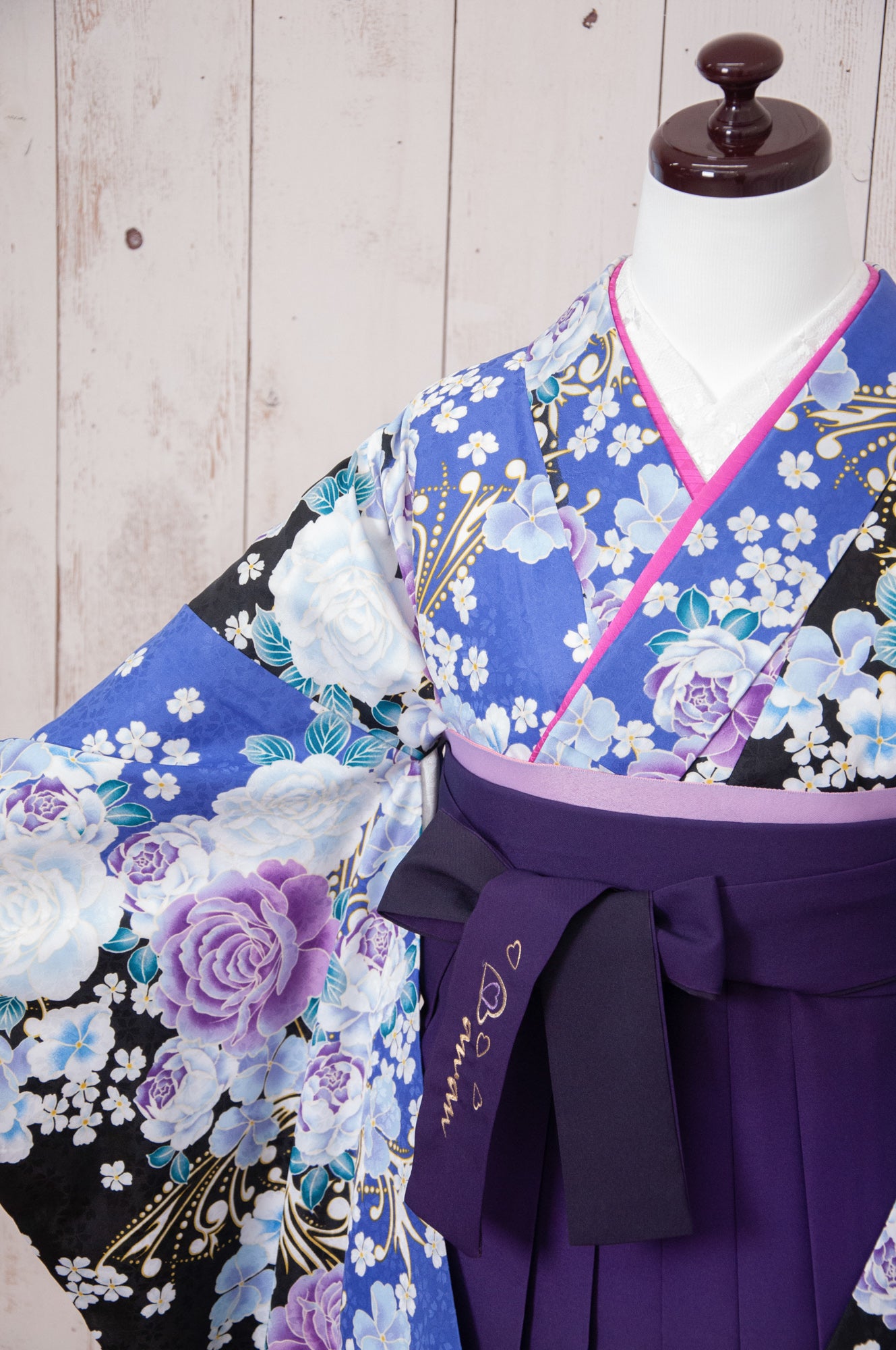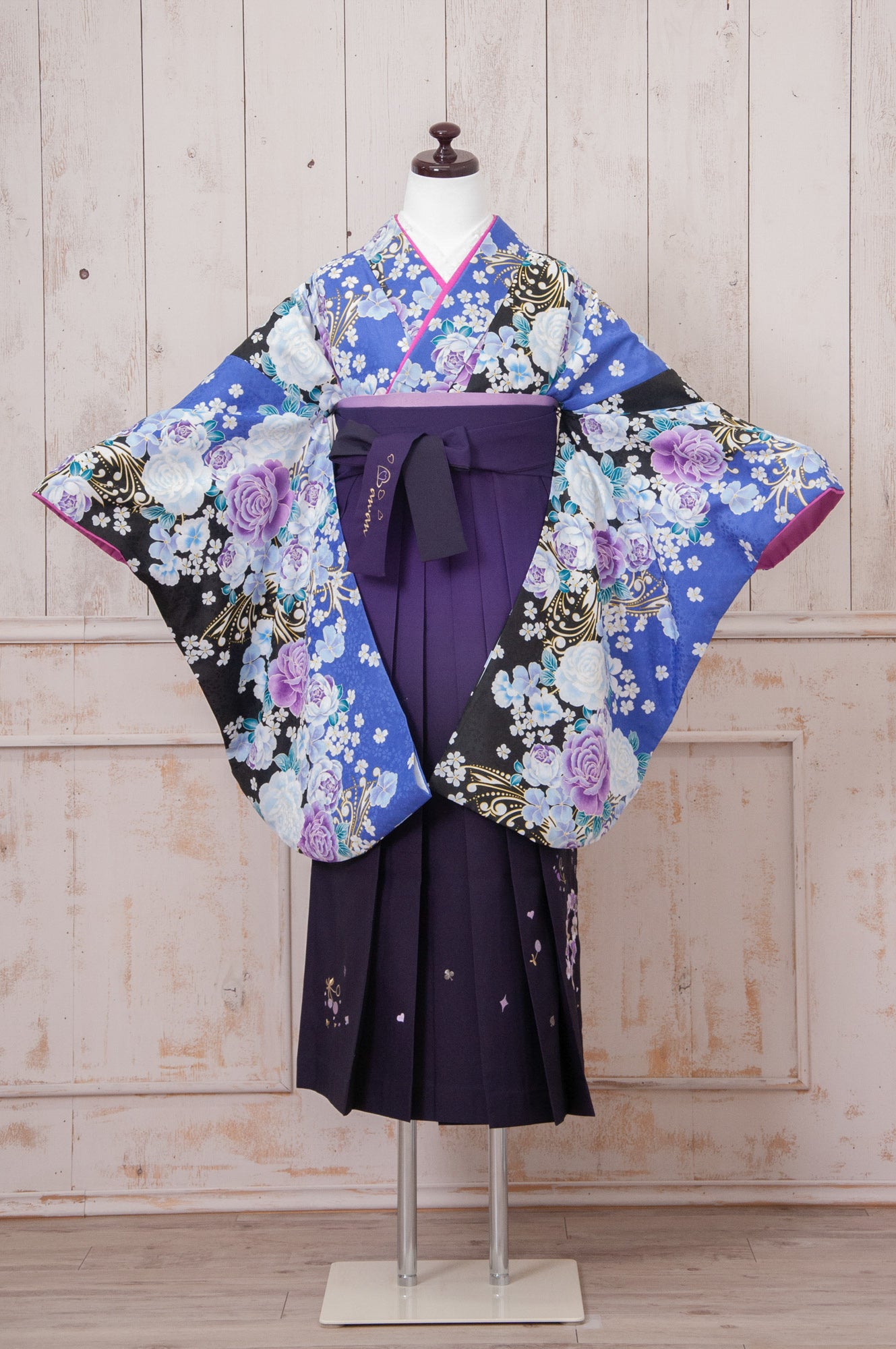 ブルーとラベンダーのバラが咲き誇る、幻想的でゴージャスな袴スタイル。