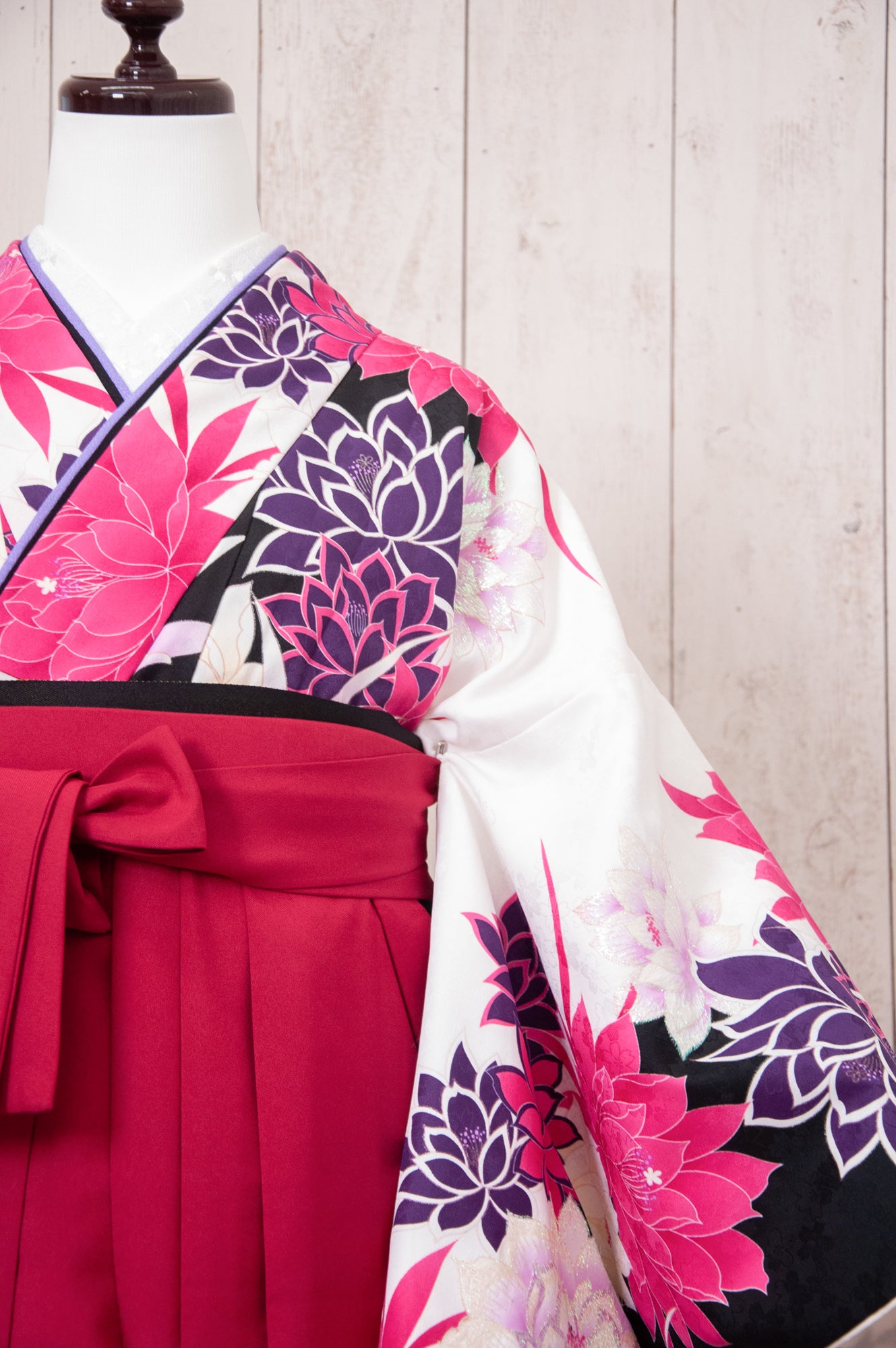 大輪の華が印象的な紅白のコントラスト。晴れの日に映える華やかな装い。