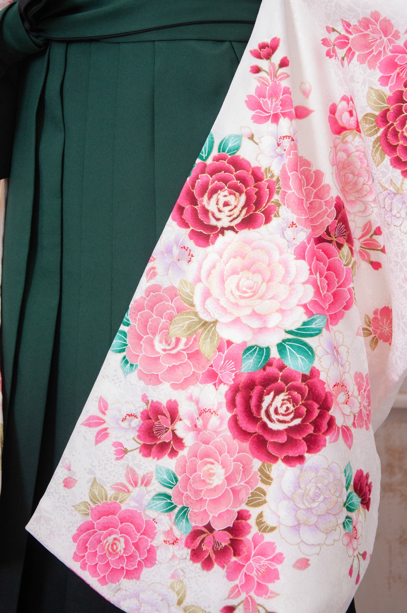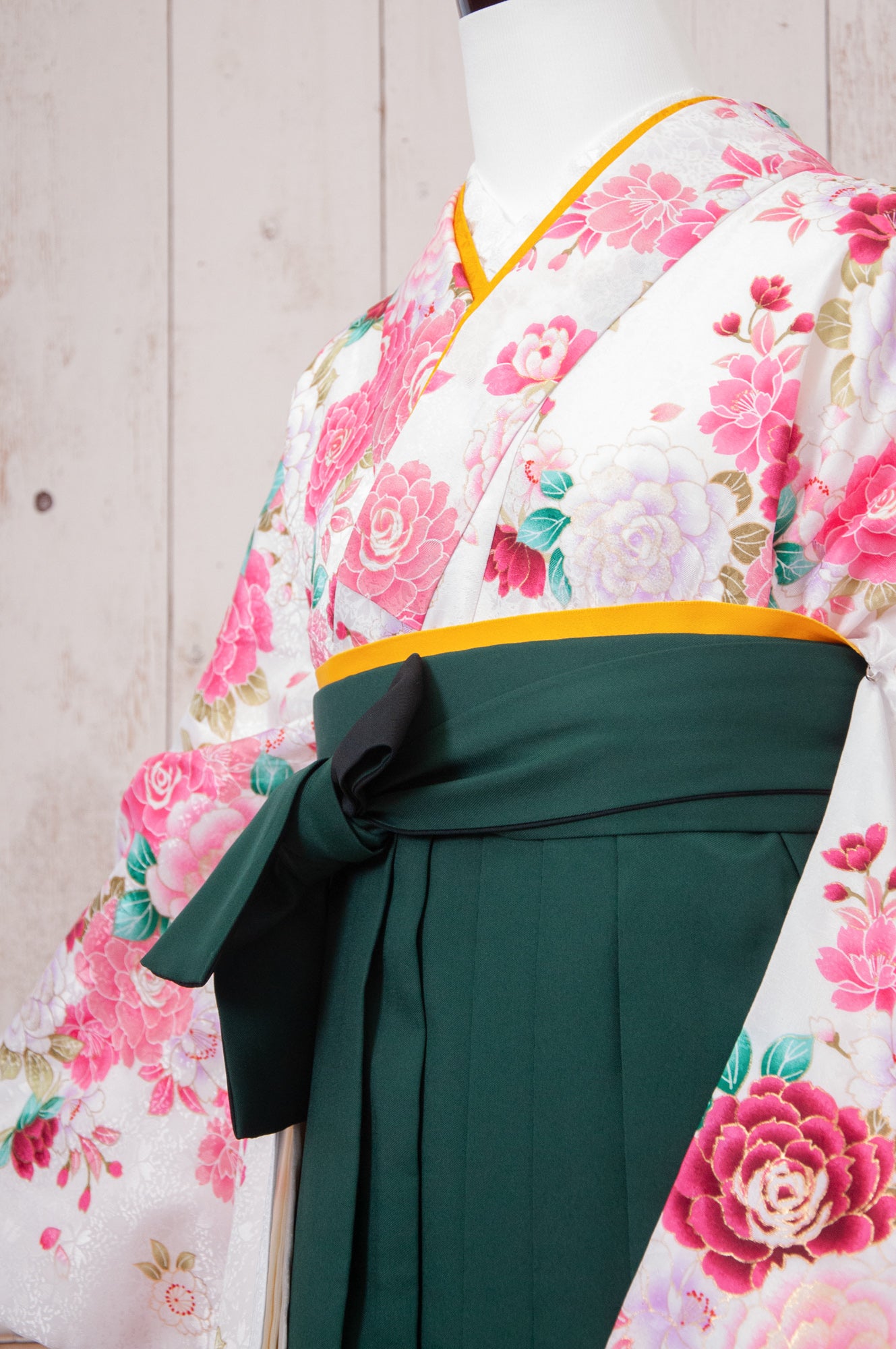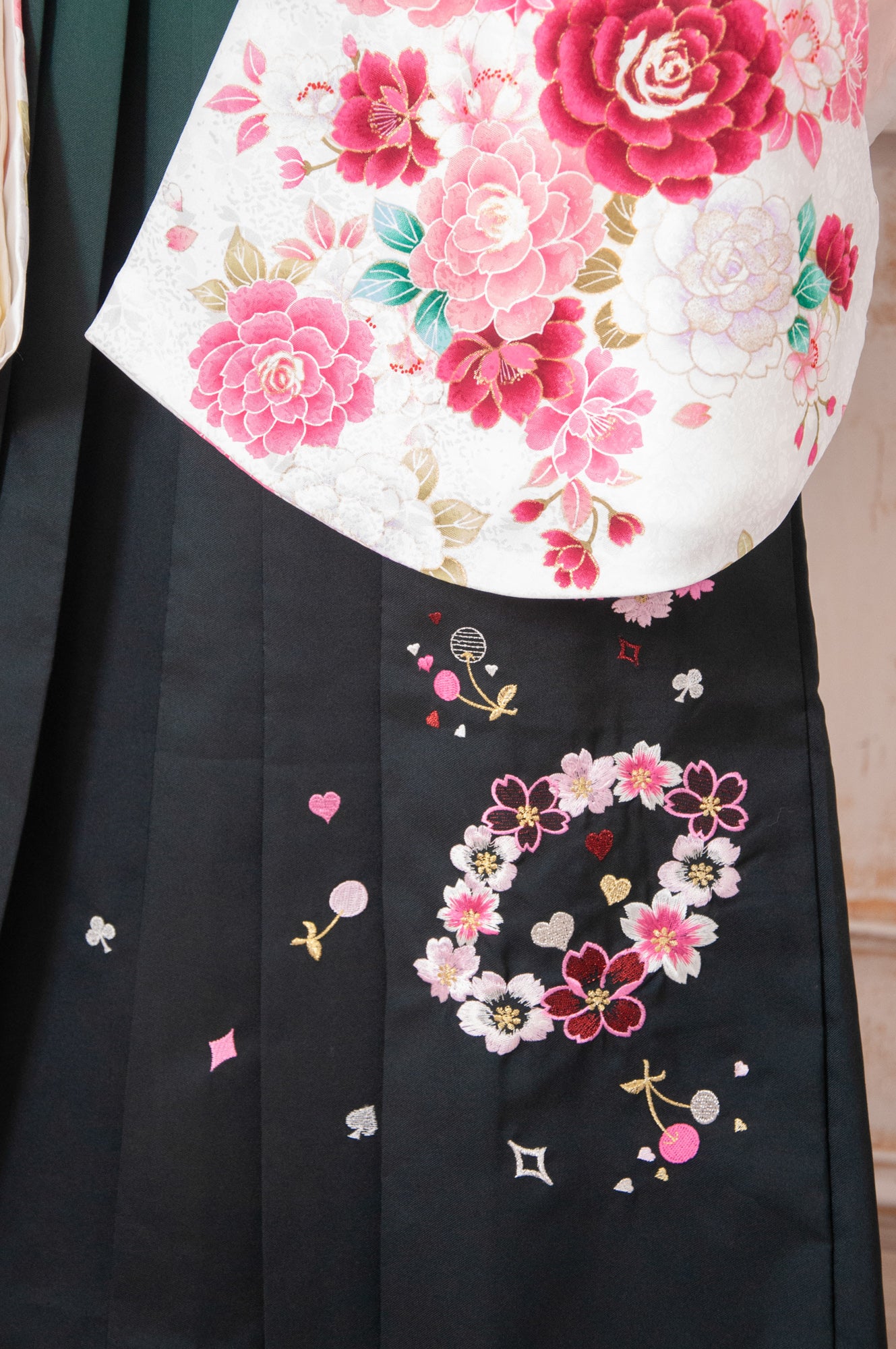 白地にピンクのバラが咲き誇る、可憐で優雅なフェミニンスタイルの袴。
