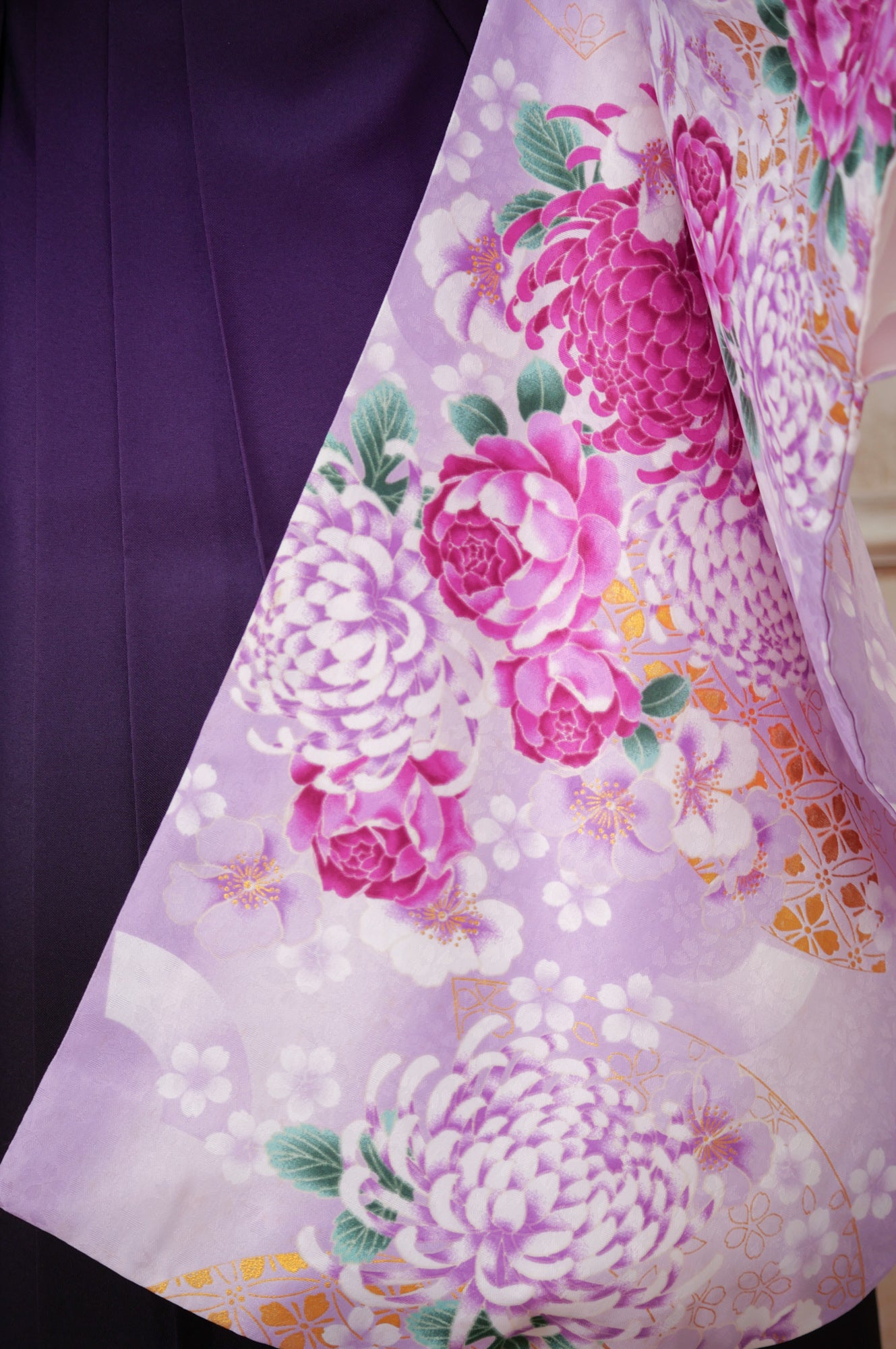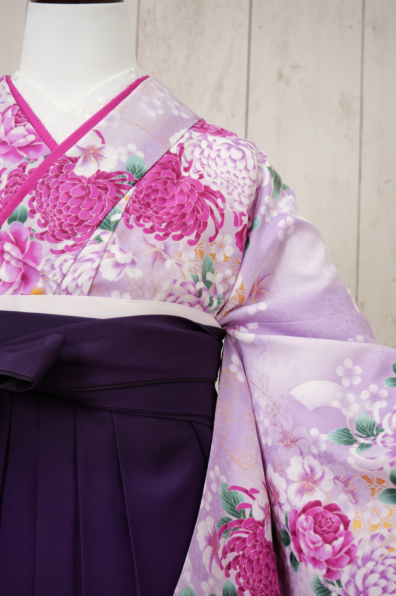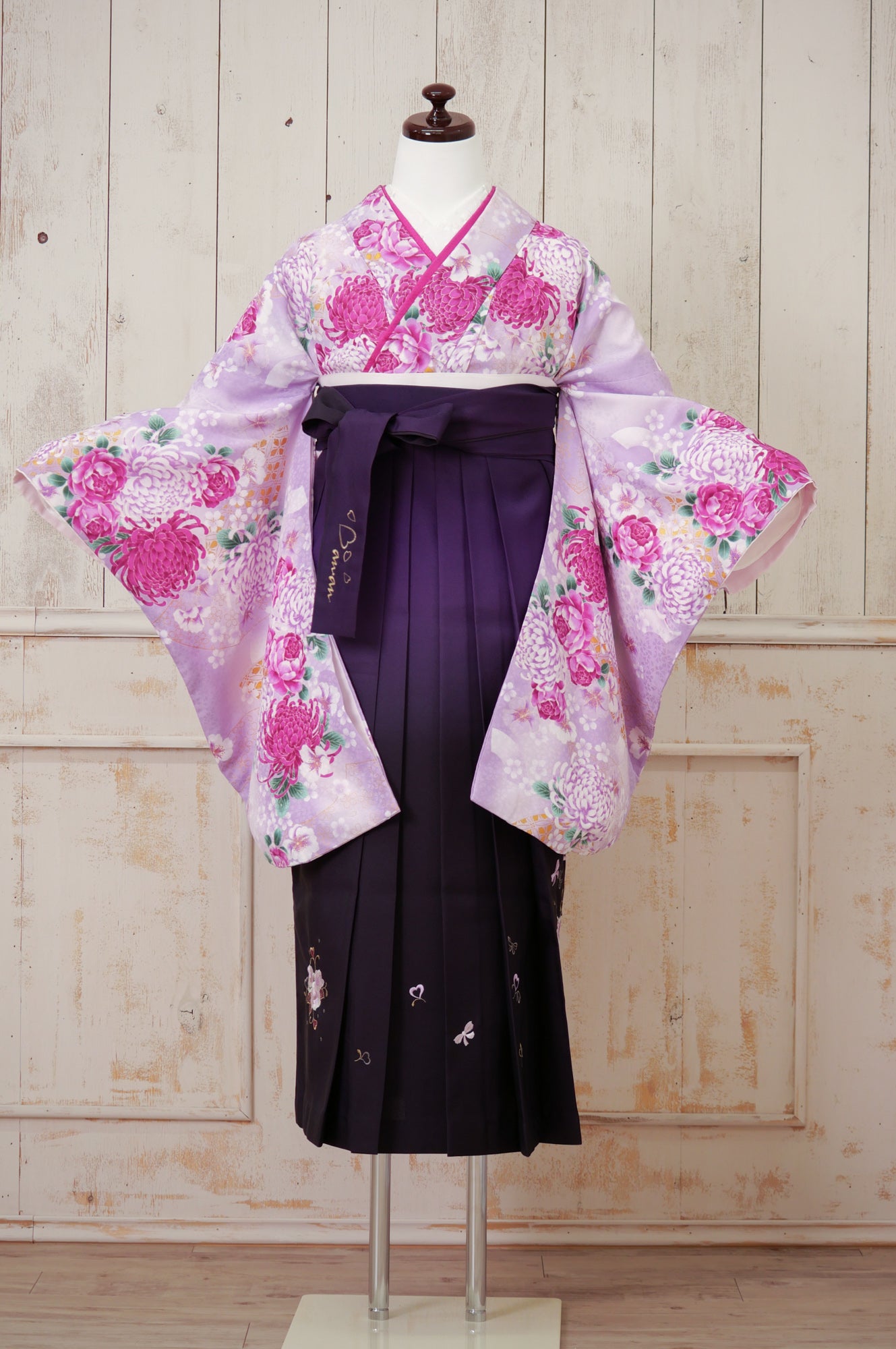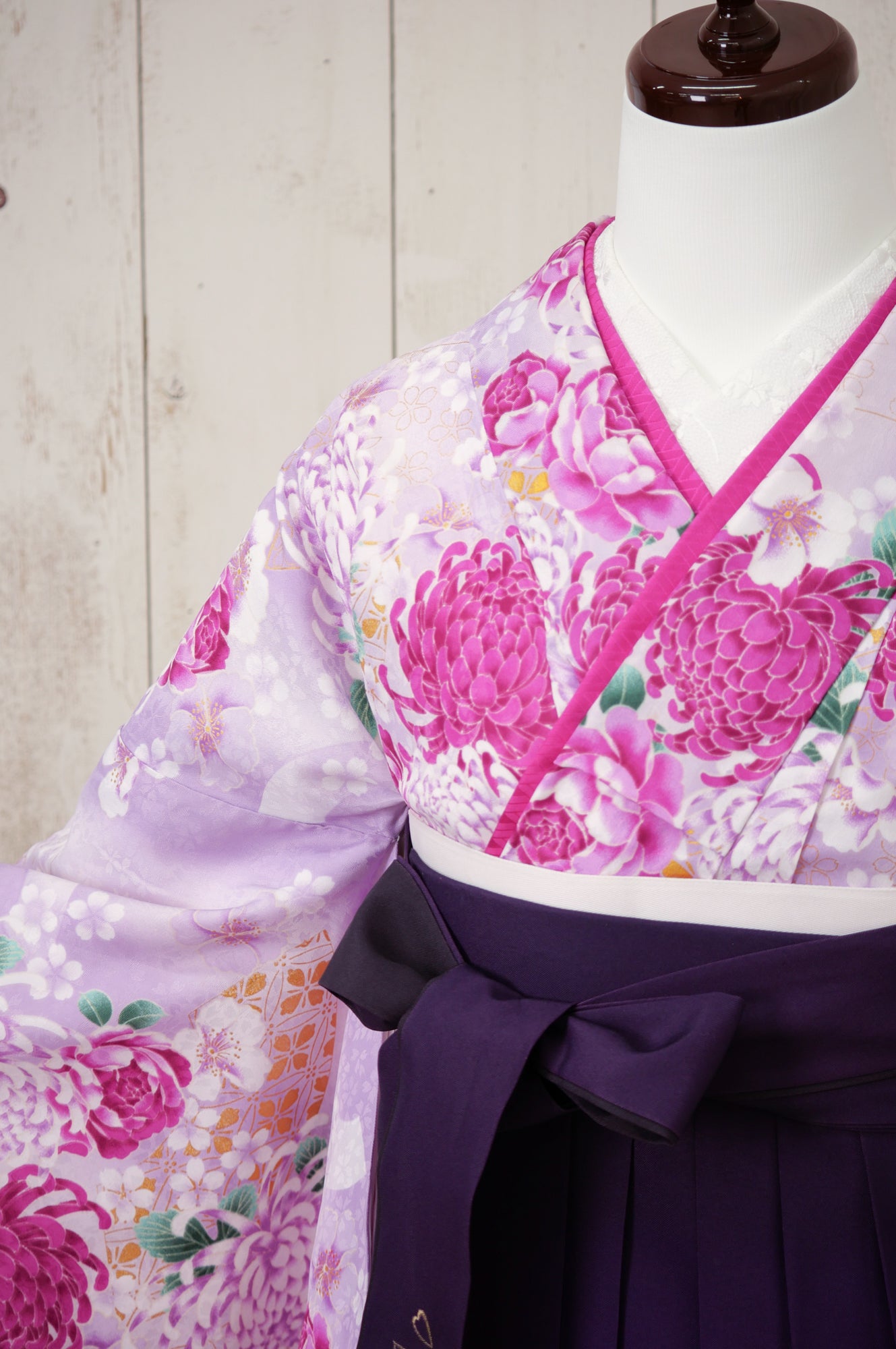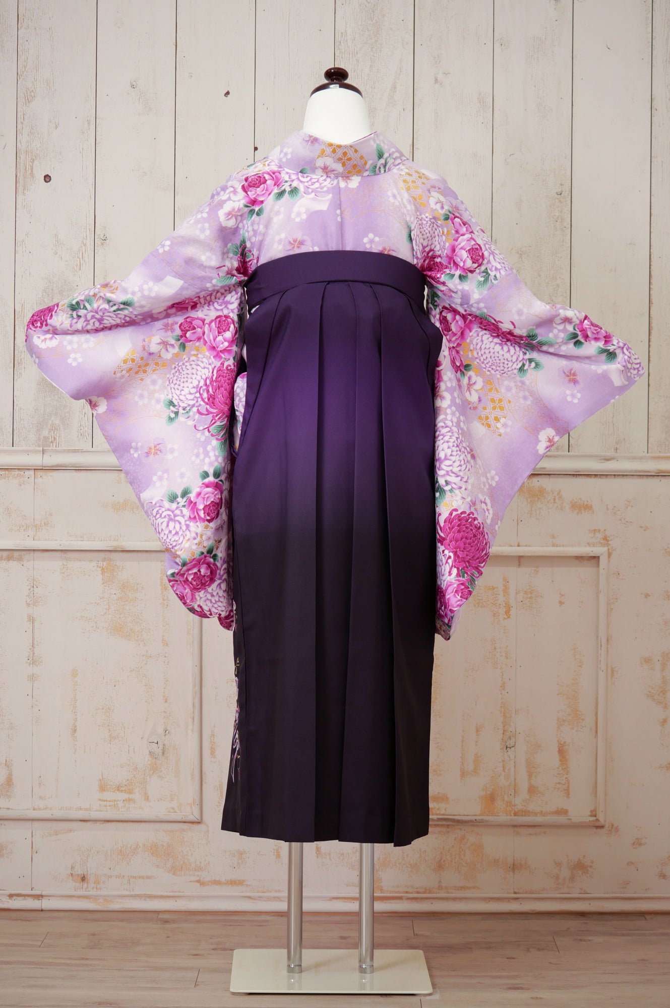 薄紫の地に大輪の花が咲き誇る華やかなデザイン。濃紫の袴で全体を引き締め、上品な印象。