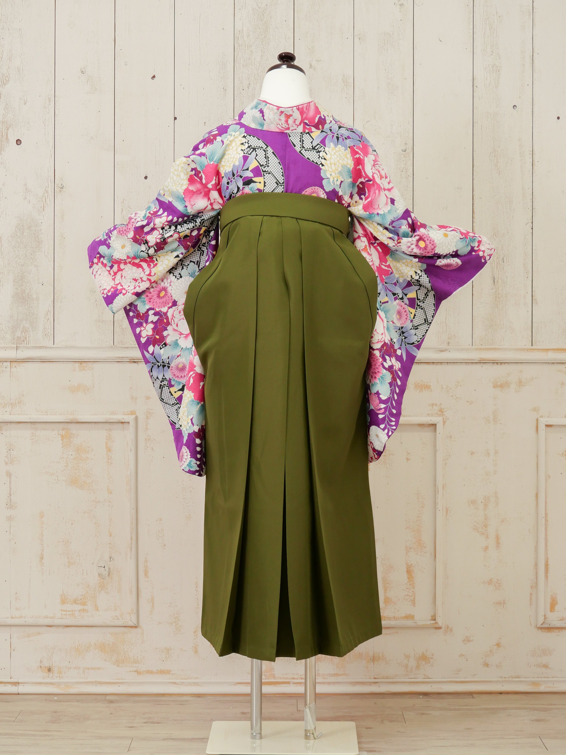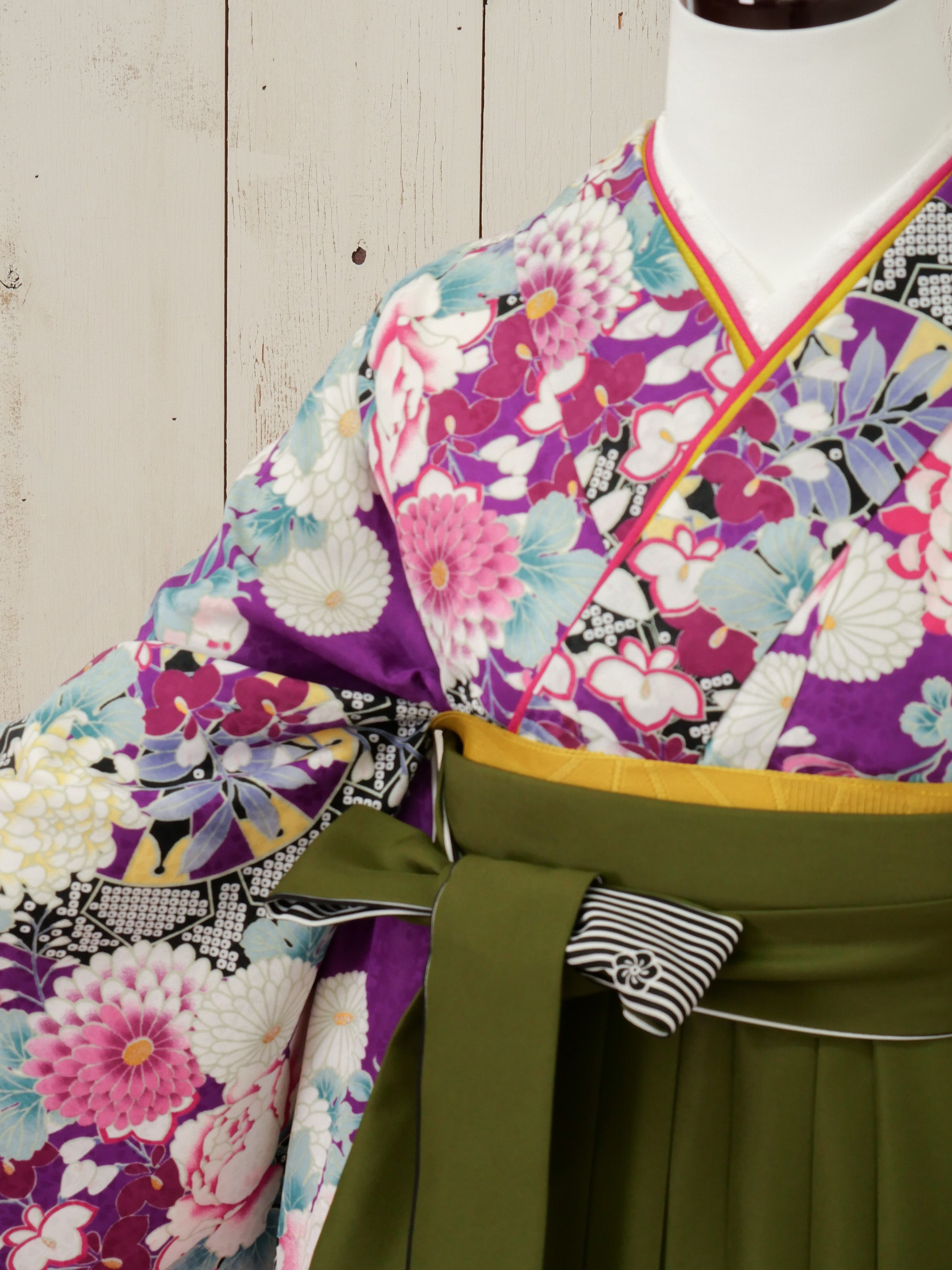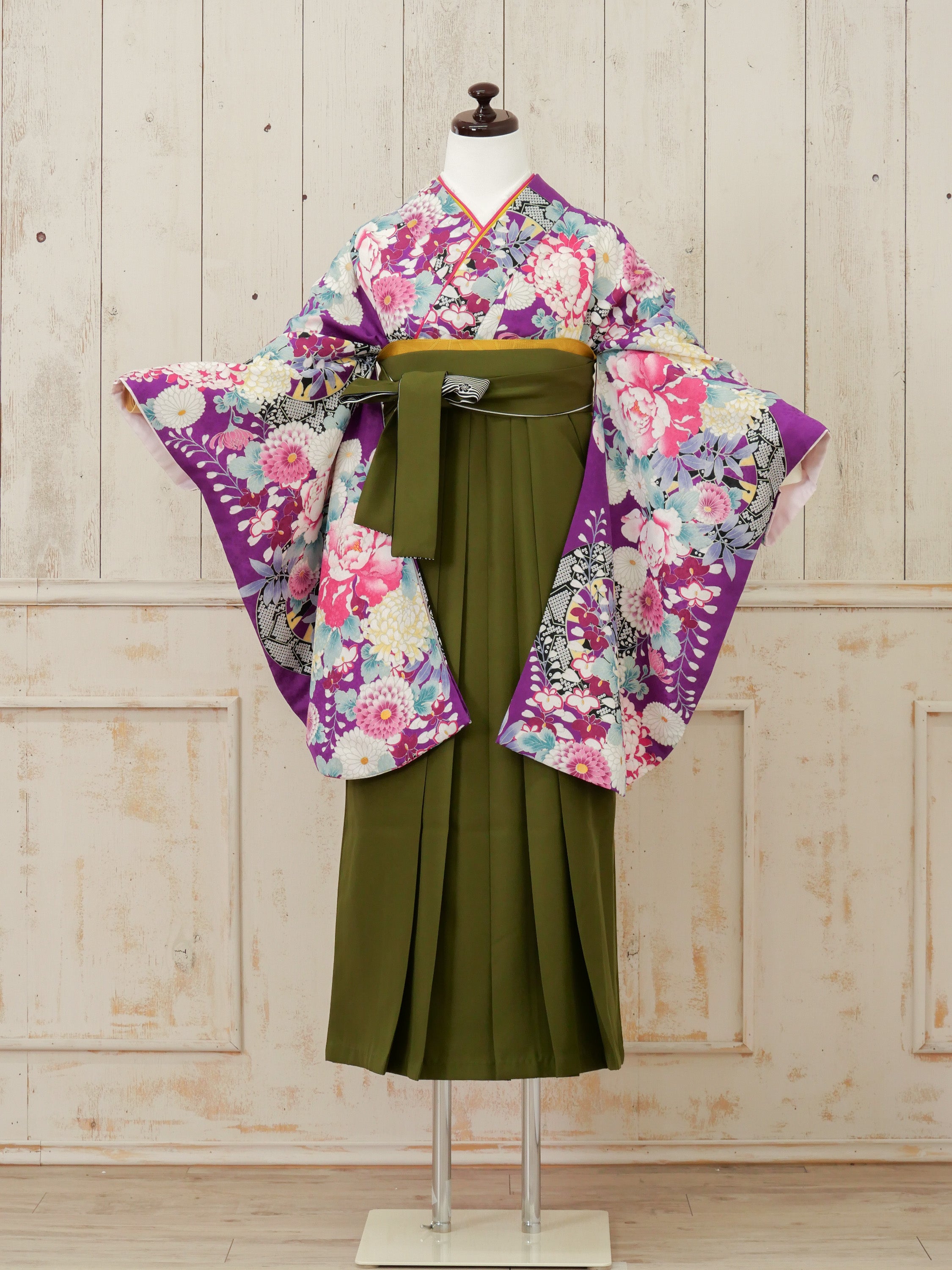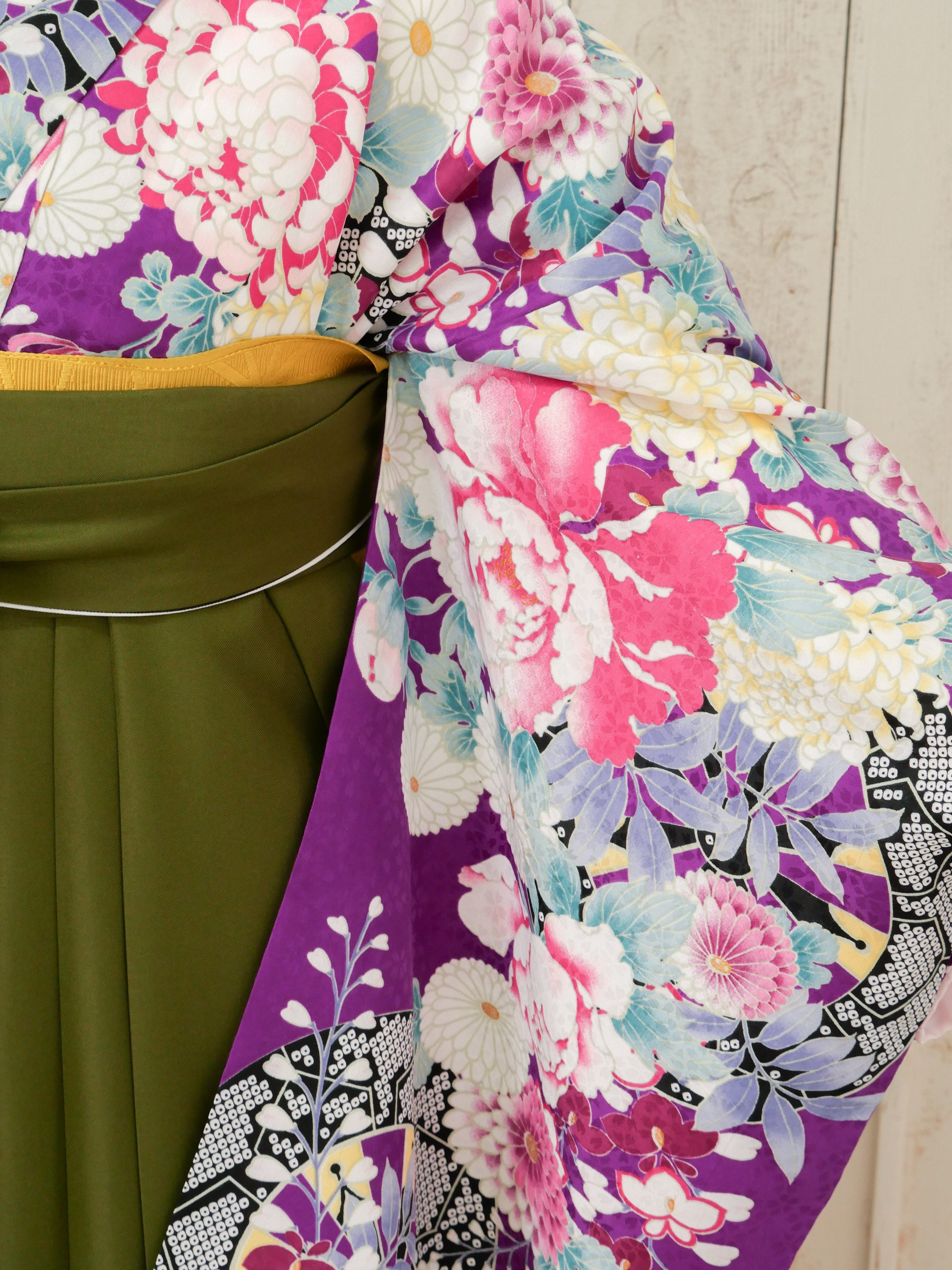 紫の地に鮮やかな花々が踊るレトロポップな一枚。抹茶色の袴で個性と可愛さを両立。