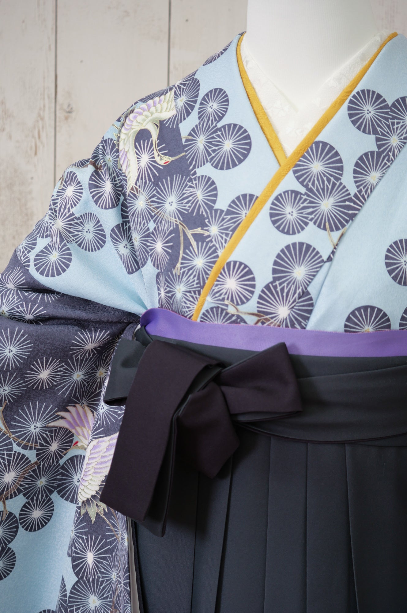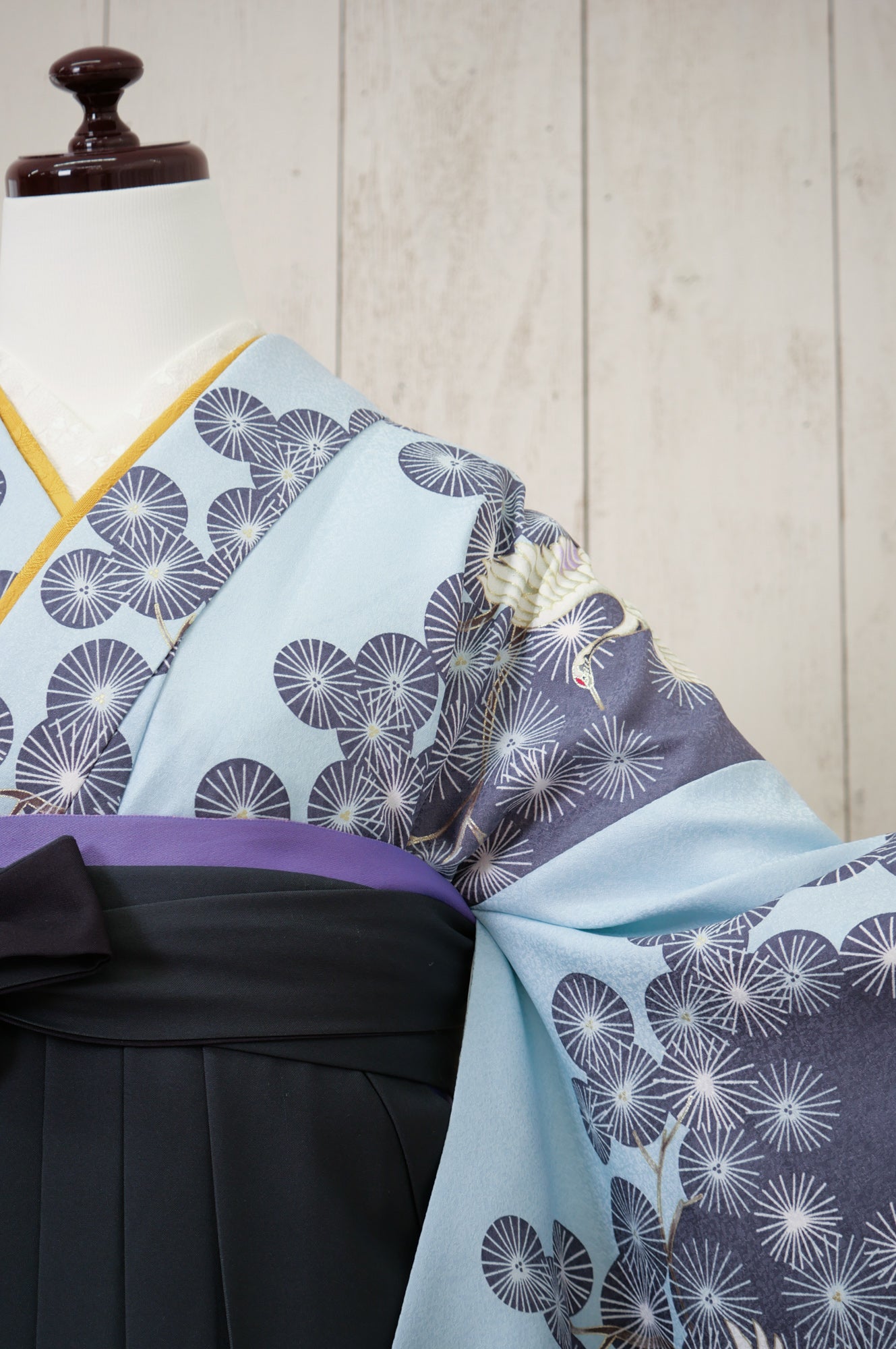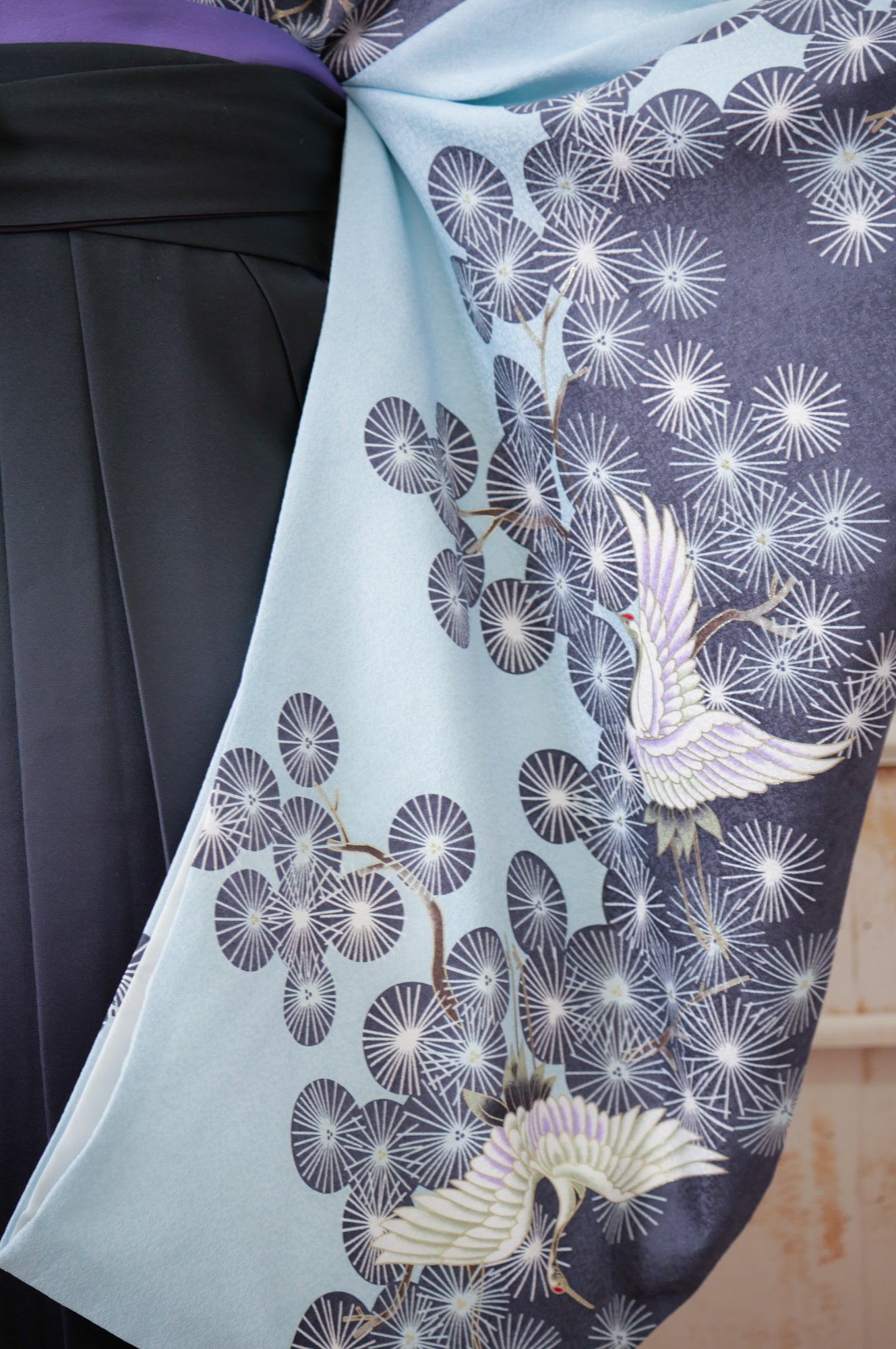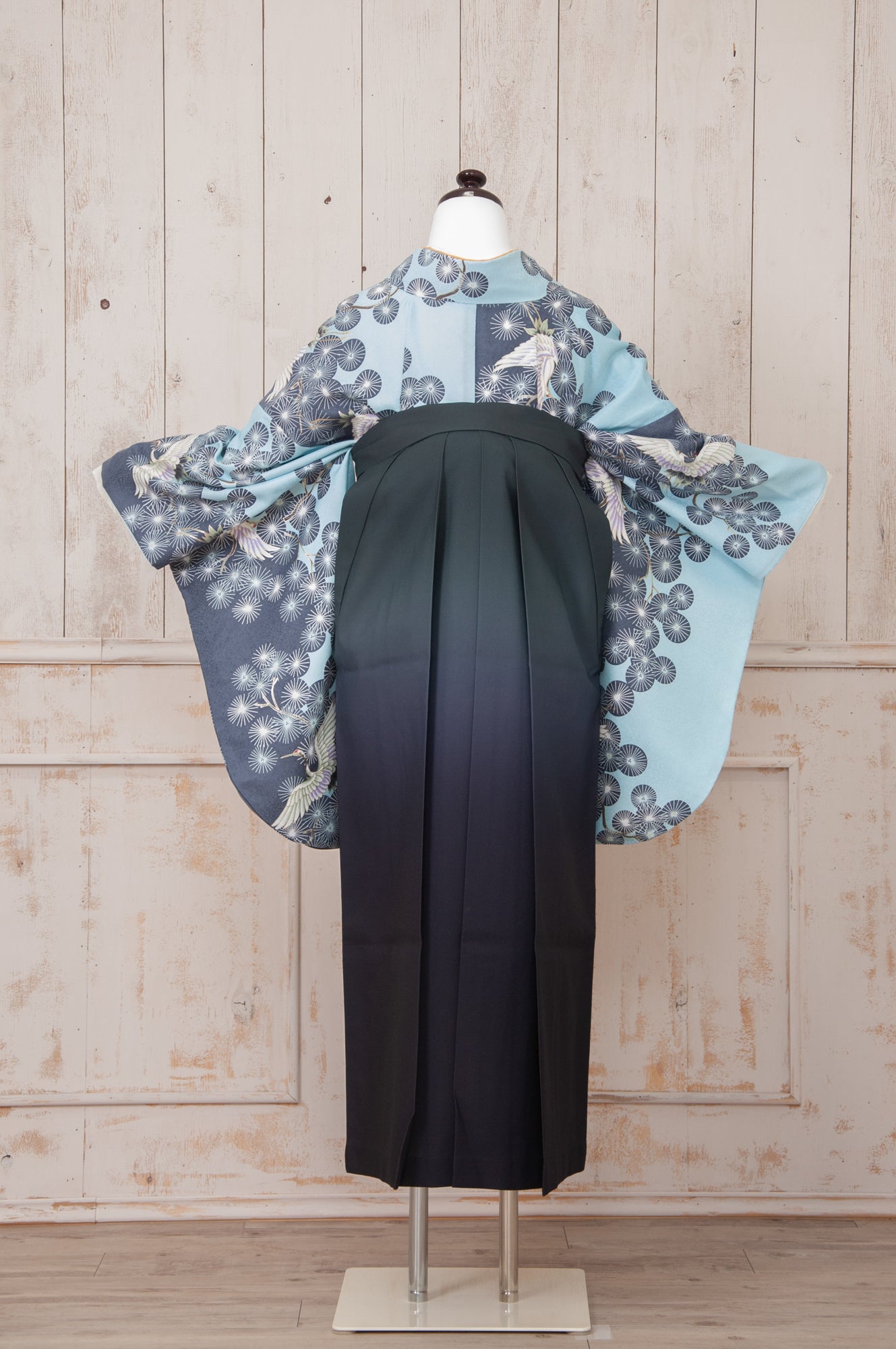 空色に黒の松模様と白鶴が舞う格式高いデザイン。深みのある袴と合わせて、上品で優雅な印象に。