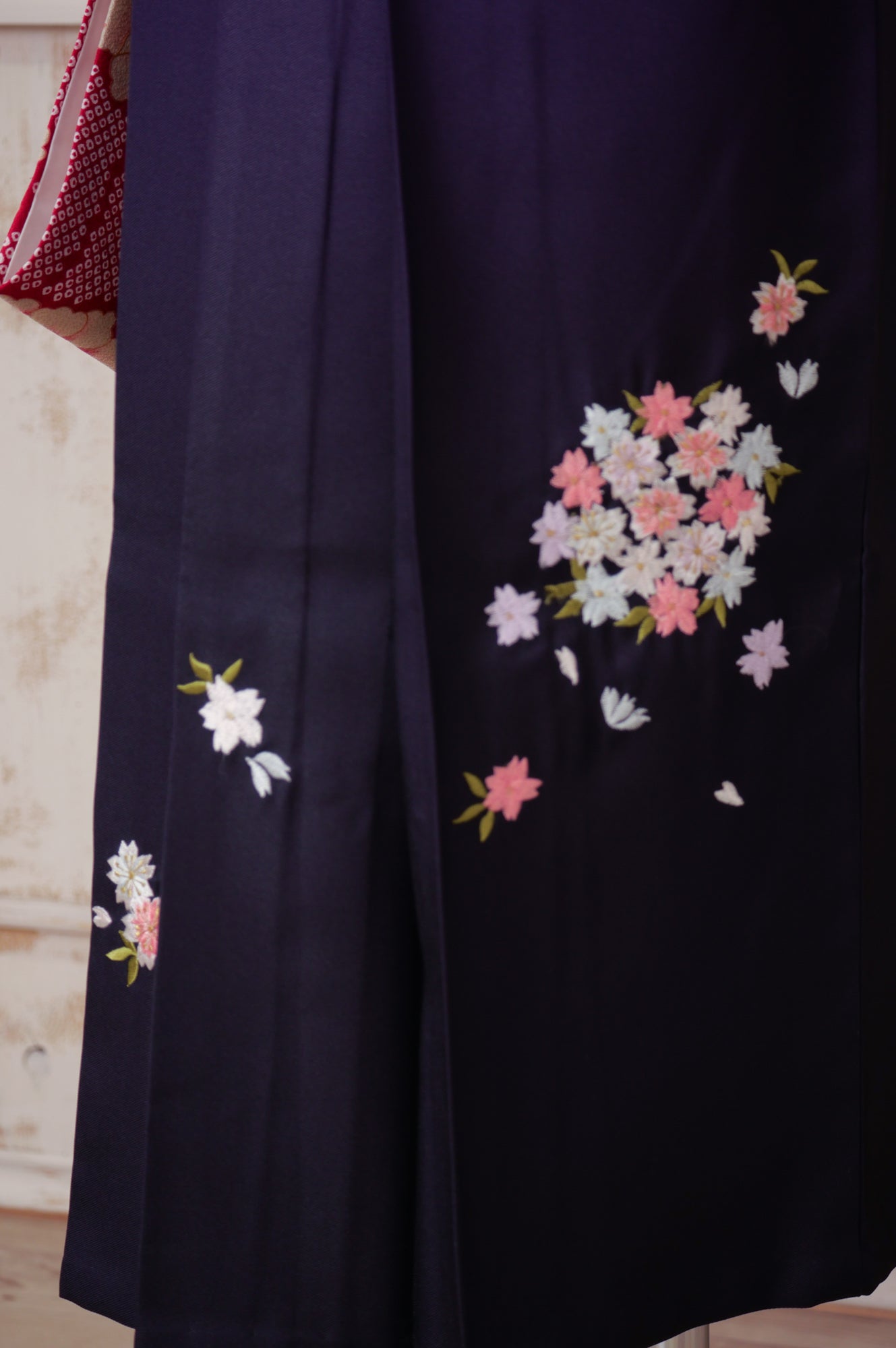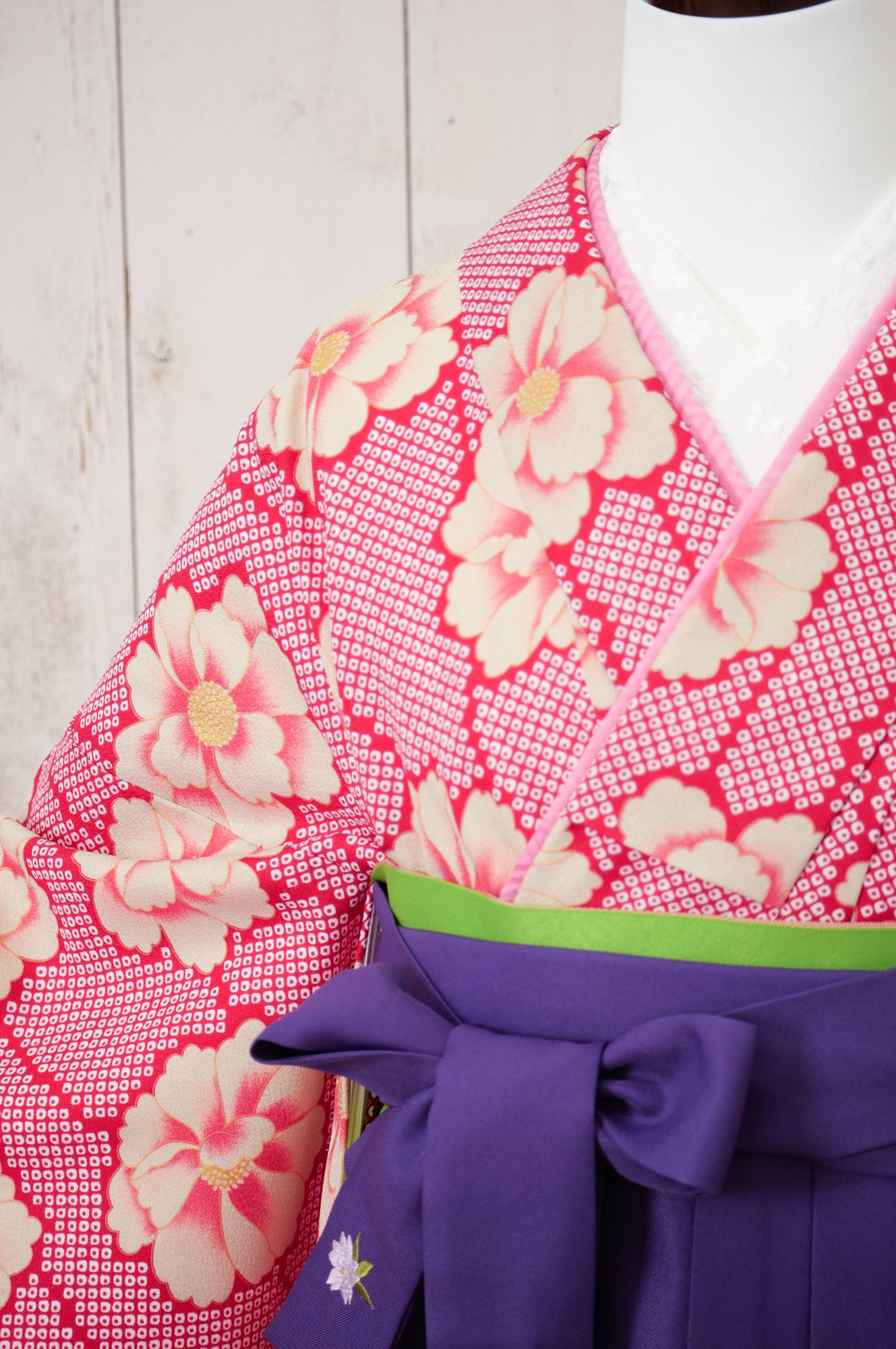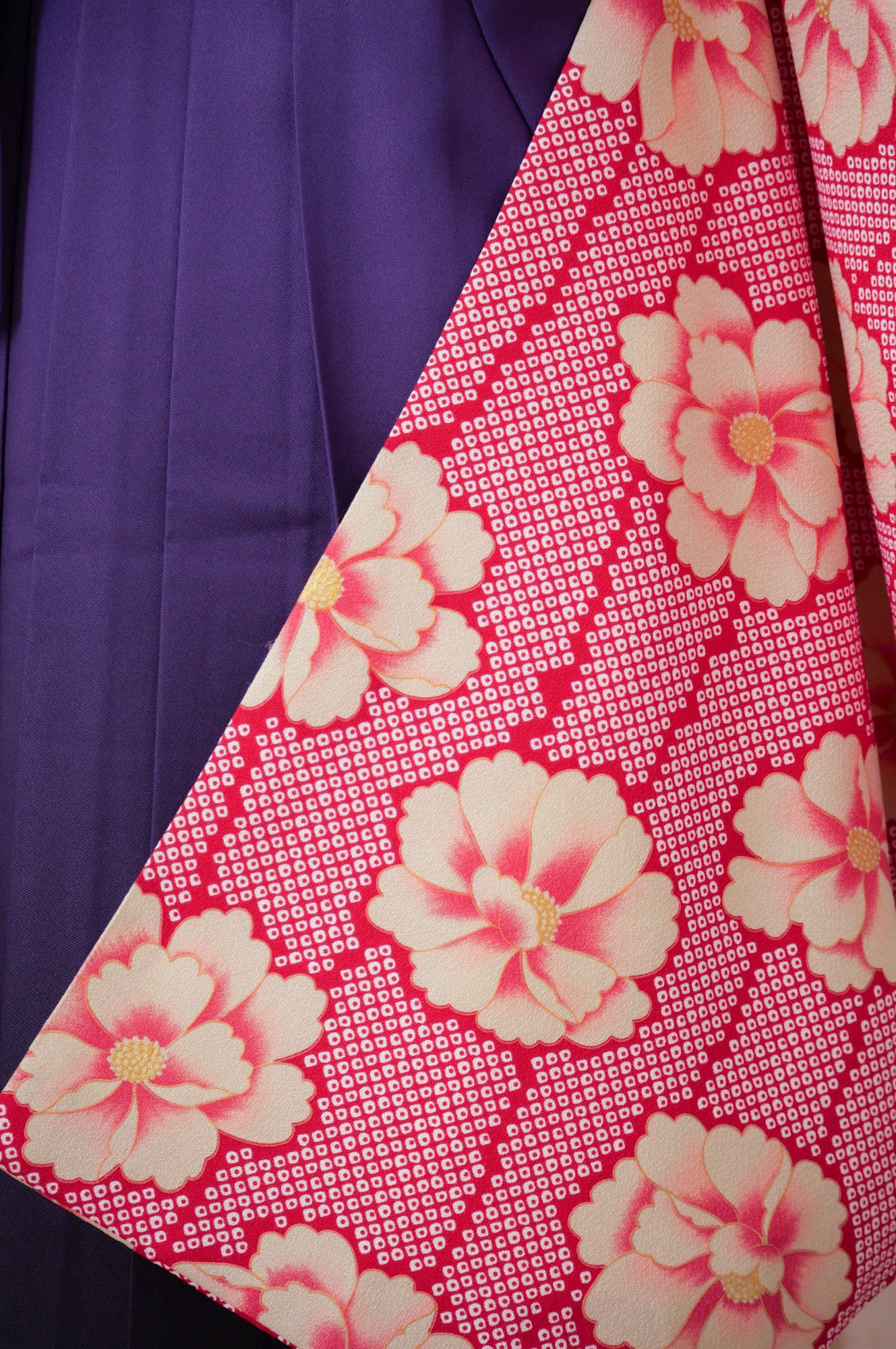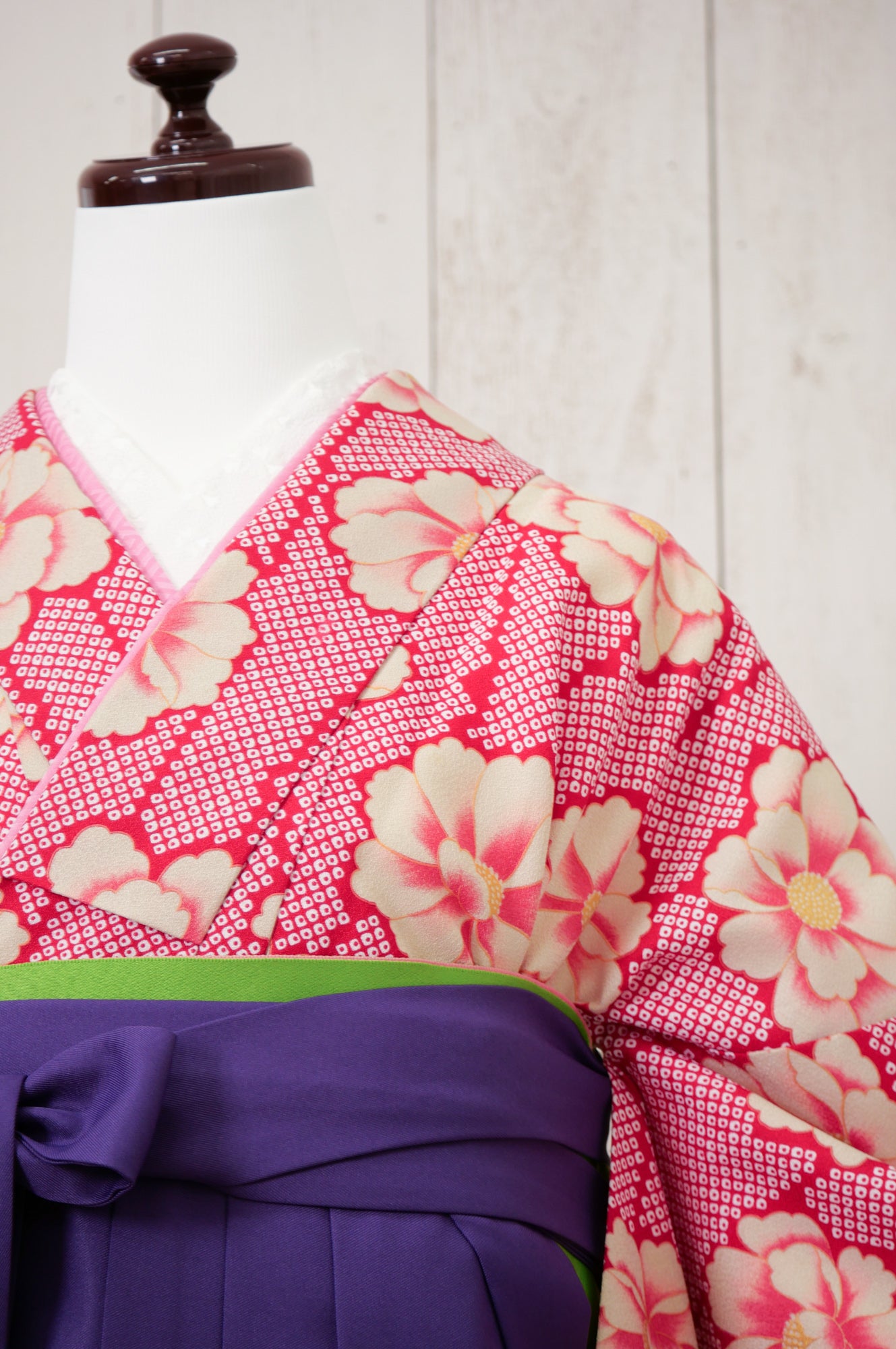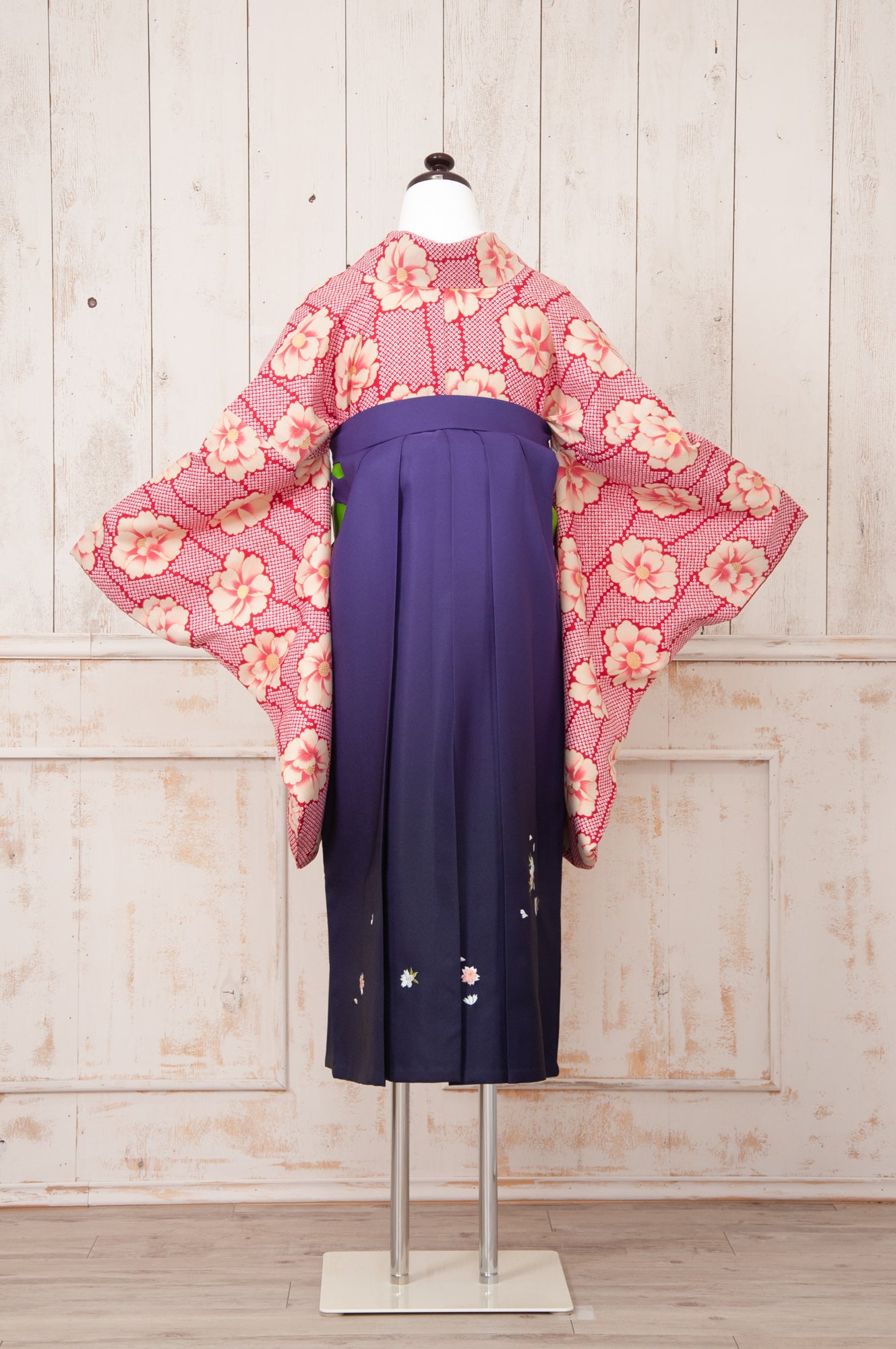 レトロな赤の地に可憐な椿柄が映えるデザイン。紺色の袴が全体を引き締め、華やかさと落ち着きを兼ね備えた一着です。
