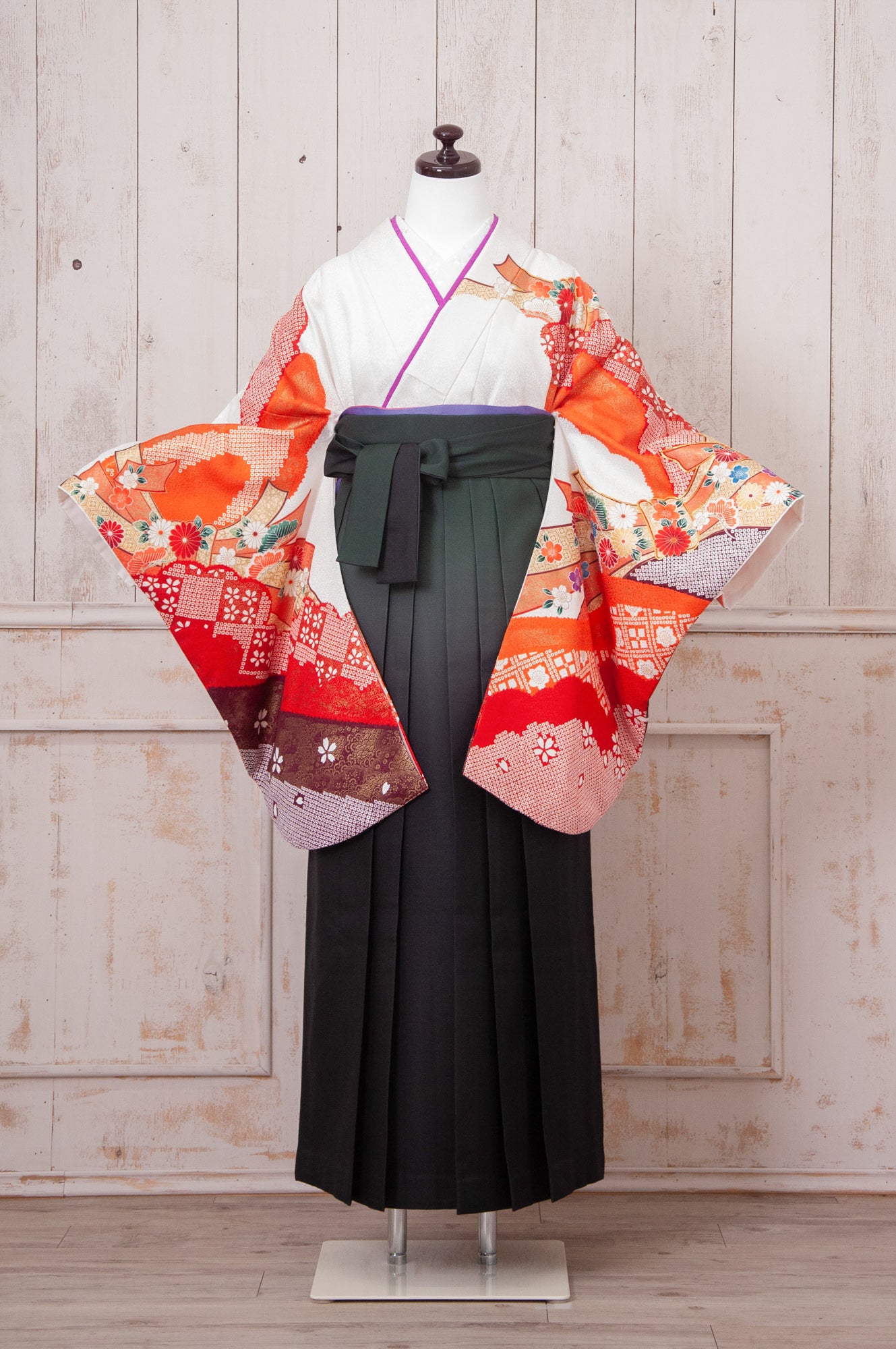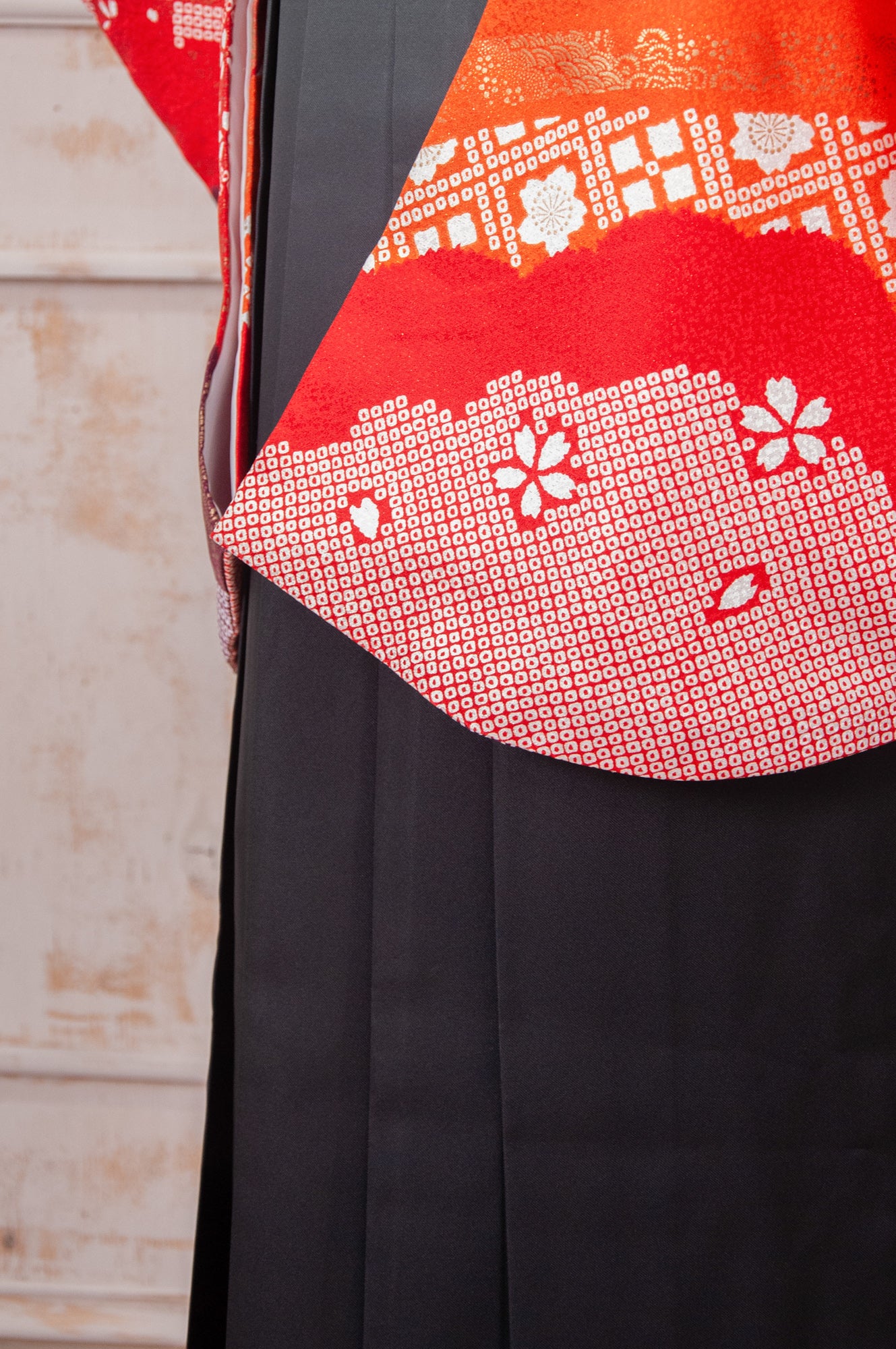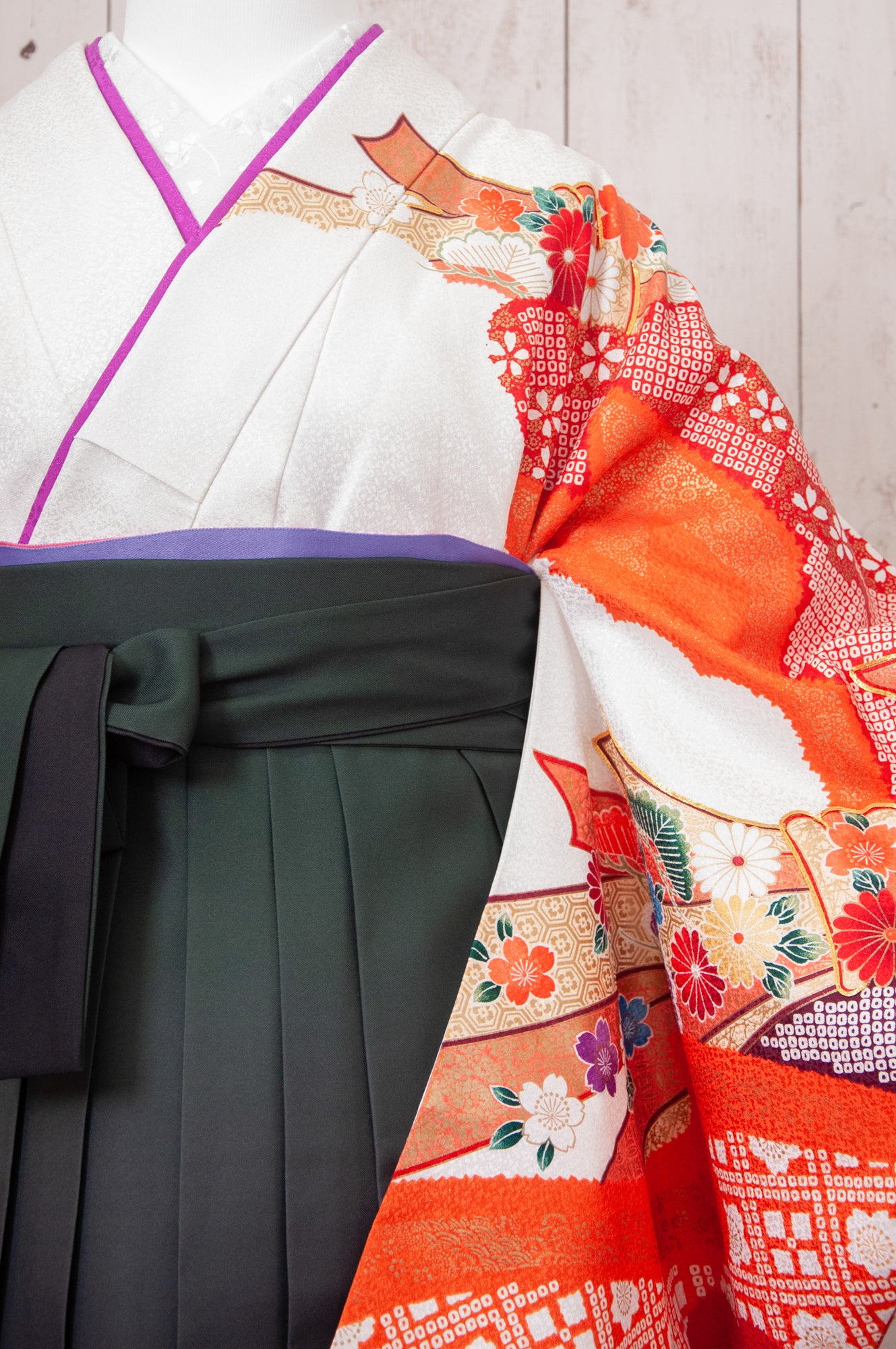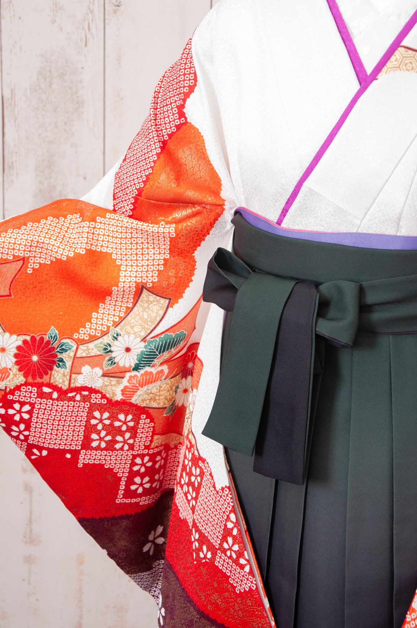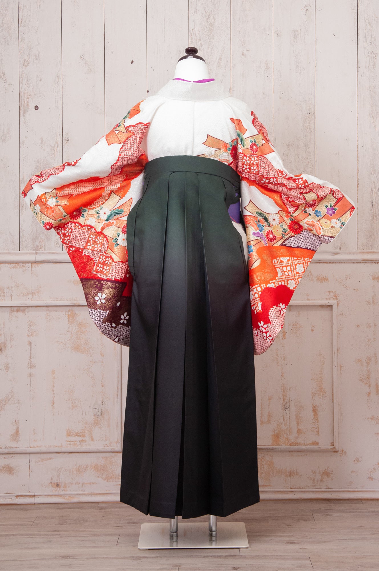 白ベースに朱・赤のグラデーション柄が施された優美な着物。深緑の袴で引き締まった印象に。