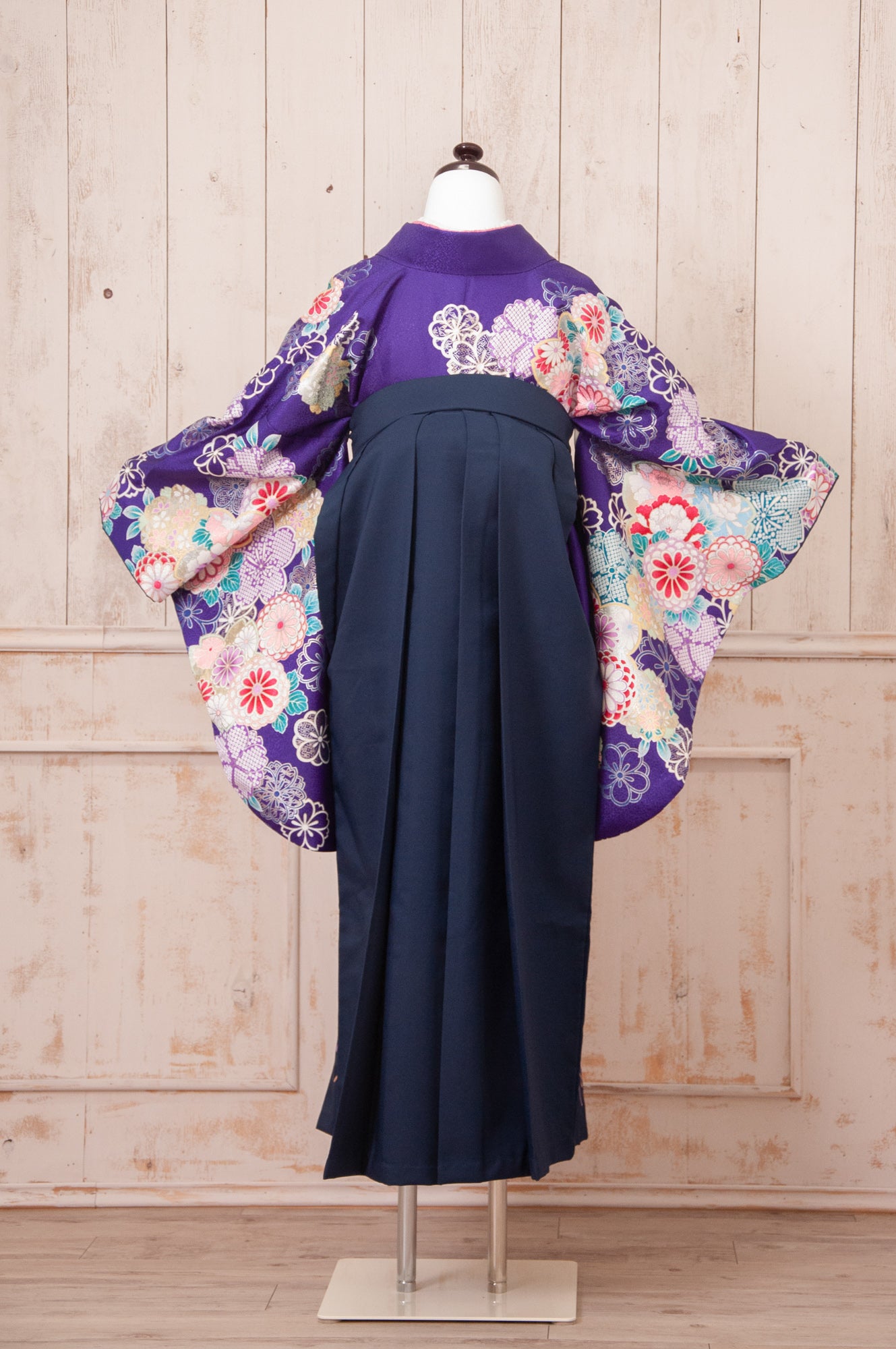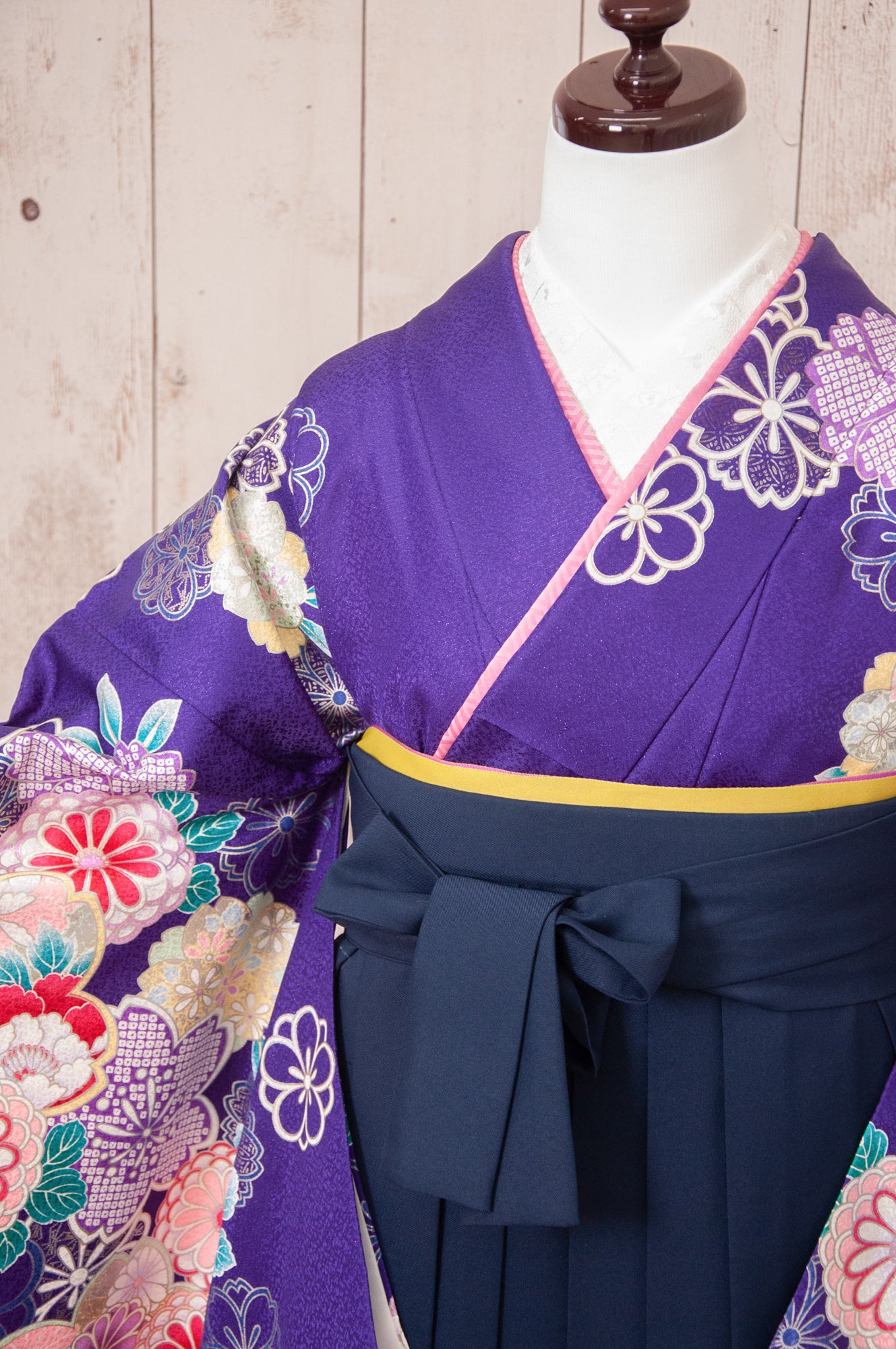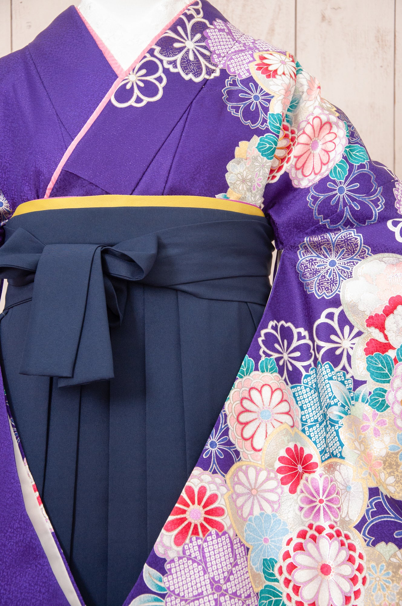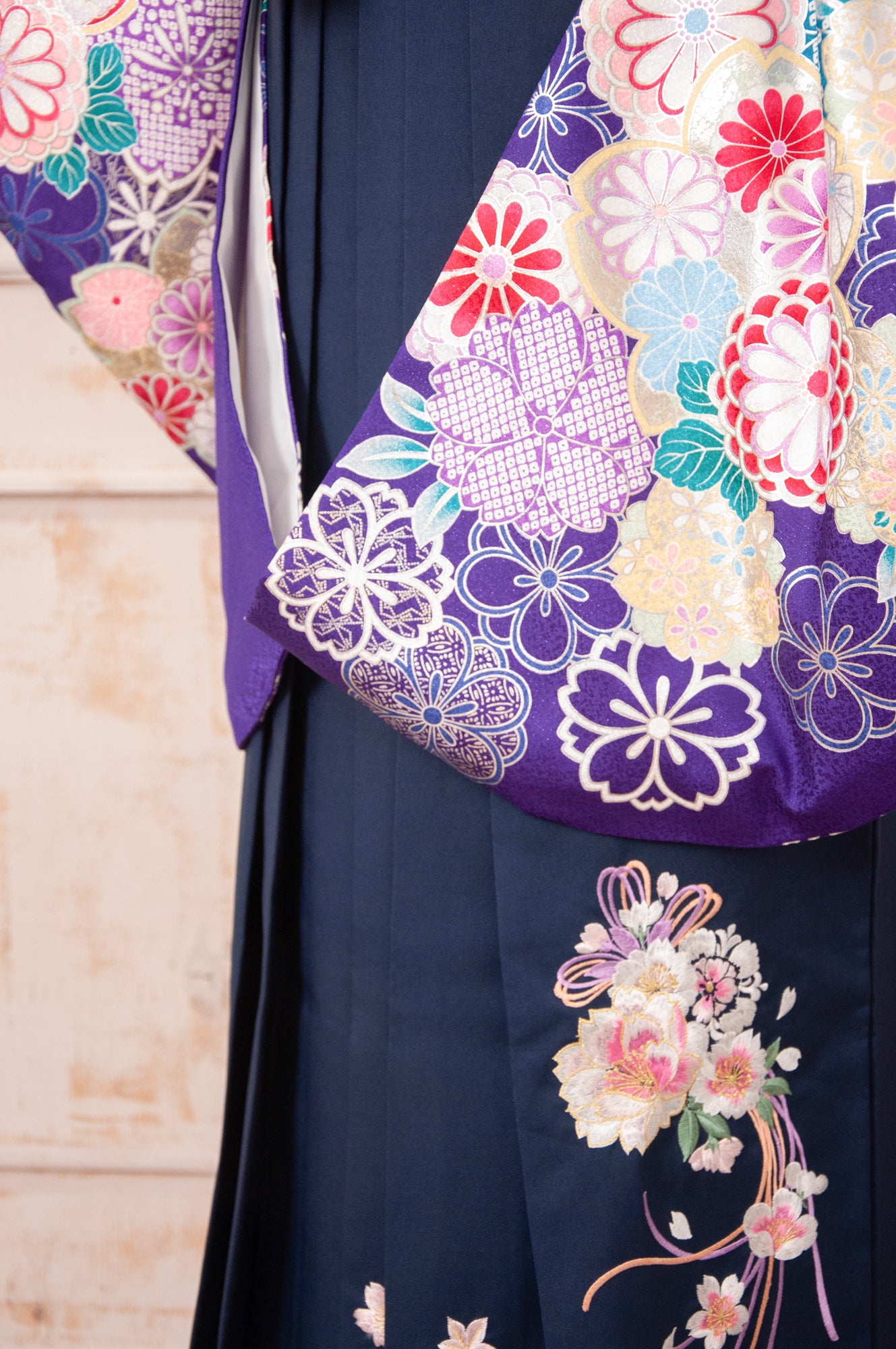 紫地に繊細な花模様が豪華に映える優雅なスタイル。濃紺の袴と合わせて大人可愛い印象に。