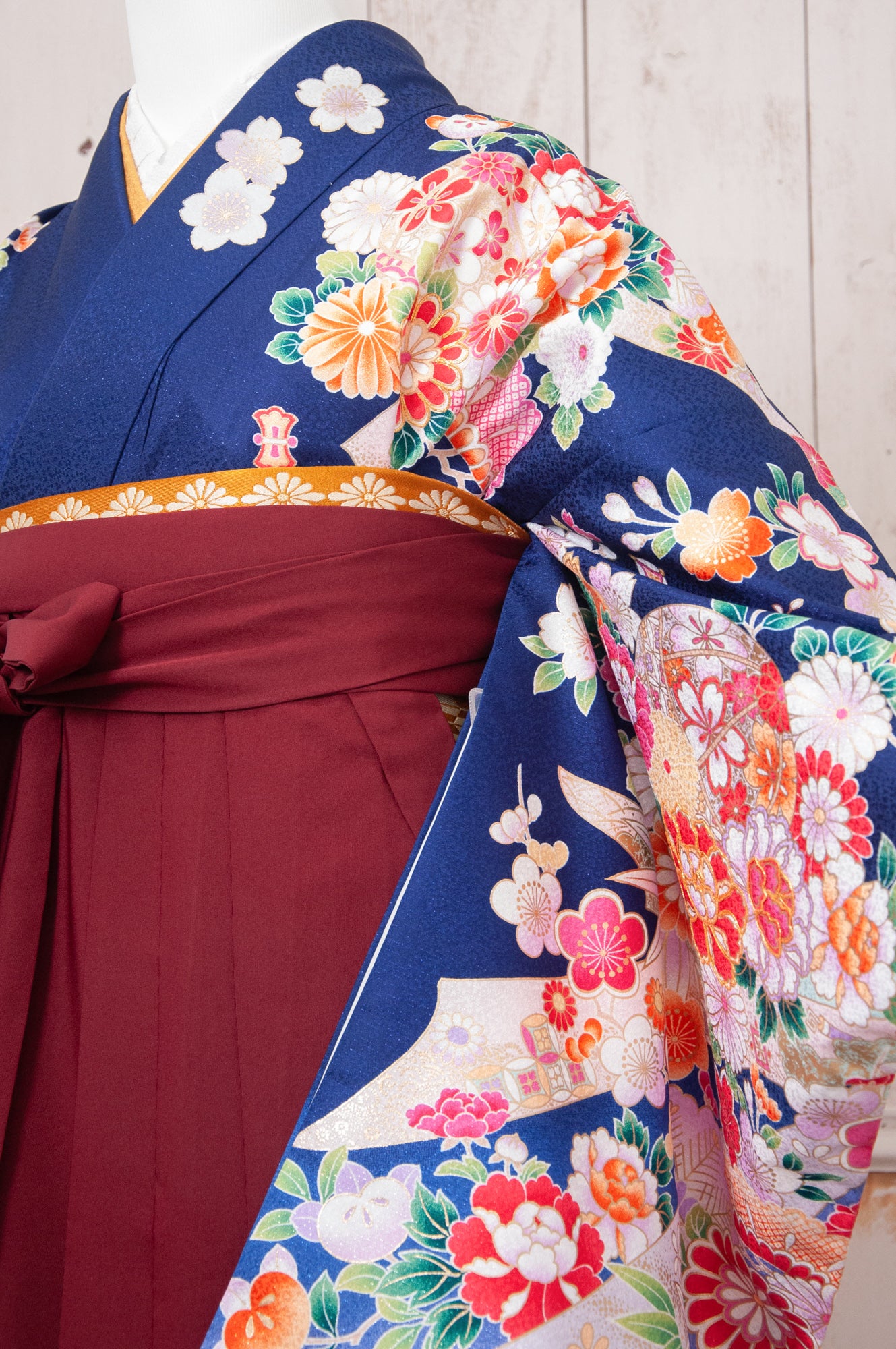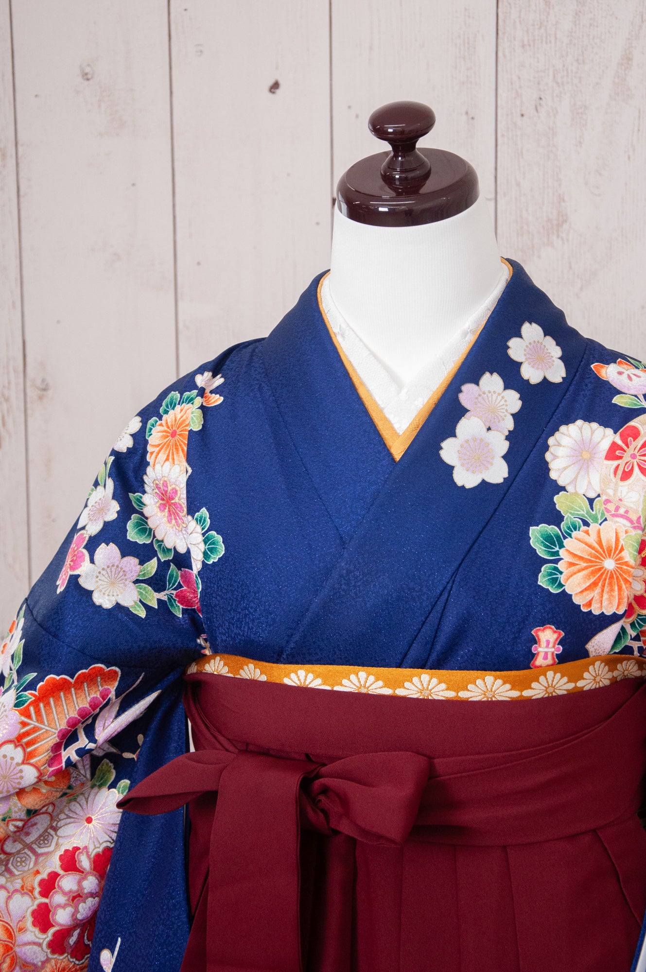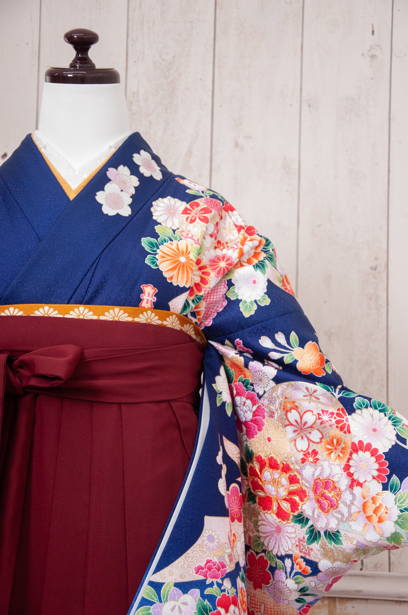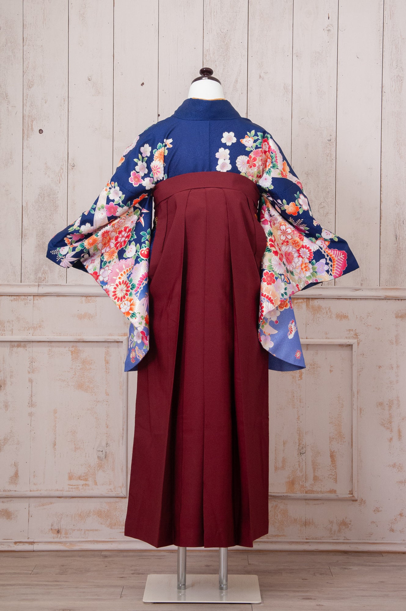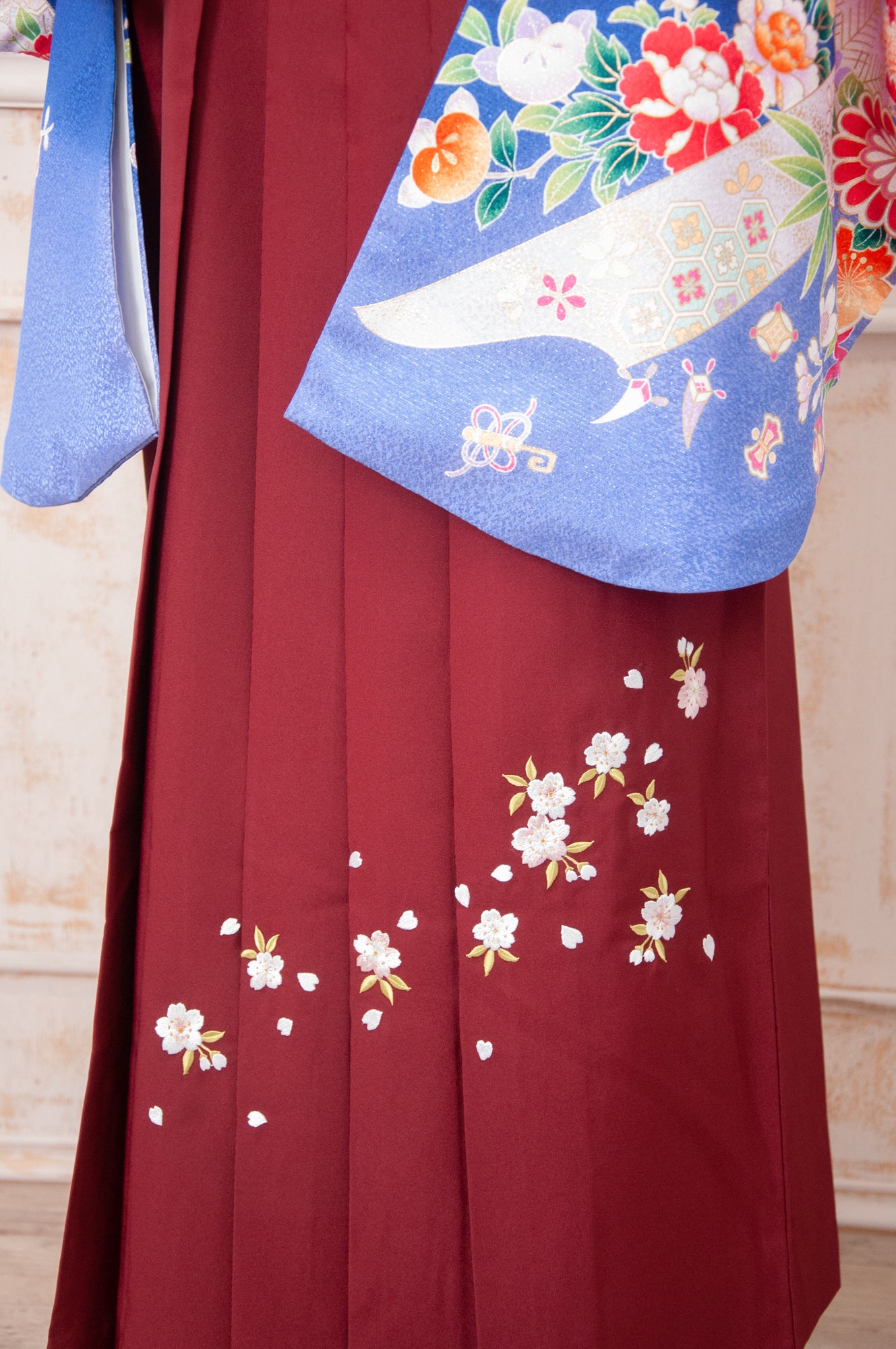 鮮やかな青に咲く花々が華やかな印象。深いエンジの袴と合わせて、知的で凛とした卒業スタイルに。