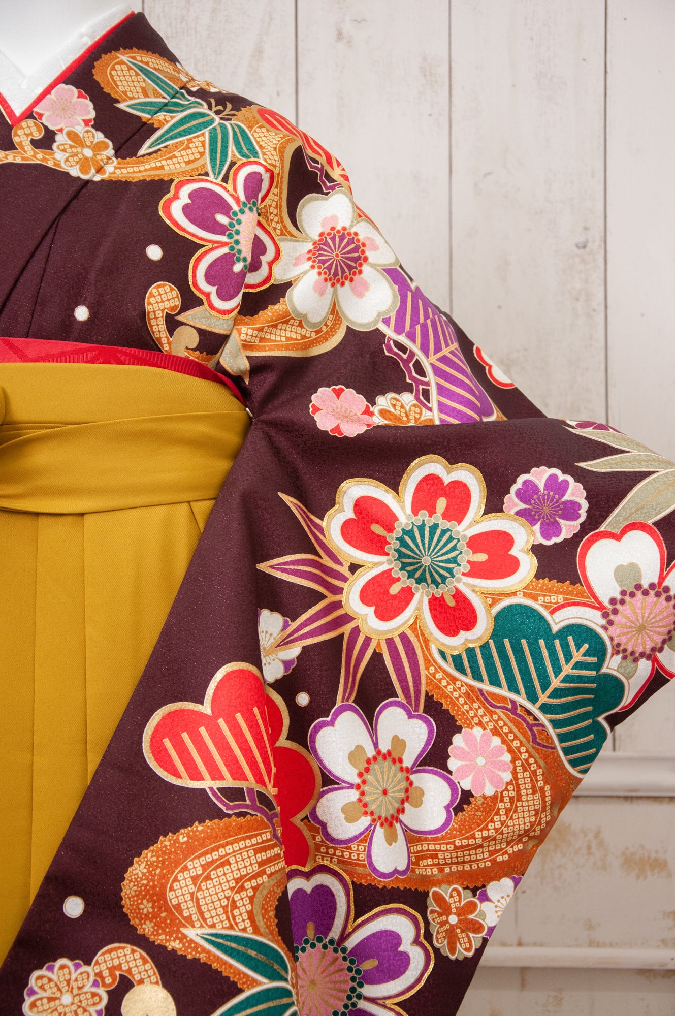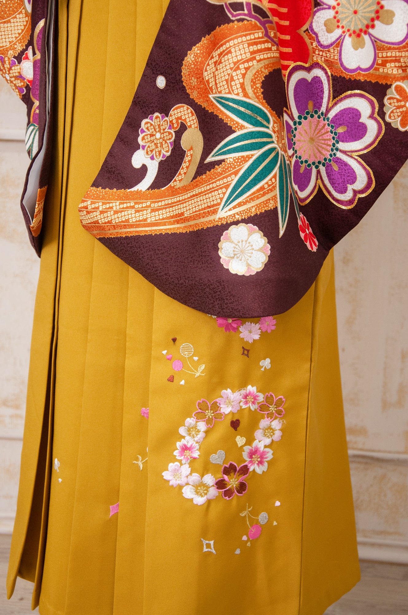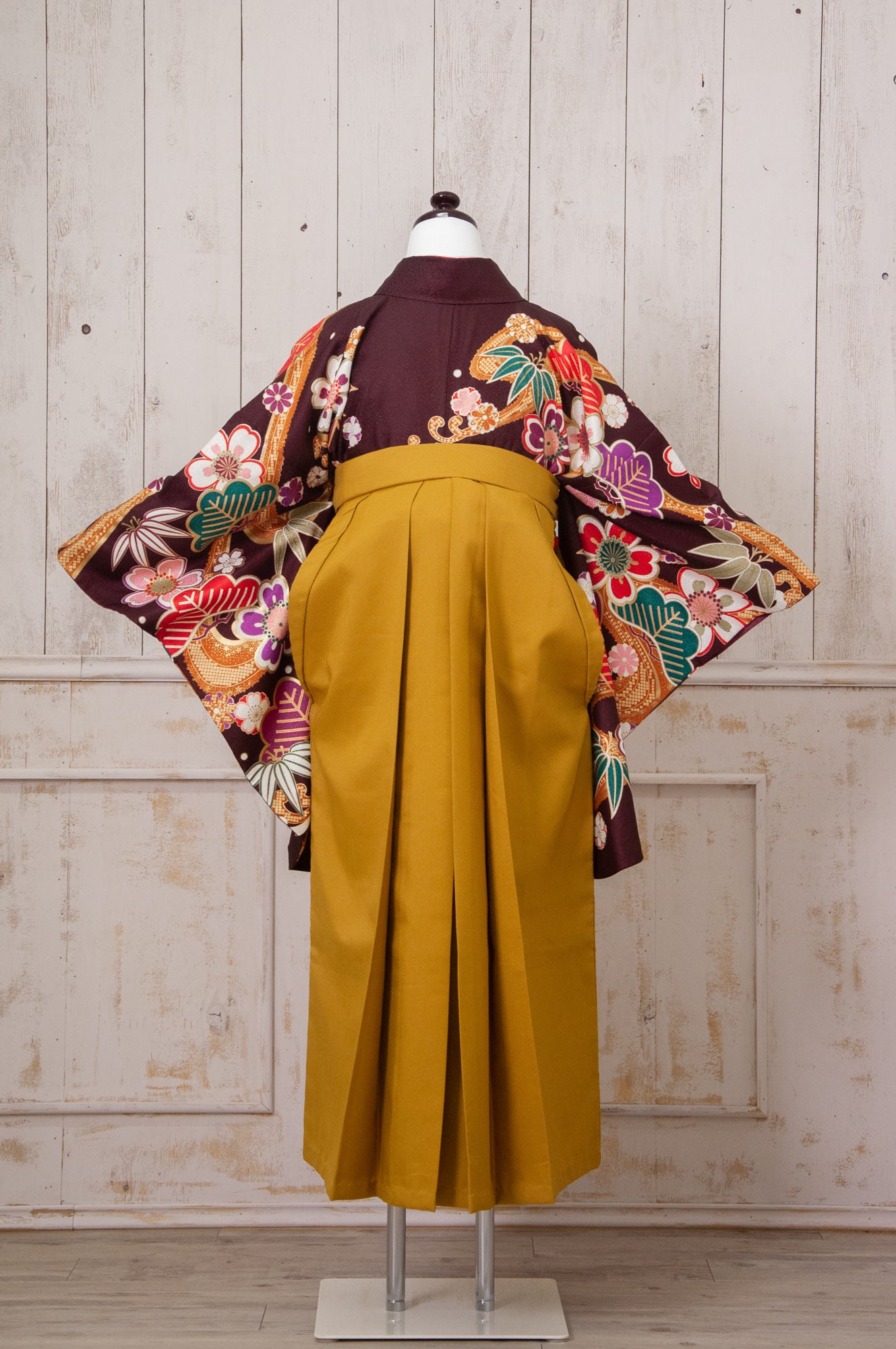 深みのあるえんじ色の着物に、華やかな花々と扇柄が映えるクラシカルな一着。からし色の袴が上品さと個性を引き立て、落ち着いた中にも華やかさを感じさせます。
