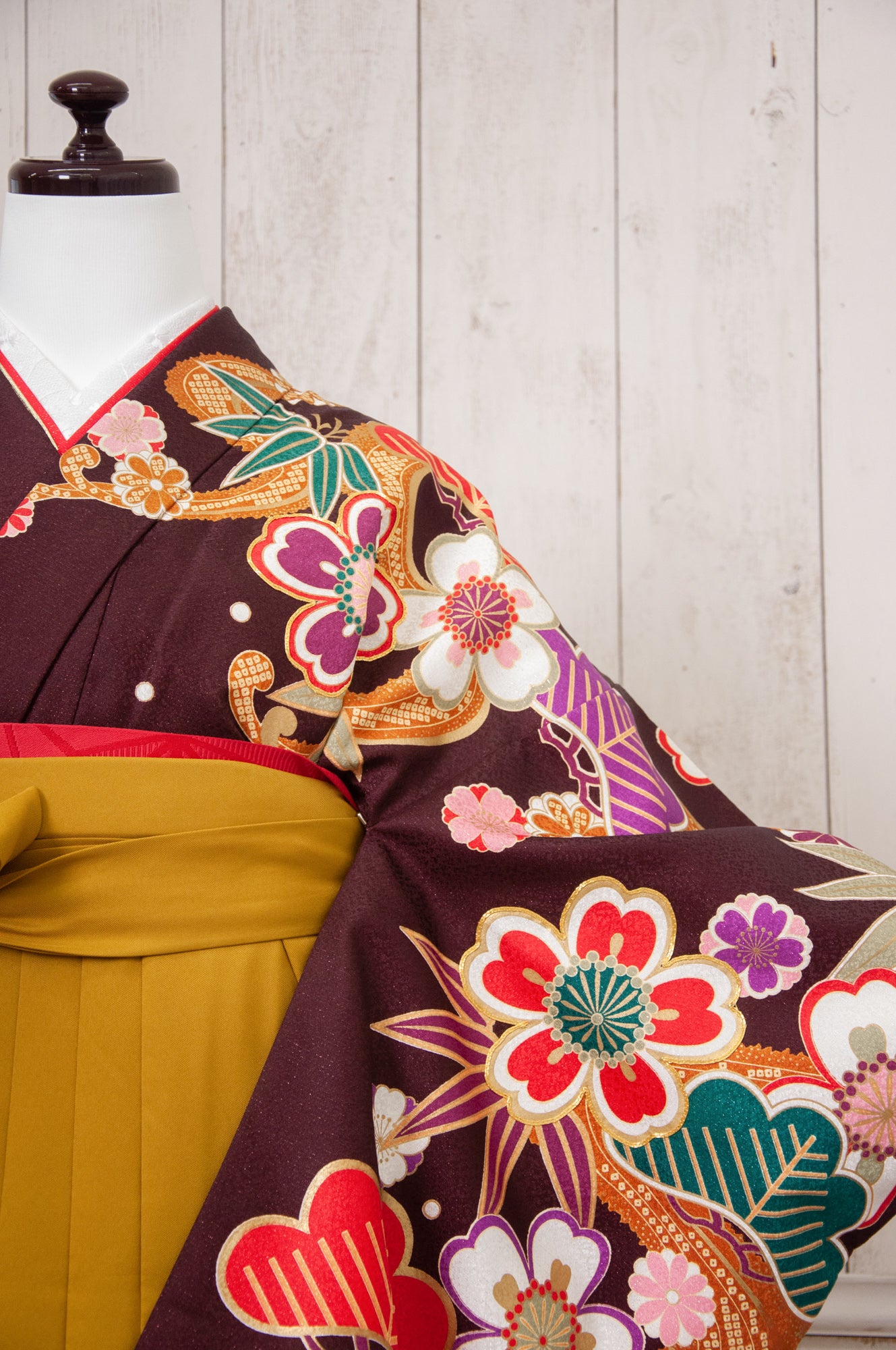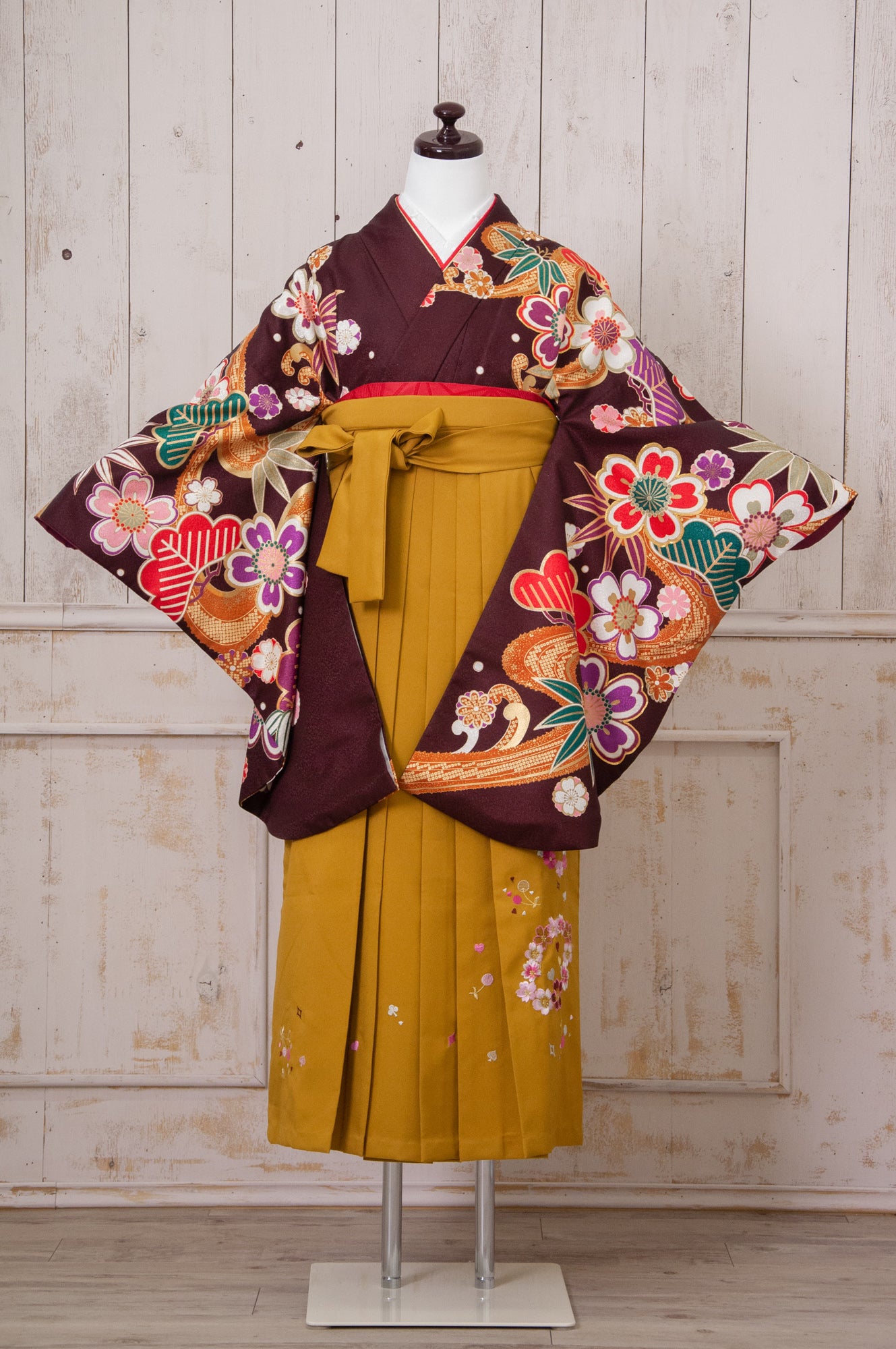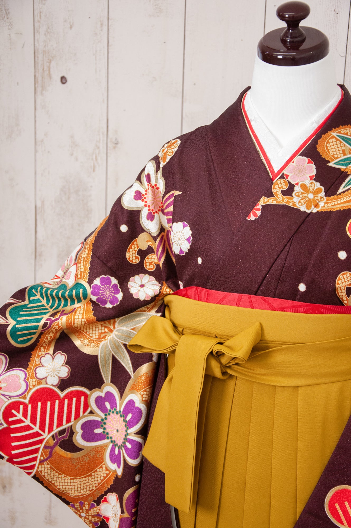 深みのあるえんじ色の着物に、華やかな花々と扇柄が映えるクラシカルな一着。からし色の袴が上品さと個性を引き立て、落ち着いた中にも華やかさを感じさせます。