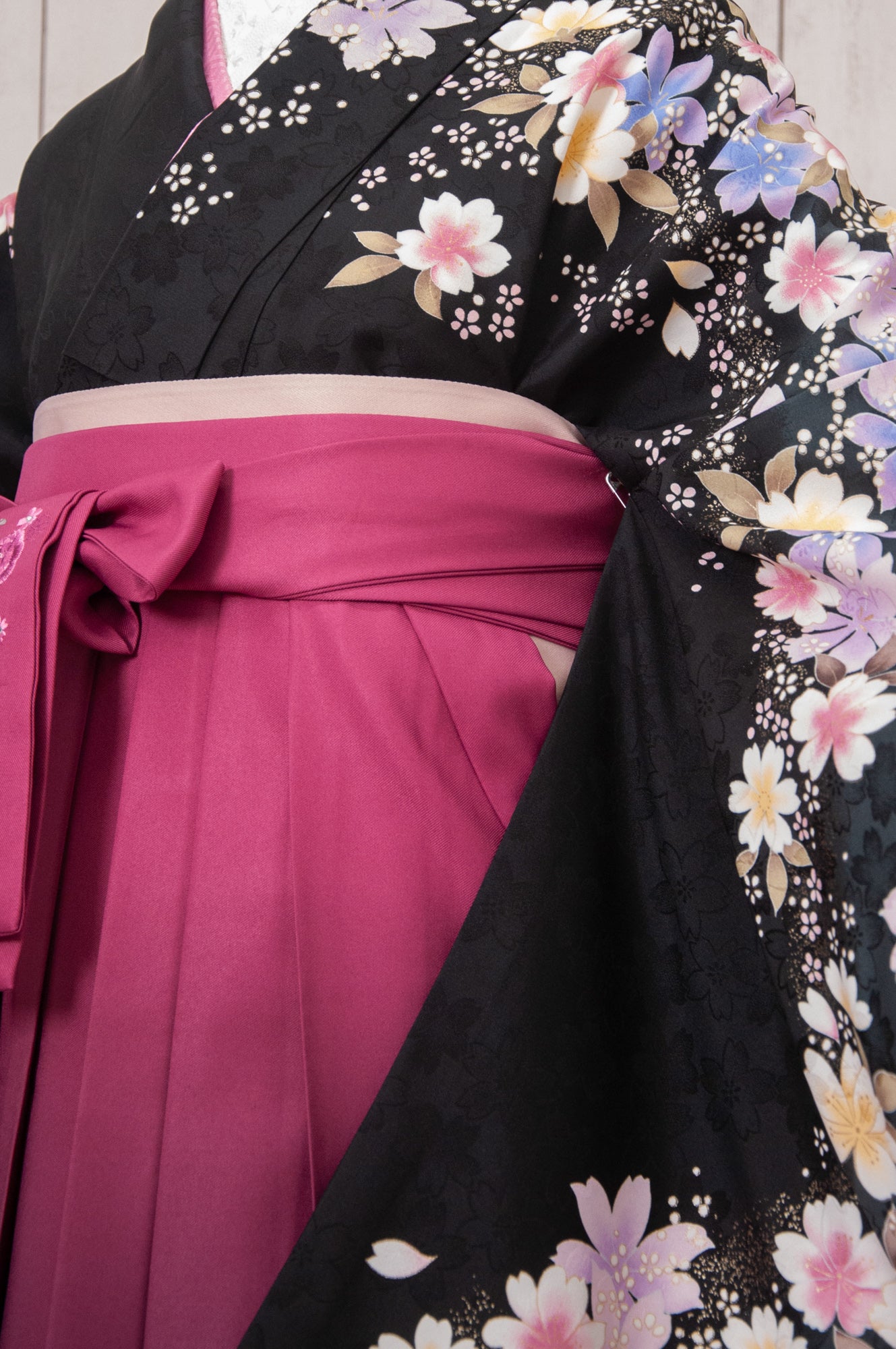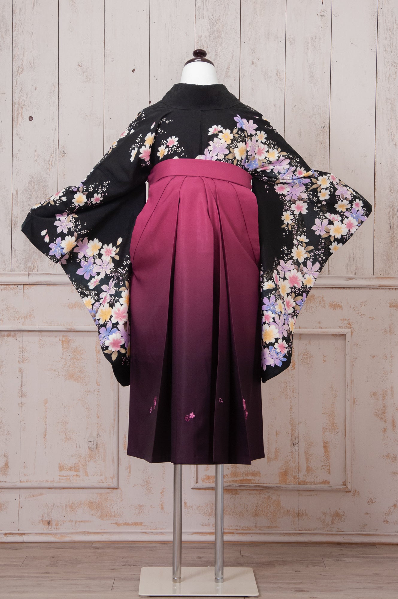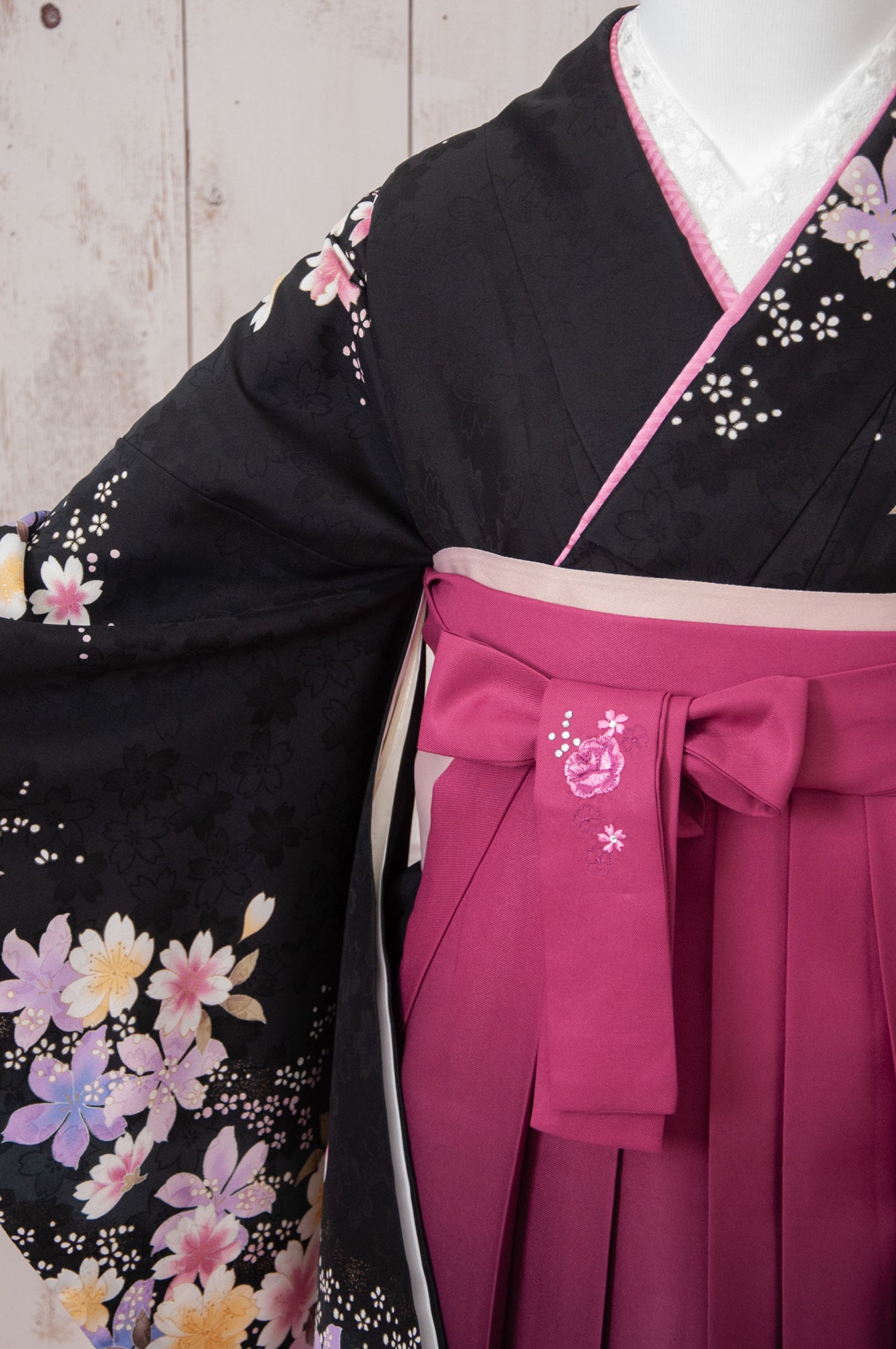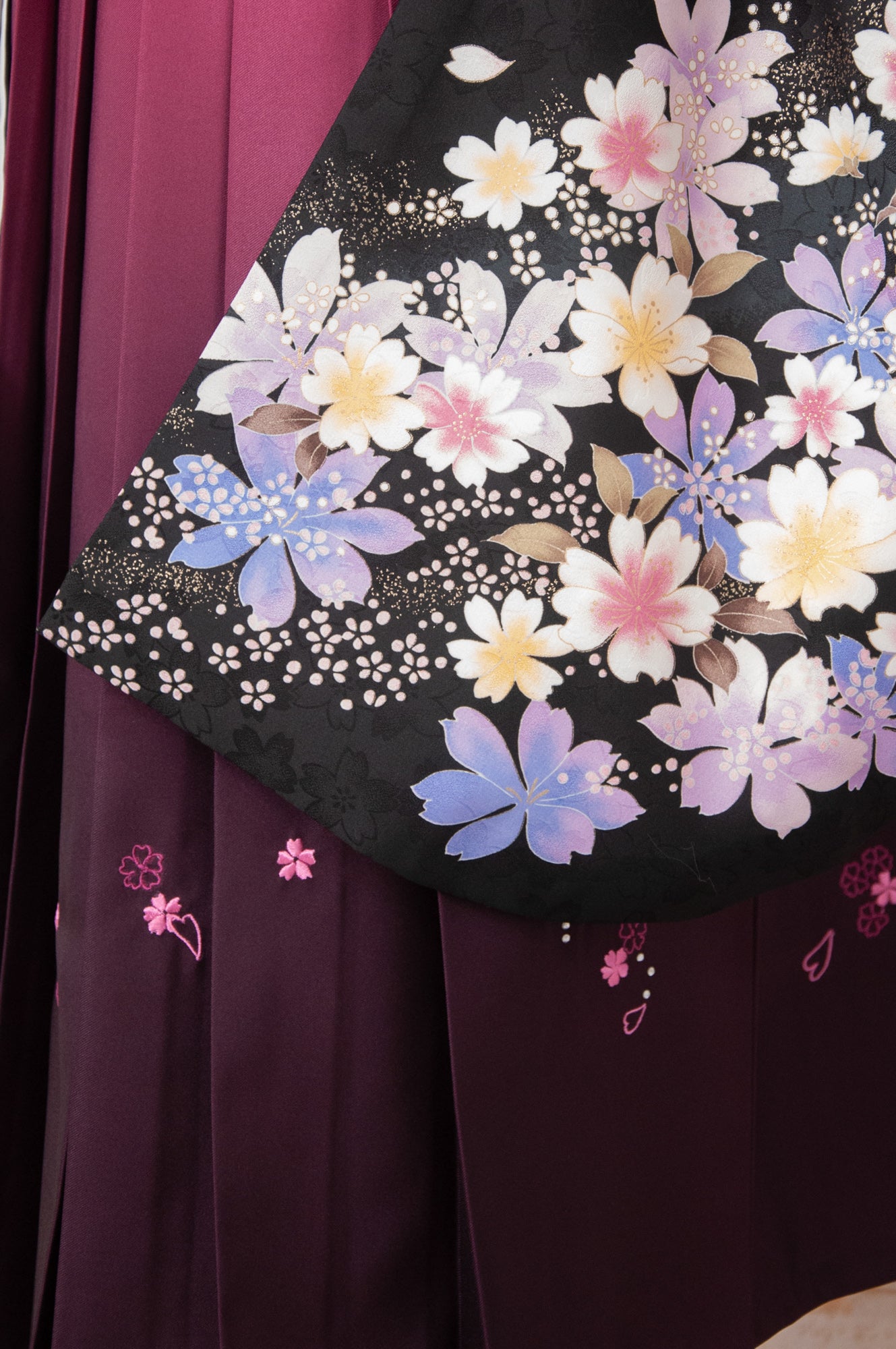 シックな黒地に可憐な桜が舞う、華やかで落ち着いた印象の大人可愛い袴。