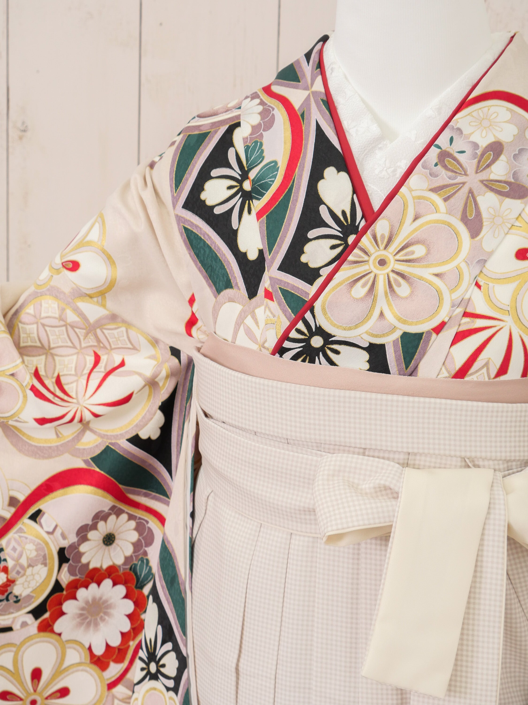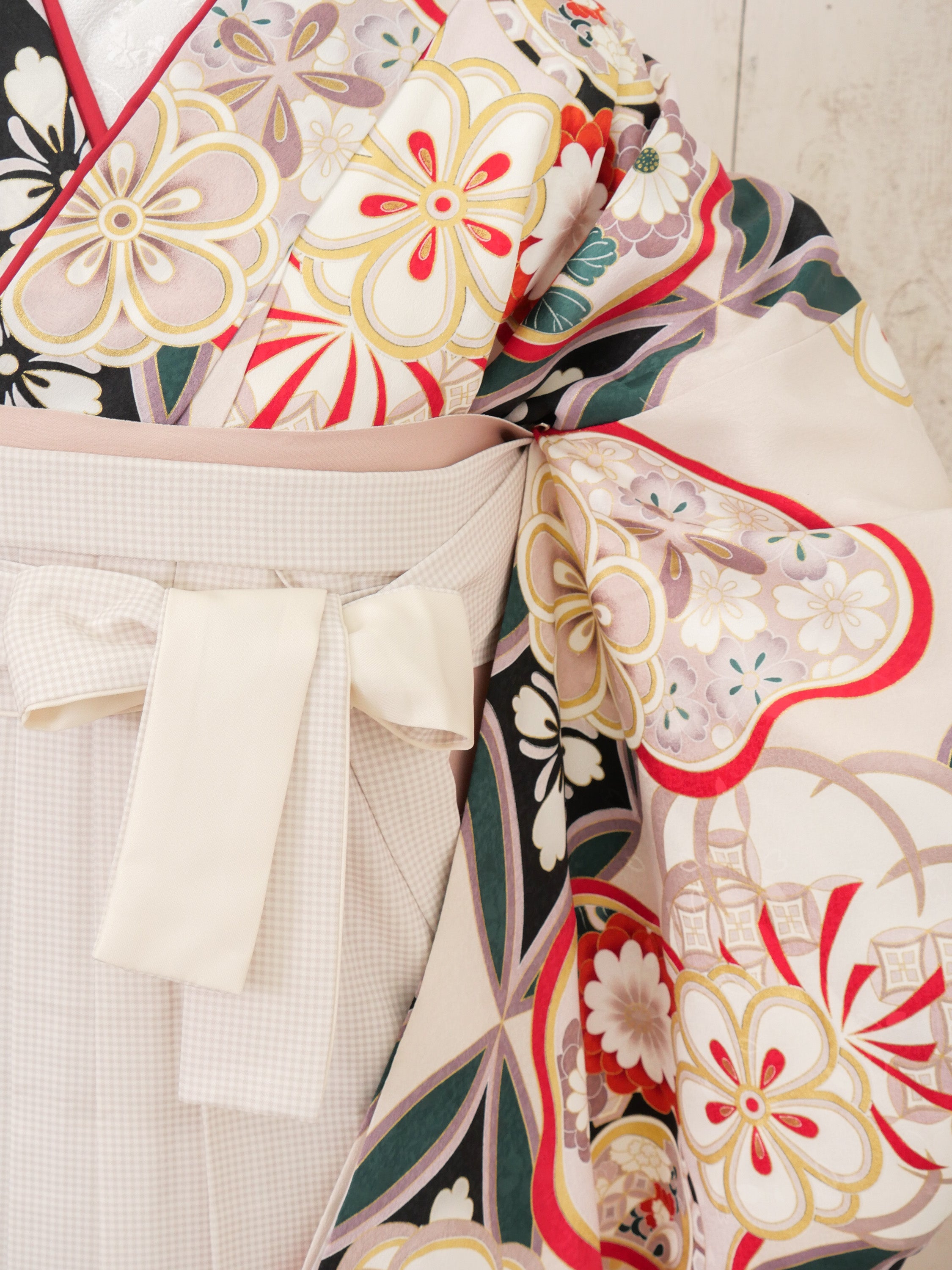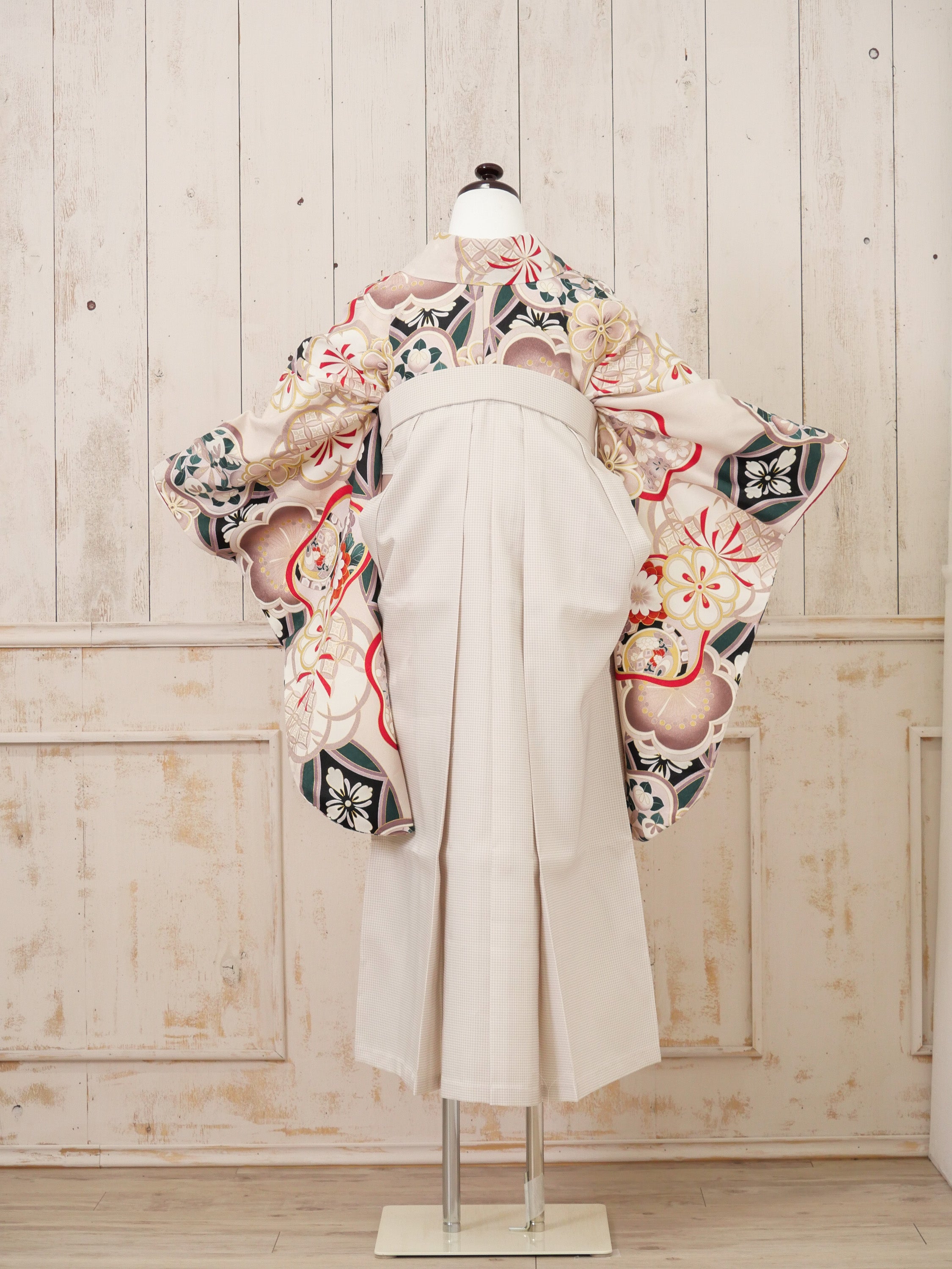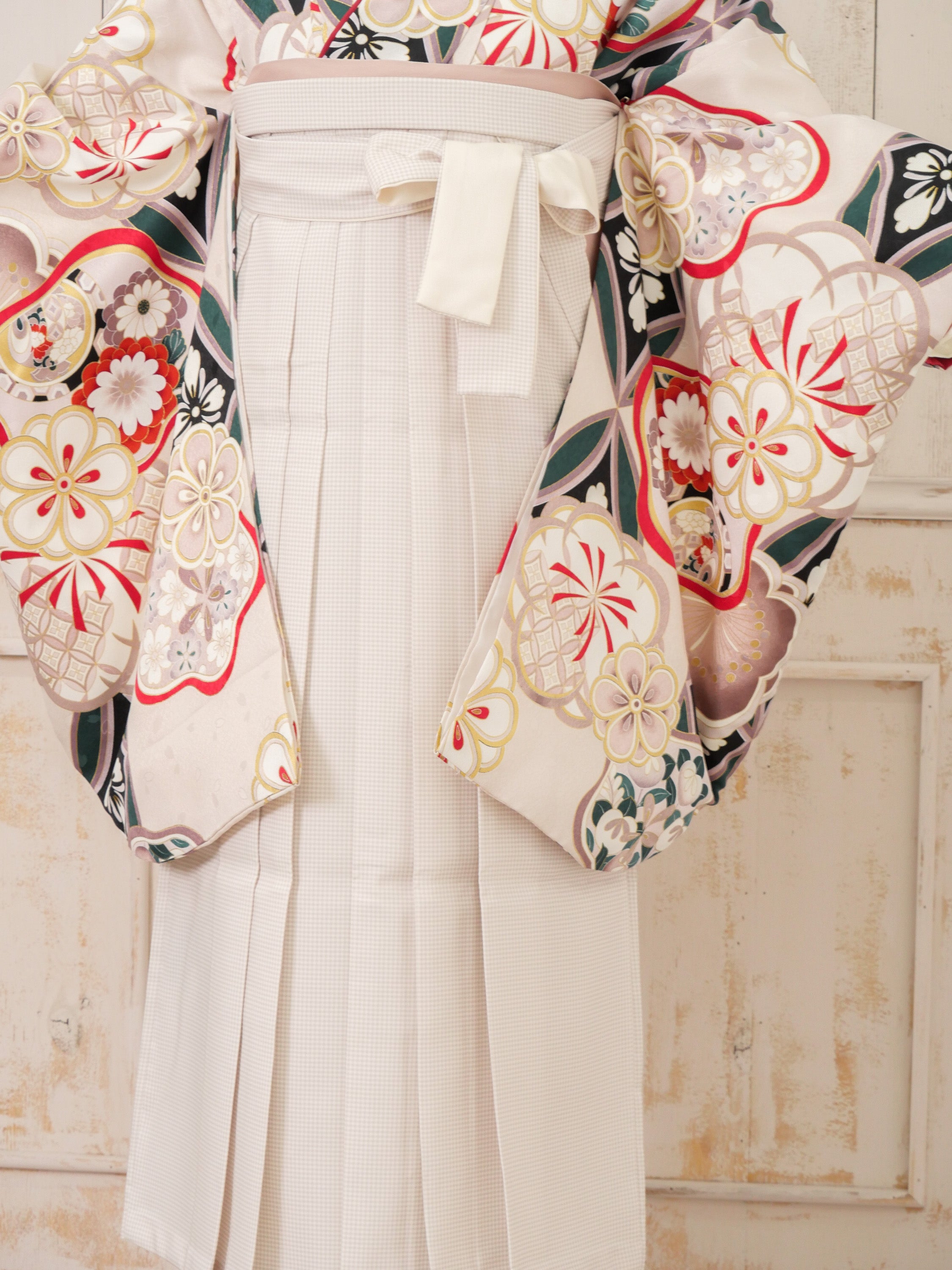 アイボリー地に華やかな古典柄をあしらった振袖が印象的。白系の袴を合わせることで全体に透明感が生まれ、清楚で上品なスタイルが完成します。優雅で女性らしい雰囲気が魅力です。