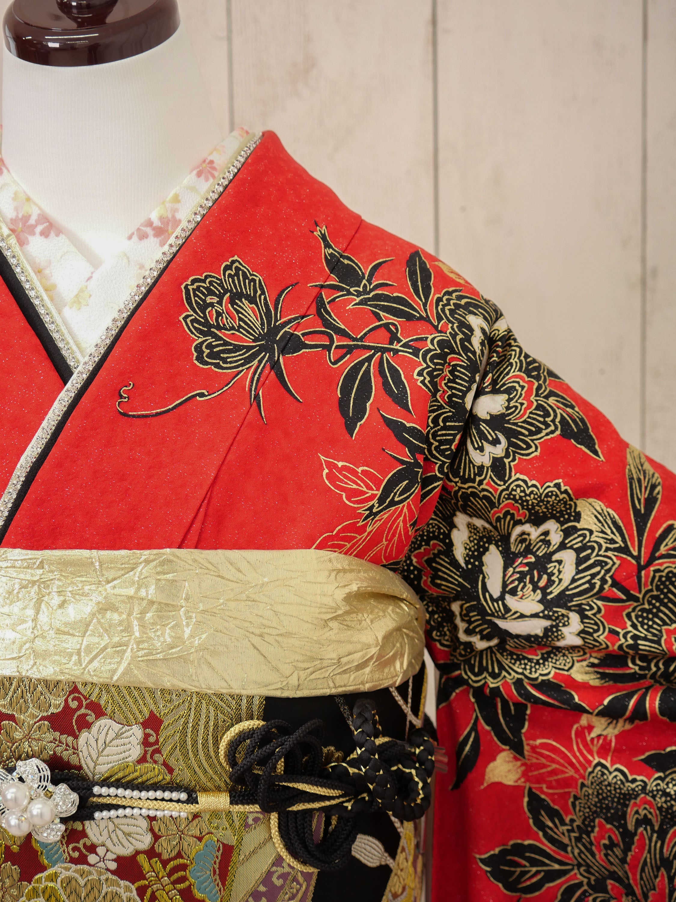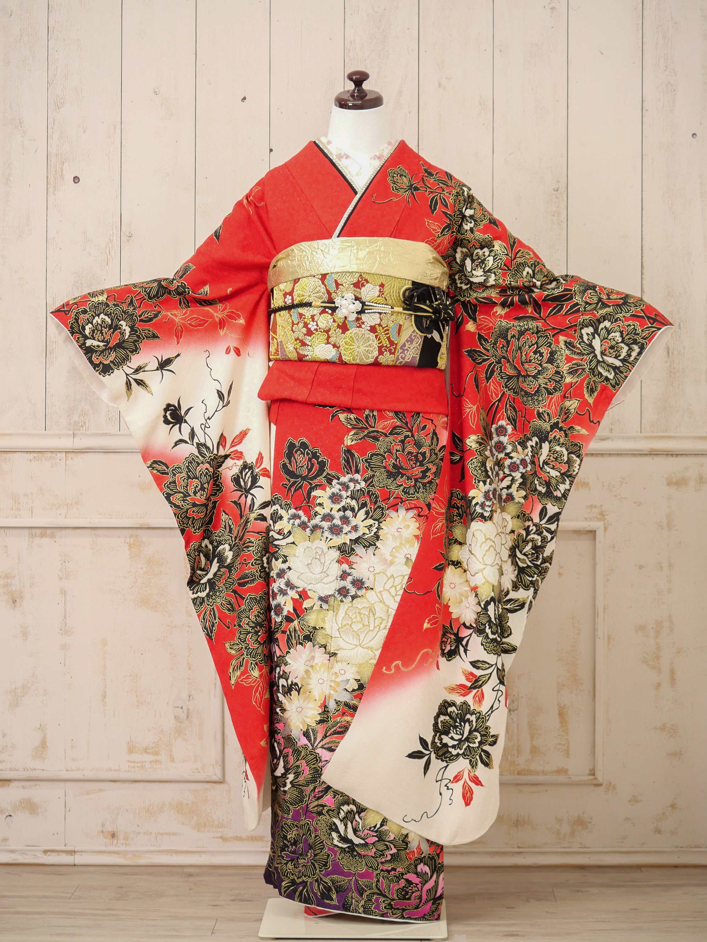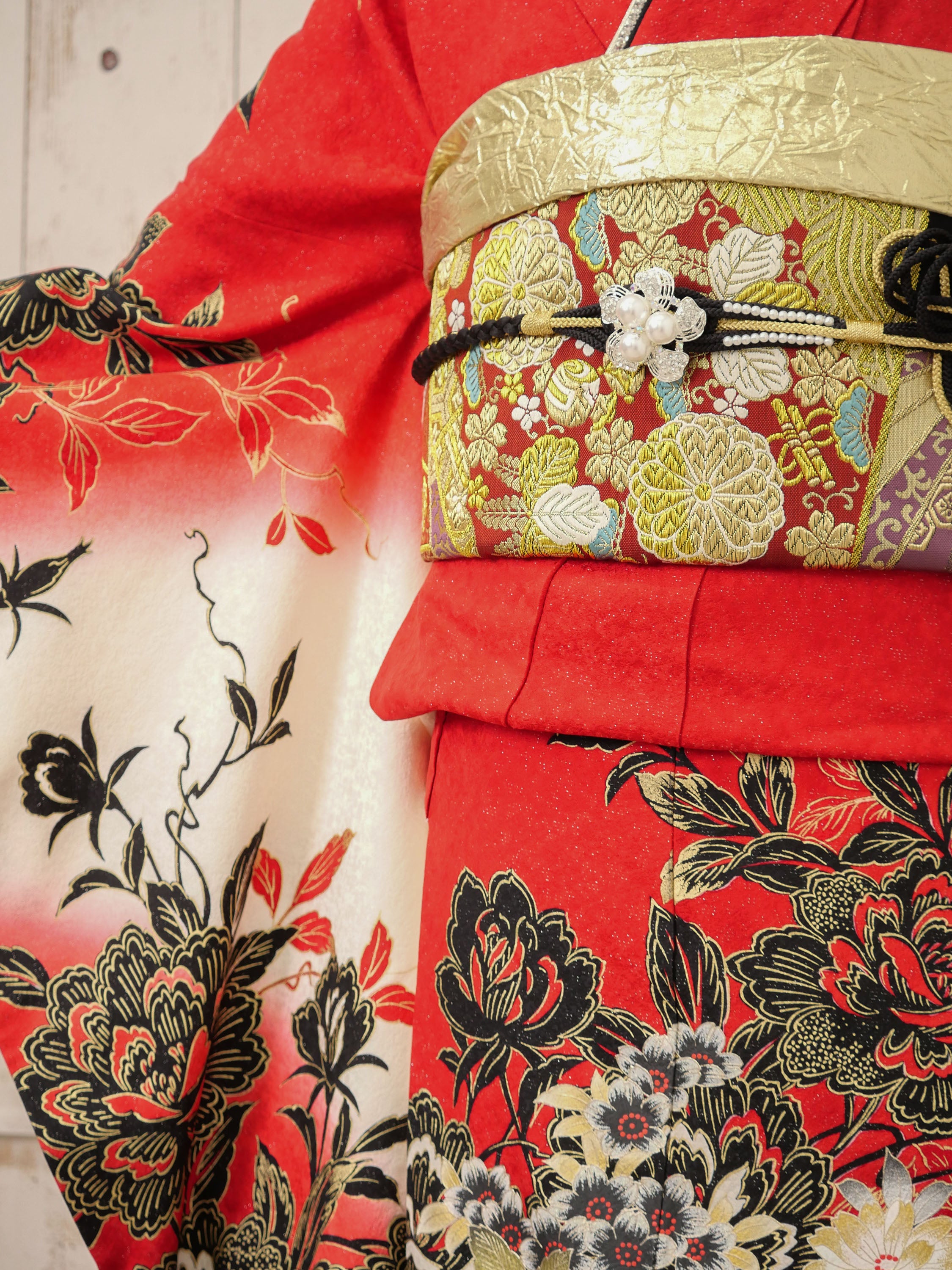 朱赤の地に豪華な牡丹と金箔が施された、華やかさと重厚感が融合した振袖。白と黒のグラデーションが優美なコントラストを生み、主役感あふれる存在に。