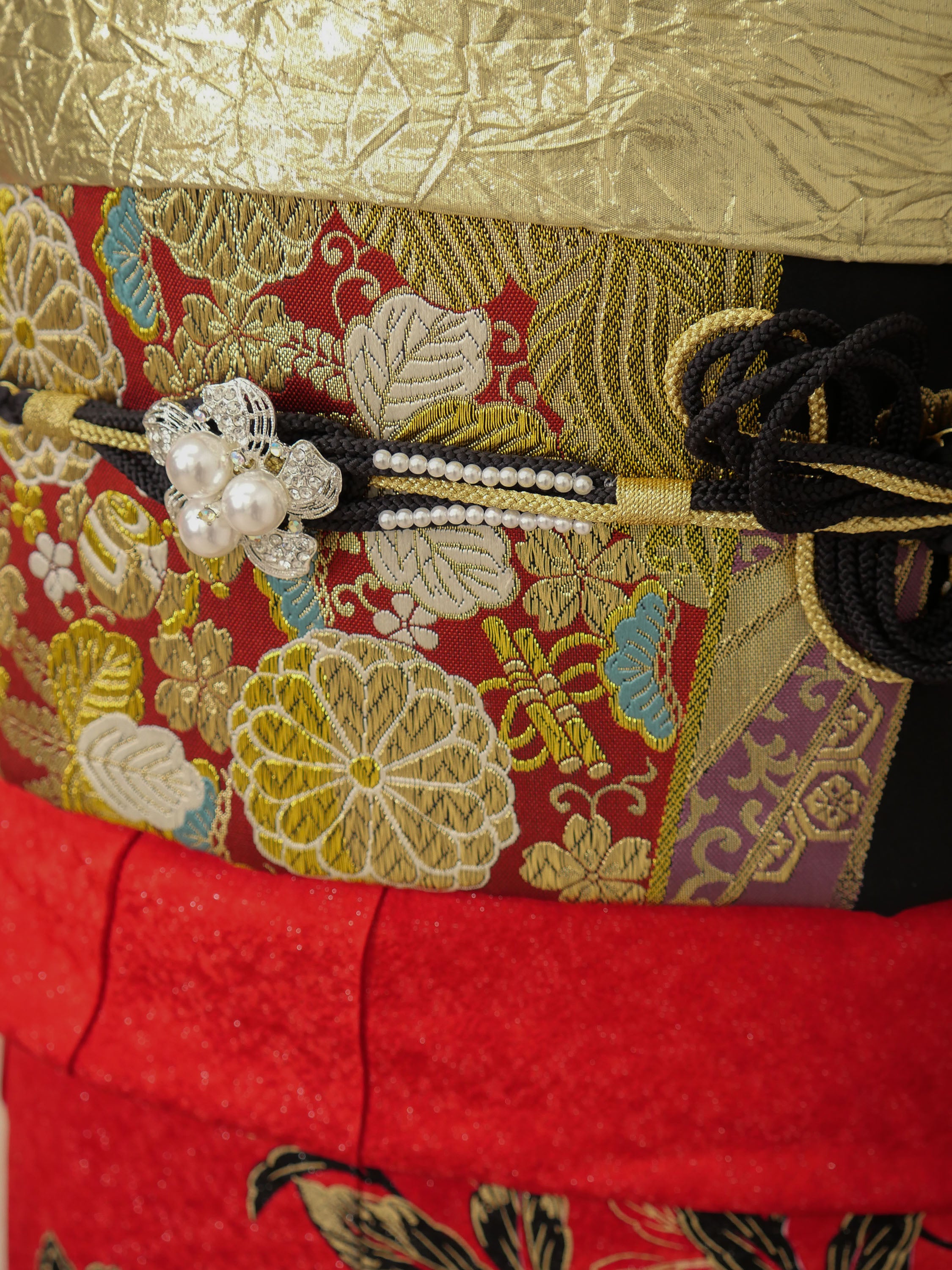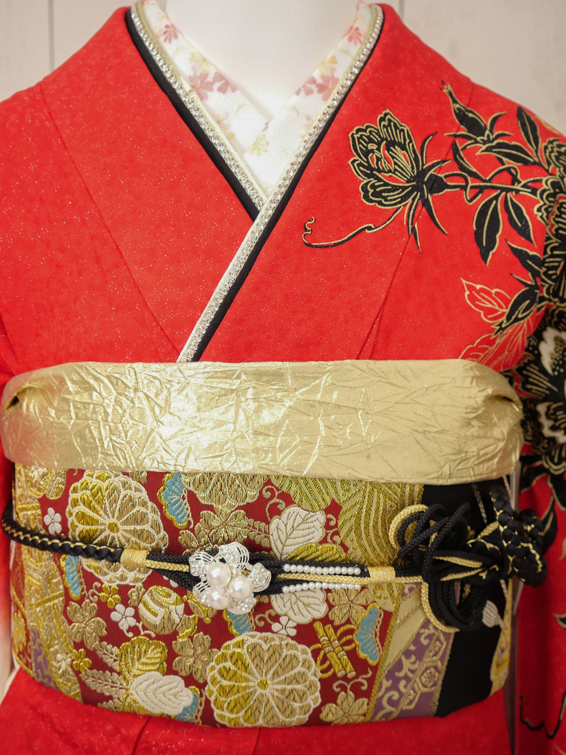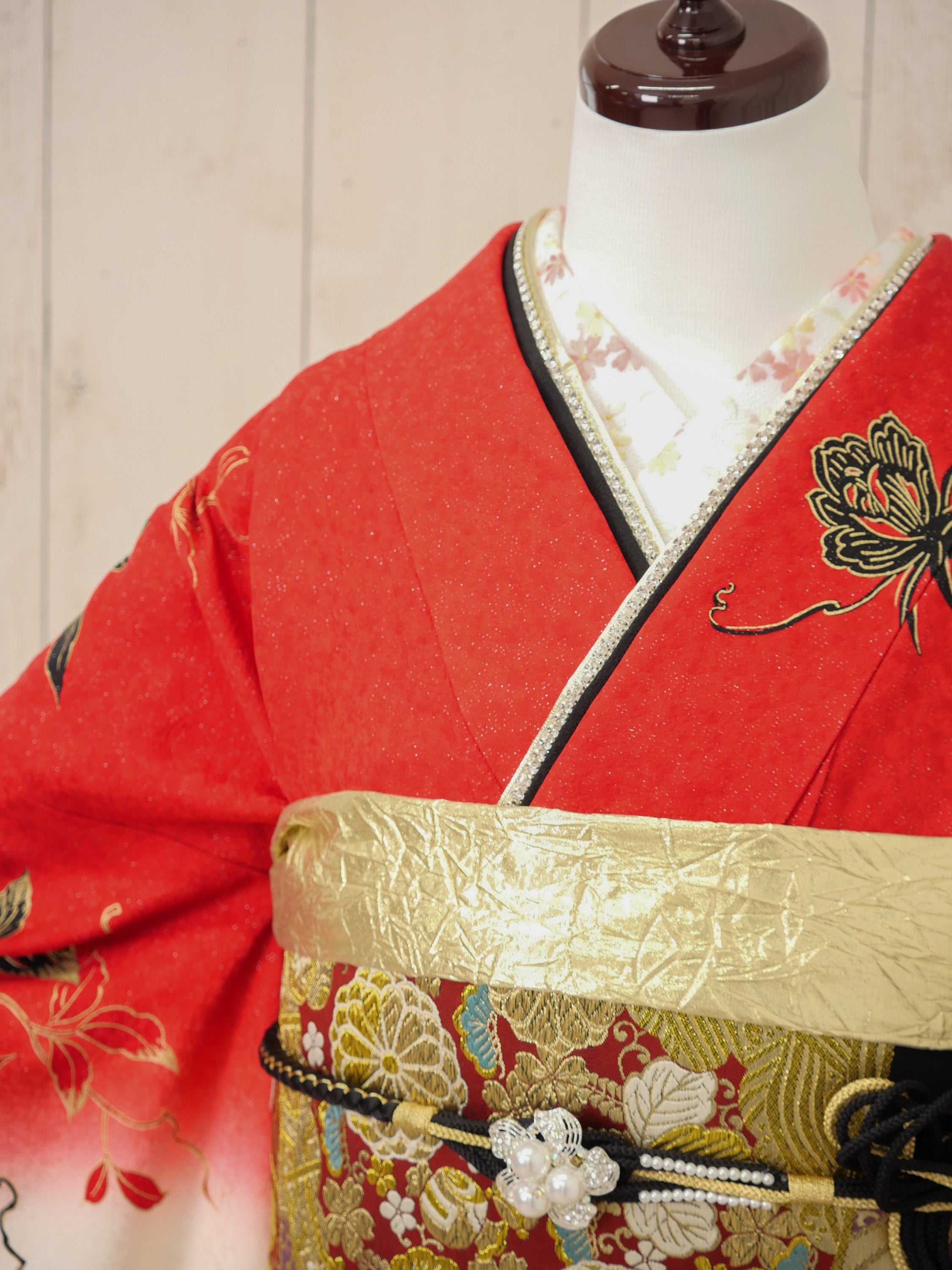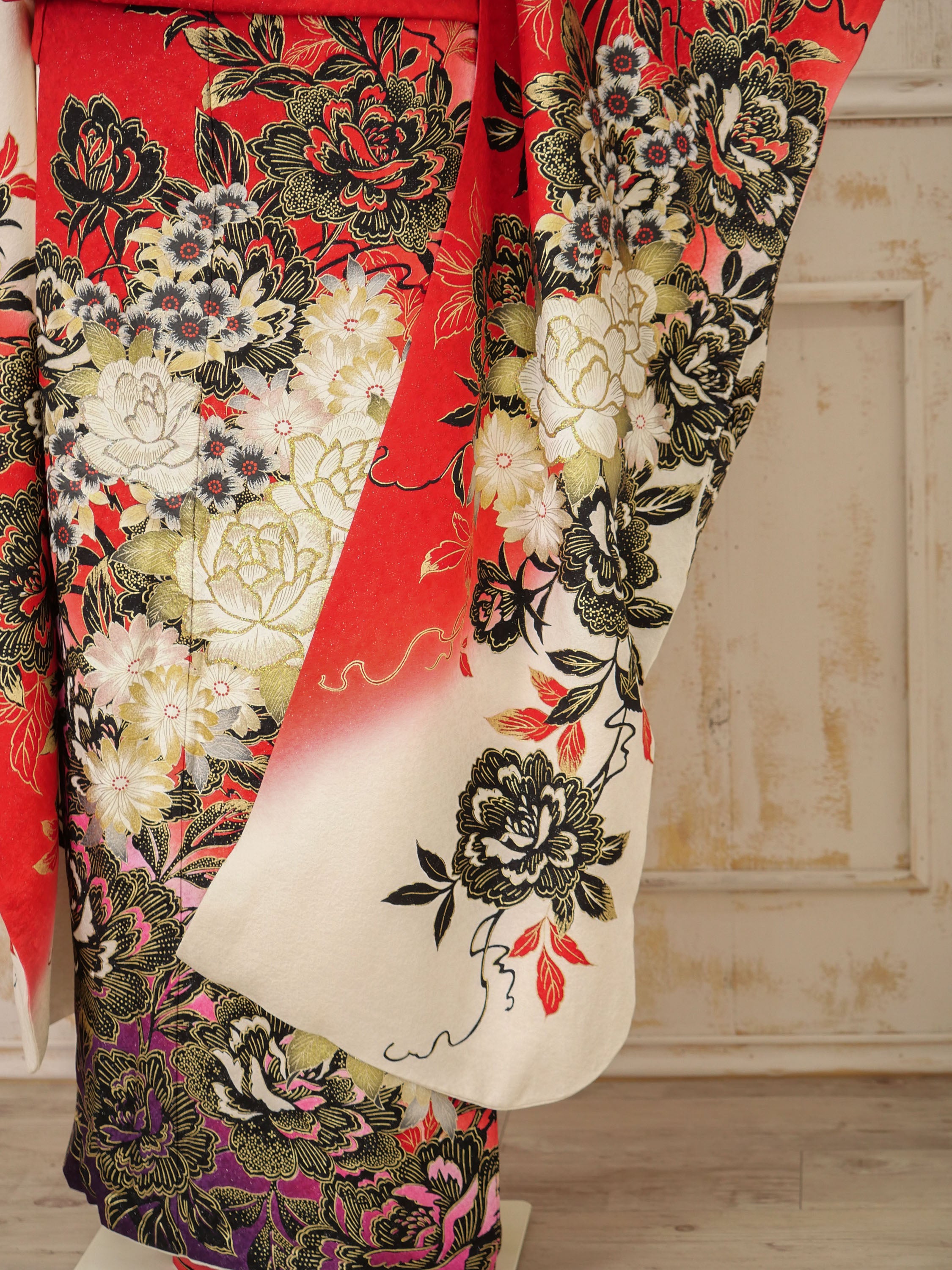 朱赤の地に豪華な牡丹と金箔が施された、華やかさと重厚感が融合した振袖。白と黒のグラデーションが優美なコントラストを生み、主役感あふれる存在に。