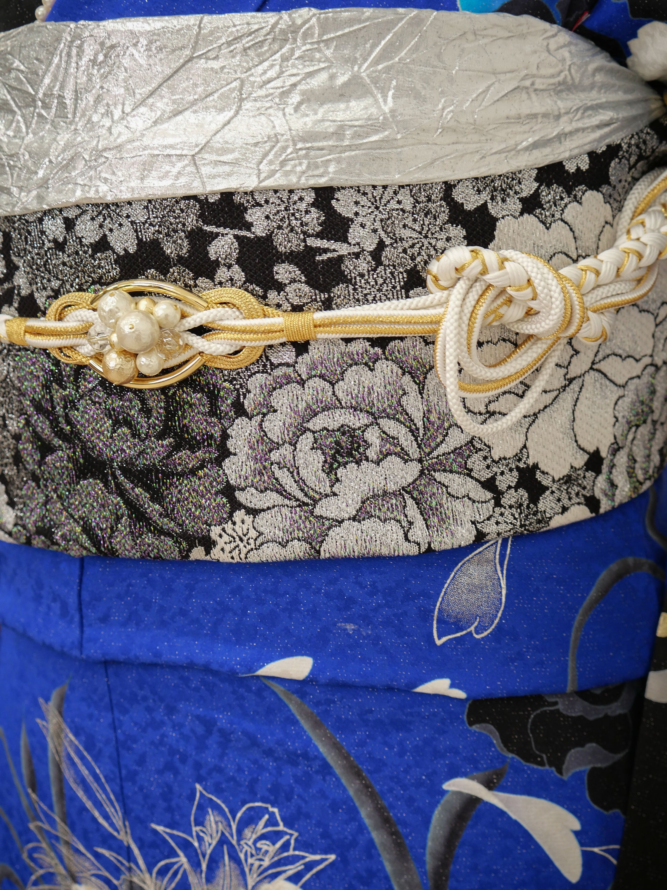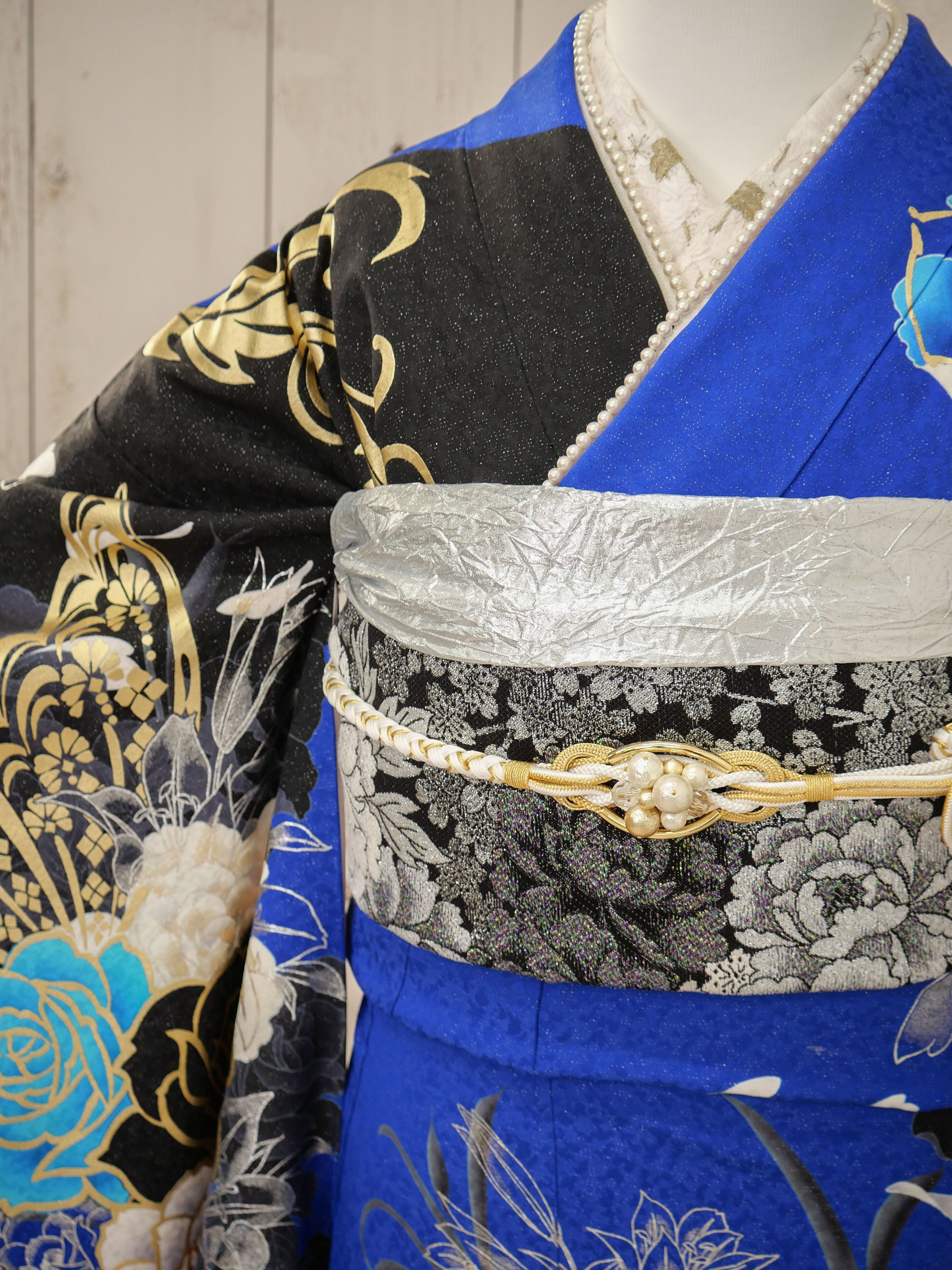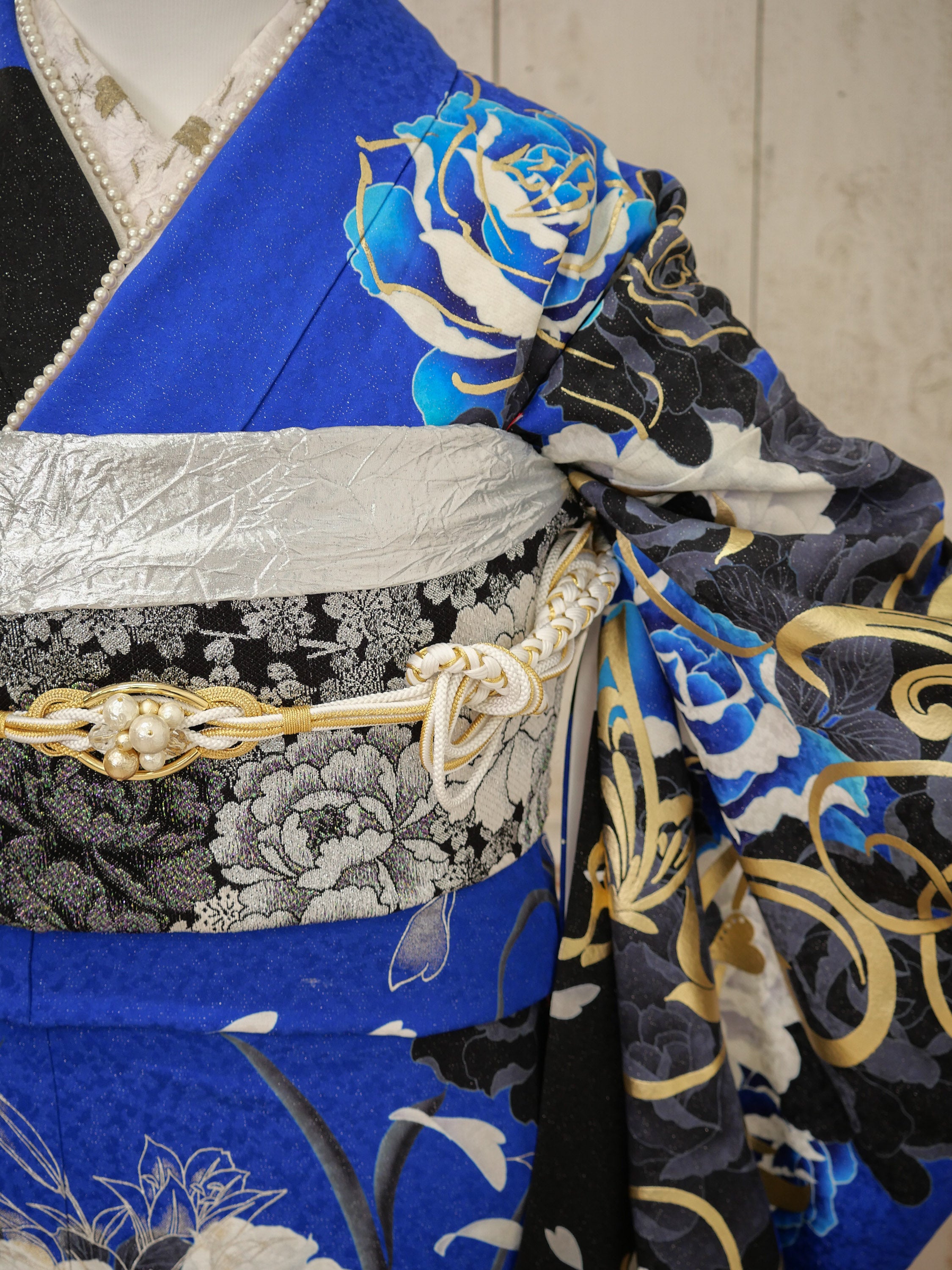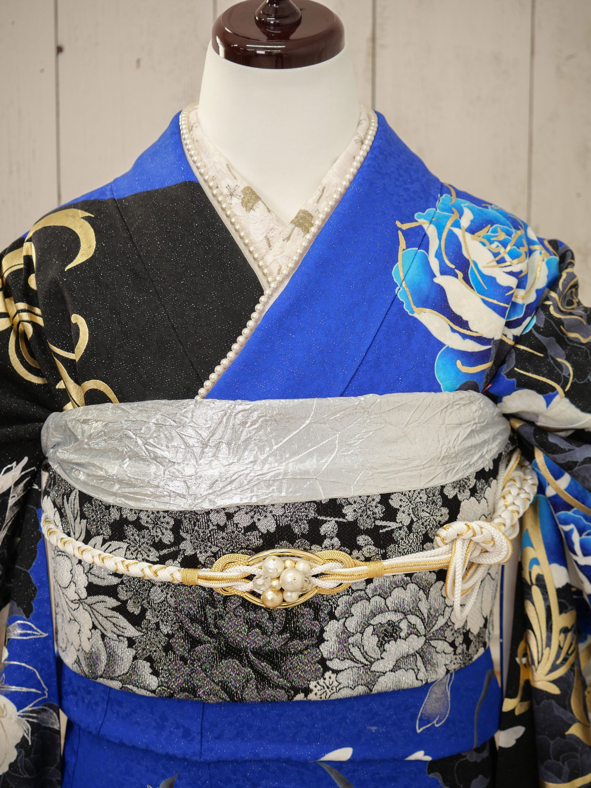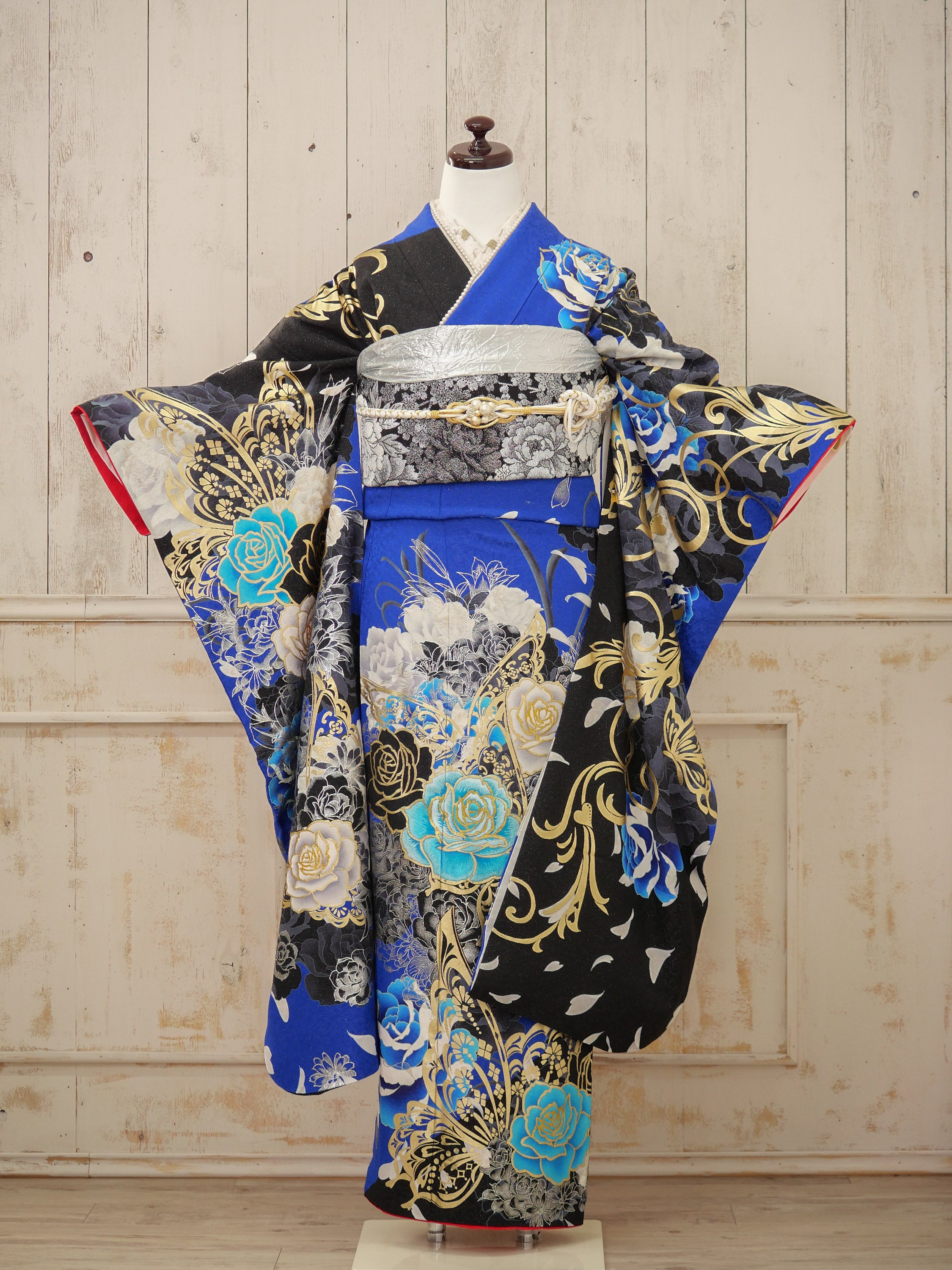 鮮やかなロイヤルブルーとブラックが織りなす、ゴージャスでドラマティックなデザイン。バラと蝶の繊細な柄が舞い、まるで物語のヒロインのような気品に満ちた一枚。目を惹く存在感で主役級の装いに