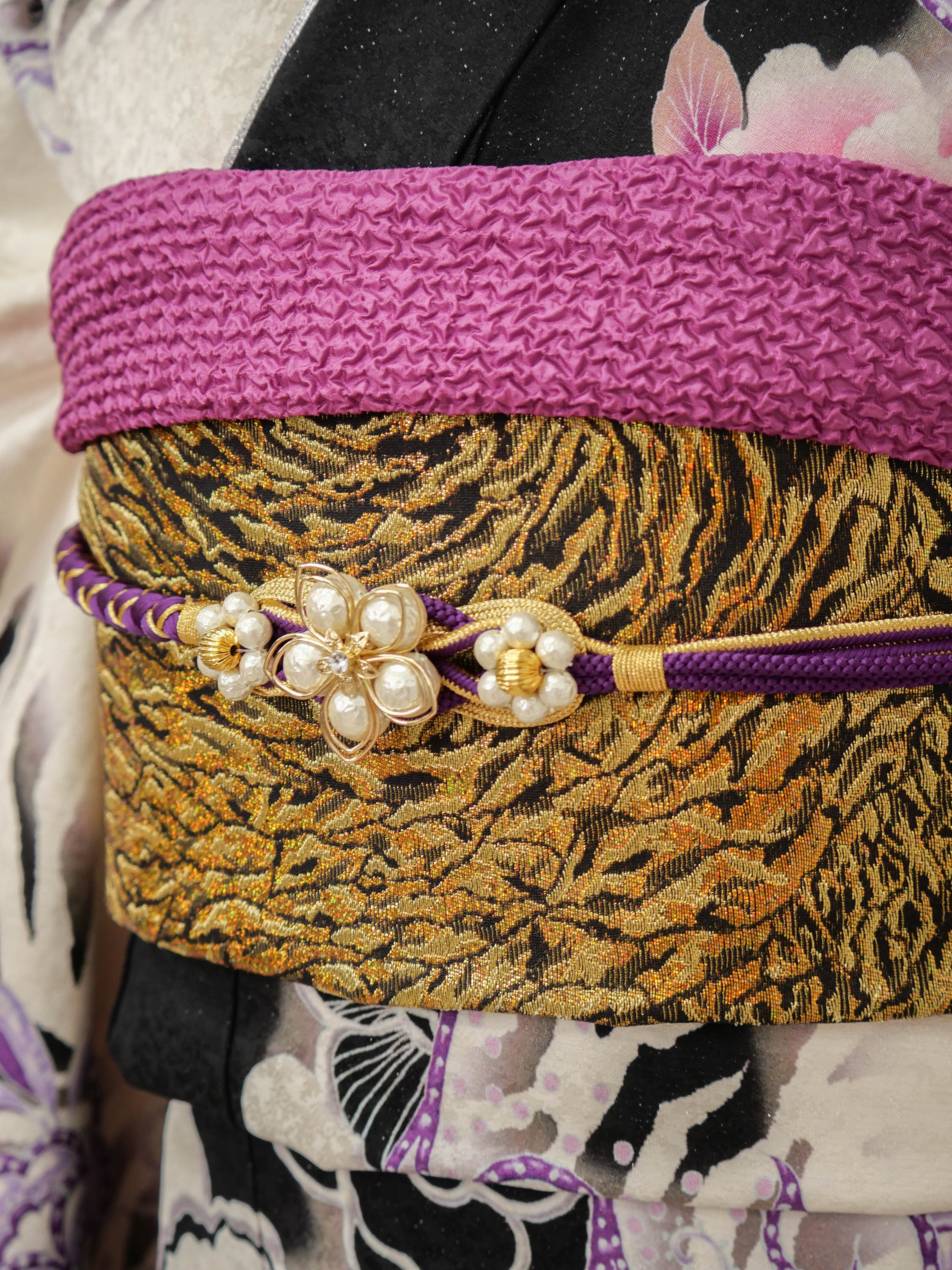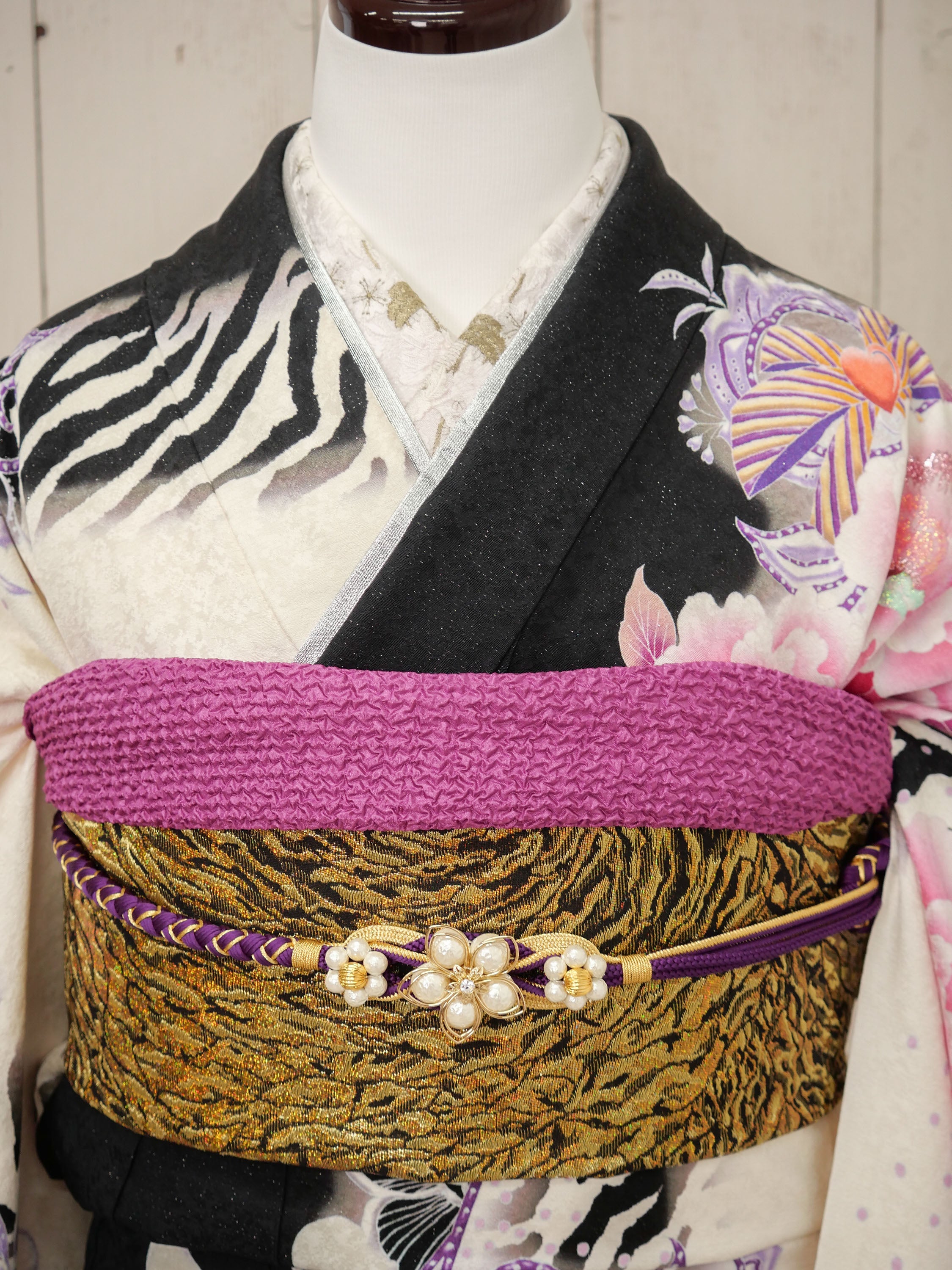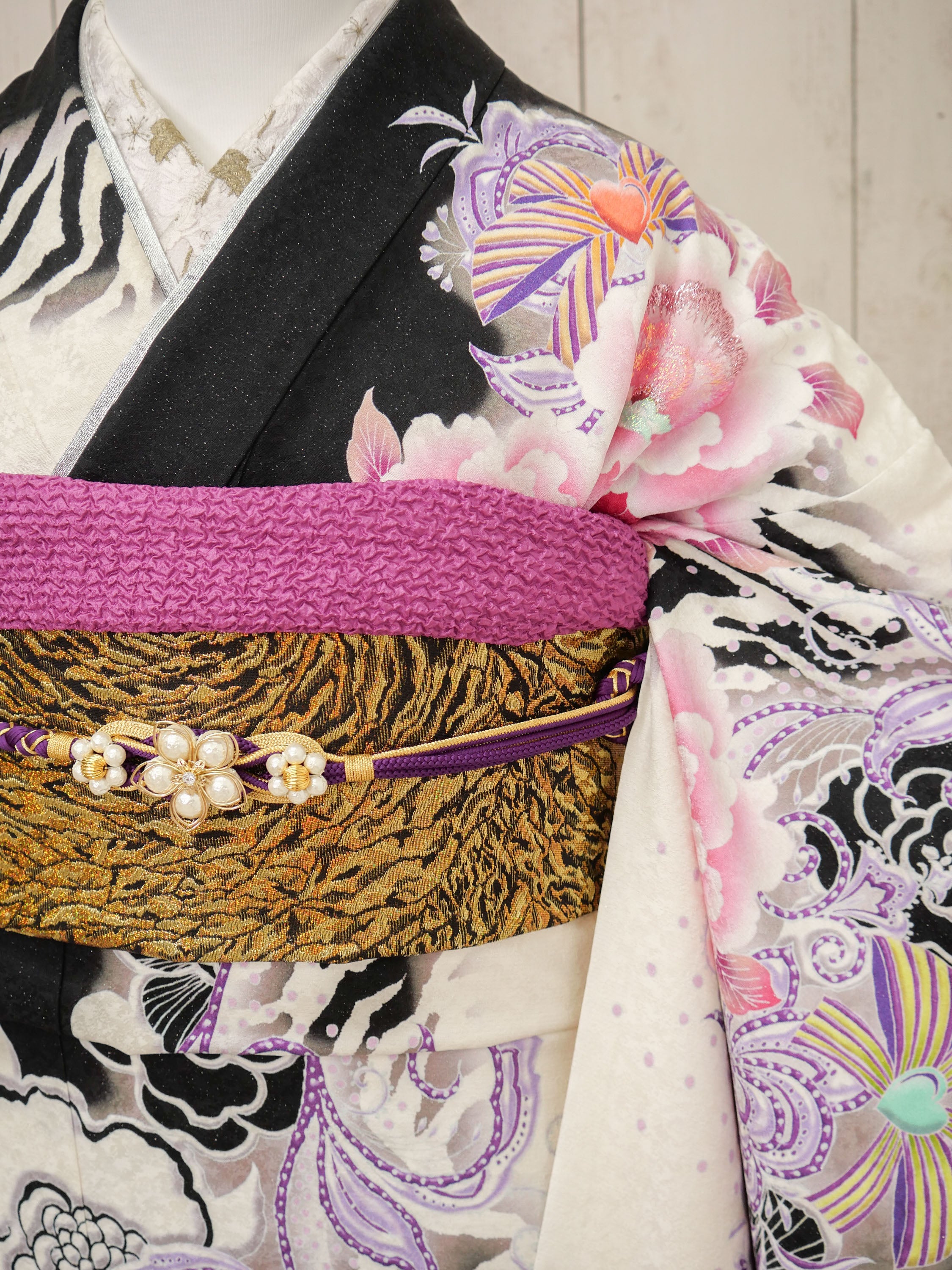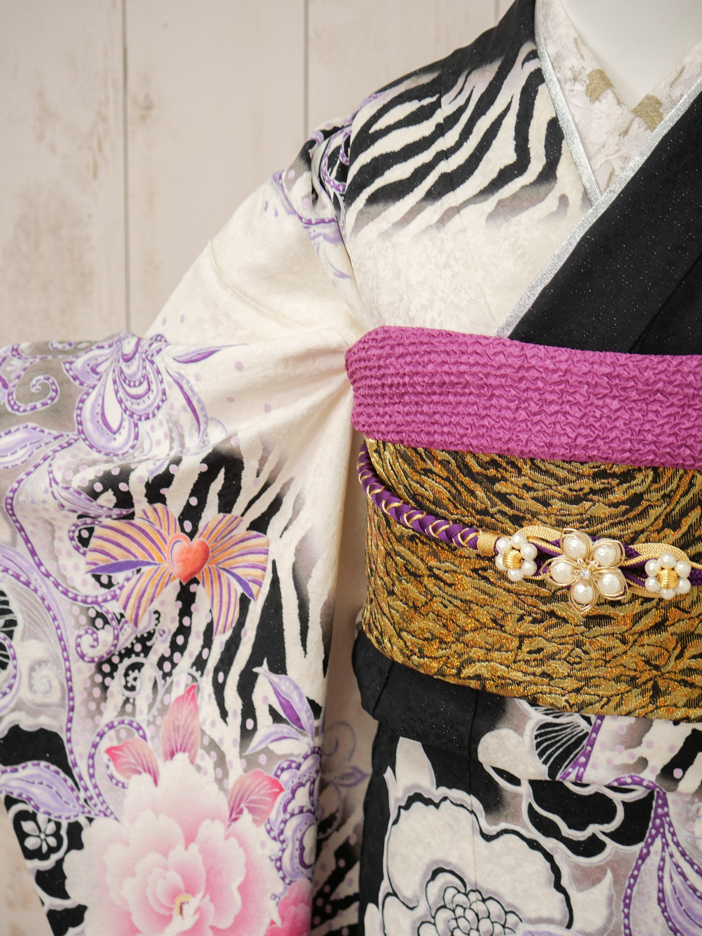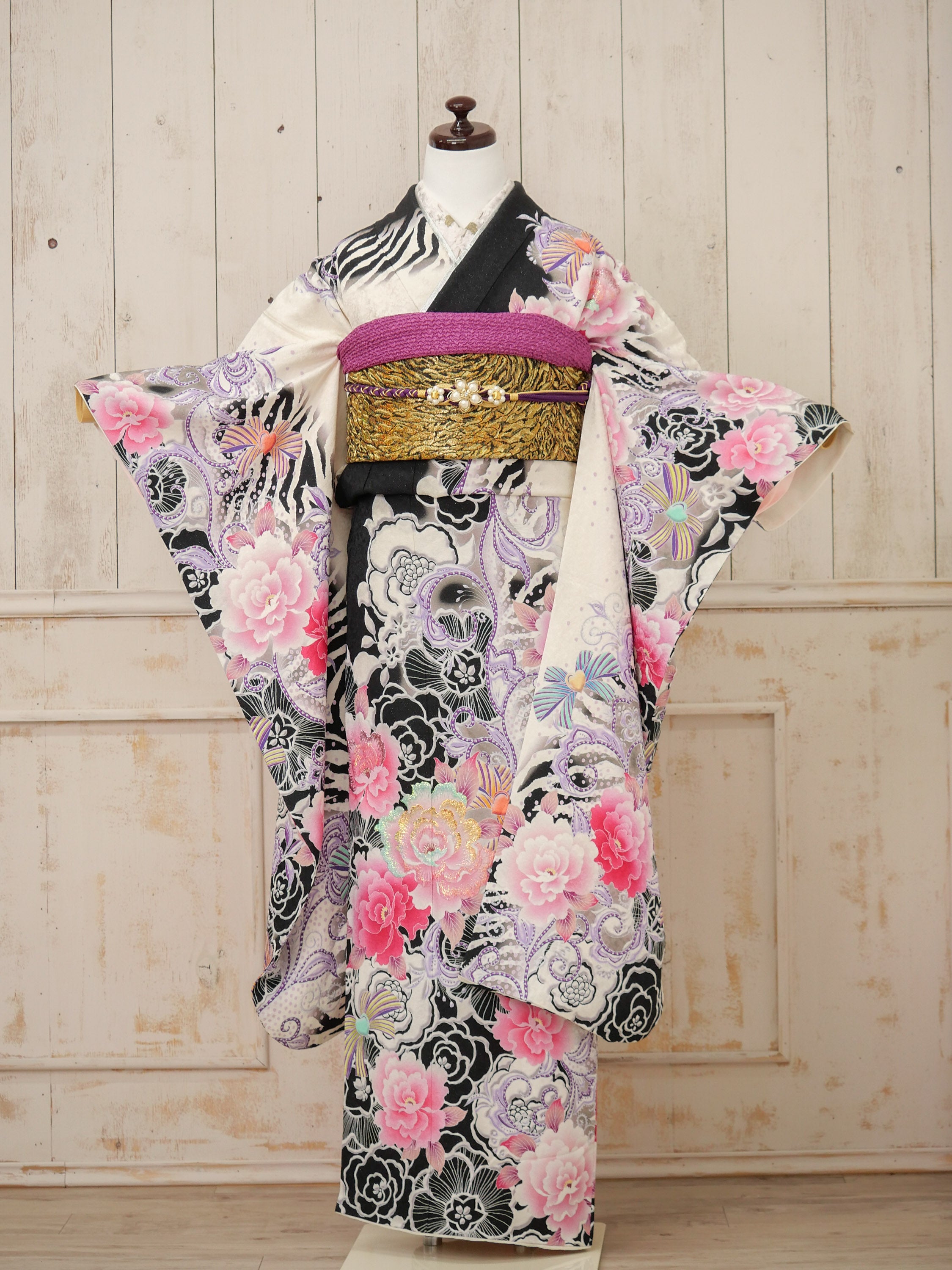 黒×白のコントラストに、ピンクの牡丹とラベンダー色の蝶が舞い踊る華麗なデザイン。ゴールドの帯で一層引き締まり、華やかさとクールさを両立した印象的な一着。