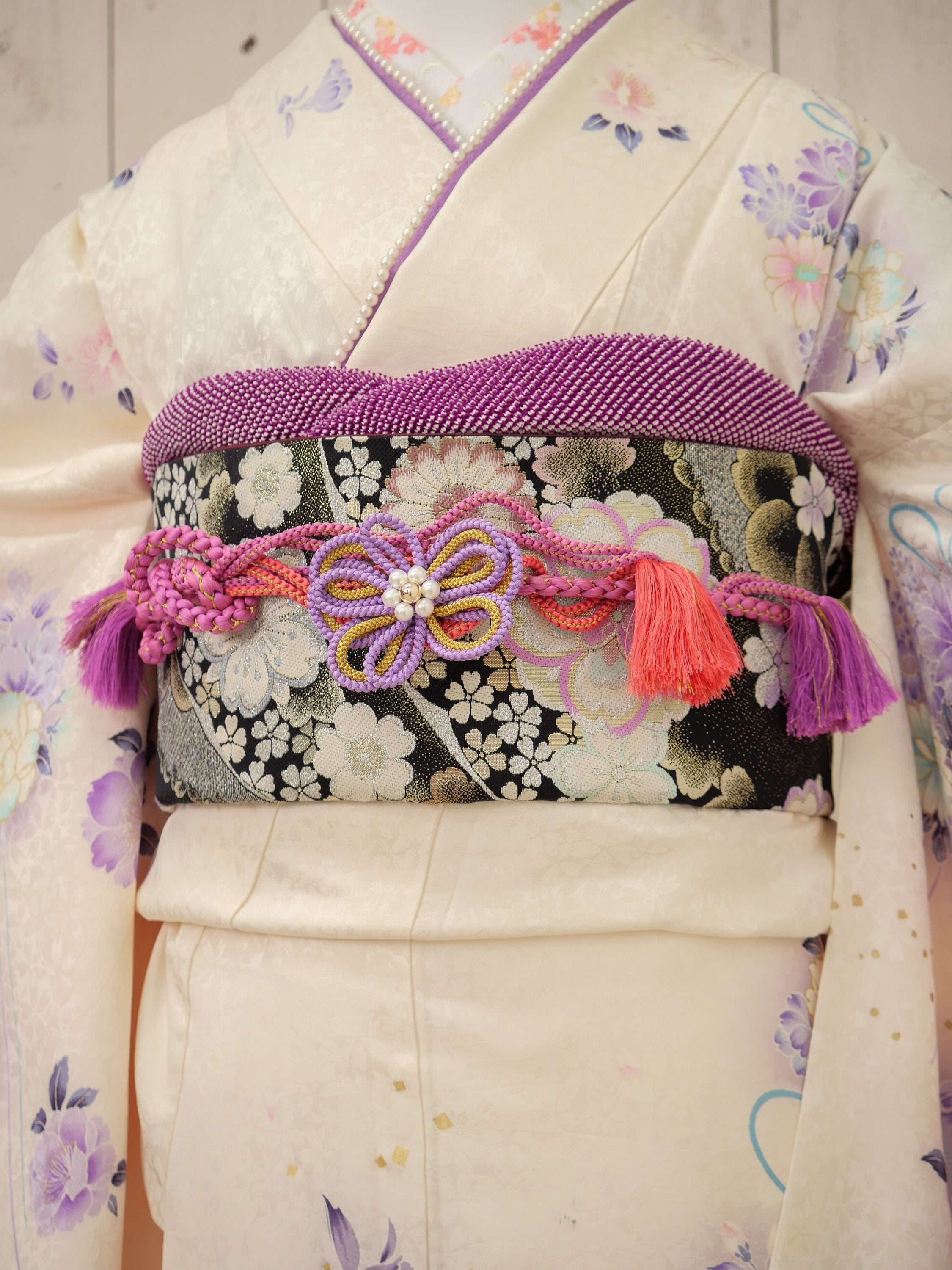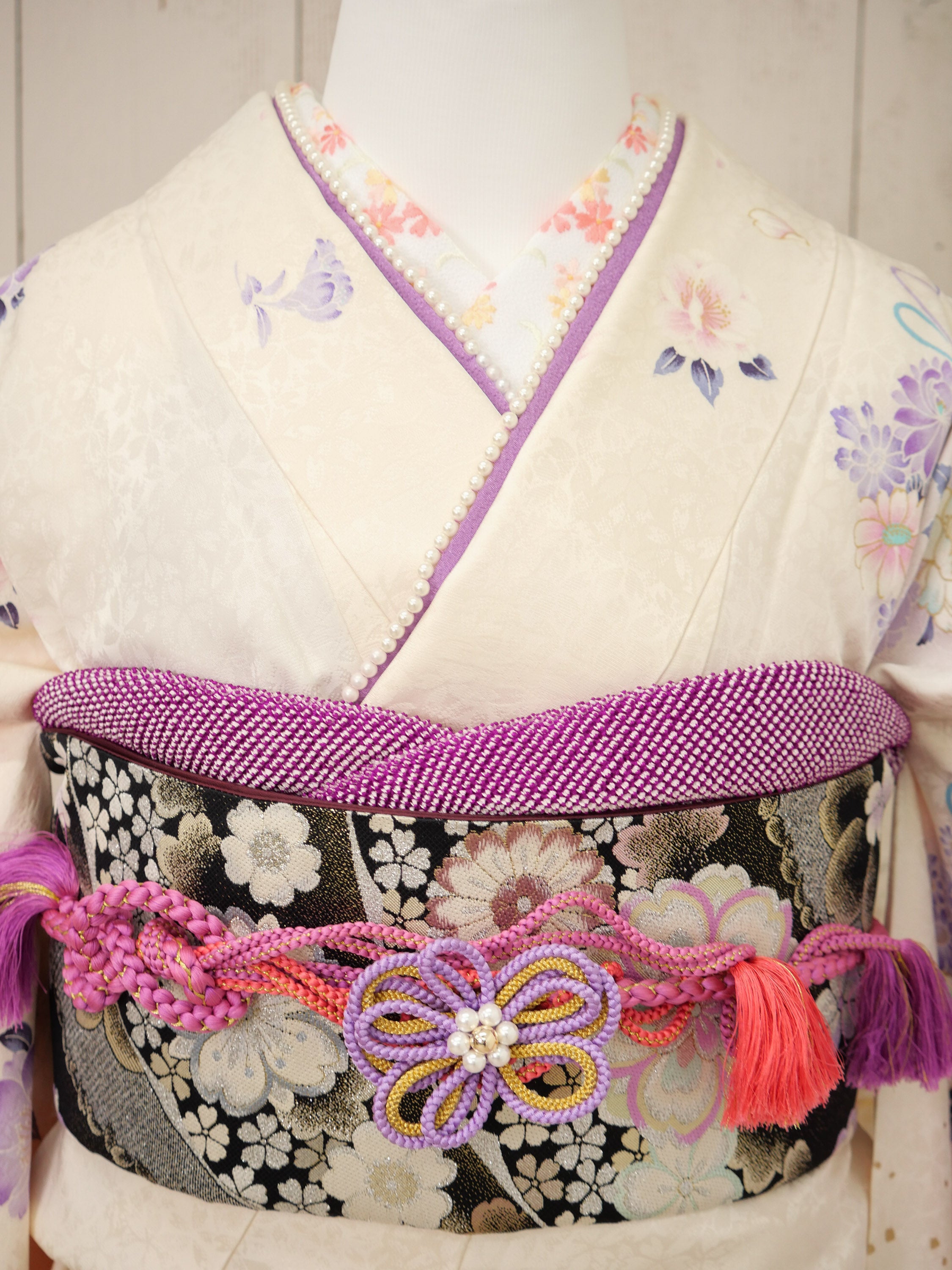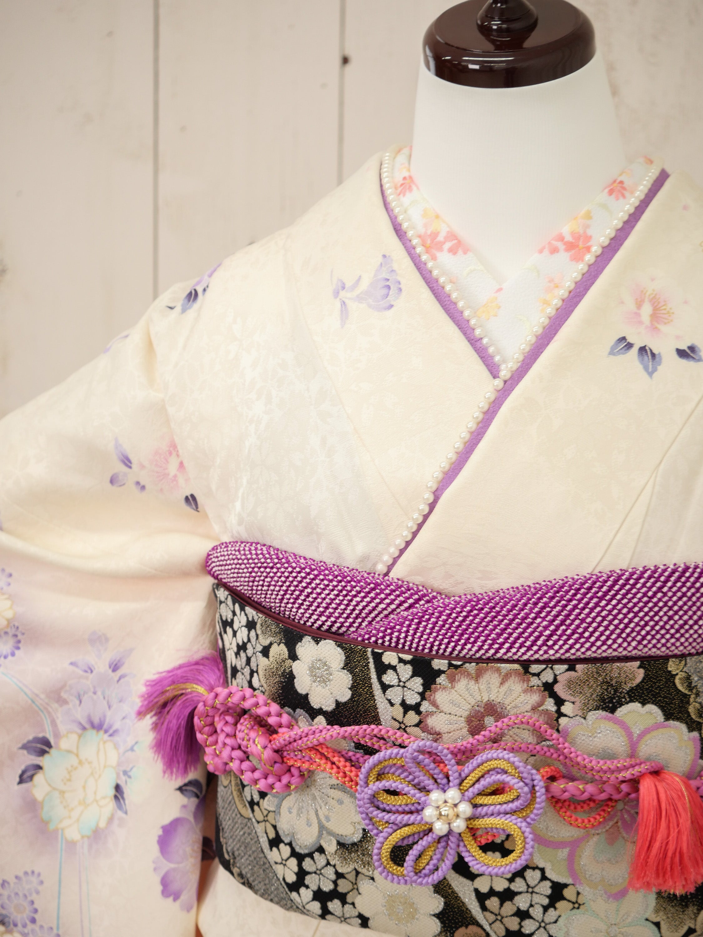 中振袖、袋帯、長襦袢(半襟付き、ポリエステル)、重ね衿(着物に縫い付けの商品あり)、帯揚げ、帯締め、ショール、腰紐5本、伊達締め2本、衿芯、前板、後板、帯枕(ガーゼ付き)、コーリンベルト1本、三重紐、草履、バッグ