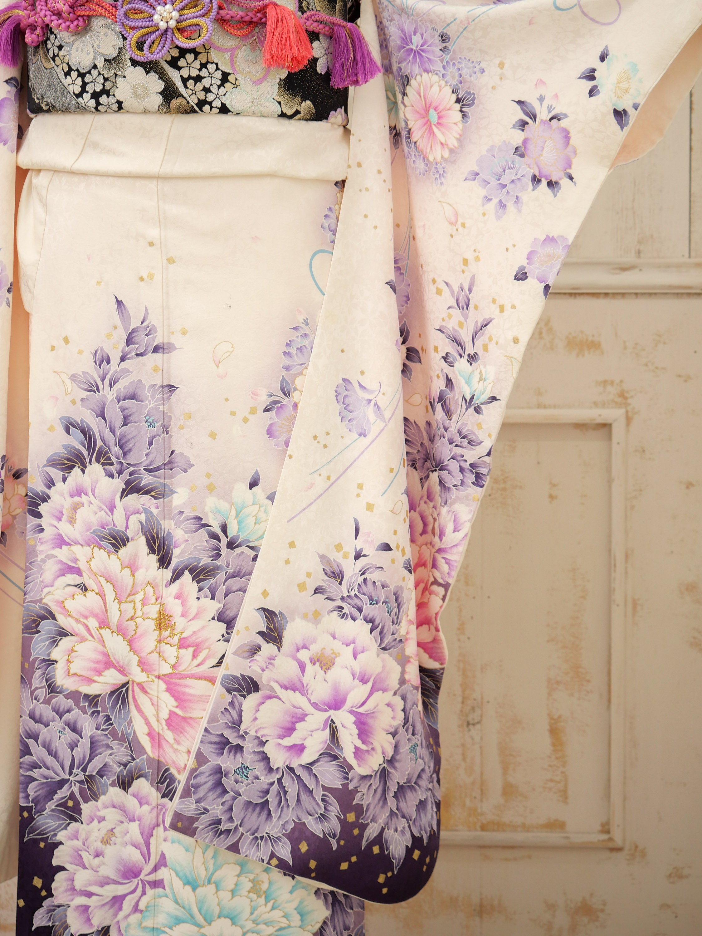 アイボリーから濃紺への美しいぼかしに、大輪の芍薬が幻想的に描かれた上品な振袖。黒地の帯とピンクの差し色が大人の甘さをプラスし、静かな華やぎを放ちます。