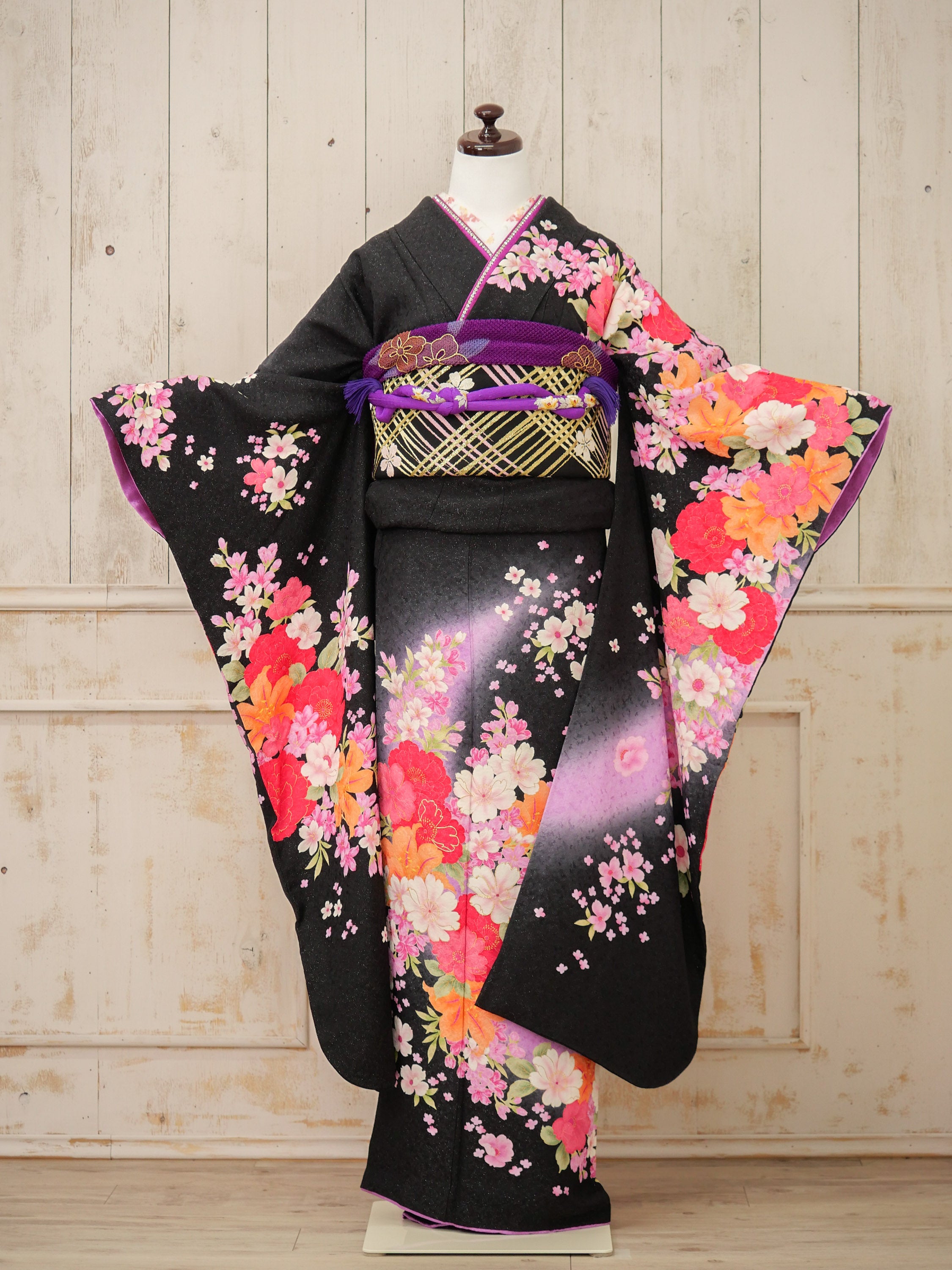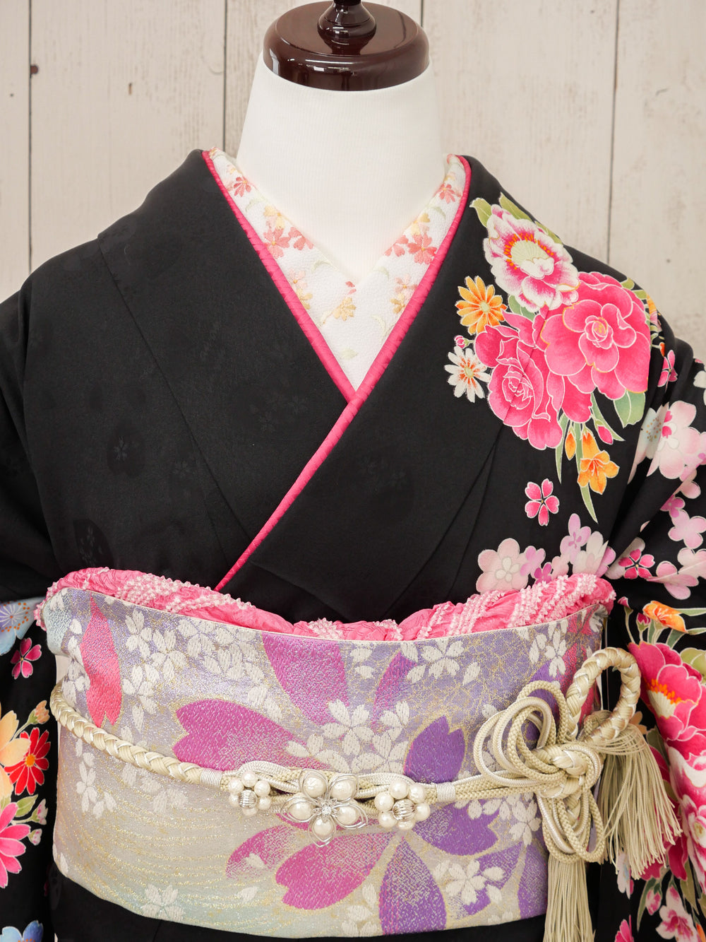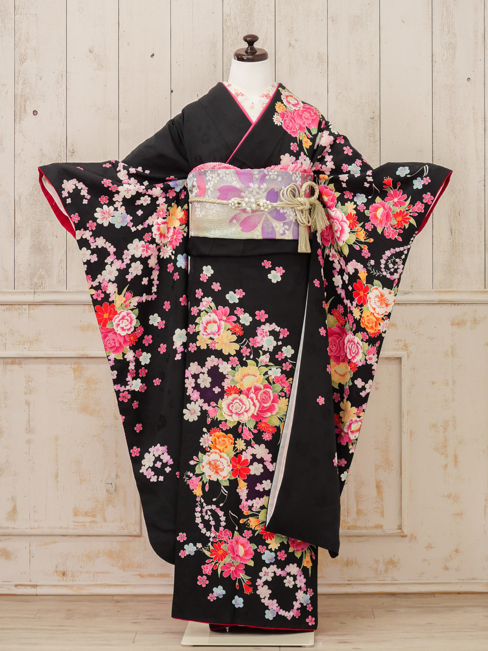 中振袖、袋帯、長襦袢(半襟付き、ポリエステル)、重ね衿(着物に縫い付けの商品あり)、帯揚げ、帯締め、ショール、腰紐5本、伊達締め2本、衿芯、前板、後板、帯枕(ガーゼ付き)、コーリンベルト1本、三重紐、草履、バッグ