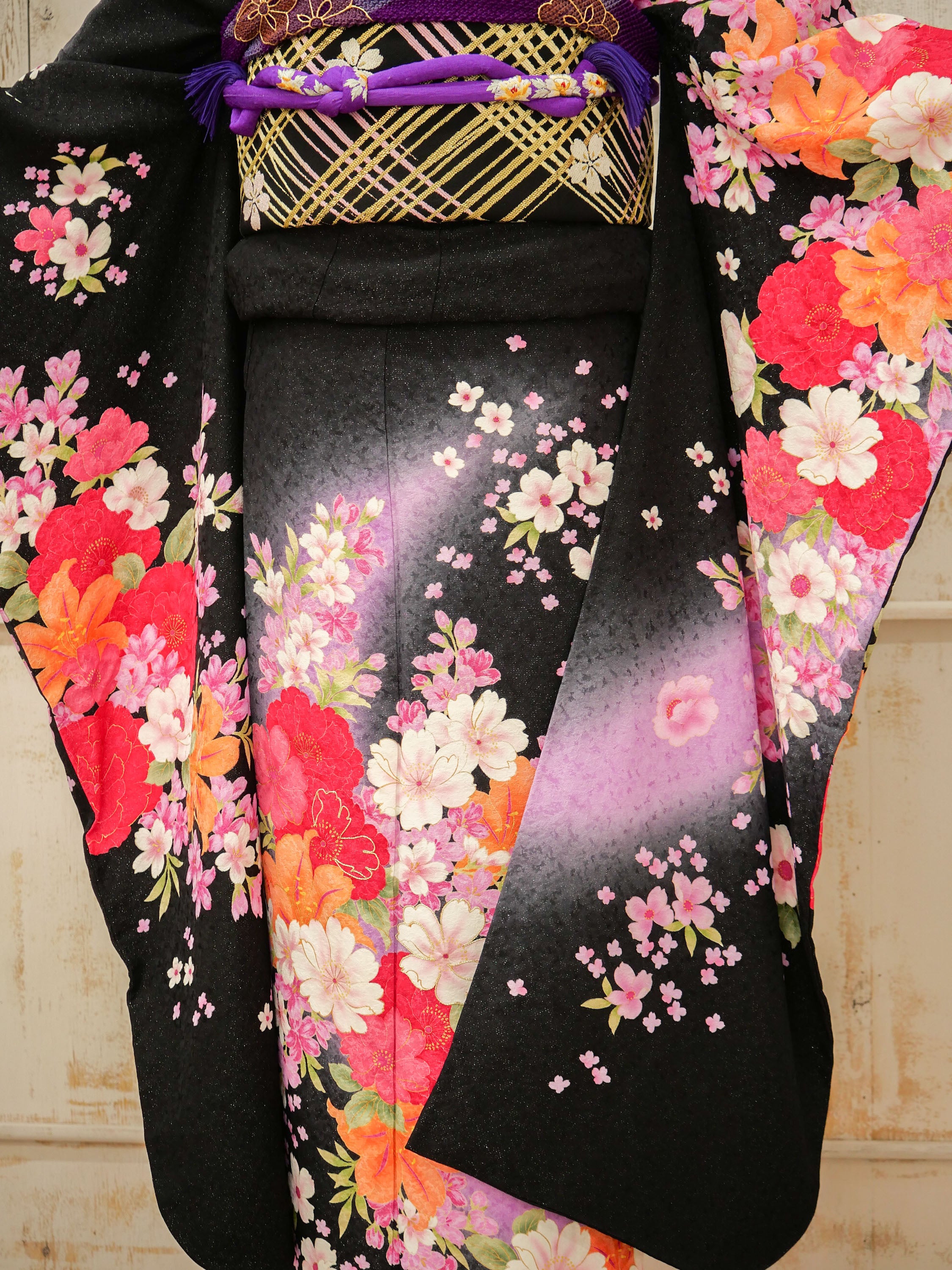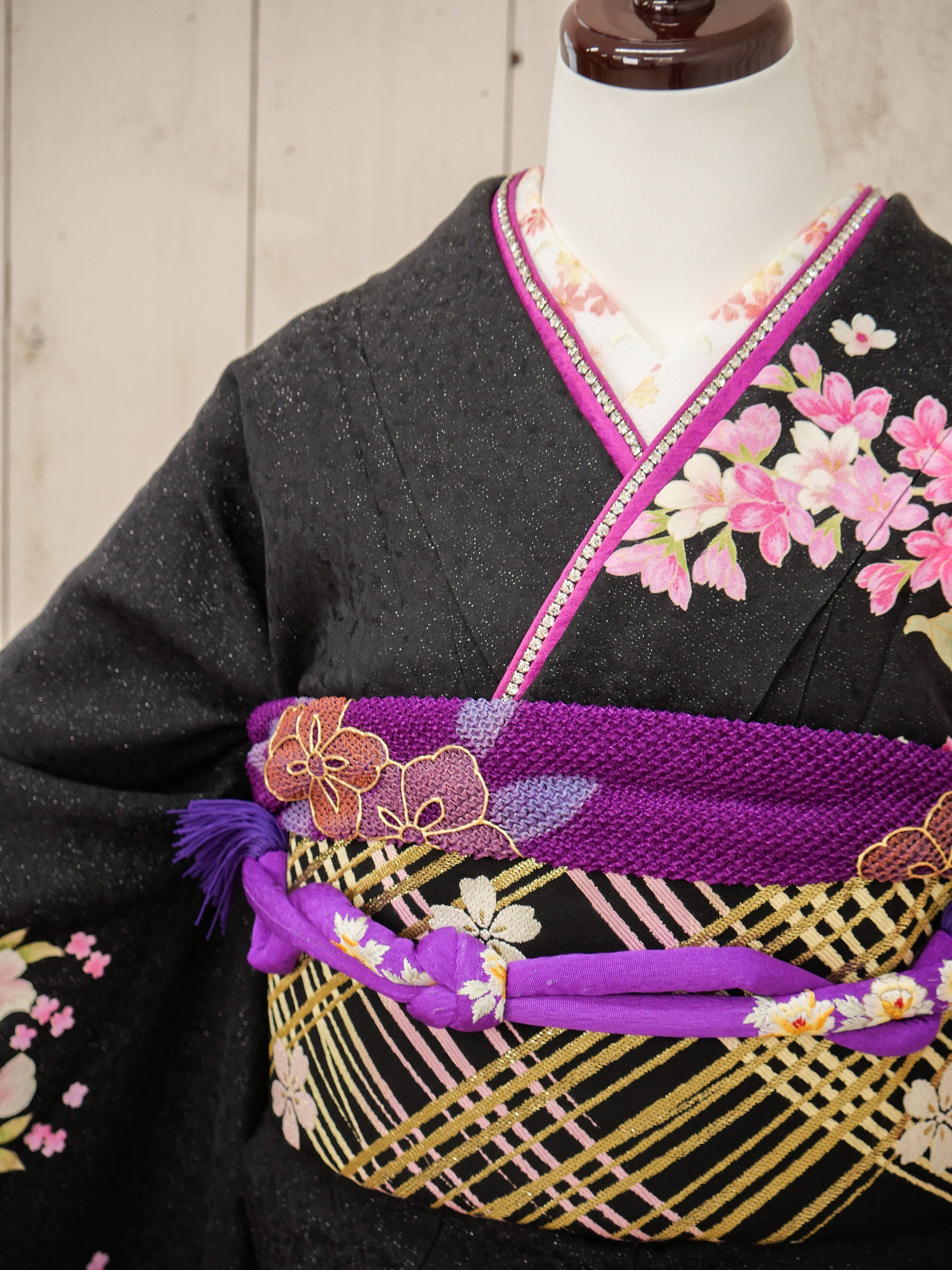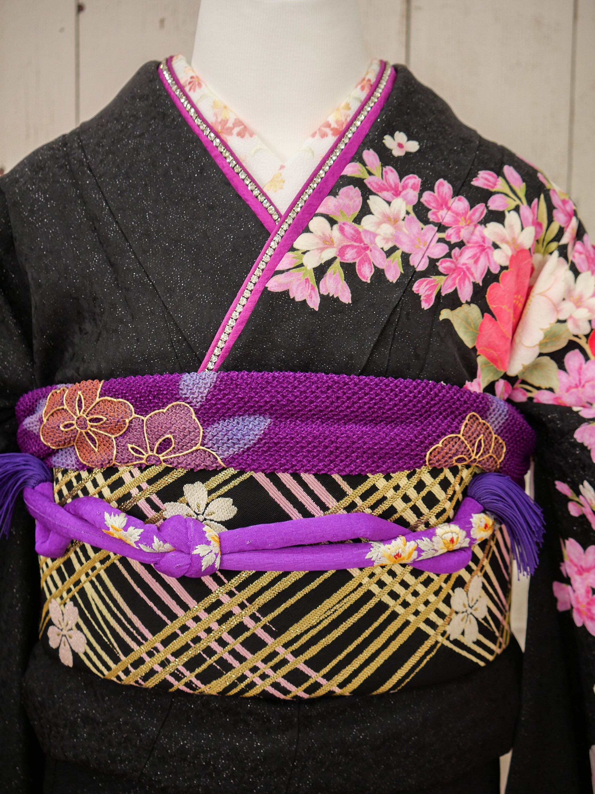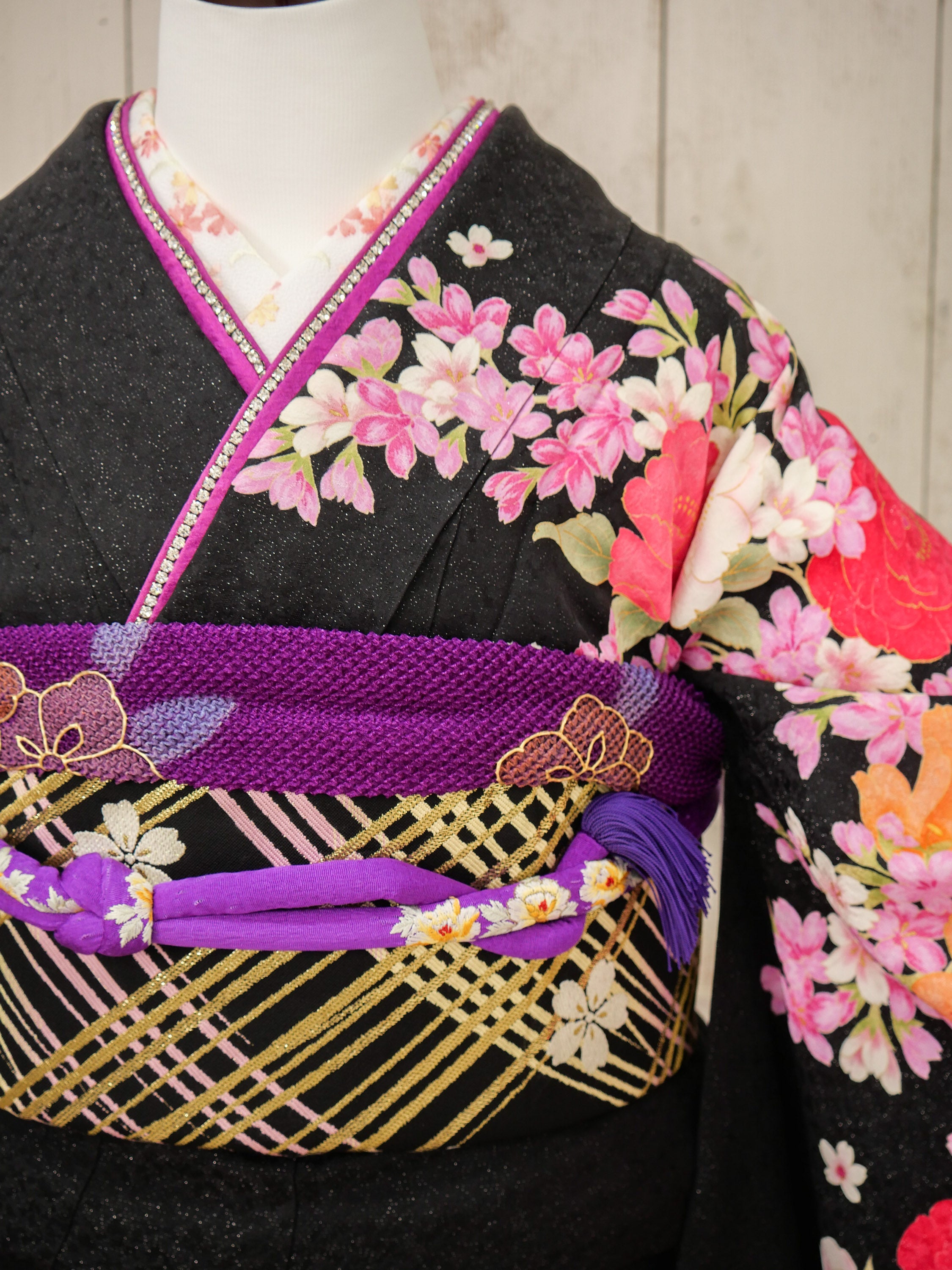 中振袖、袋帯、長襦袢(半襟付き、ポリエステル)、重ね衿(着物に縫い付けの商品あり)、帯揚げ、帯締め、ショール、腰紐5本、伊達締め2本、衿芯、前板、後板、帯枕(ガーゼ付き)、コーリンベルト1本、三重紐、草履、バッグ
