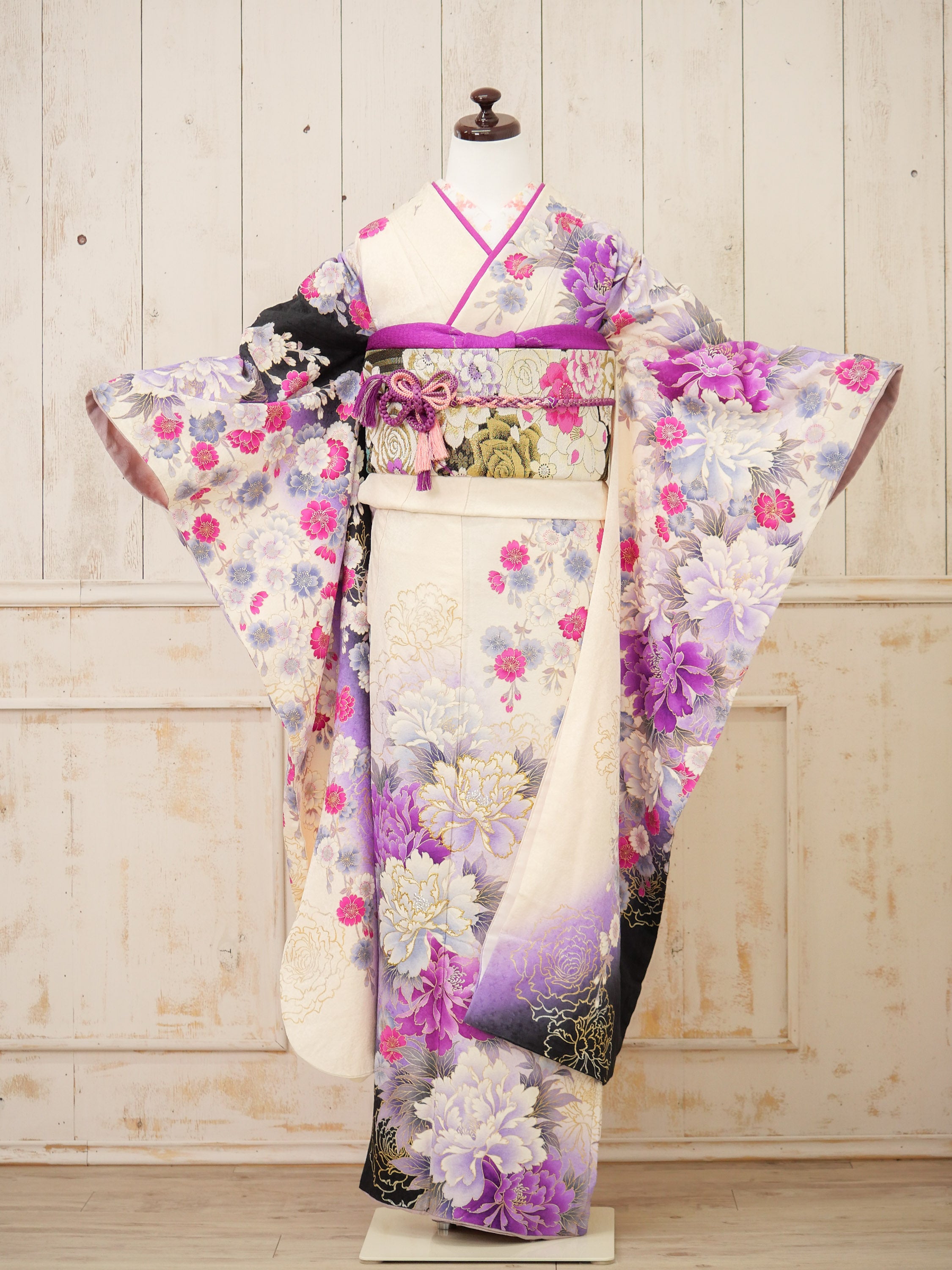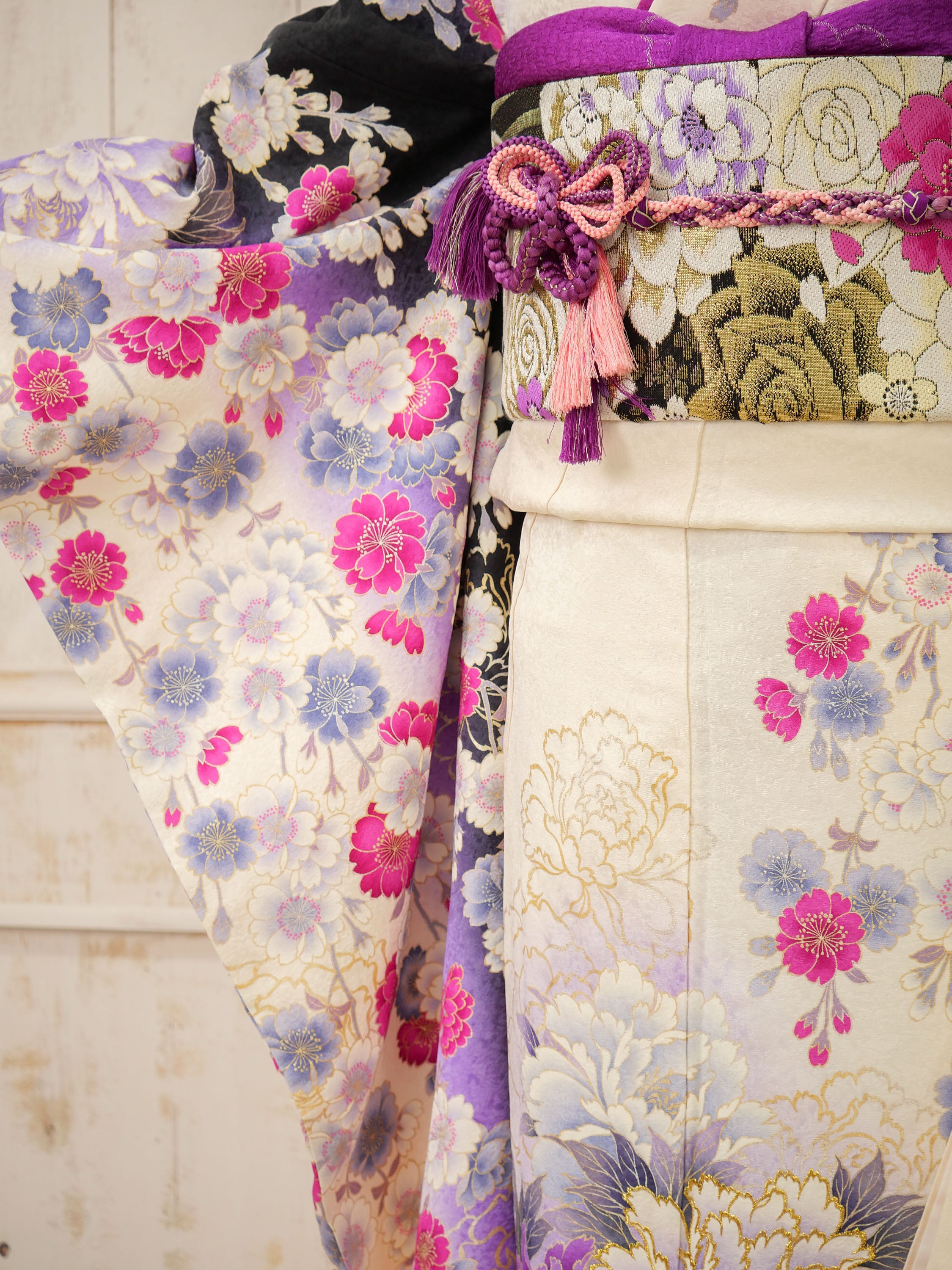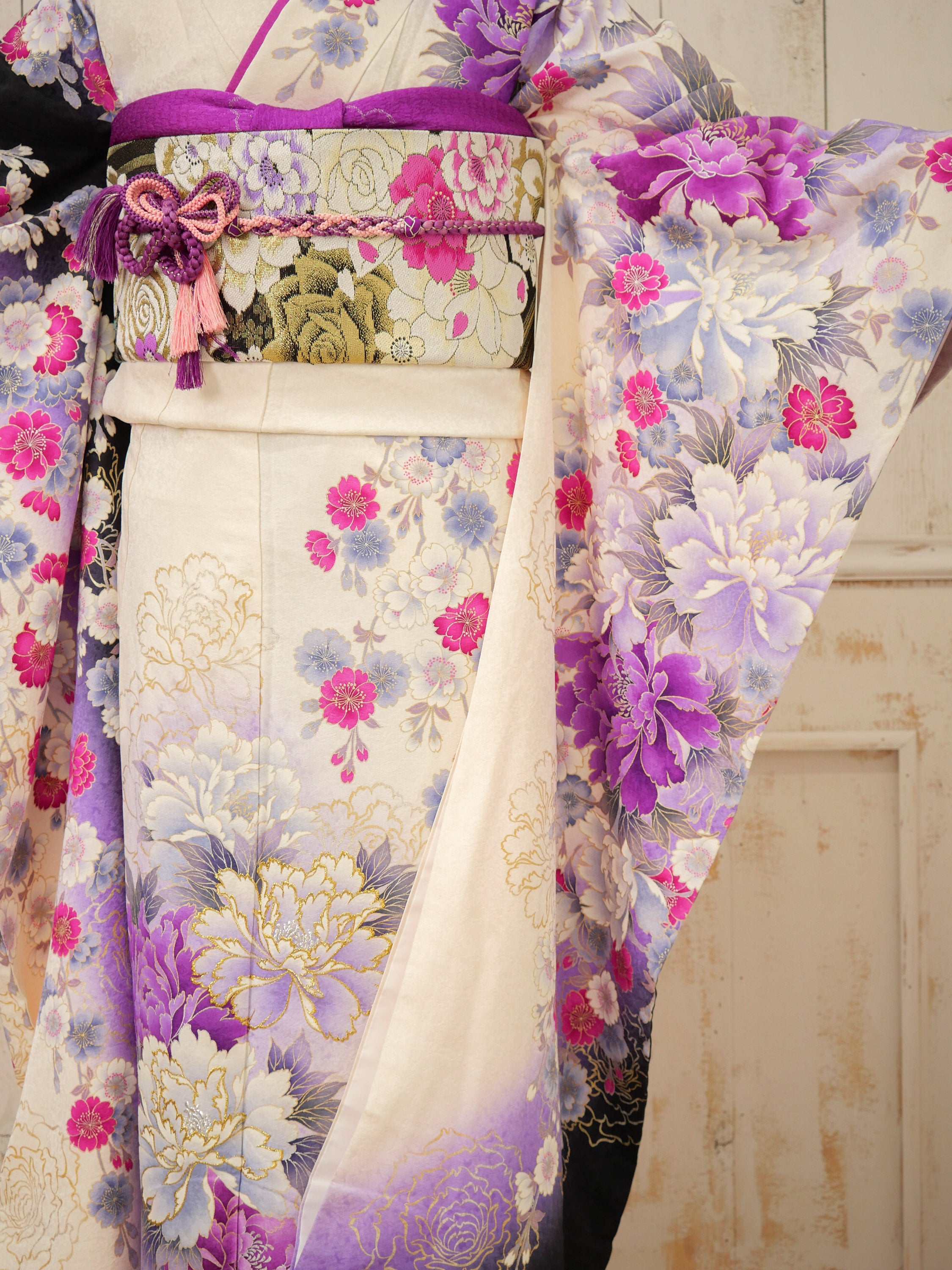 白地に咲く豪華な紫の牡丹と芍薬が目を引くエレガントな一枚。黒とのコントラストが凛とした美しさを演出し、気品と存在感を兼ね備えた印象に。上品で写真映えも抜群です。