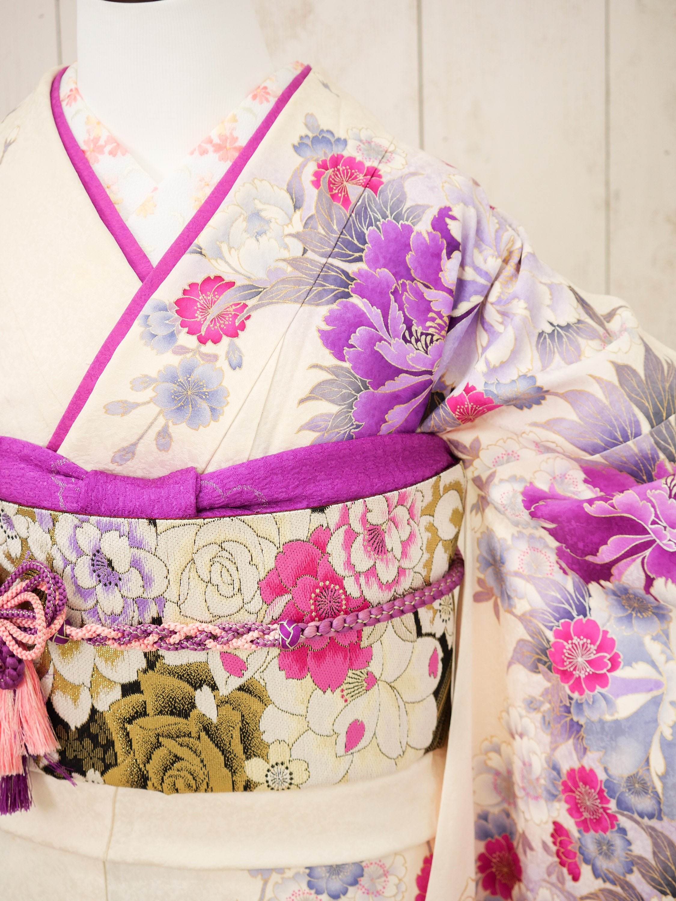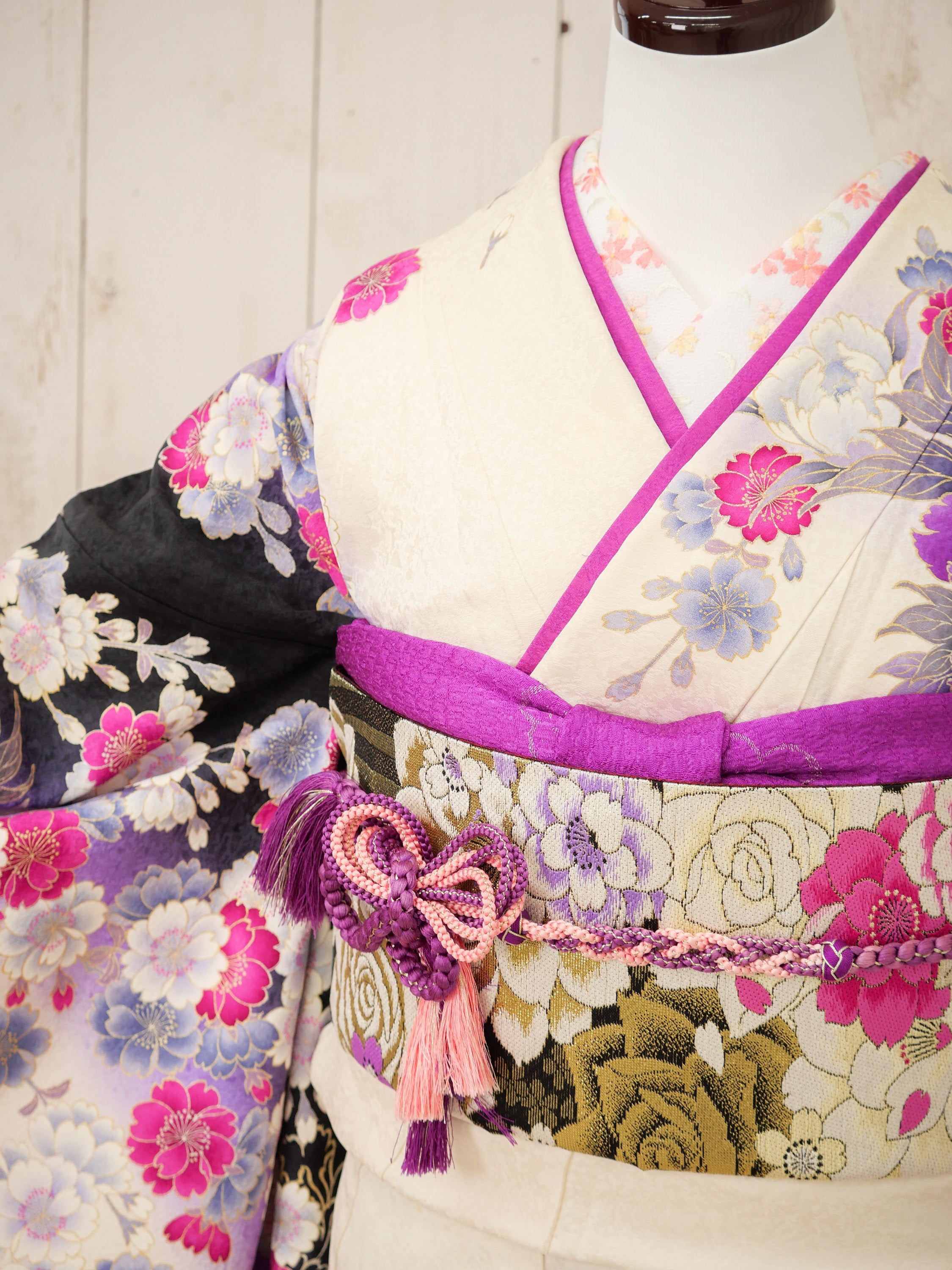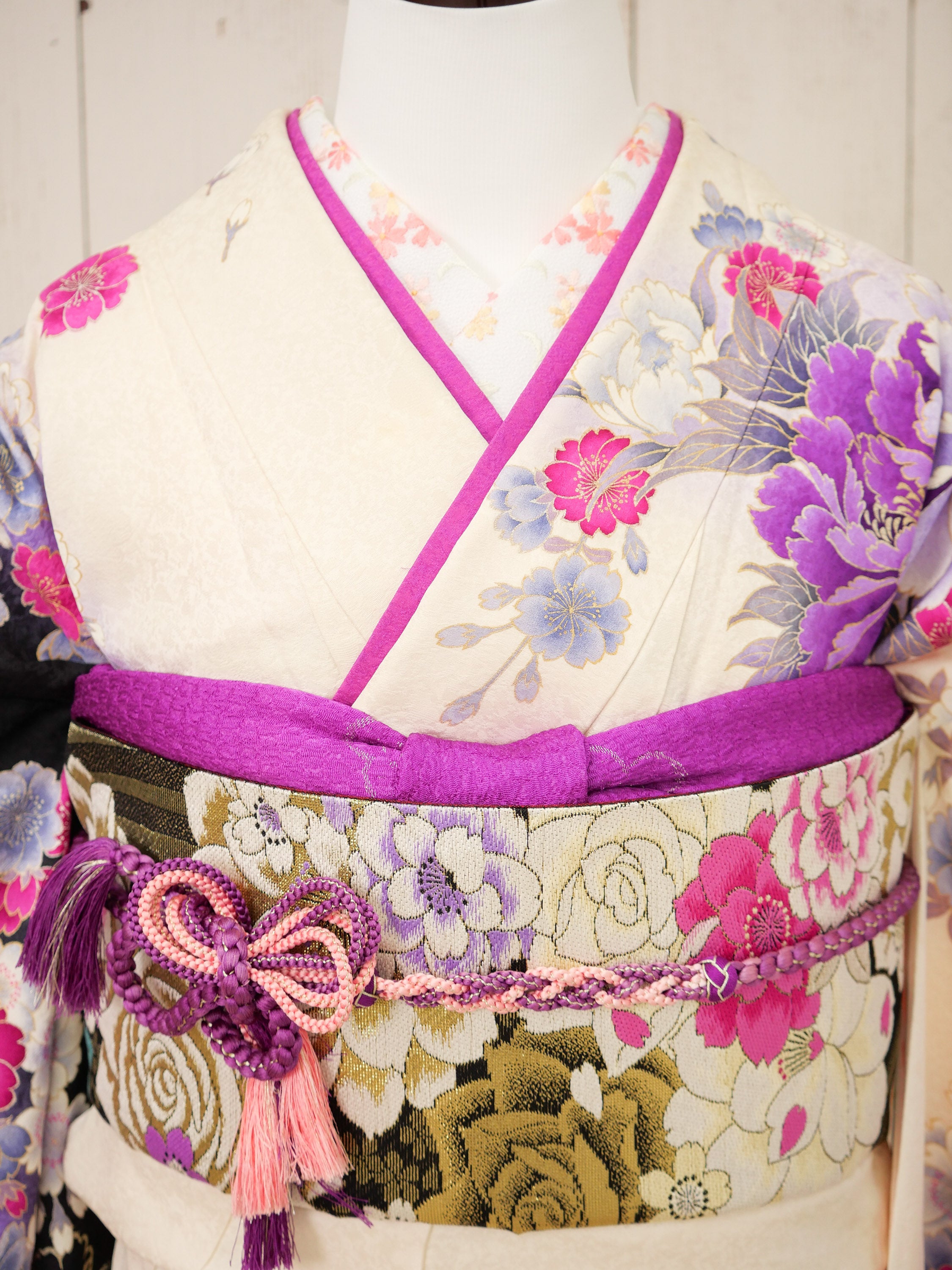 白地に咲く豪華な紫の牡丹と芍薬が目を引くエレガントな一枚。黒とのコントラストが凛とした美しさを演出し、気品と存在感を兼ね備えた印象に。上品で写真映えも抜群です。