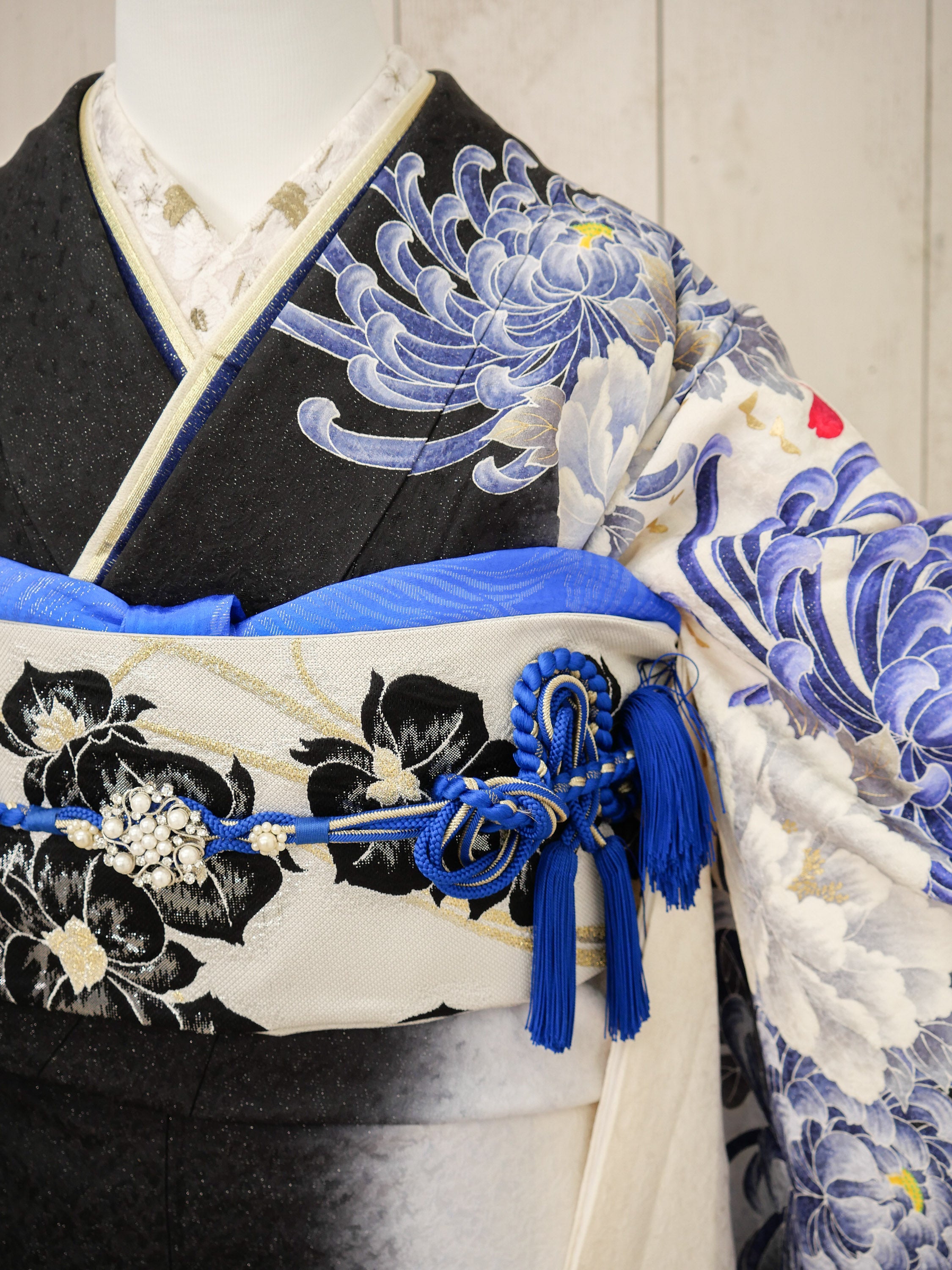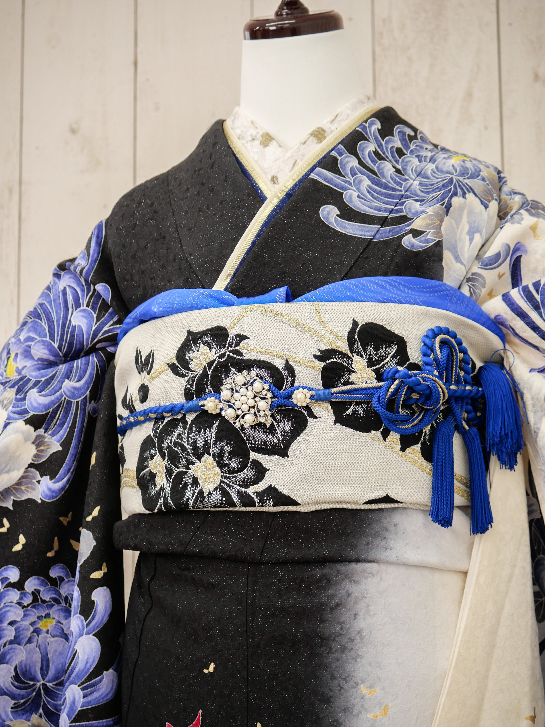 漆黒の地に青と白の大輪の菊が咲き誇る、迫力あるモダン振袖。鮮やかな青の帯締めがアクセントとなり、力強さと気品を兼ね備えたデザインに。華やかでありながら洗練された印象を与え、特別な場を堂々と彩ります。