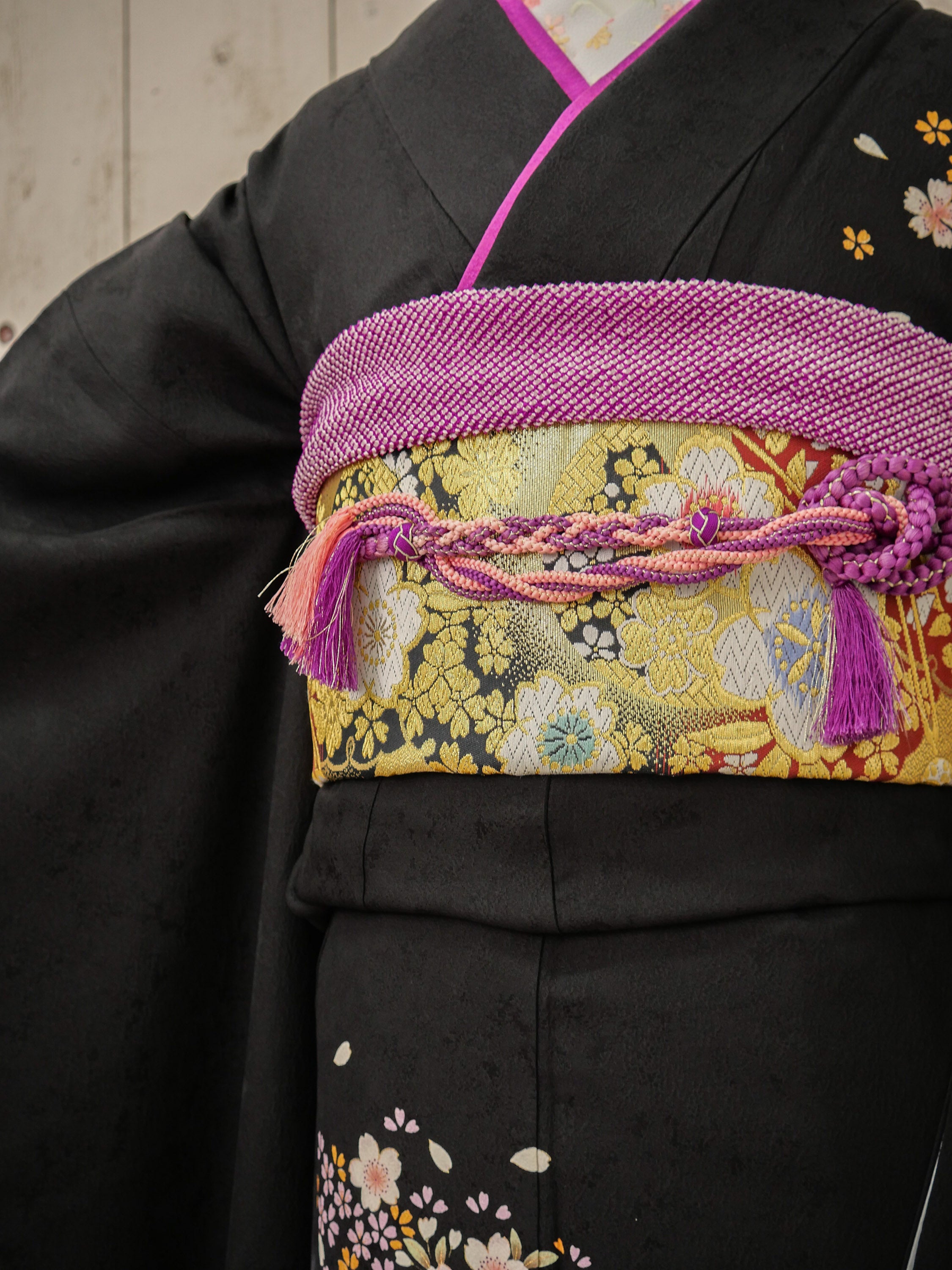 黒地に咲き乱れる桜と花々が華麗に描かれた豪華な振袖。裾の紫から桃色へのグラデーションが幻想的で、金彩の帯が重厚感を添えます。大人の気品と華やかさを兼ね備え、特別な日にふさわしい存在感を引き立てます。
