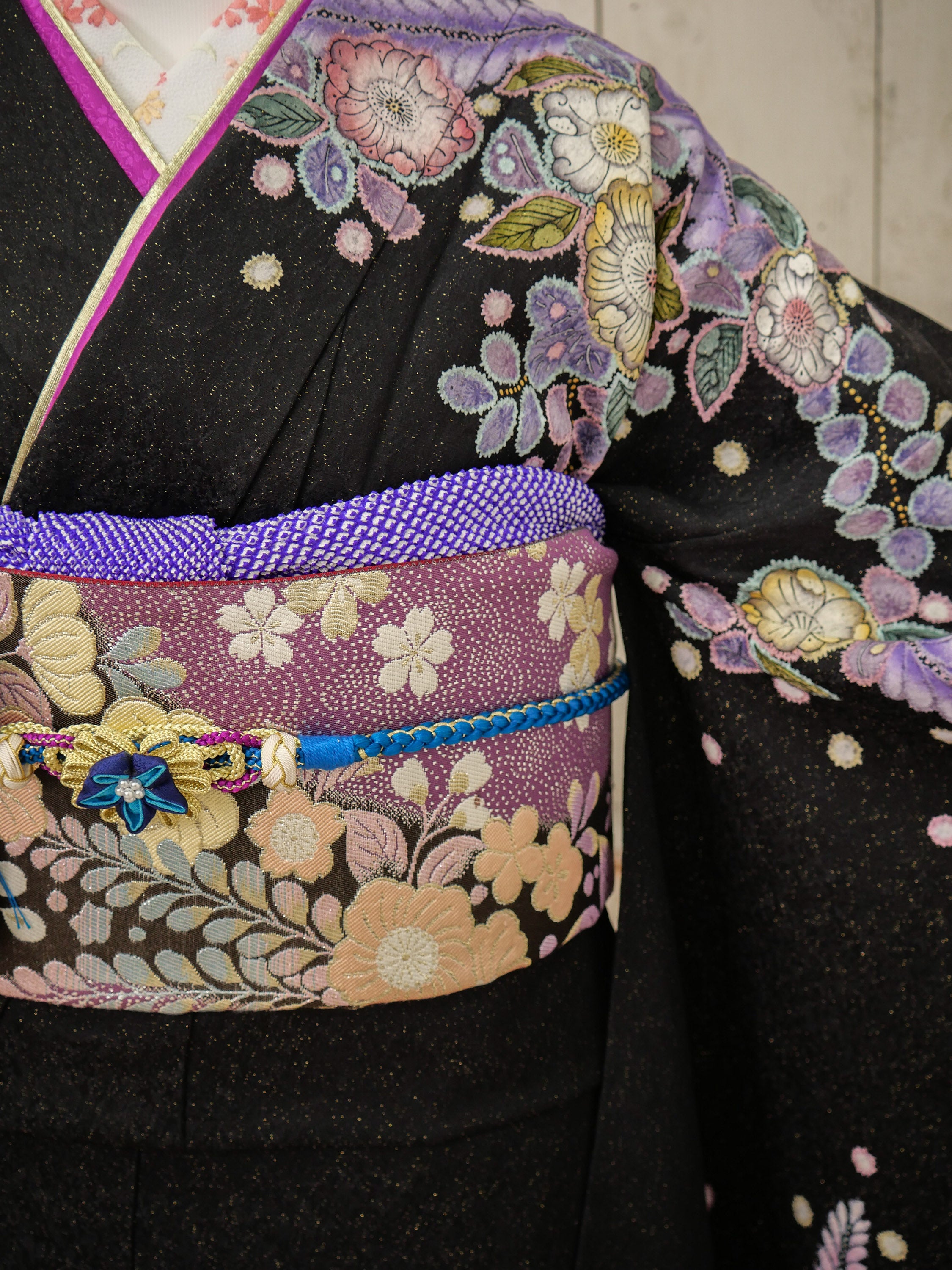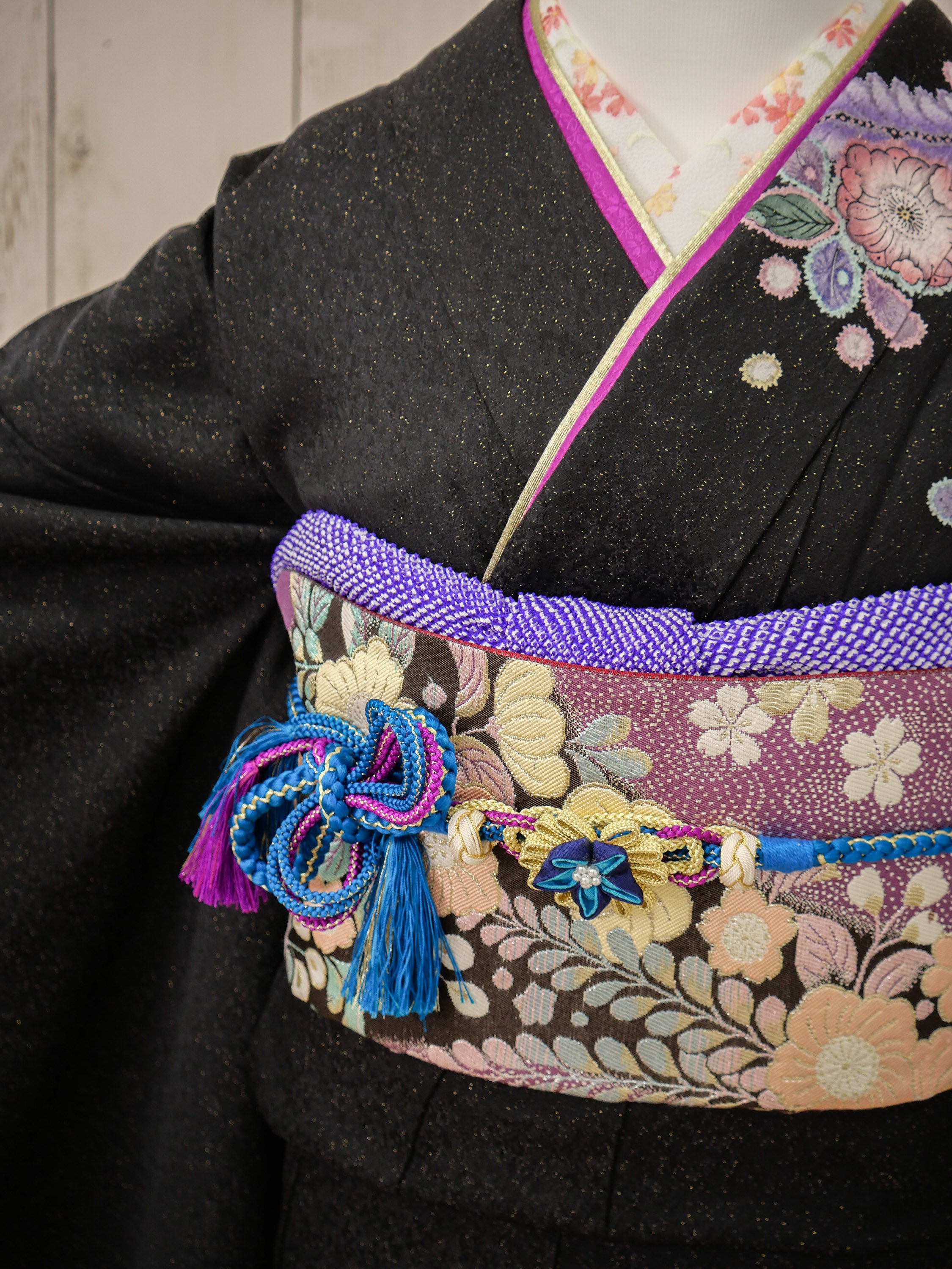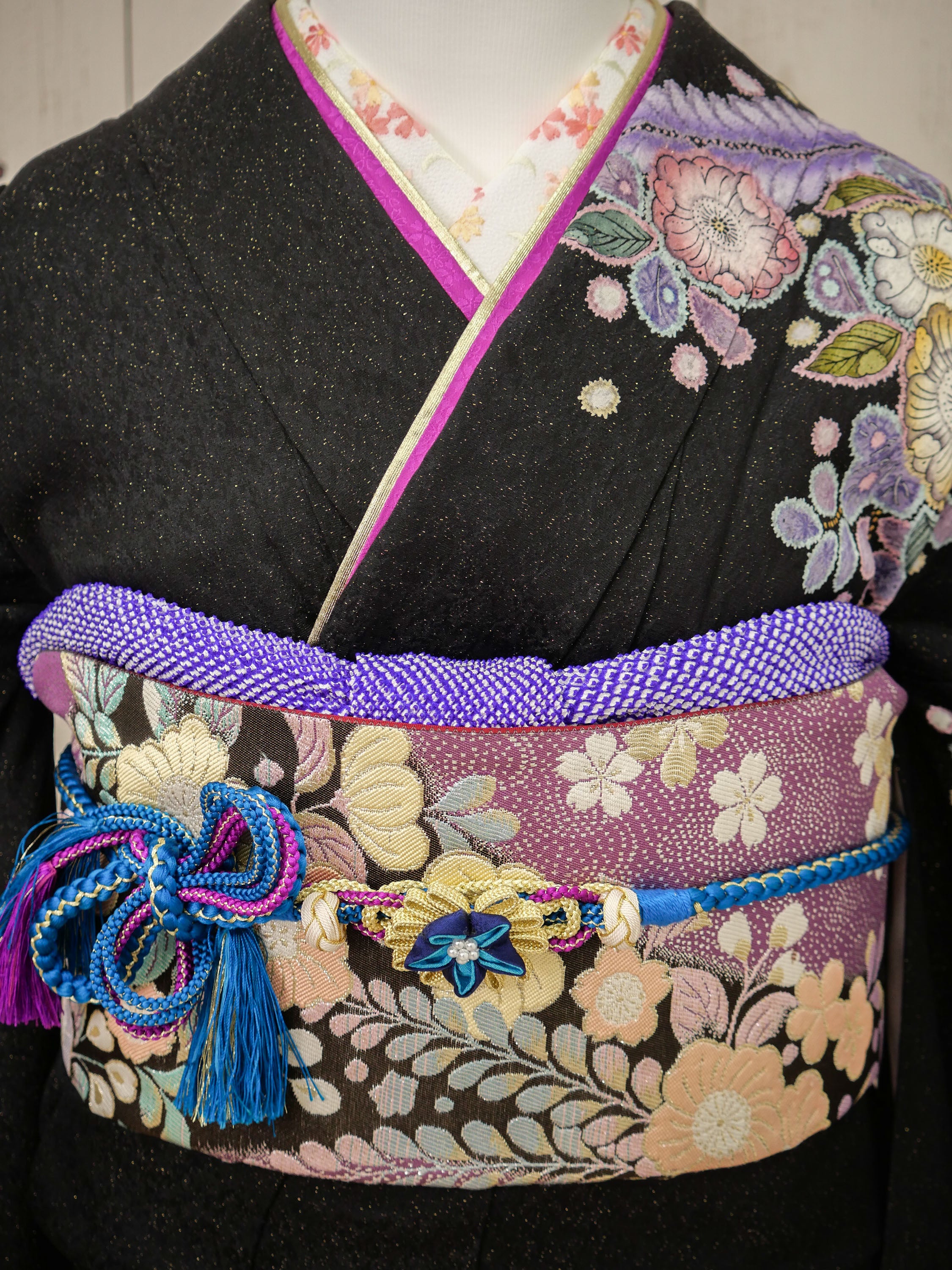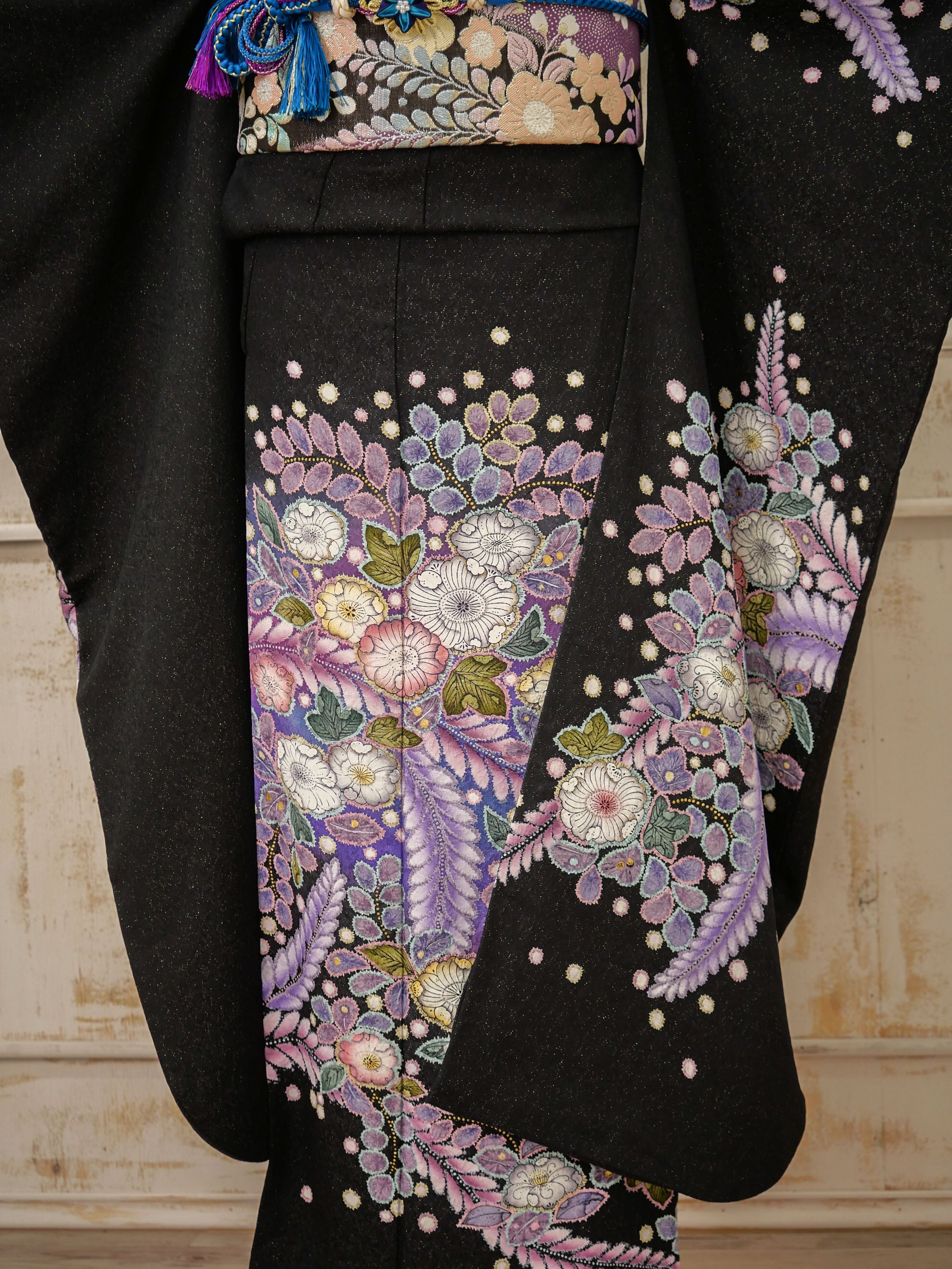 シックな黒地に藤や桜を繊細に描いた、大人の女性らしさ漂う振袖。紫の帯締めと花尽くしの帯が華やかさを加え、格調高さと柔らかさを演出します。落ち着きの中に華やぎを感じる、洗練された雰囲気の一枚です。