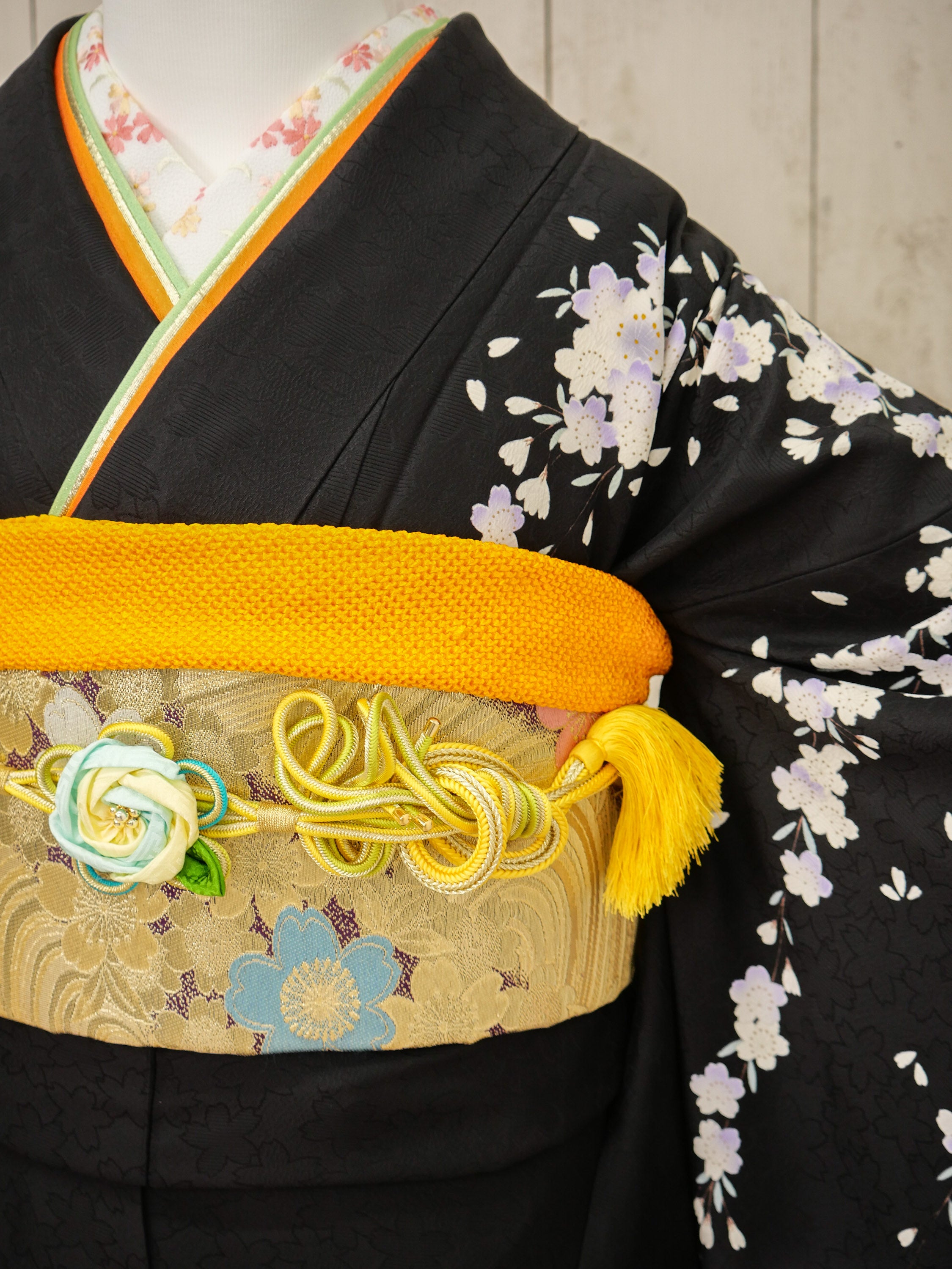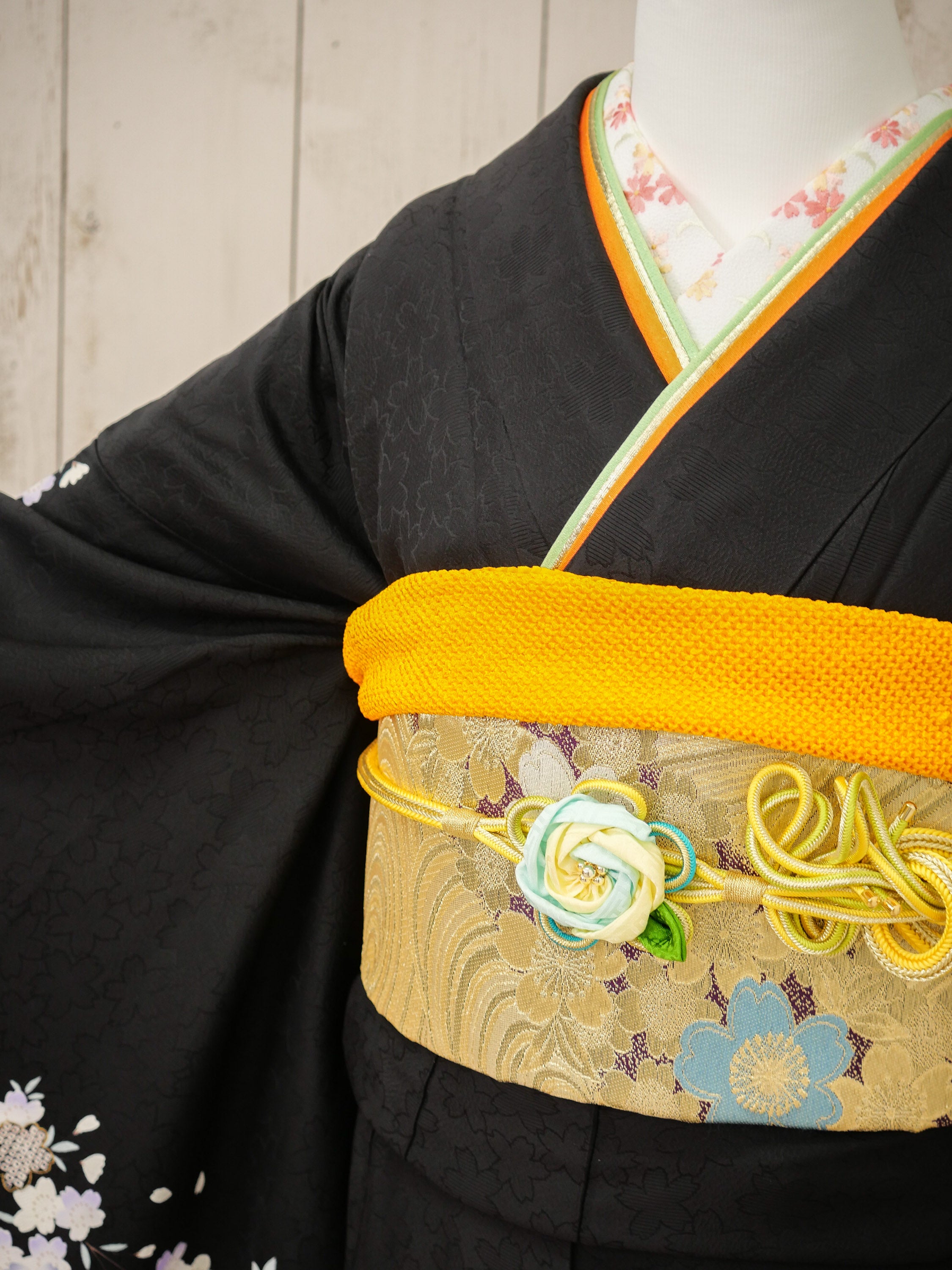 中振袖、袋帯、長襦袢(半襟付き、ポリエステル)、重ね衿(着物に縫い付けの商品あり)、帯揚げ、帯締め、ショール、腰紐5本、伊達締め2本、衿芯、前板、後板、帯枕(ガーゼ付き)、コーリンベルト1本、三重紐、草履、バッグ