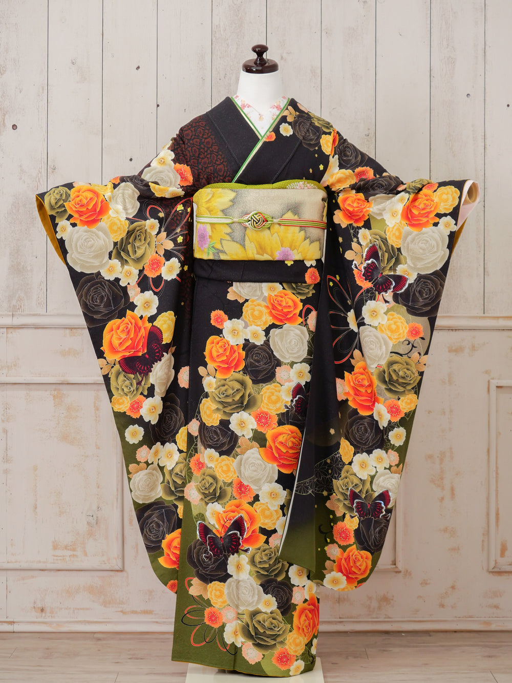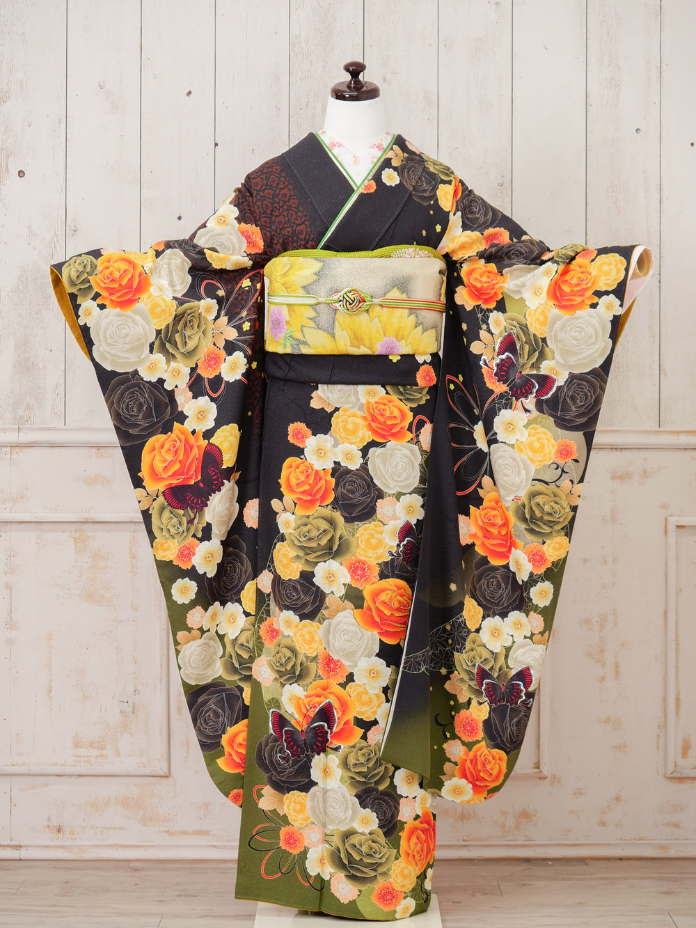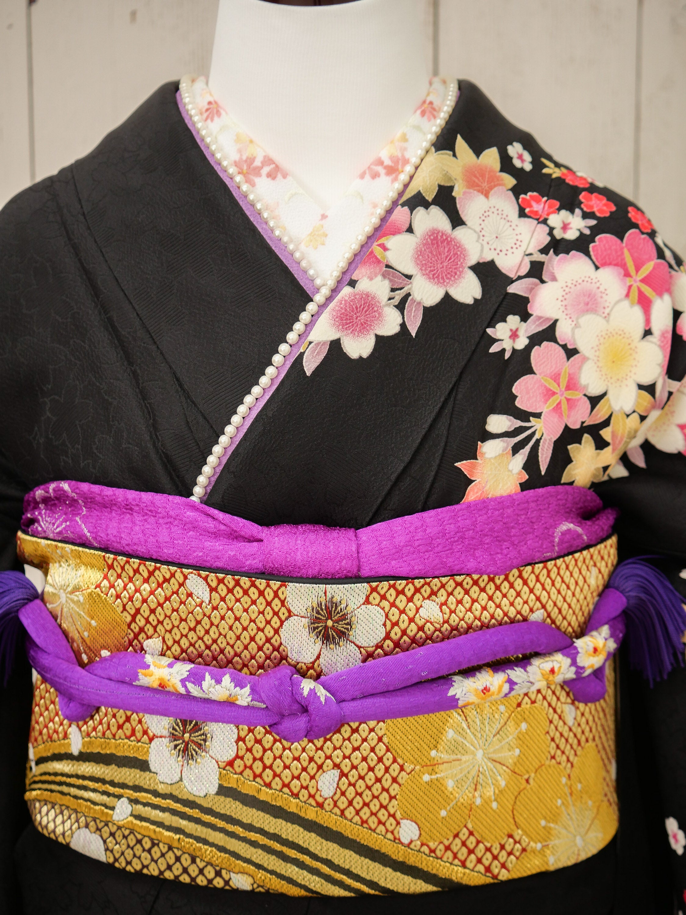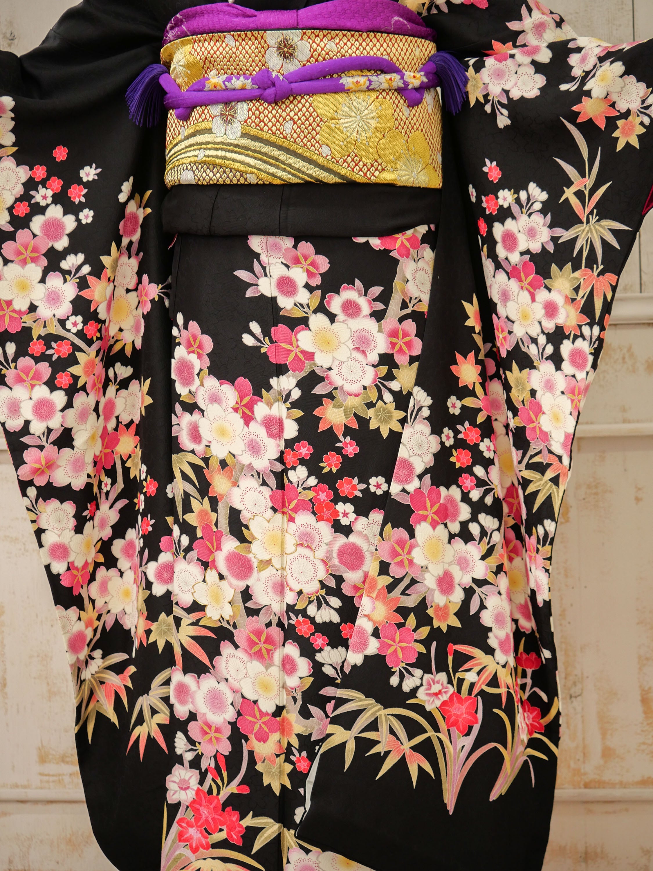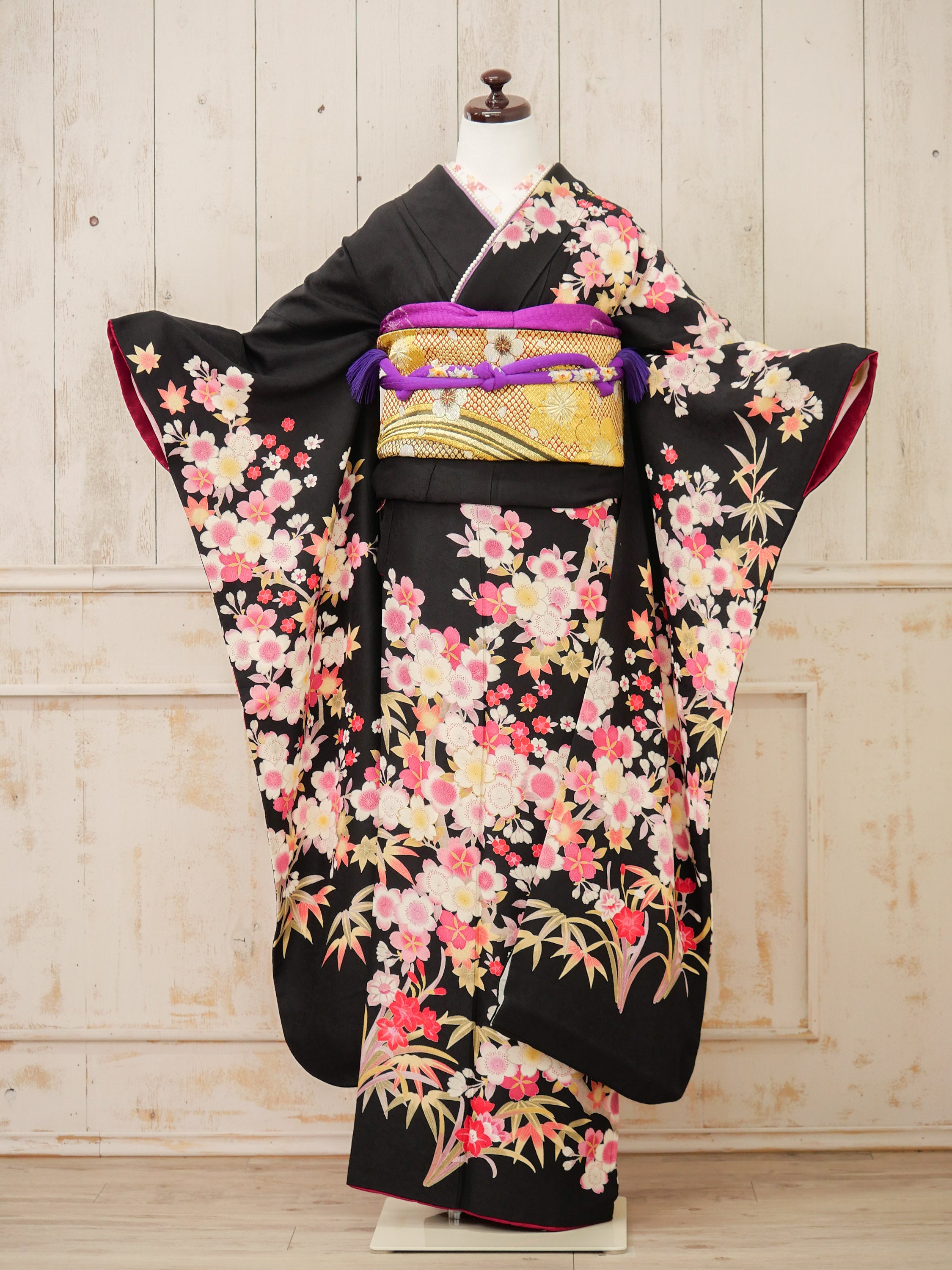 漆黒の地に咲き誇る桜と竹の意匠が、清楚でありながら凛とした美しさを放つ振袖。淡いピンクや紅色の花々が舞い散るように広がり、華やかで上品な存在感を演出します。紫の帯締めがアクセントとなり、伝統美とモダンさを兼ね備えた晴れの日にふさわしい一着です。