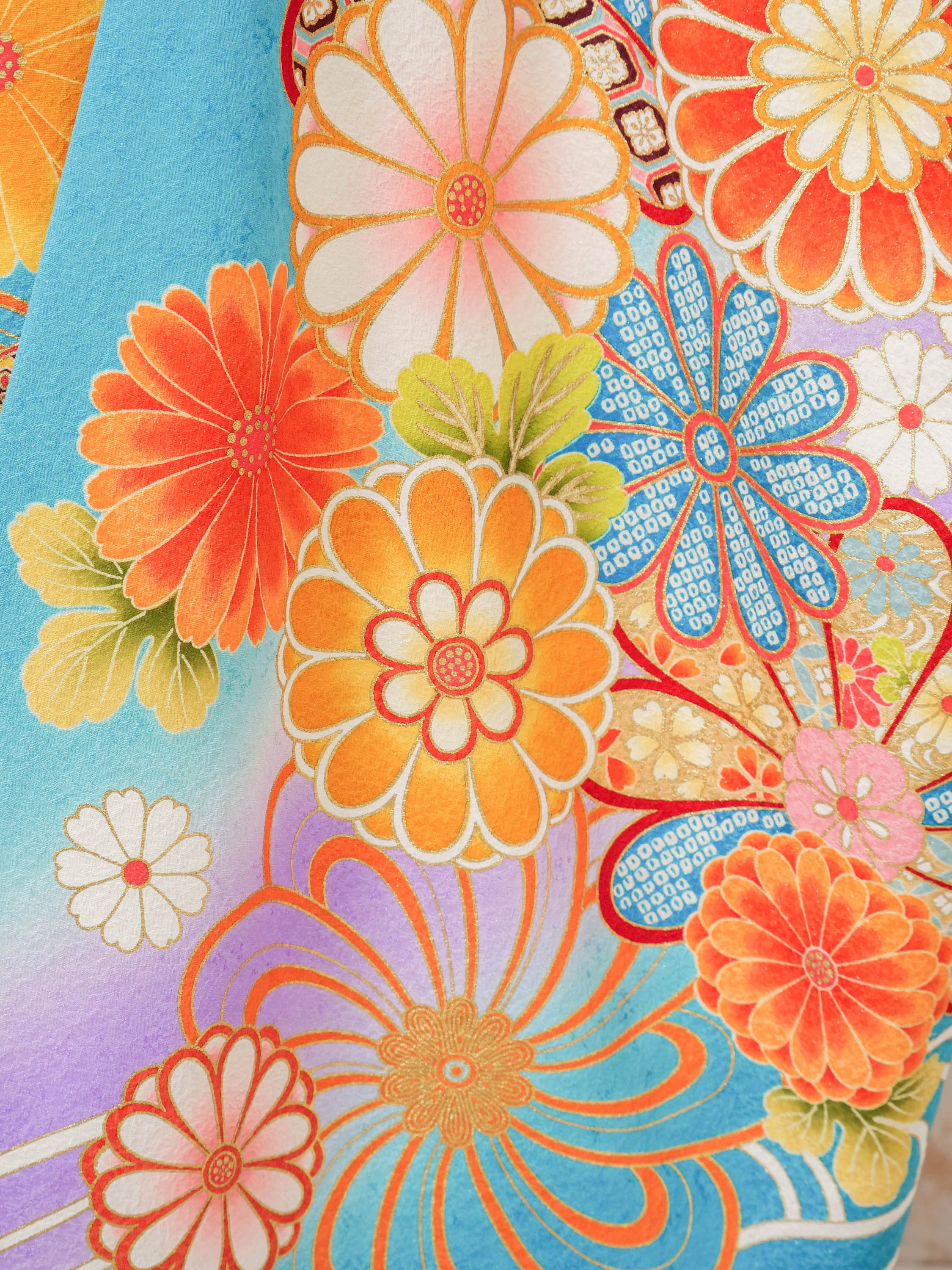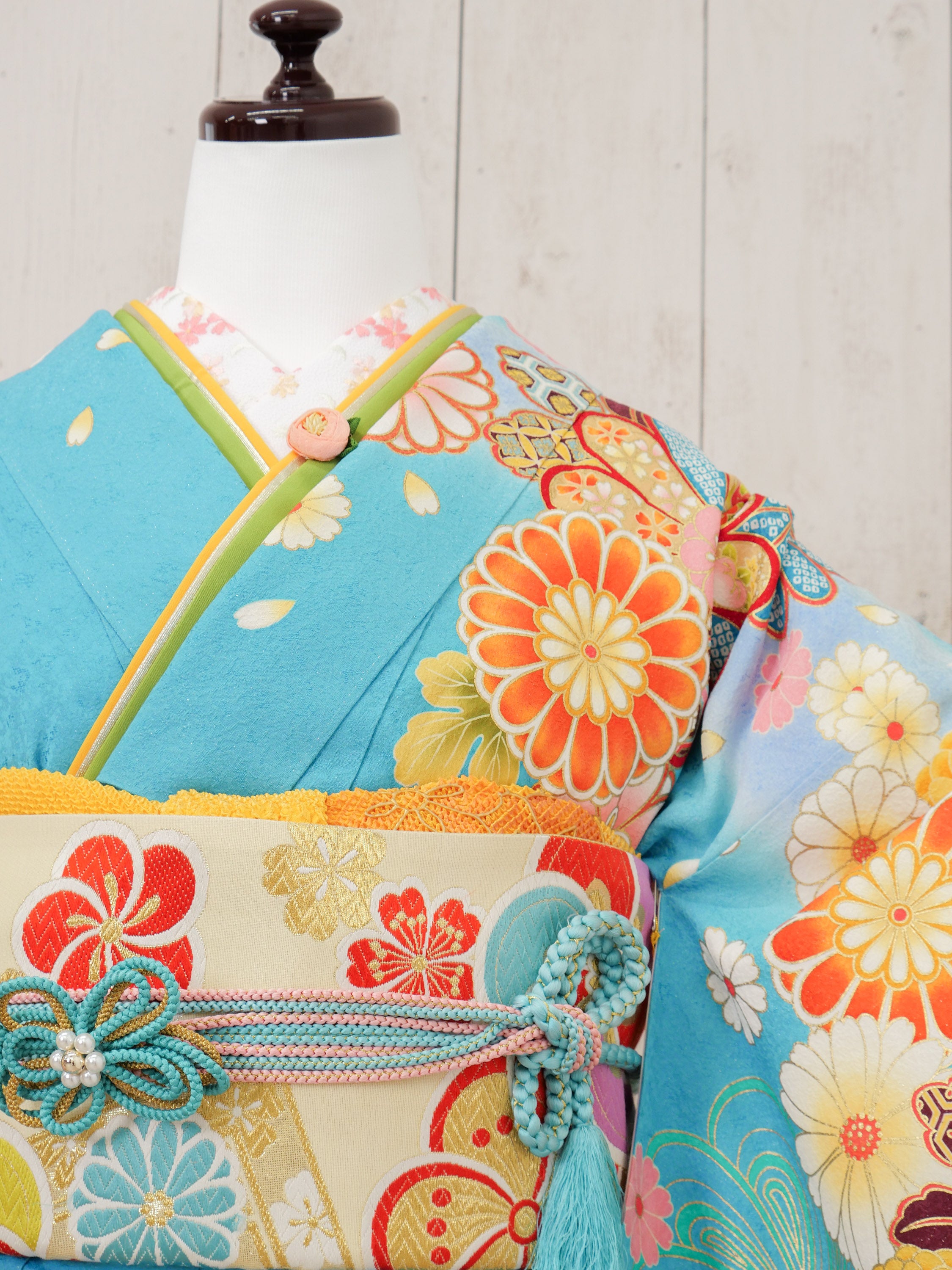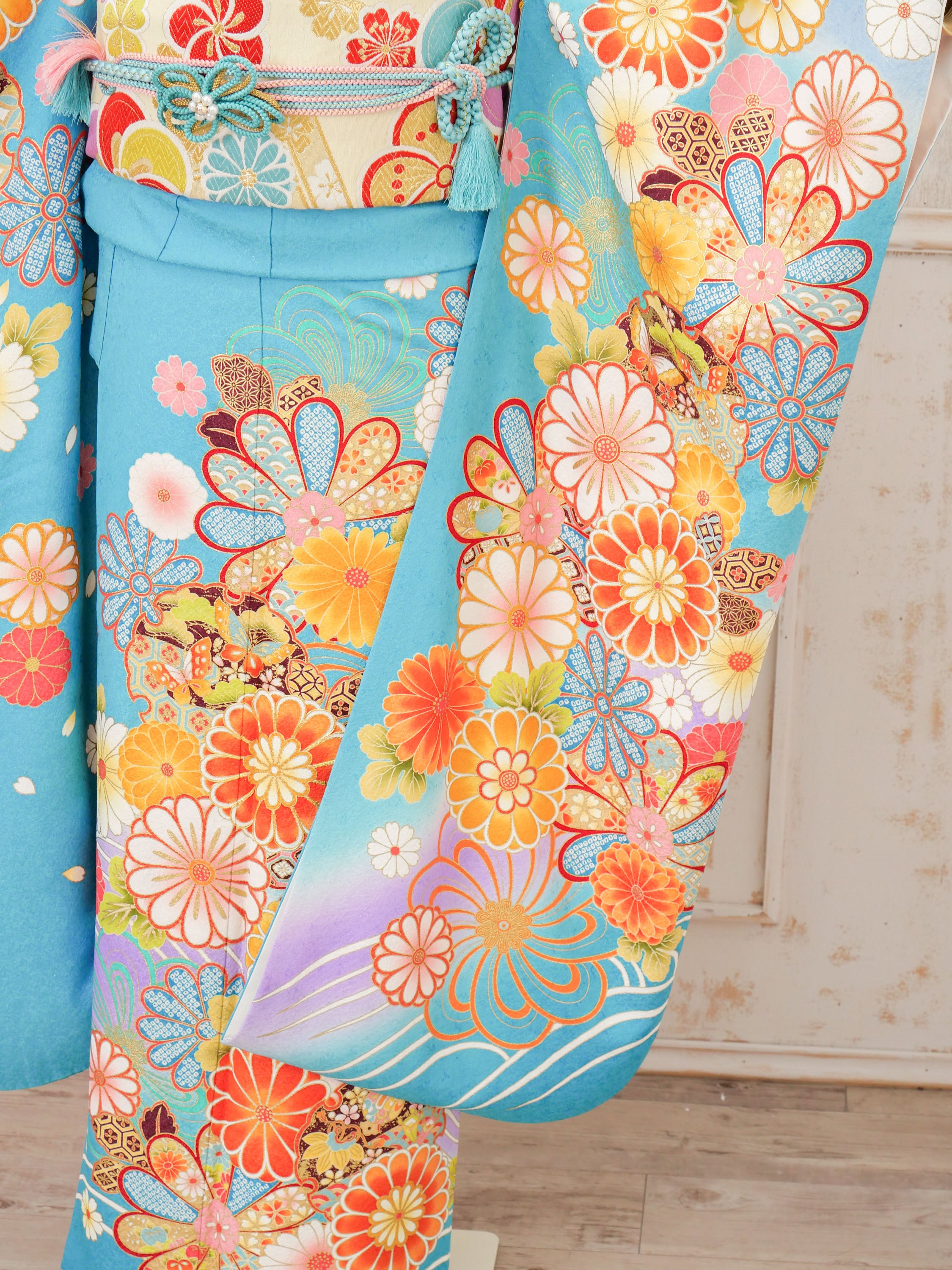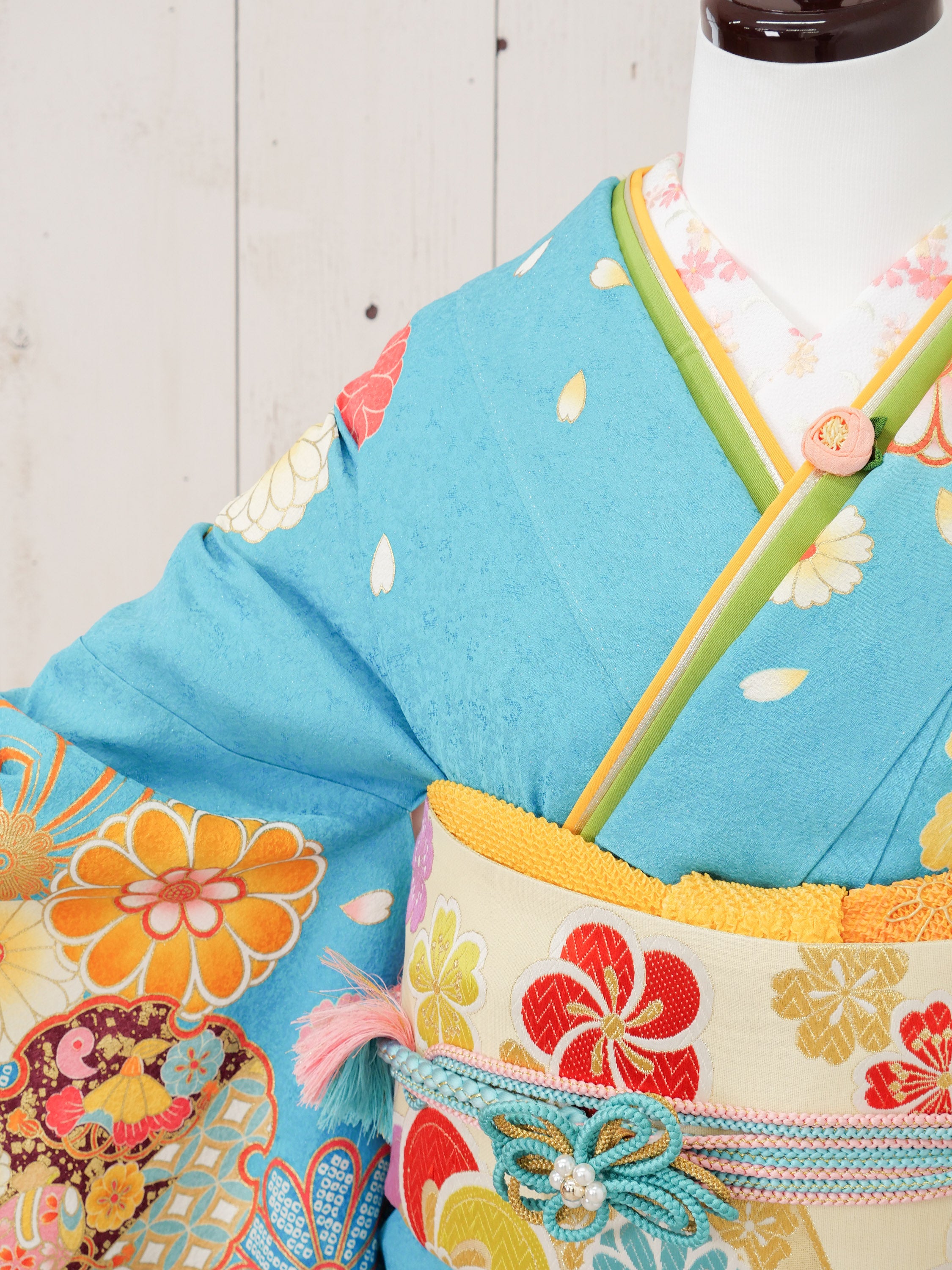 爽やかなターコイズブルーに、大輪の花々が贅沢にあしらわれた振袖。可愛らしさと華やかさを兼ね備え、写真映えも抜群のデザインです。