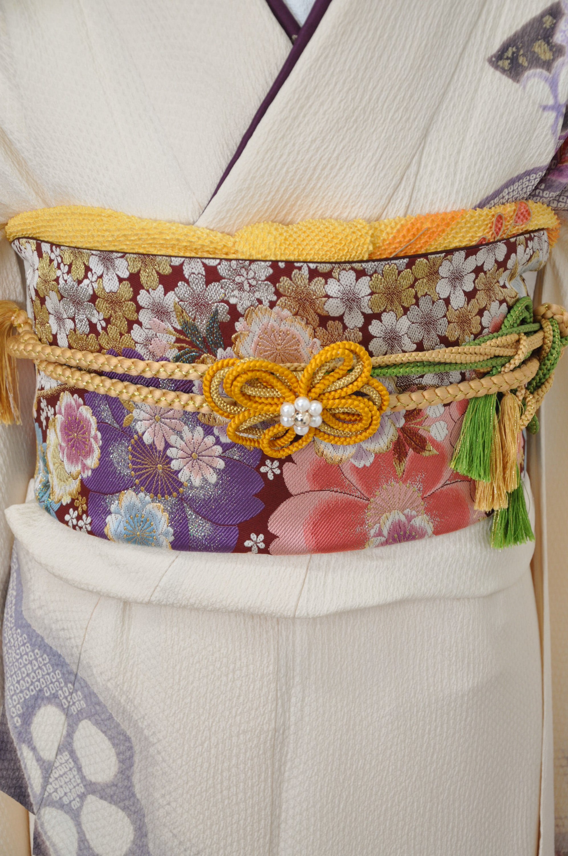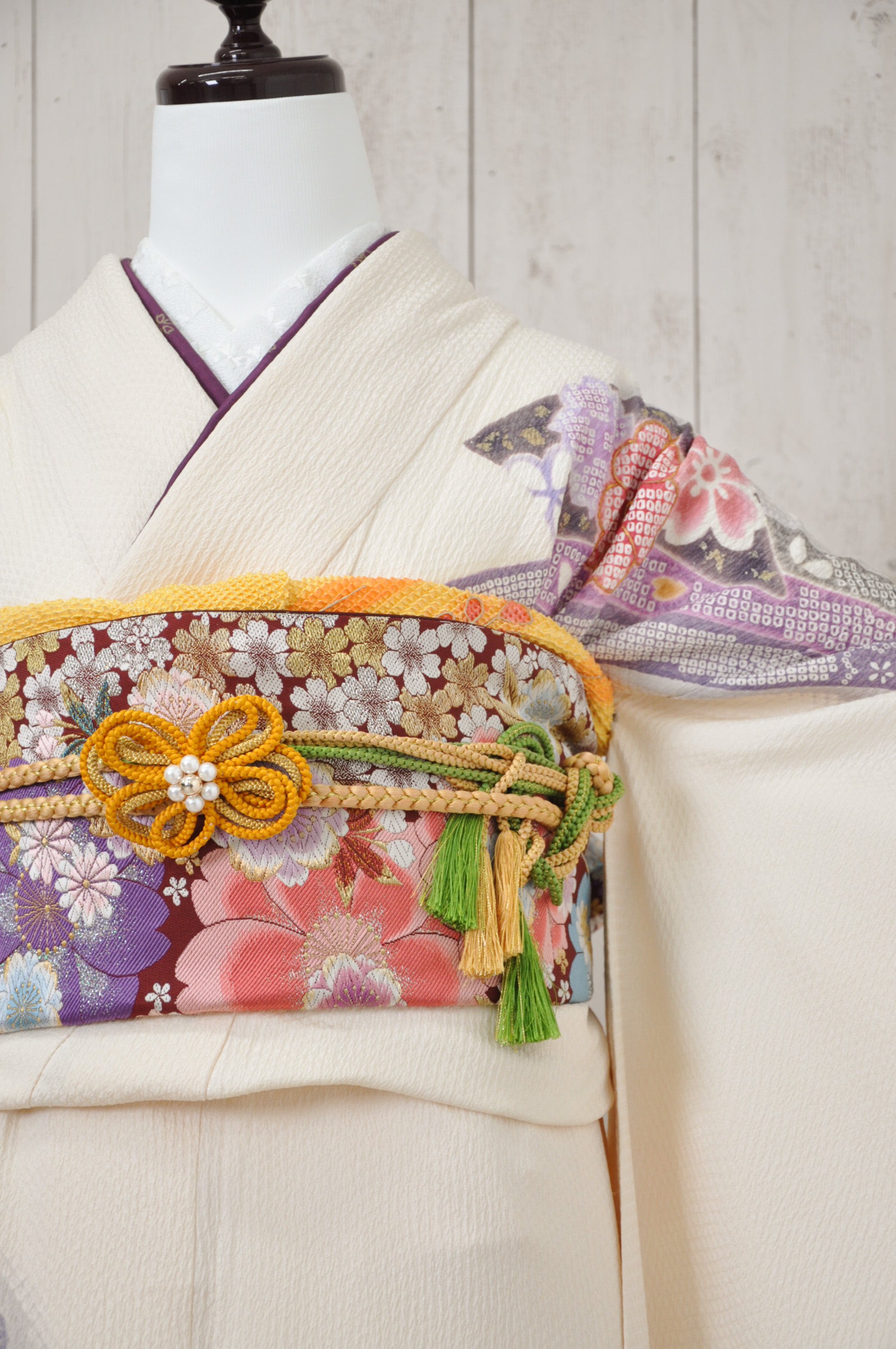 中振袖、袋帯、長襦袢(半襟付き、ポリエステル)、重ね衿(着物に縫い付けの商品あり)、帯揚げ、帯締め、ショール、腰紐5本、伊達締め2本、衿芯、前板、後板、帯枕(ガーゼ付き)、コーリンベルト1本、三重紐、草履、バッグ