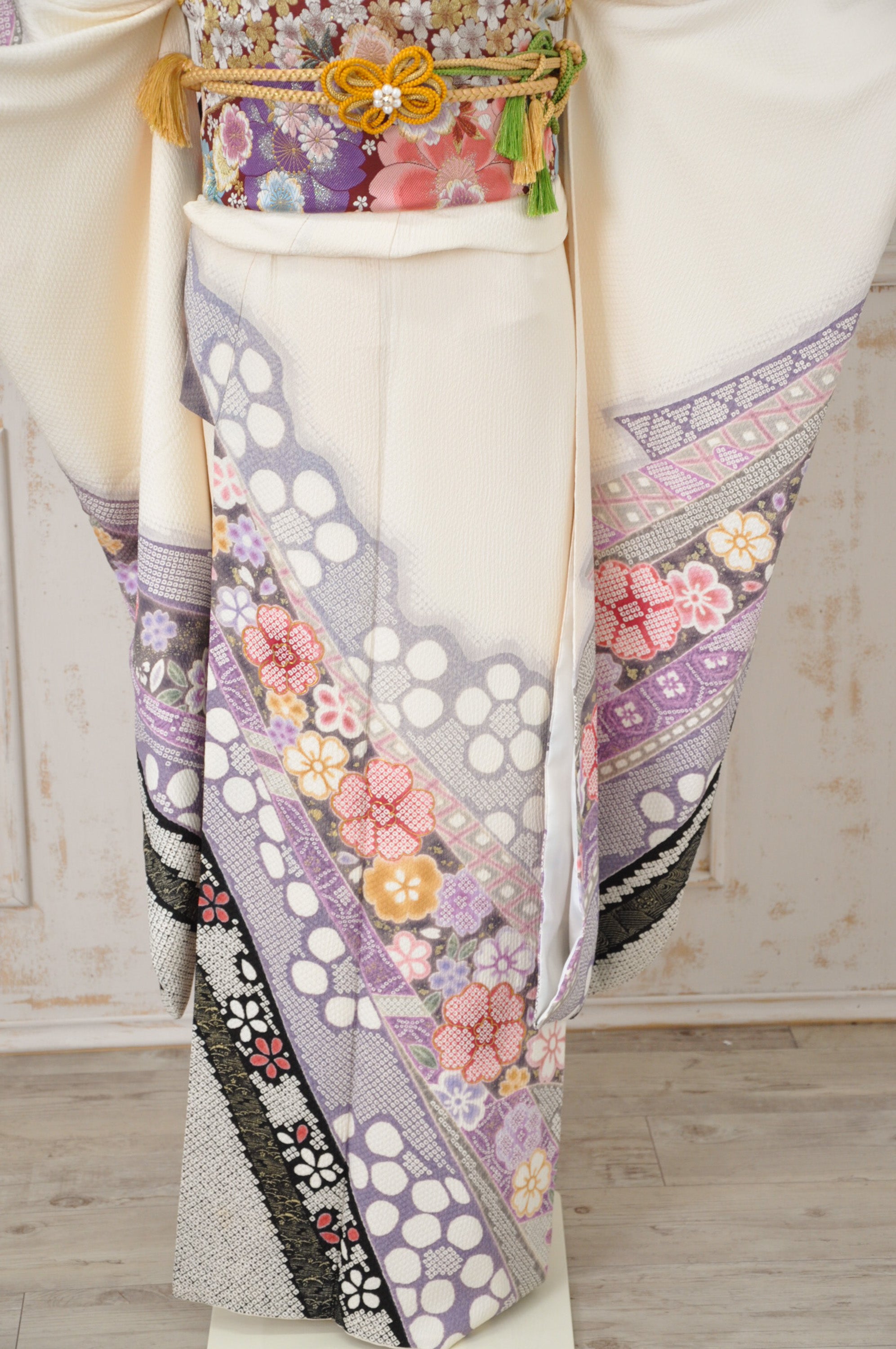 アイボリーに淡いパープルとグレーの幾何学風花柄が特徴の振袖。都会的で個性派なデザインは、洗練された印象に。