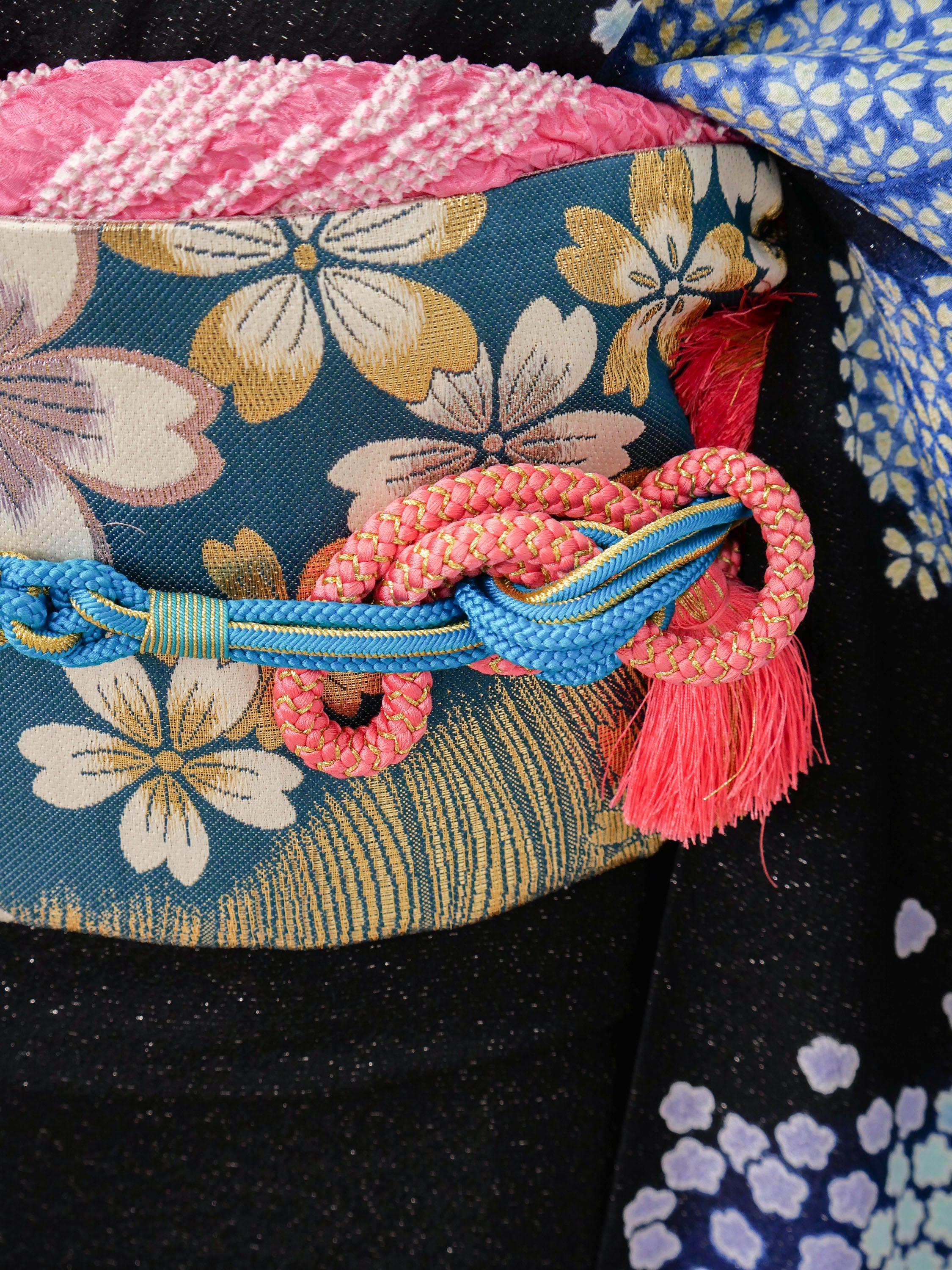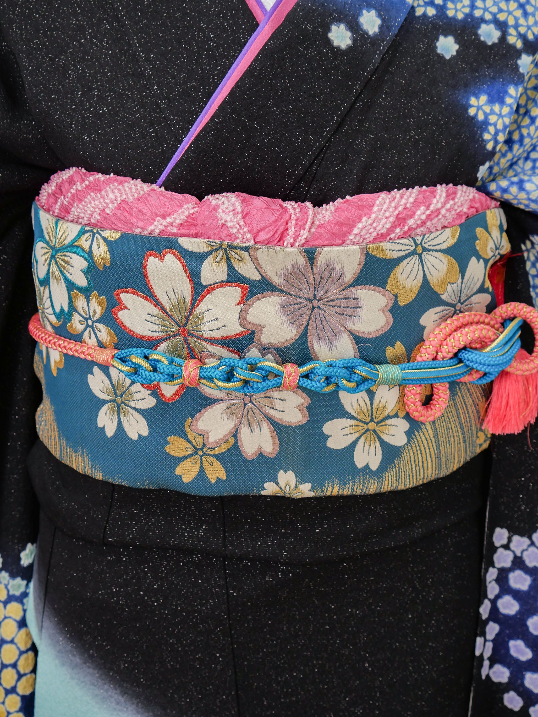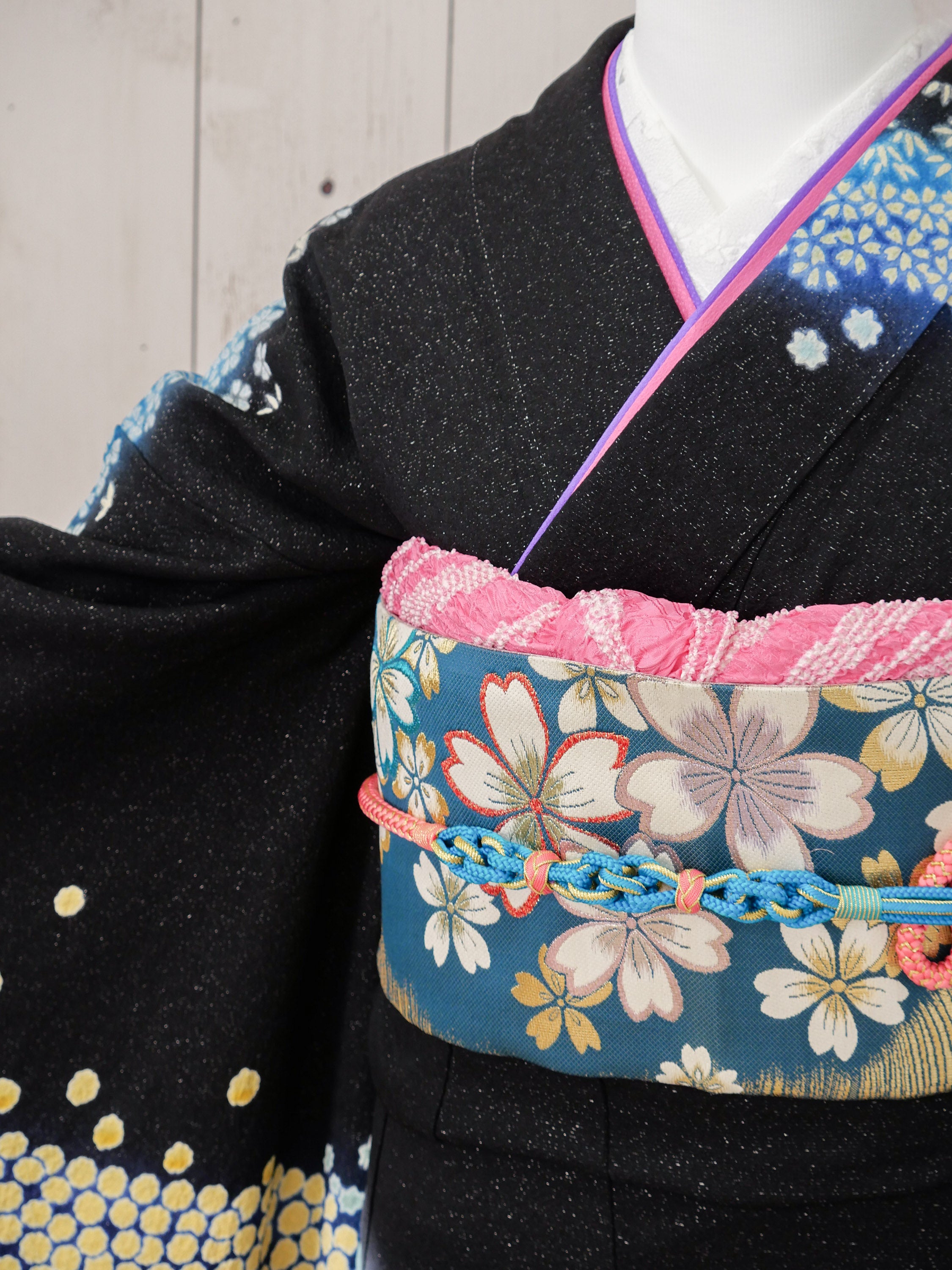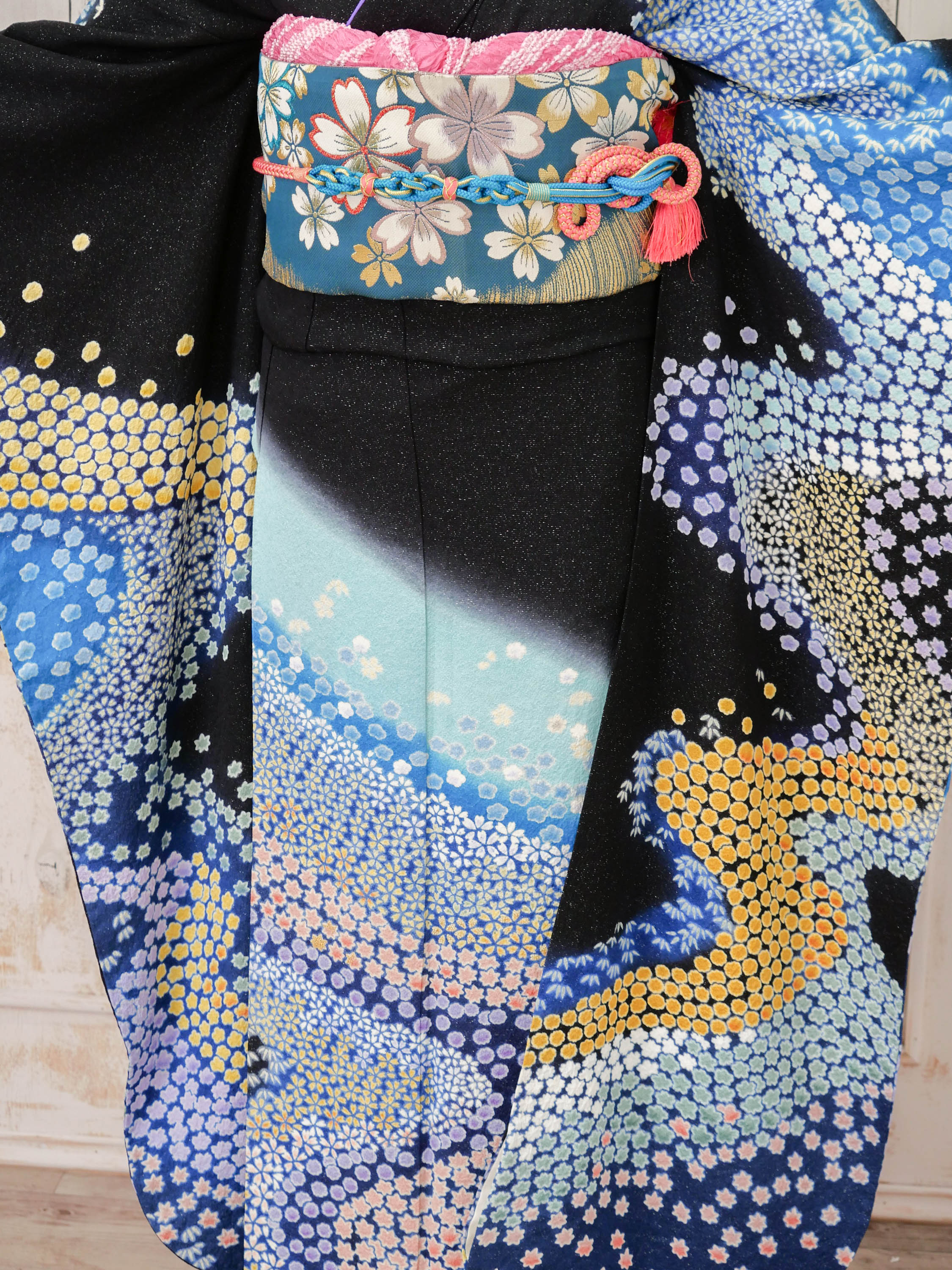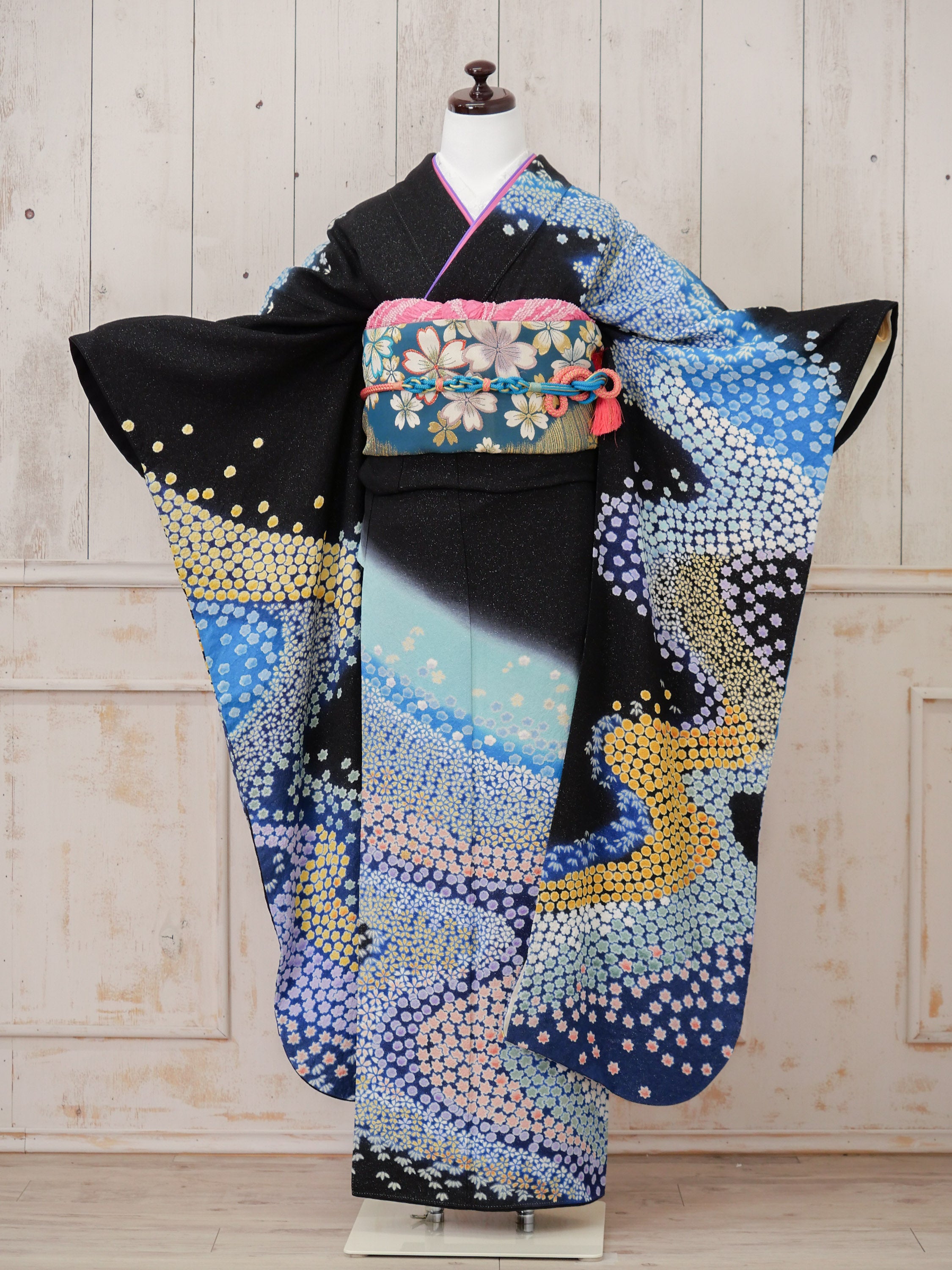 星空を思わせる黒地に、青や黄色の点描で描かれた幻想的な振袖。流れるような文様がまるで夜空に広がる天の川のように煌めき、独創的でモダンな雰囲気を演出します。帯には花柄を配し、華やかさをプラス。人と違う個性を大切にする方にぴったりの一枚で、見る人を惹きつける圧倒的な存在感を放ちます。