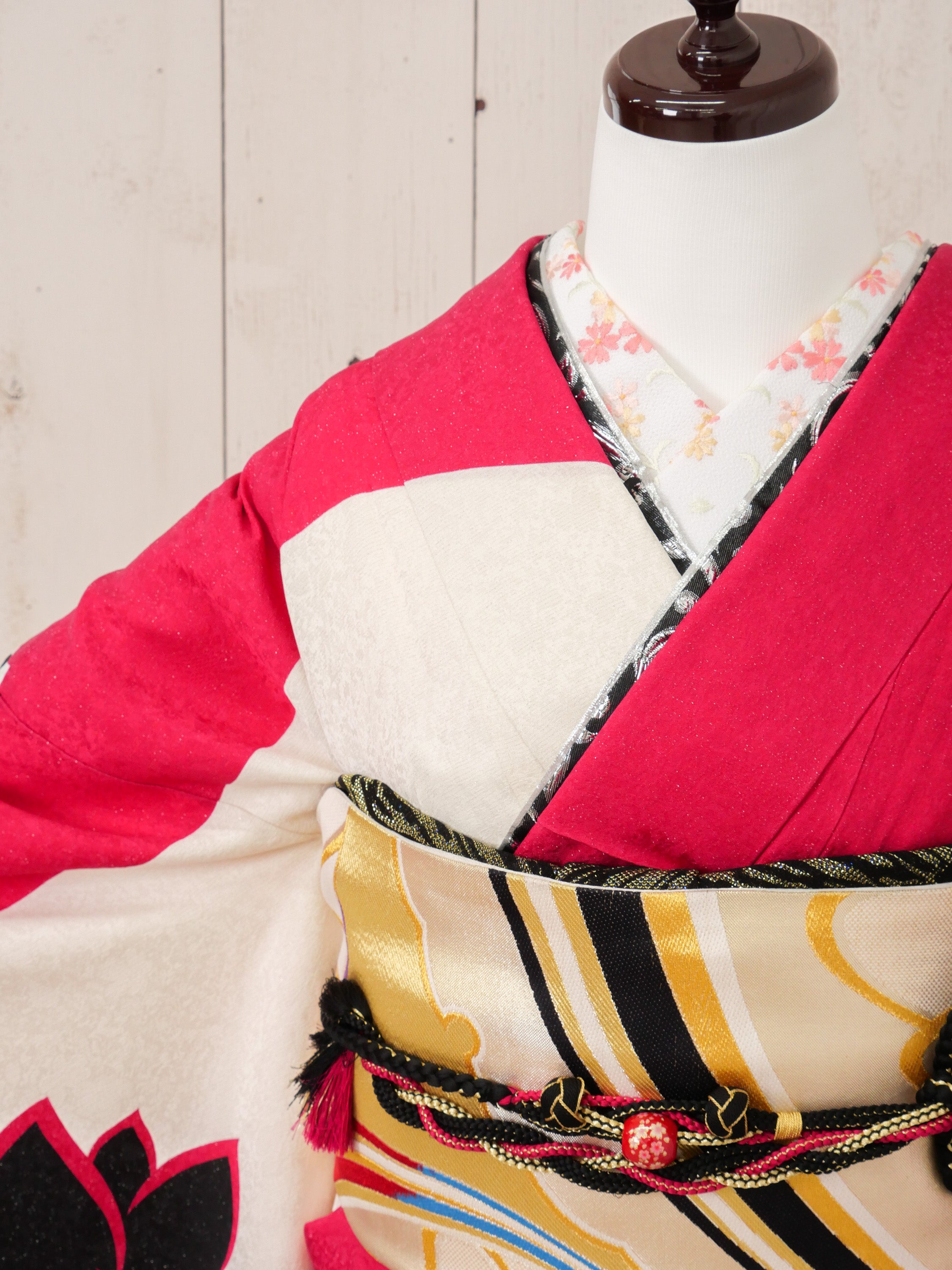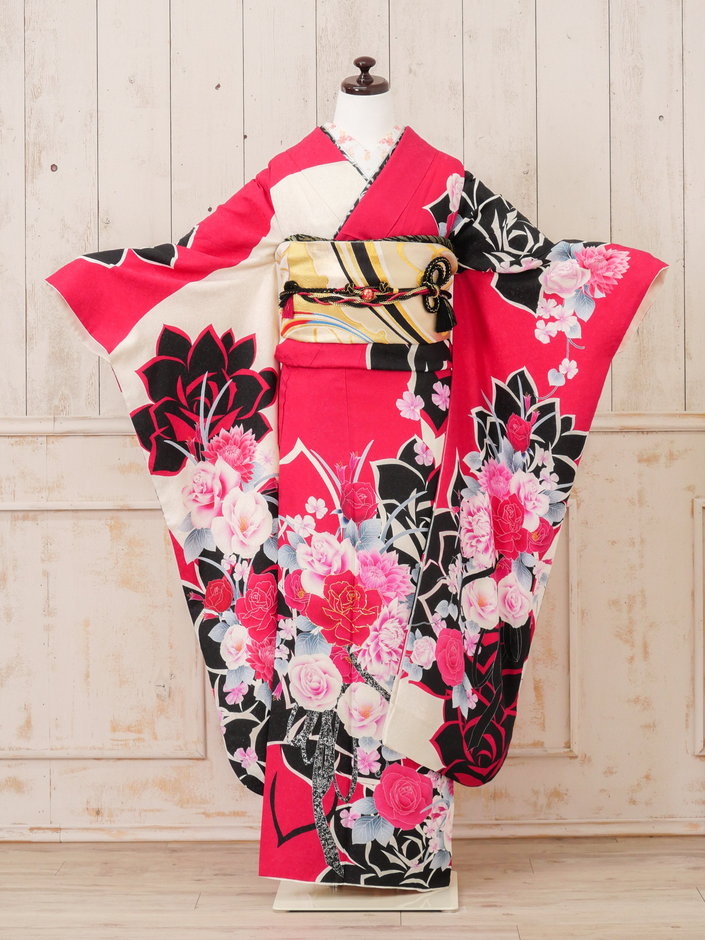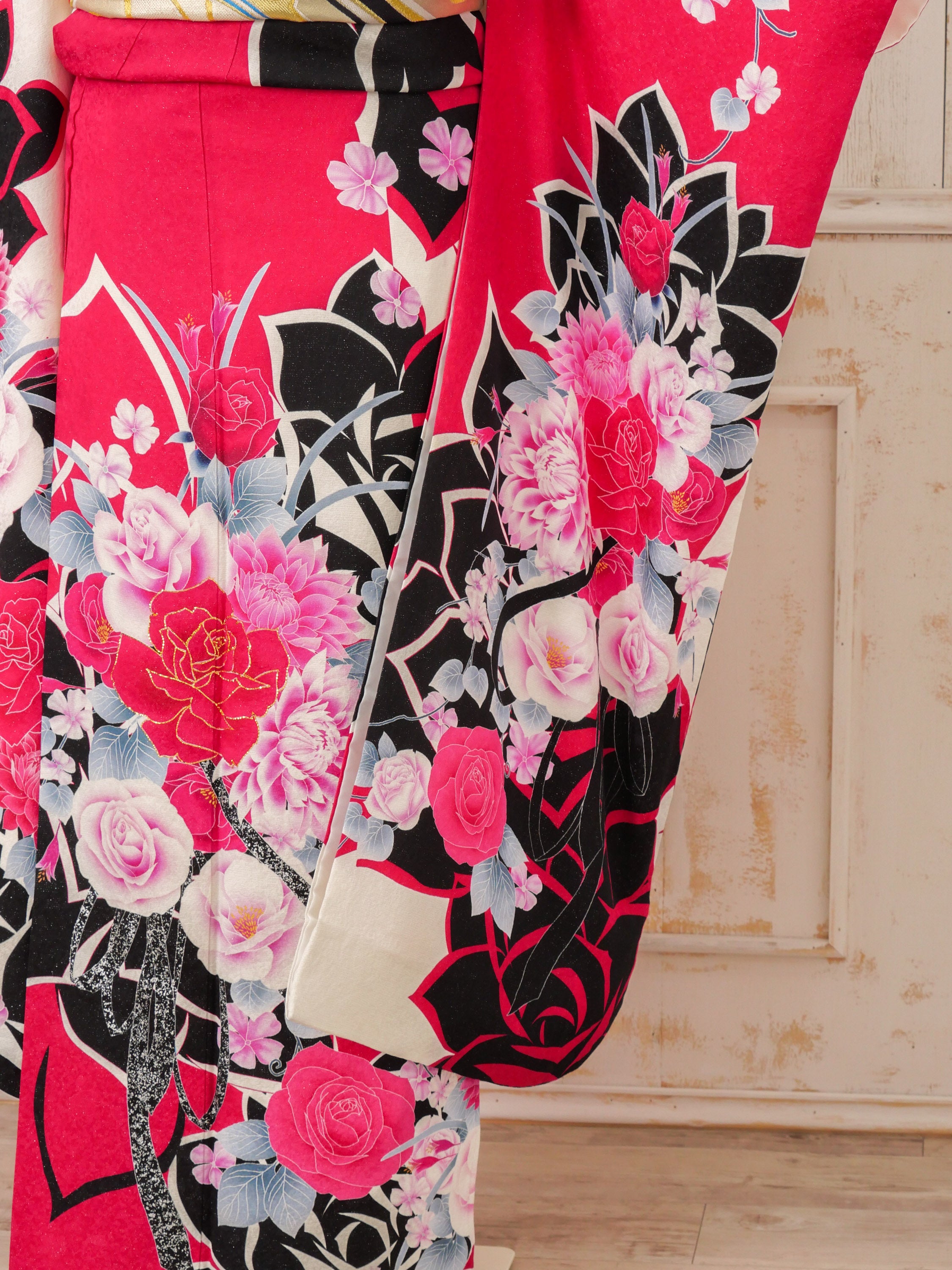 鮮やかな赤に大輪のバラが咲き誇る、華やかさ抜群の振袖。黒と白のコントラストが花柄を引き立て、視線を集めるデザインです。ゴールド帯が上品なアクセントとなり、大人っぽさと可憐さを兼ね備えた一着。
