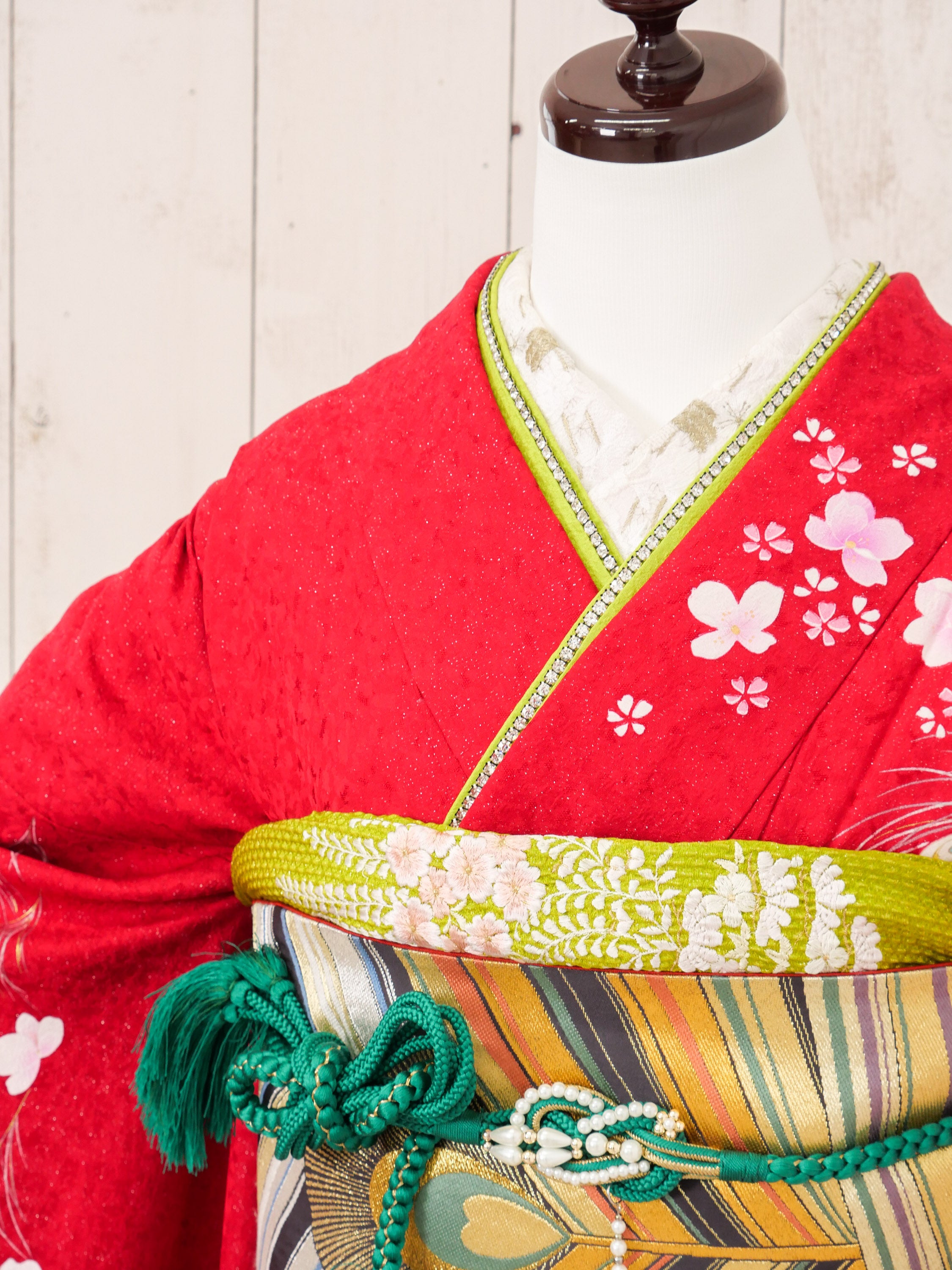 中振袖袋帯長襦袢(半襟付き、ポリエステル)重ね衿(着物に縫い付けの商品あり)帯揚げ帯締めショール腰紐5伊達締め2衿芯前板後板帯枕(ガーゼ付き)コーリンベルト1三重紐草履バッグ