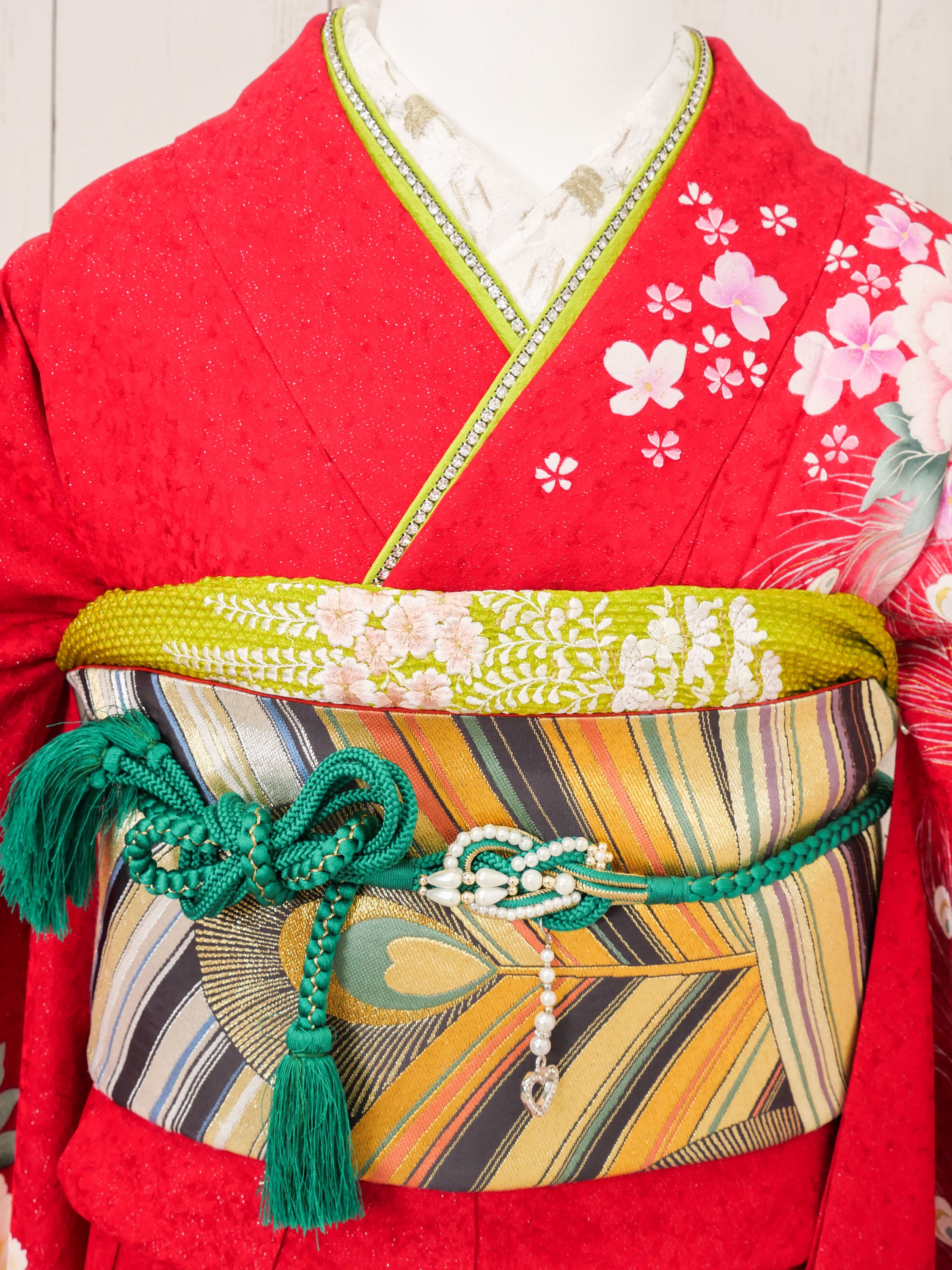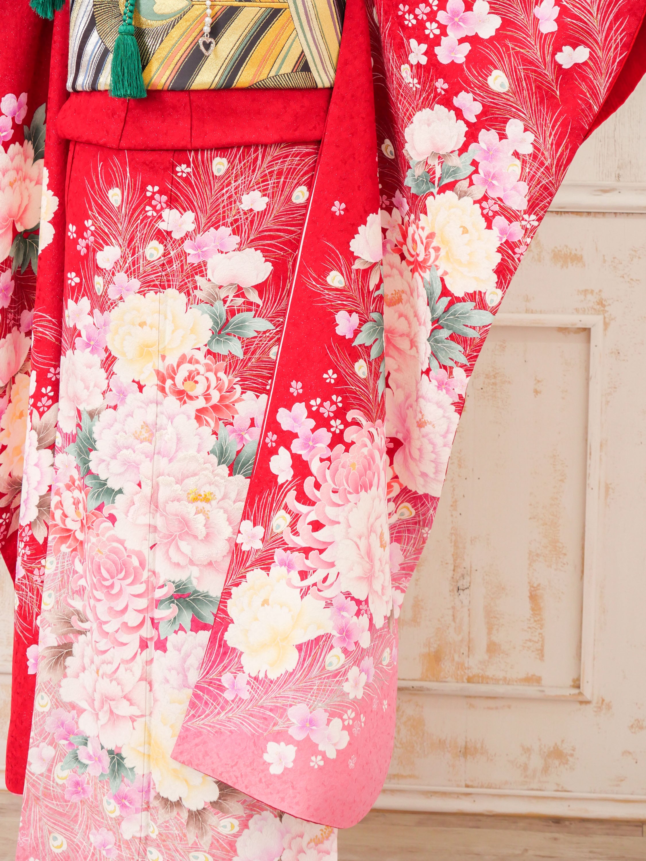鮮やかな赤地に、大輪の牡丹や桜が咲き誇る華やかな振袖です。裾に向かって淡いピンクのグラデーションが広がり、柔らかさと可憐さを添えています。金糸を織り込んだ帯には幾何学模様が施され、帯締めの深緑が全体を引き締め、格式高い装いを完成させます。伝統美とモダンさを兼ね備えたデザインは、成人式や晴れの日の装いに最適。上品でありながら華やかに映える一着で、特別な瞬間をより輝かせてくれます。