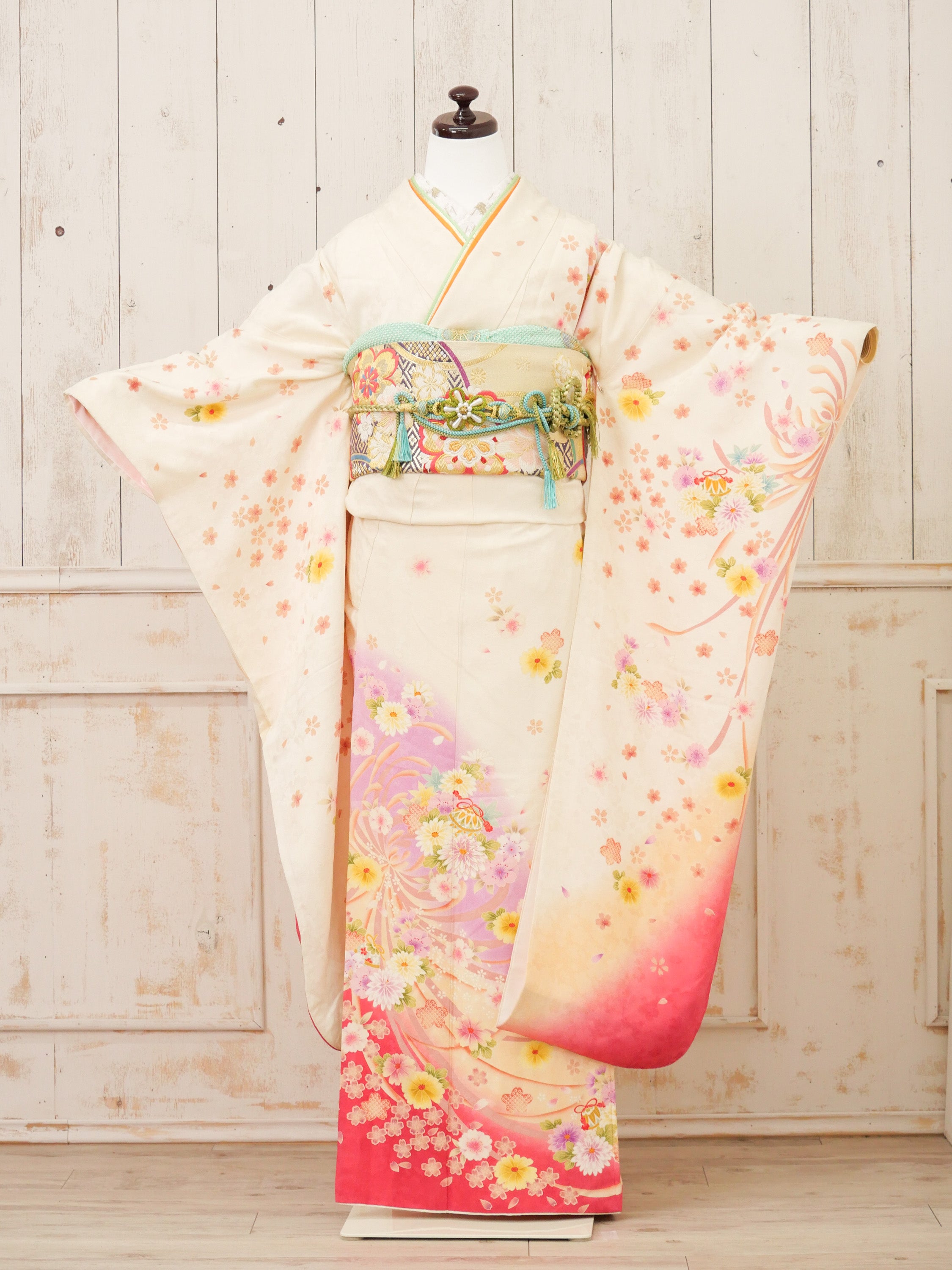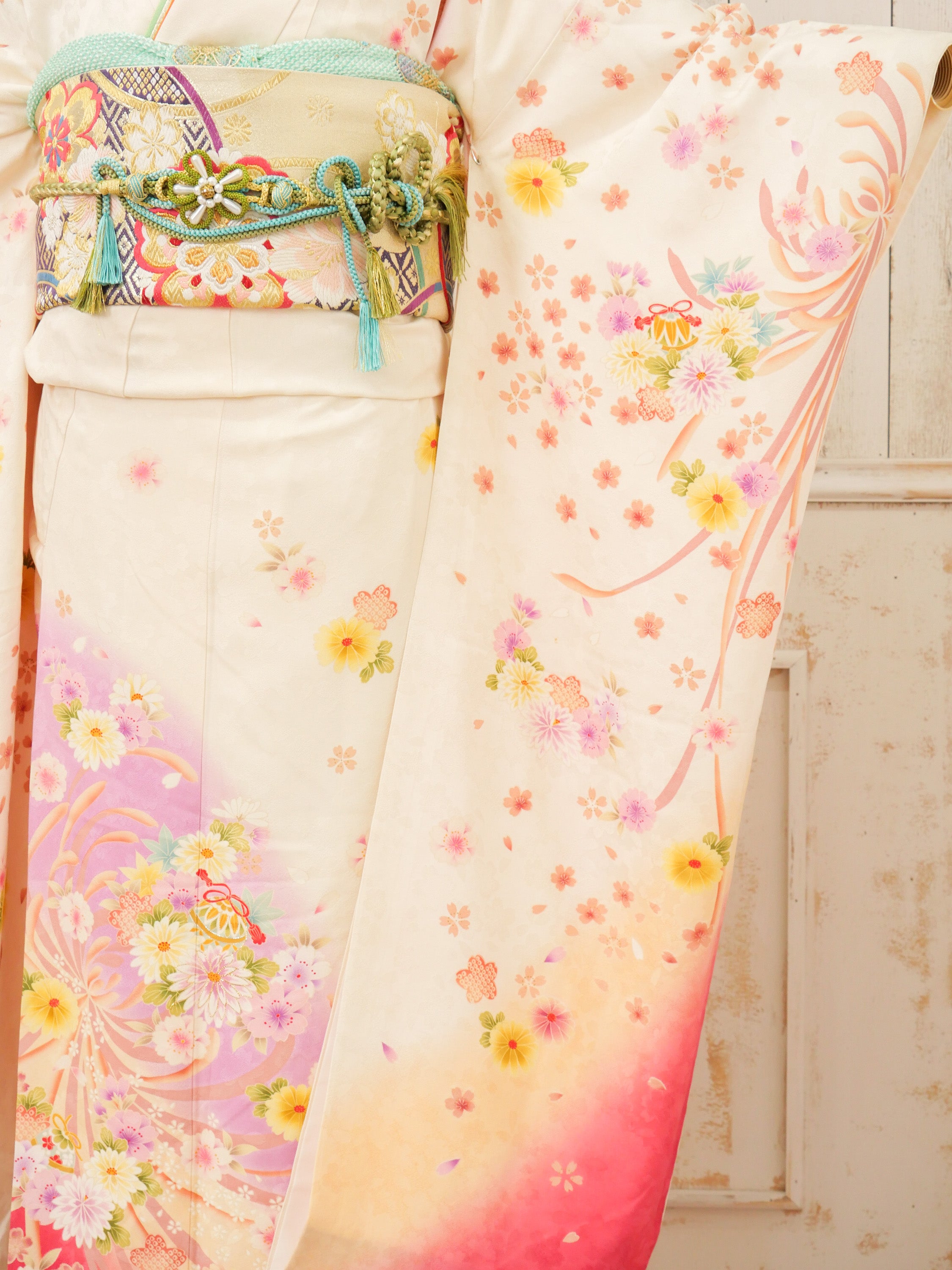 柔らかなピンクとアイボリーのグラデーションに、大輪の菊が咲き誇る華やかな一着。女性らしい優美な雰囲気と格調高さを併せ持ち、成人式の舞台にぴったりな印象を演出します。