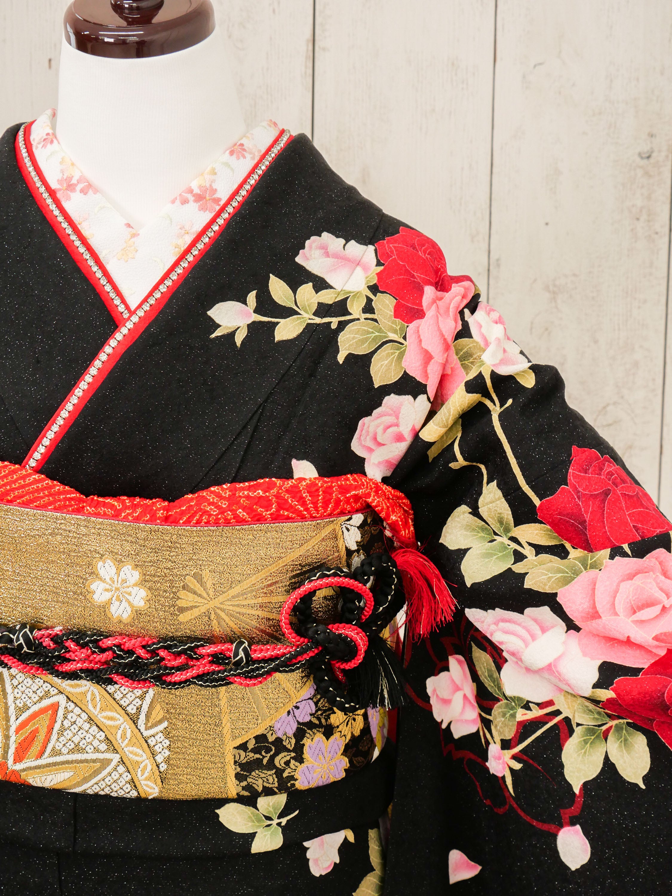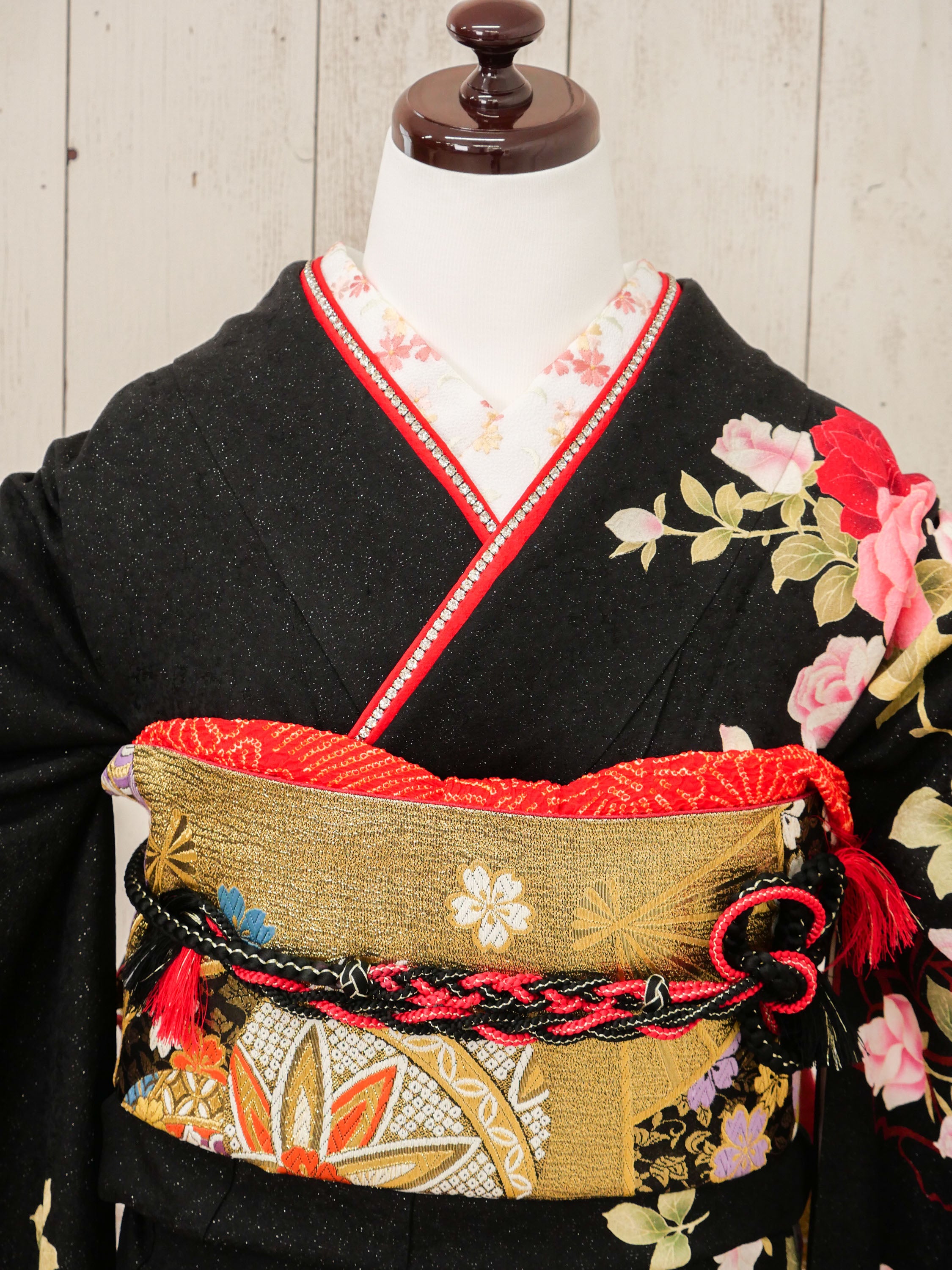 黒と紫のグラデーションに、満開の桜が咲き誇る豪華なデザイン。金の帯と赤の小物が華やかさをさらに引き立て、視線を集める王道の美しさ。華やかな場にふさわしい一着です。