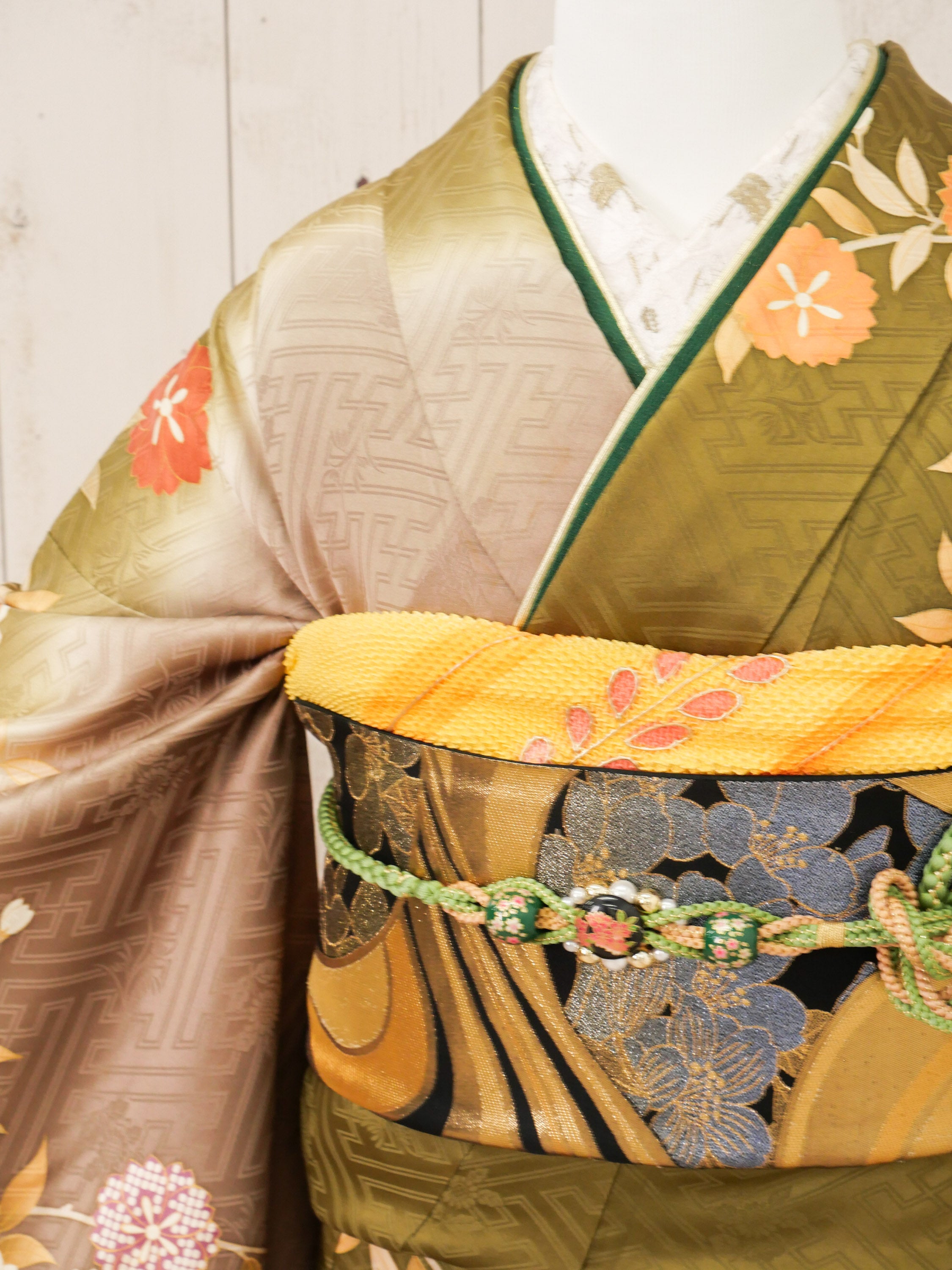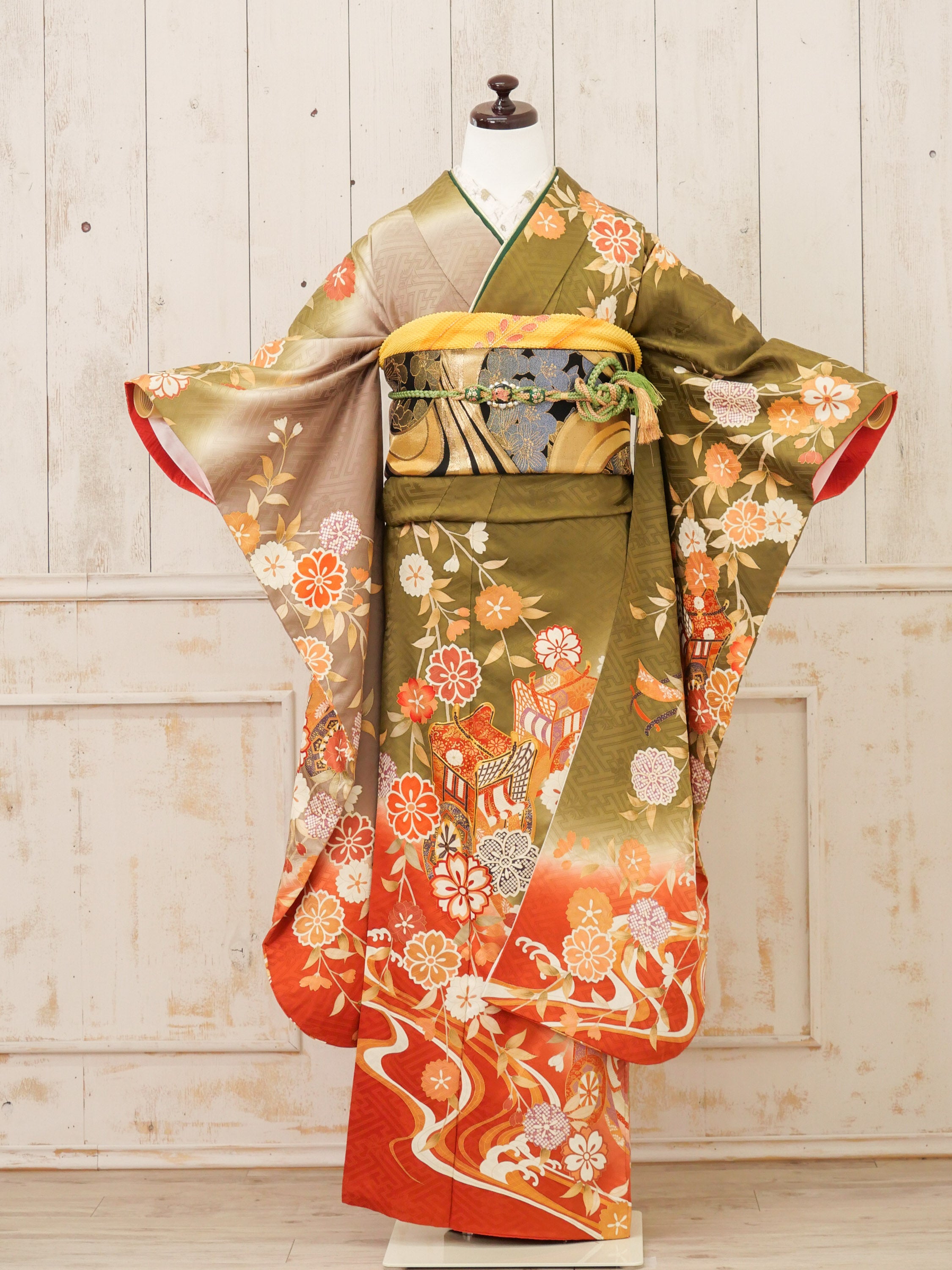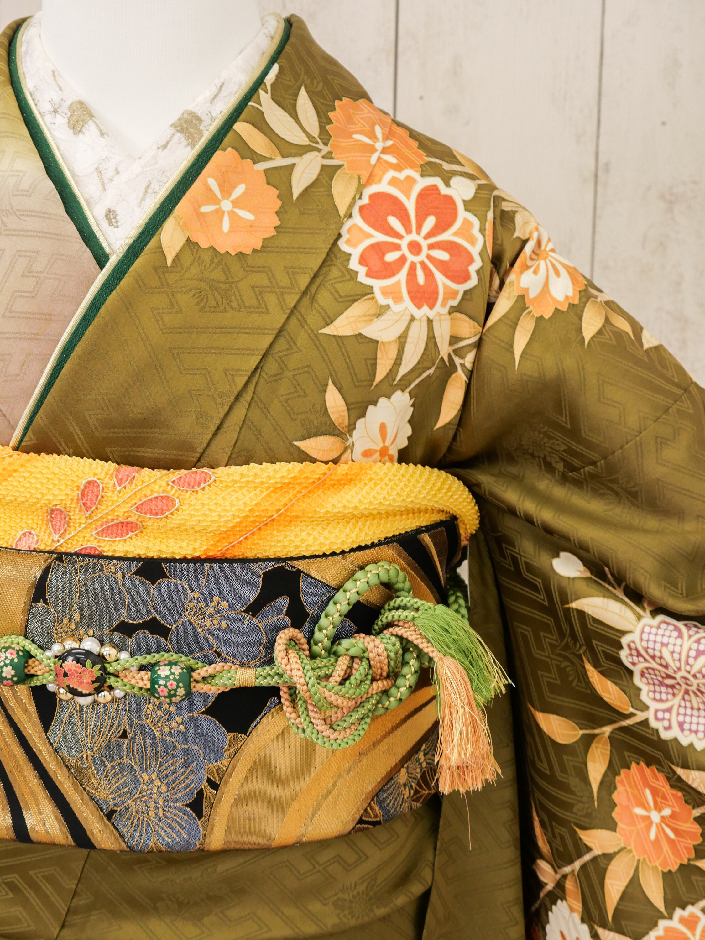 個性派にぴったりなカーキとオレンジのバイカラーが目を引く振袖。古典柄をベースにしながらも、現代的なアレンジで唯一無二のスタイルを演出。写真映えも抜群です。