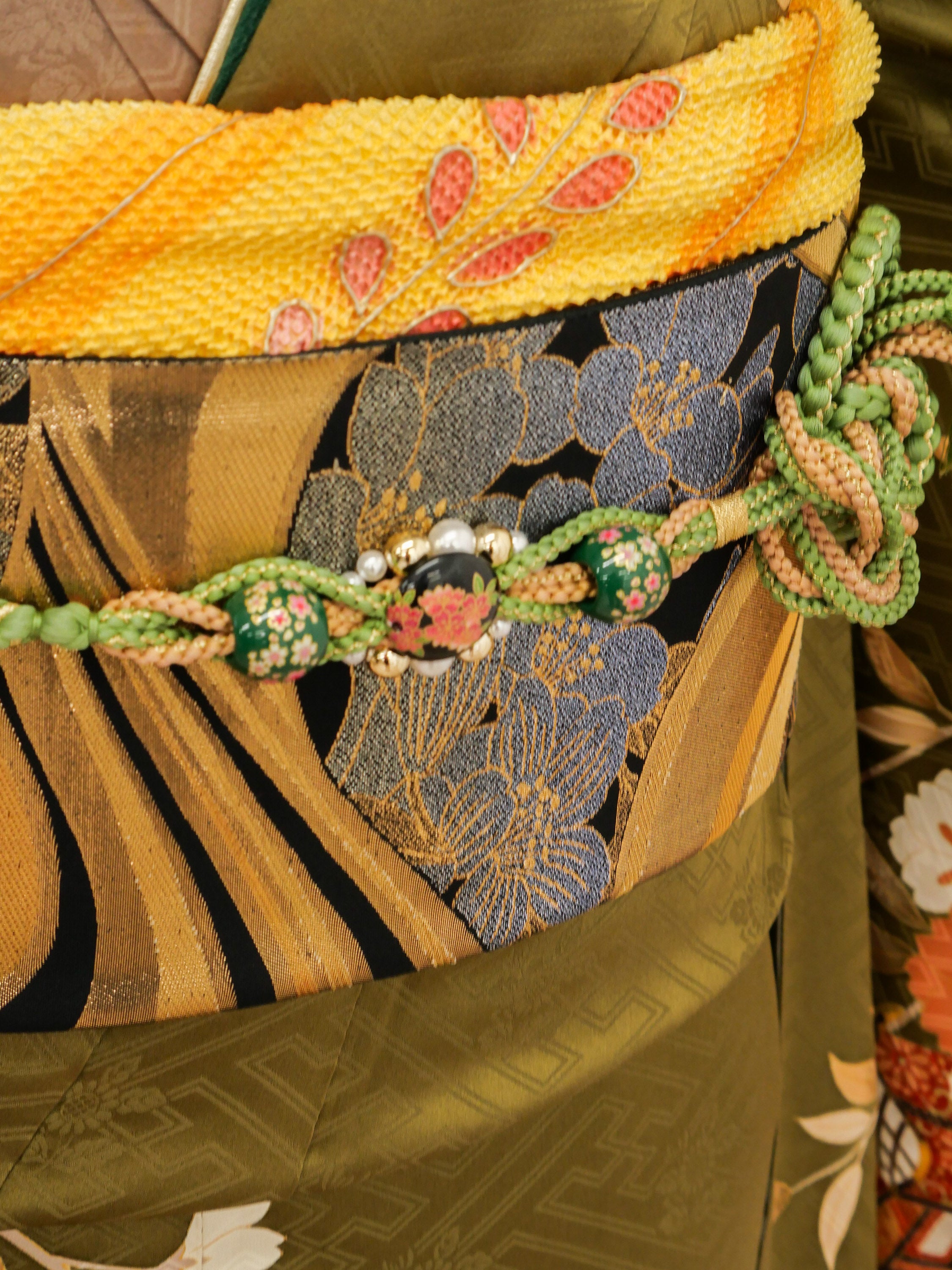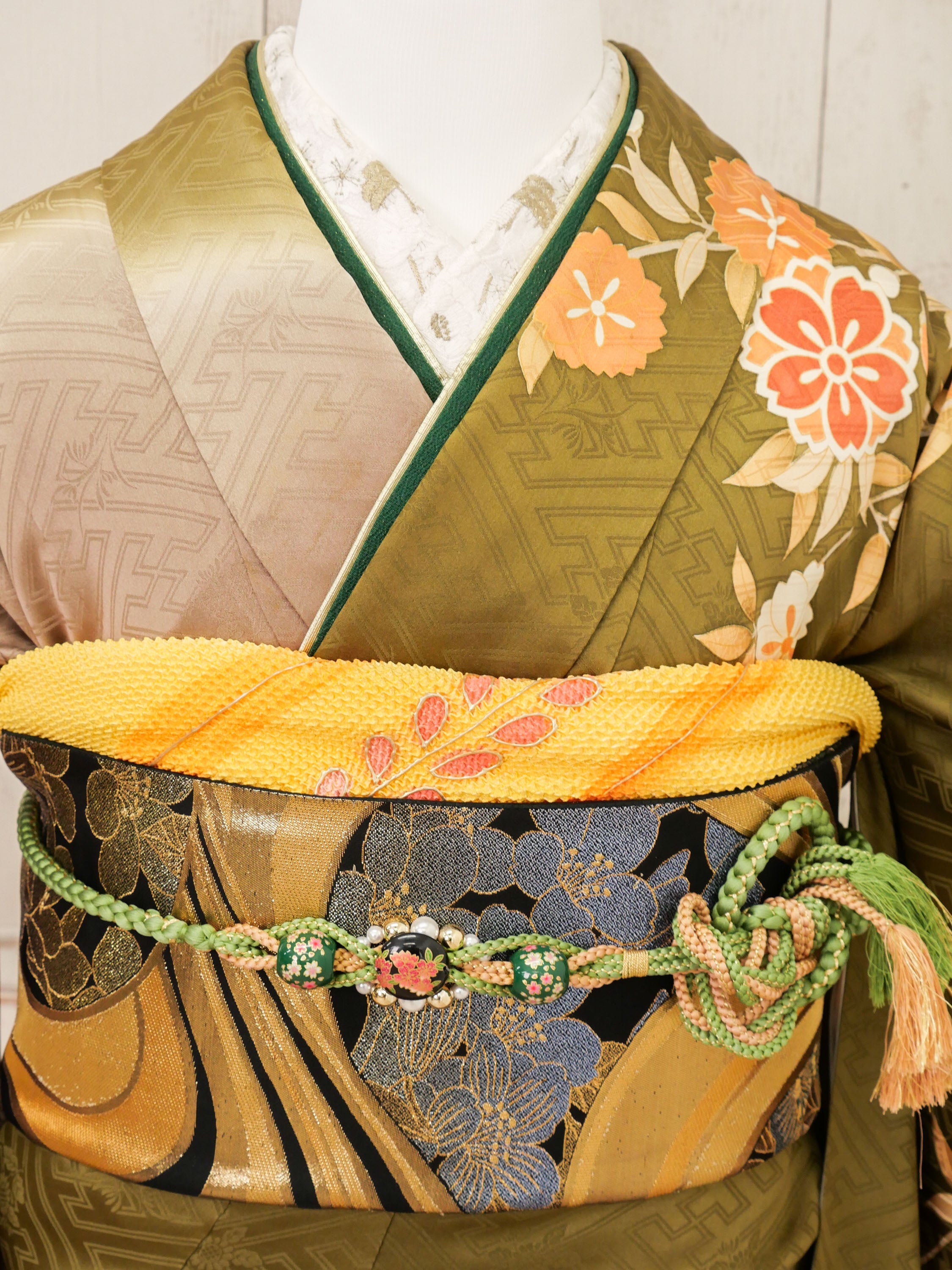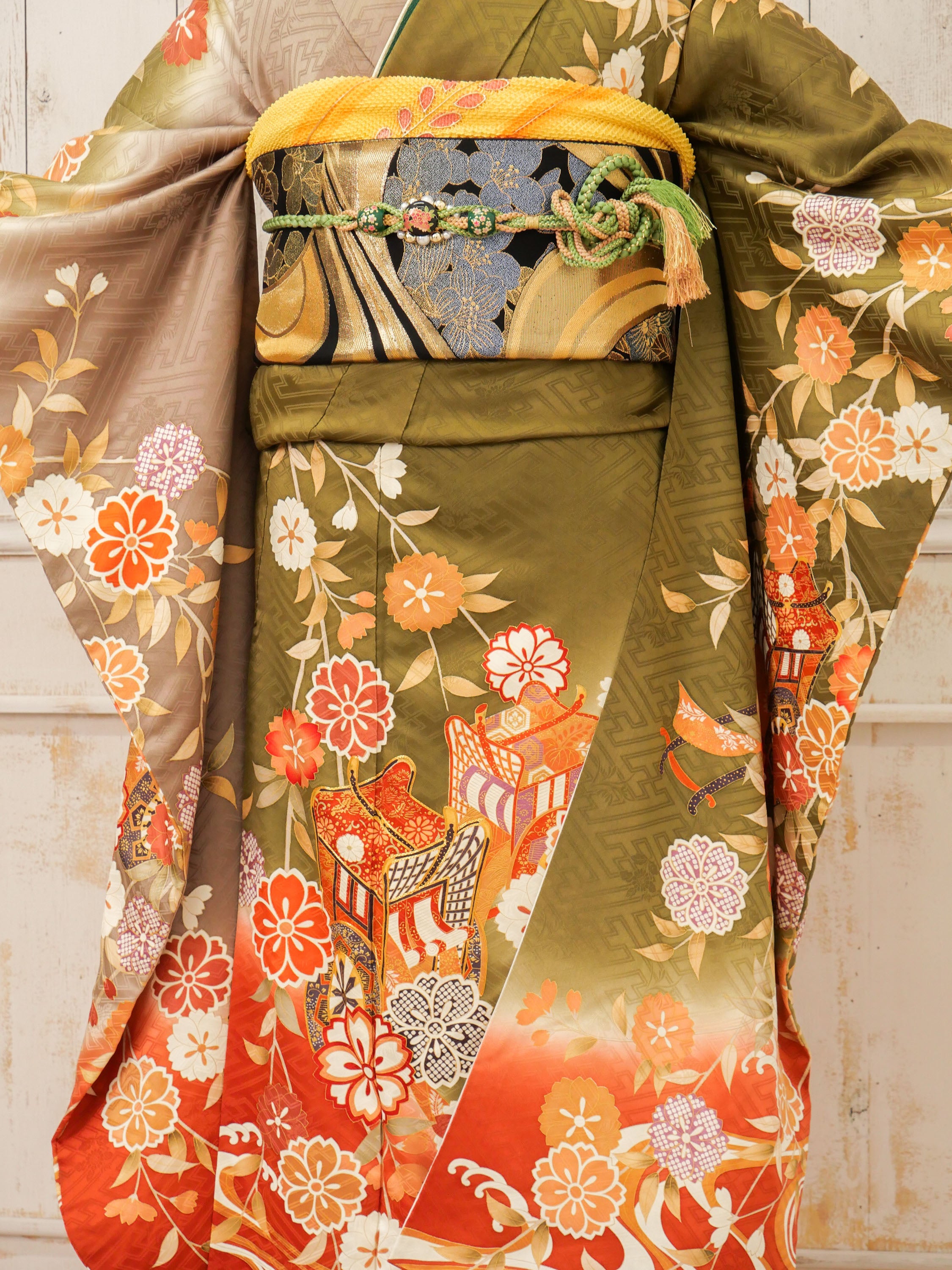 個性派にぴったりなカーキとオレンジのバイカラーが目を引く振袖。古典柄をベースにしながらも、現代的なアレンジで唯一無二のスタイルを演出。写真映えも抜群です。