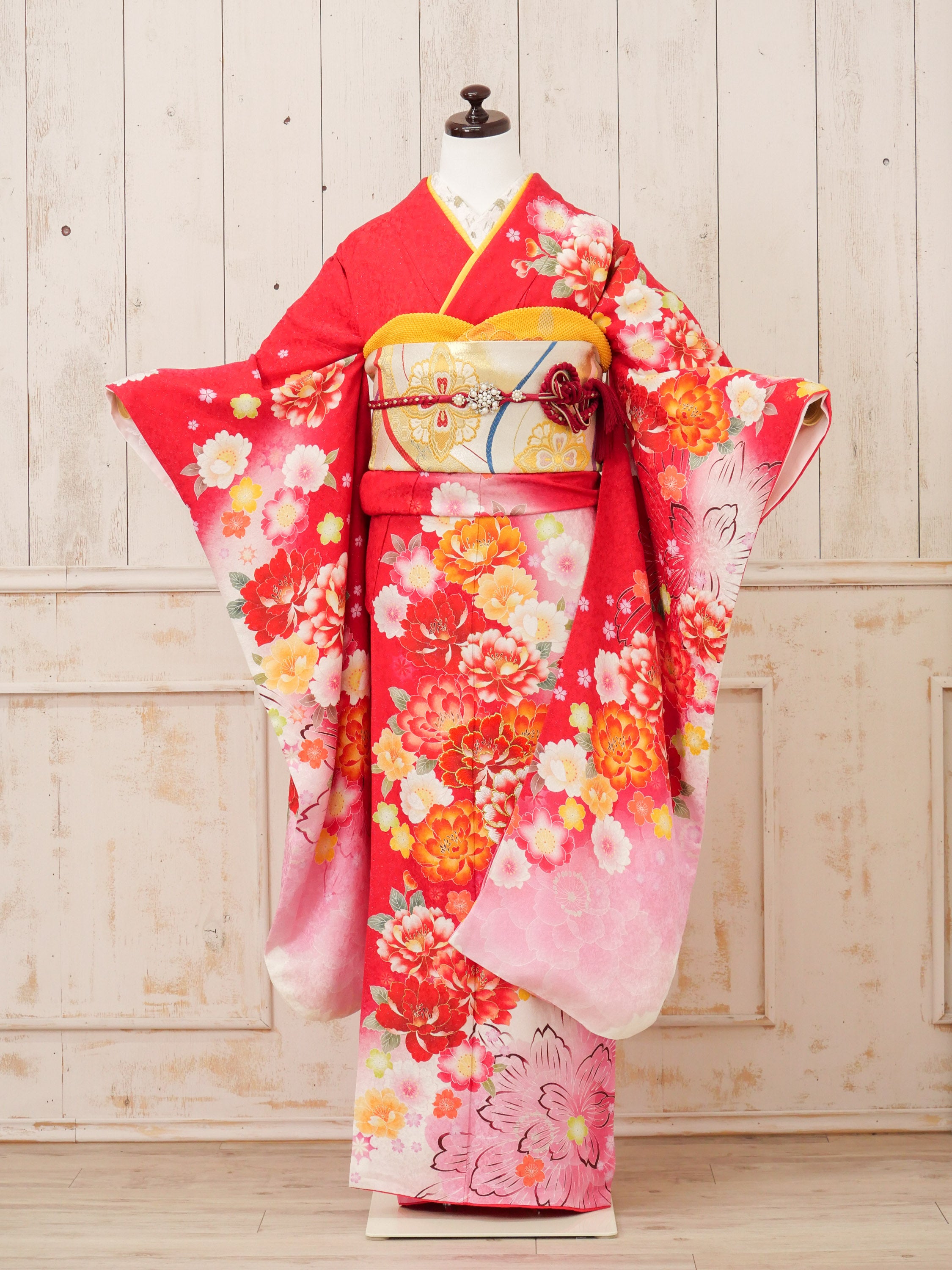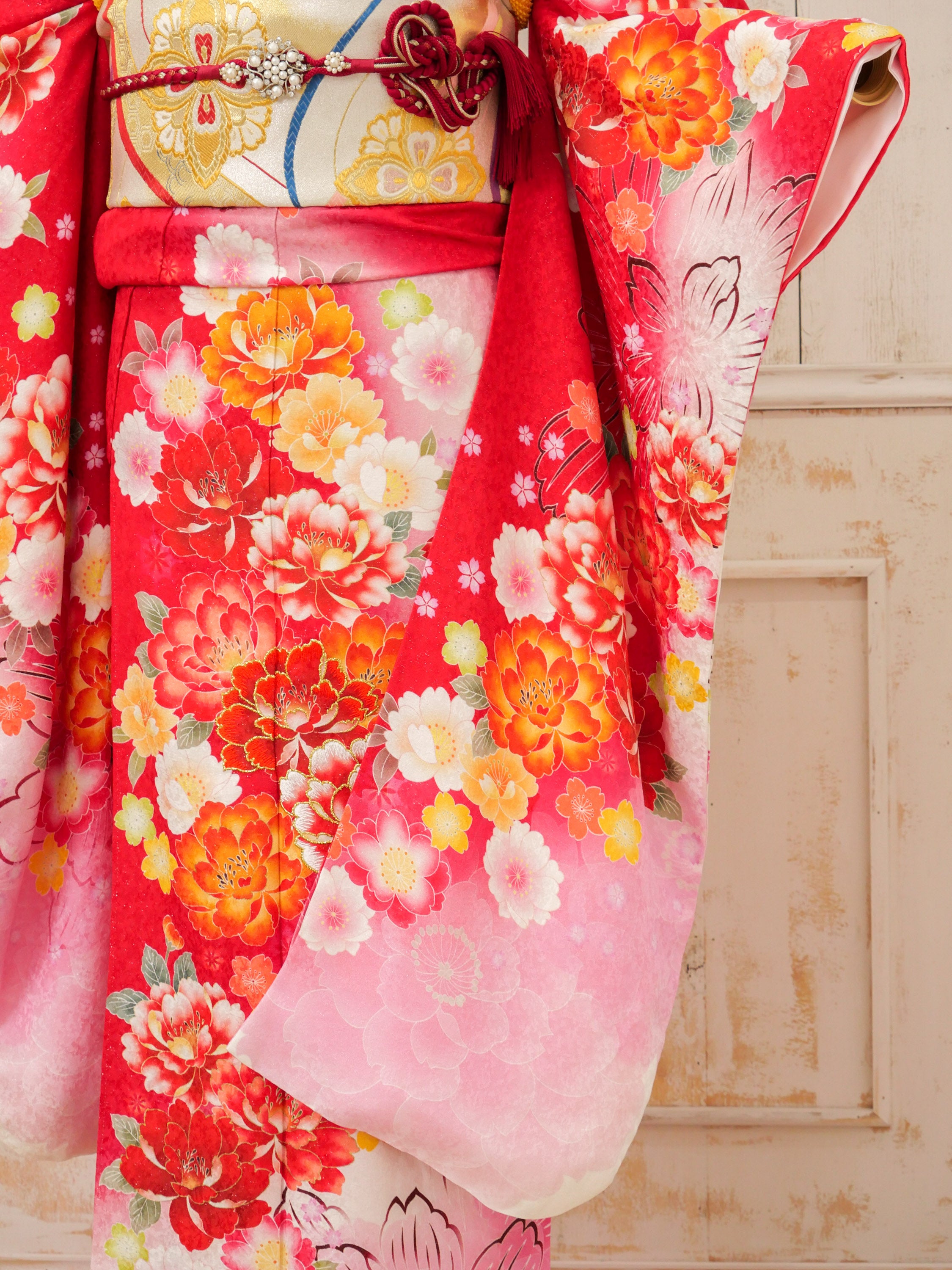 真紅の地に可憐な花が舞う、シンプルながら華やかさを感じさせる一着。裾のグラデーションと淡い花模様が上品で、落ち着いた印象と初々しさを演出します。