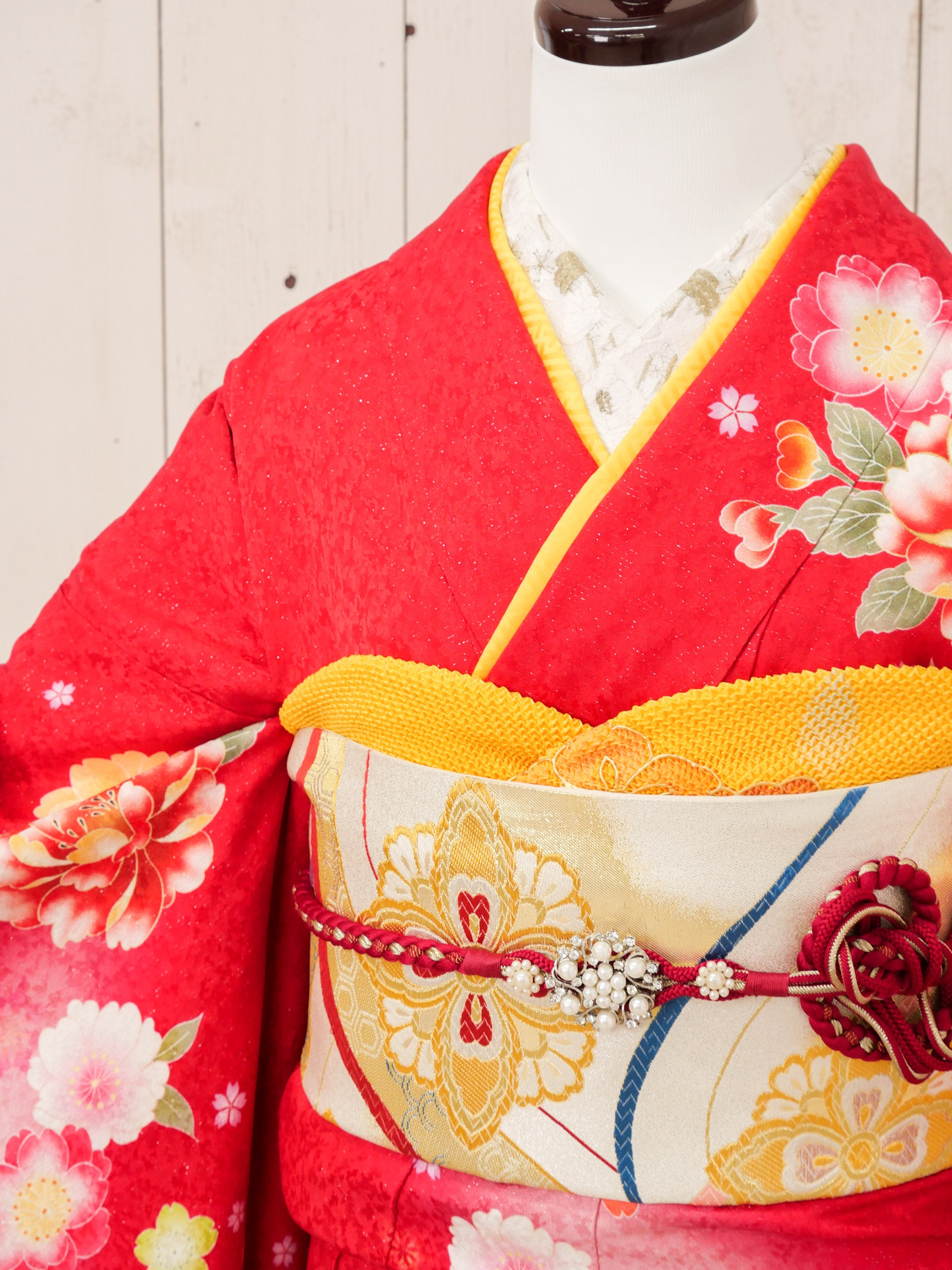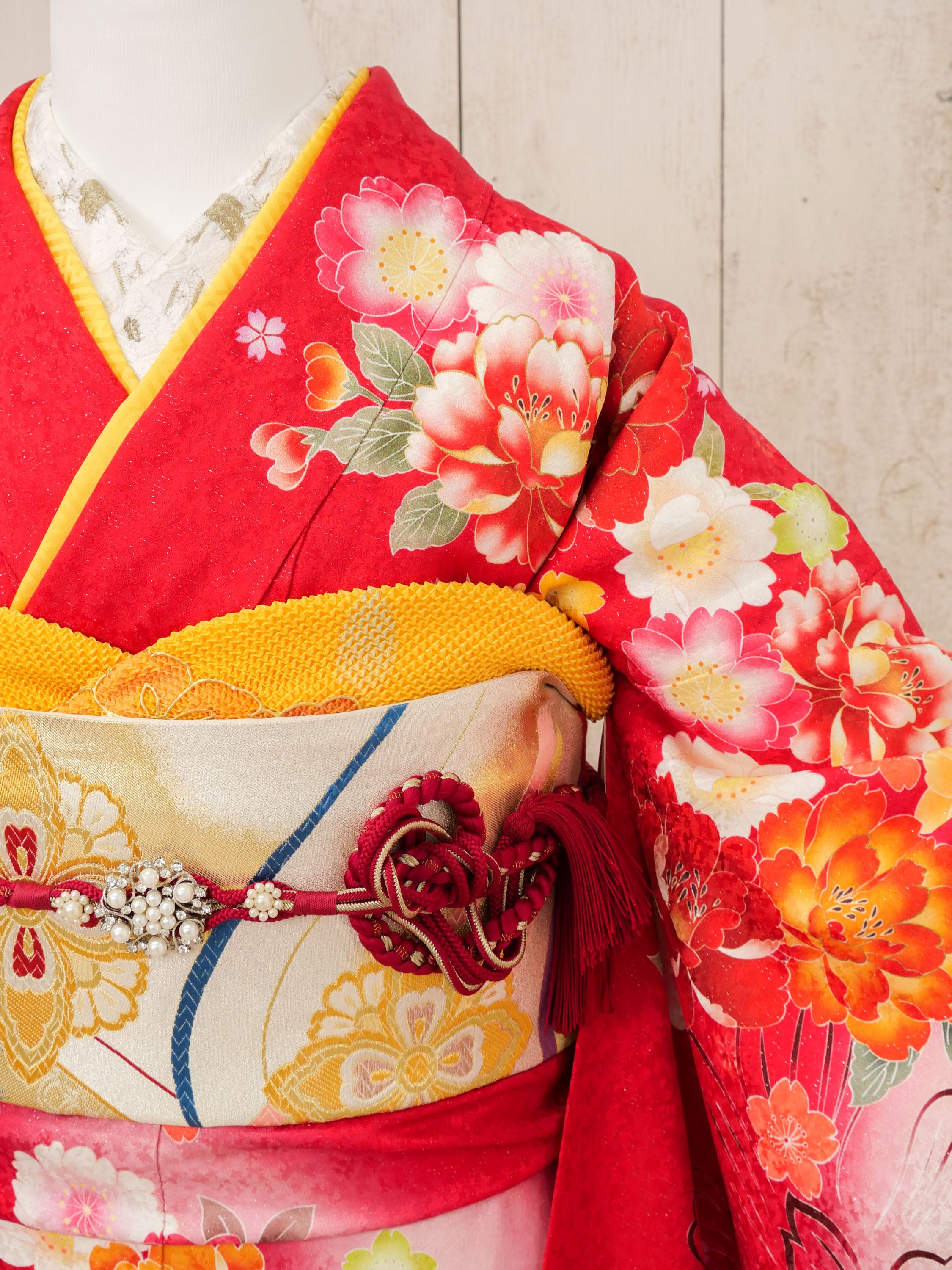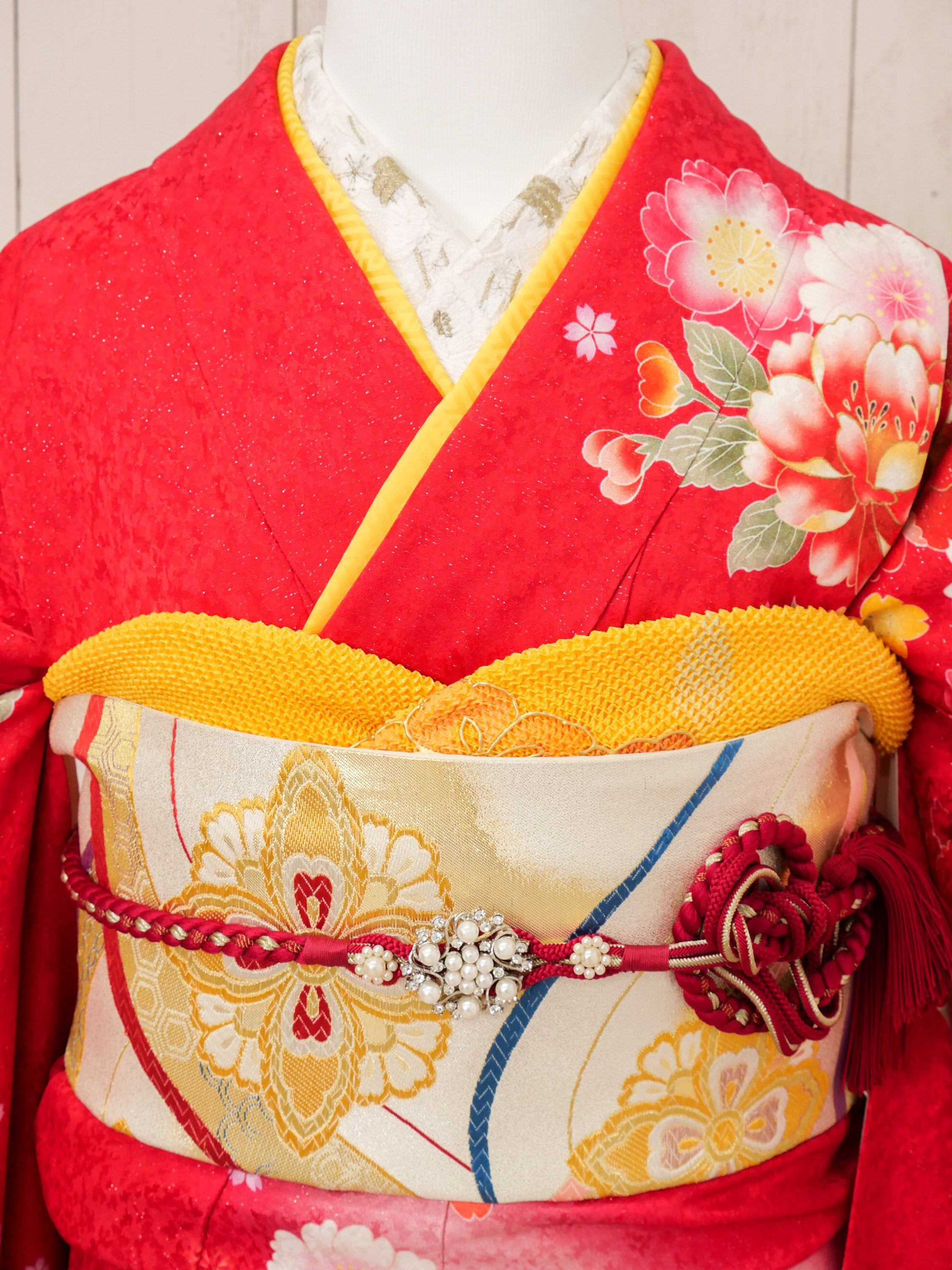 中振袖、袋帯、長襦袢(半襟付き、ポリエステル)、重ね衿(着物に縫い付けの商品あり)、帯揚げ、帯締め、ショール、腰紐5本、伊達締め2本、衿芯、前板、後板、帯枕(ガーゼ付き)、コーリンベルト1本、三重紐、草履、バッグ