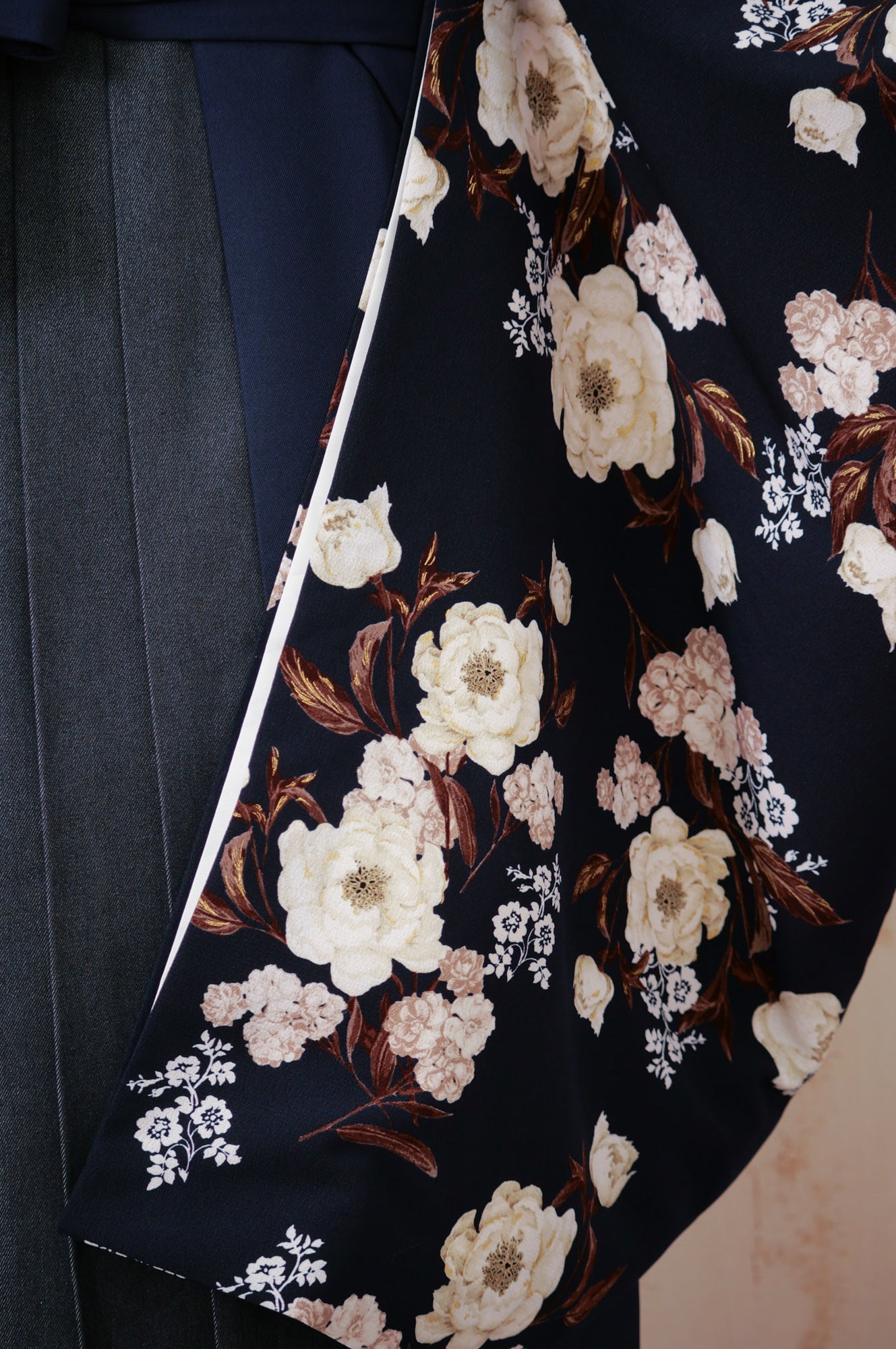 ネイビー地に淡い花が咲く大人っぽいデザイン。シンプルながらも気品漂う配色で、落ち着いた華やかさを演出。