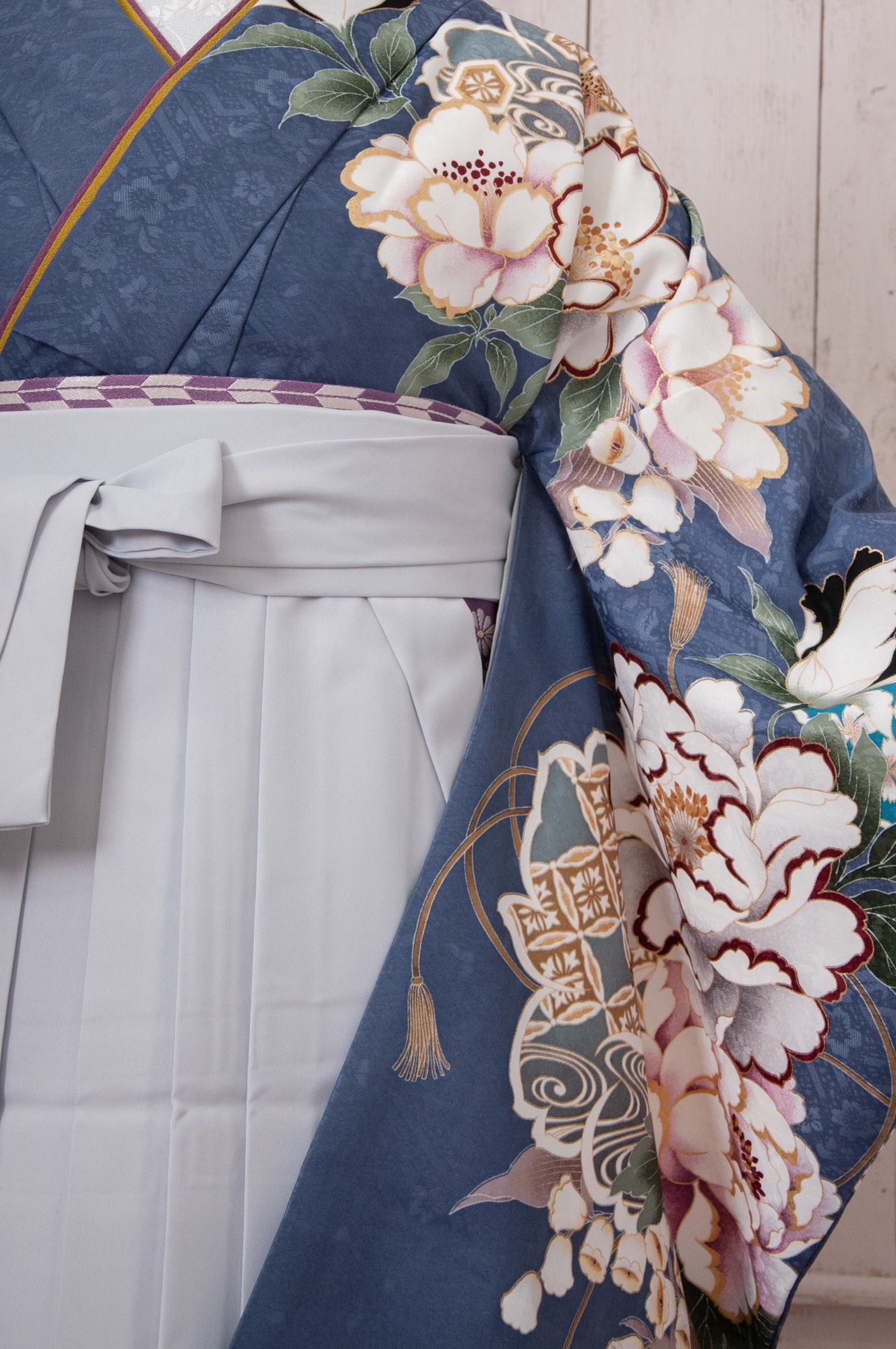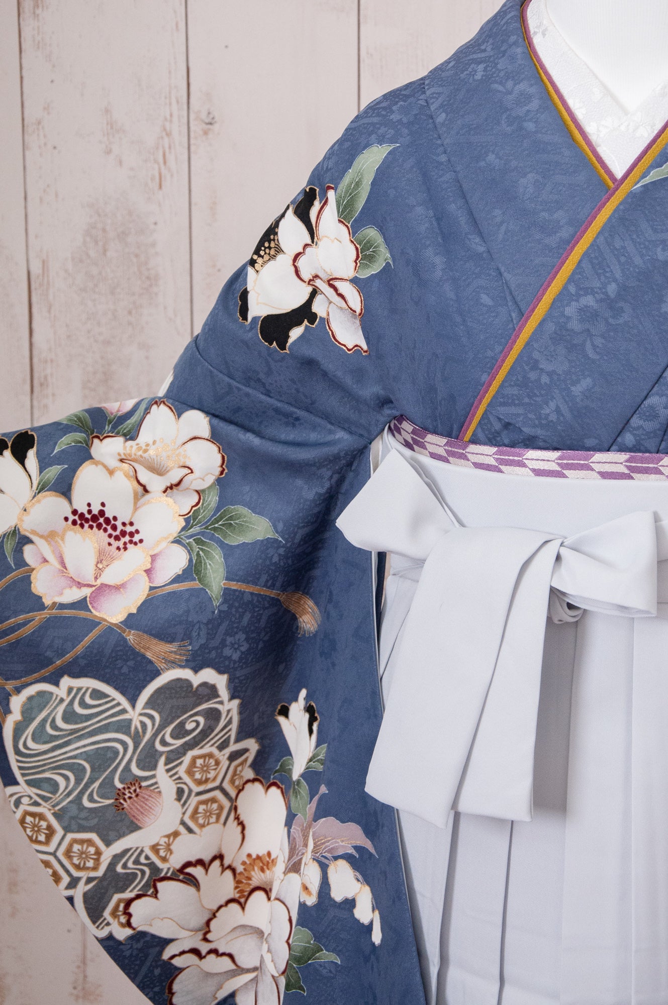 深みある青の振袖に大輪の花が咲くクラシカルなデザイン。淡いグラデーション袴と合わせ、優雅な印象に。