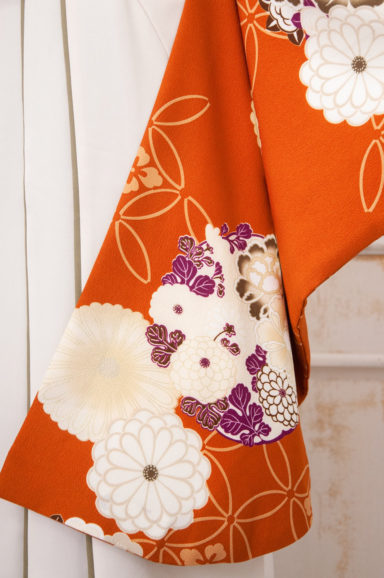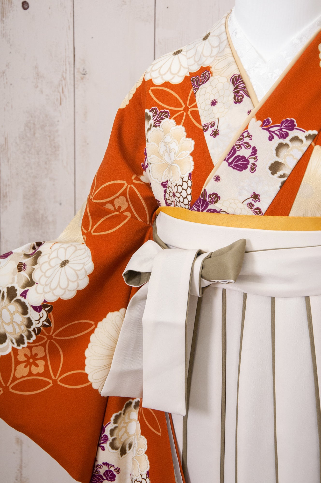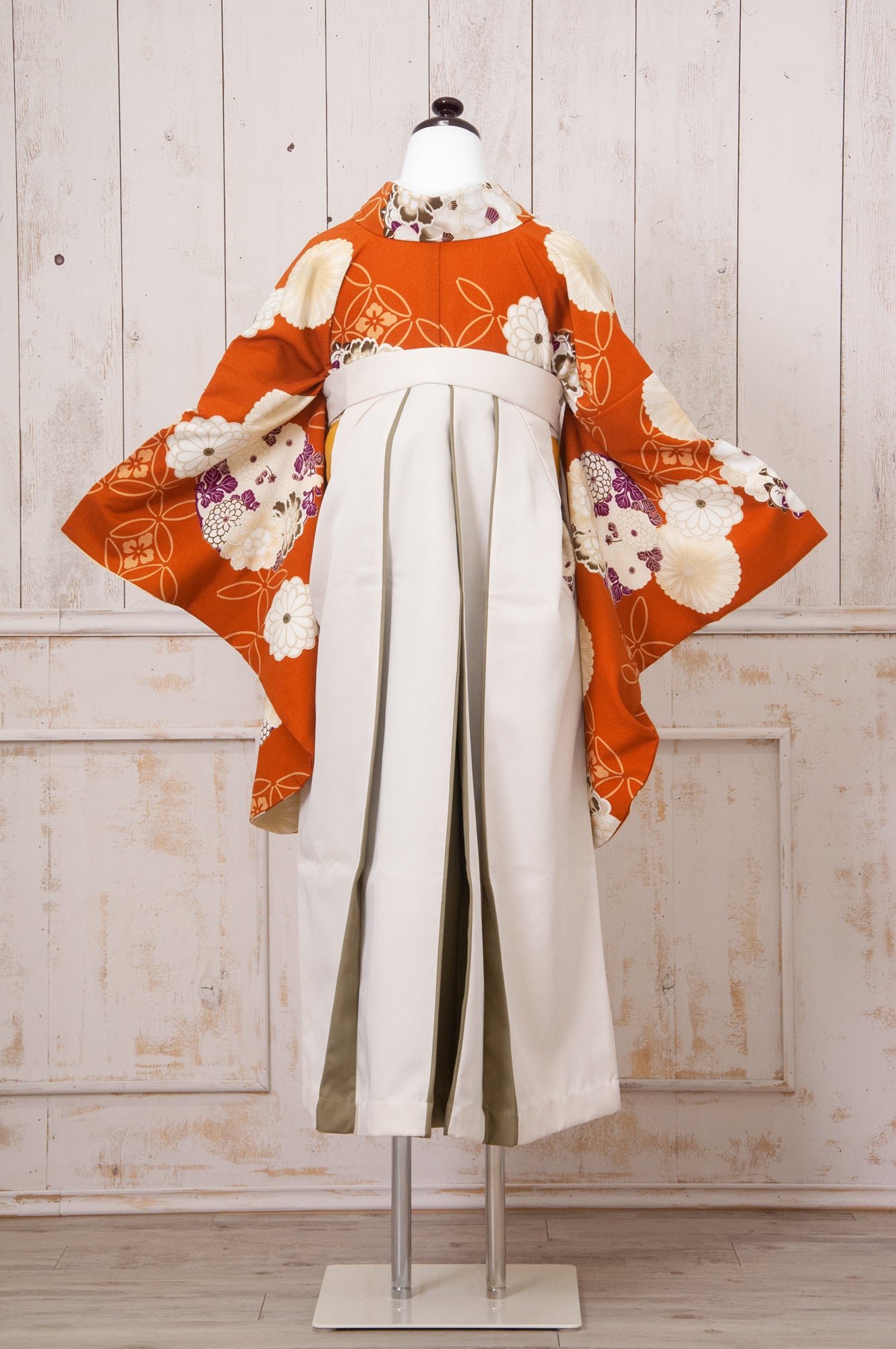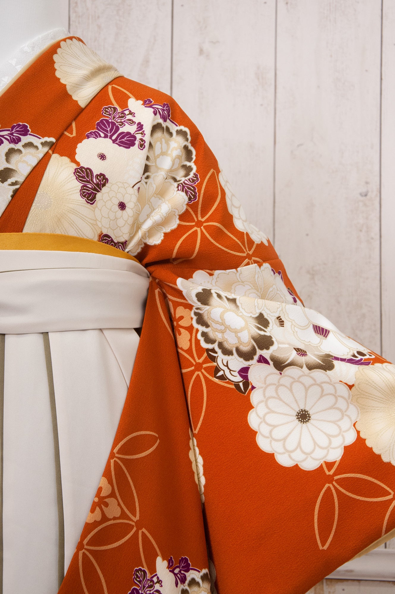 あたたかみある橙の振袖に、白や紫の花が彩るレトロモダンな雰囲気。明るい生成りの袴で柔らかくまとめました。