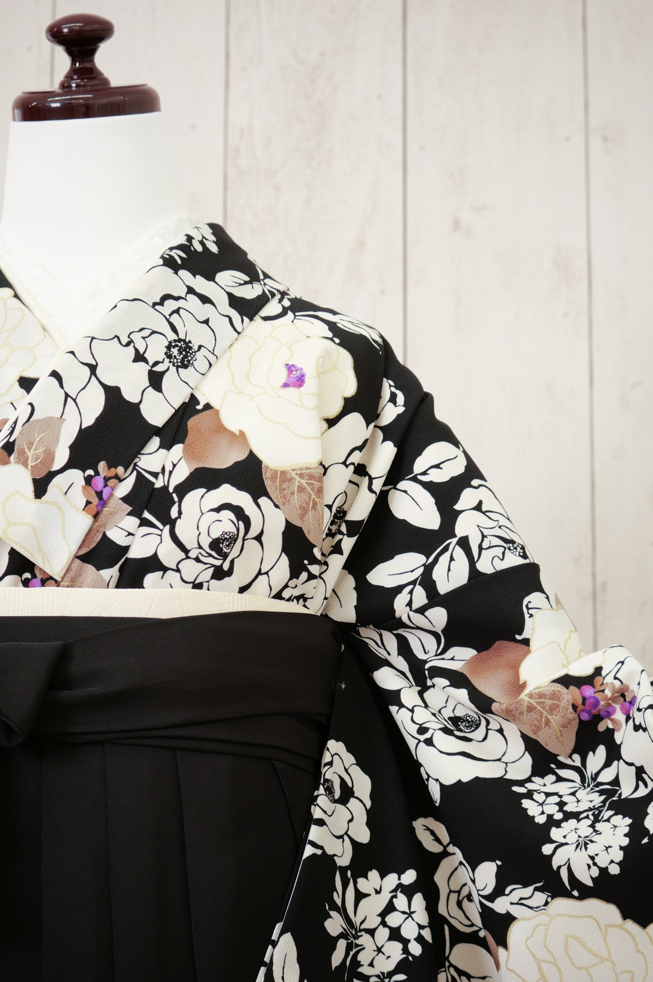 黒地にベージュのバラが咲き誇るシックな振袖。全体を引き締める黒袴で、シンプルながらも華やかな装いに。